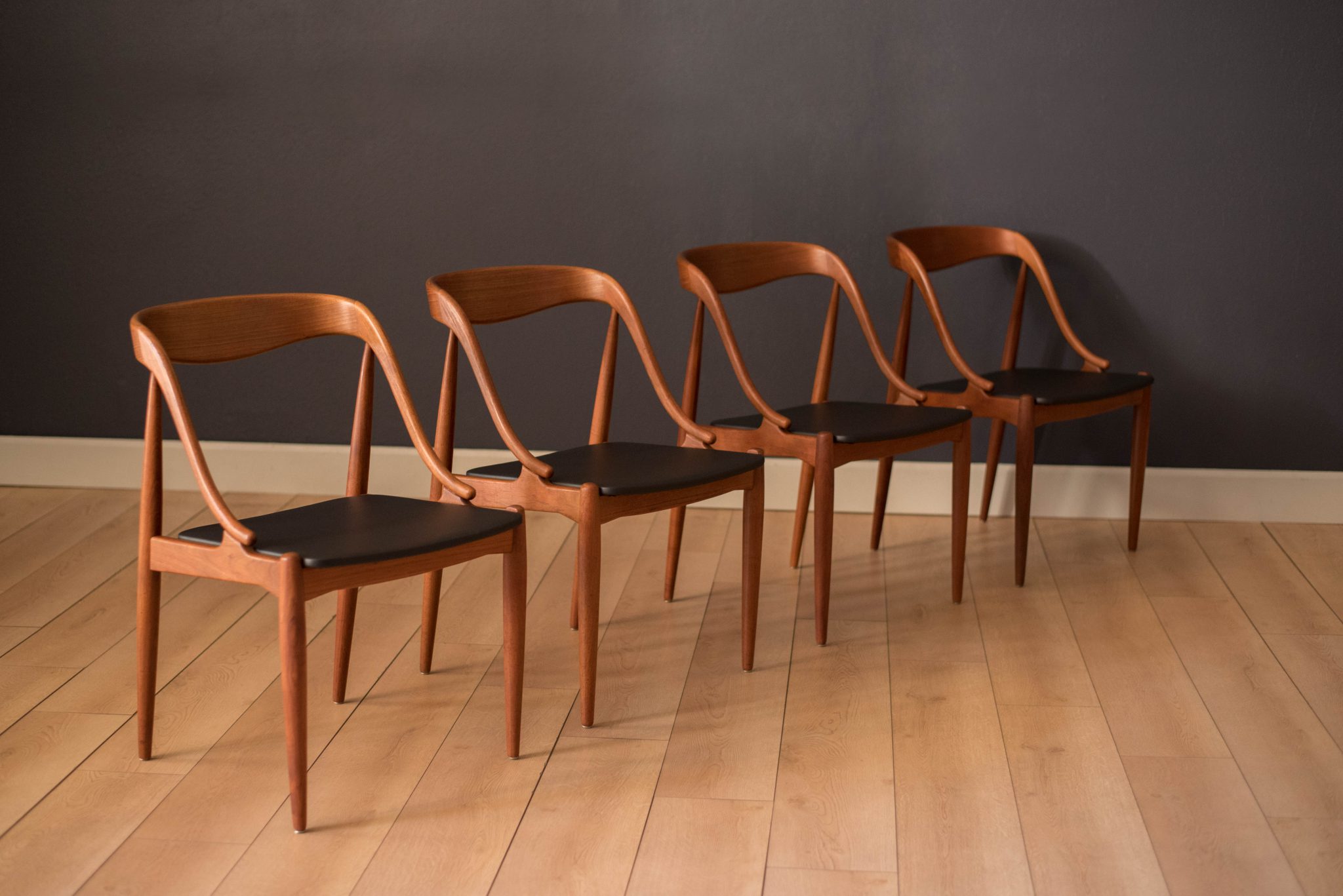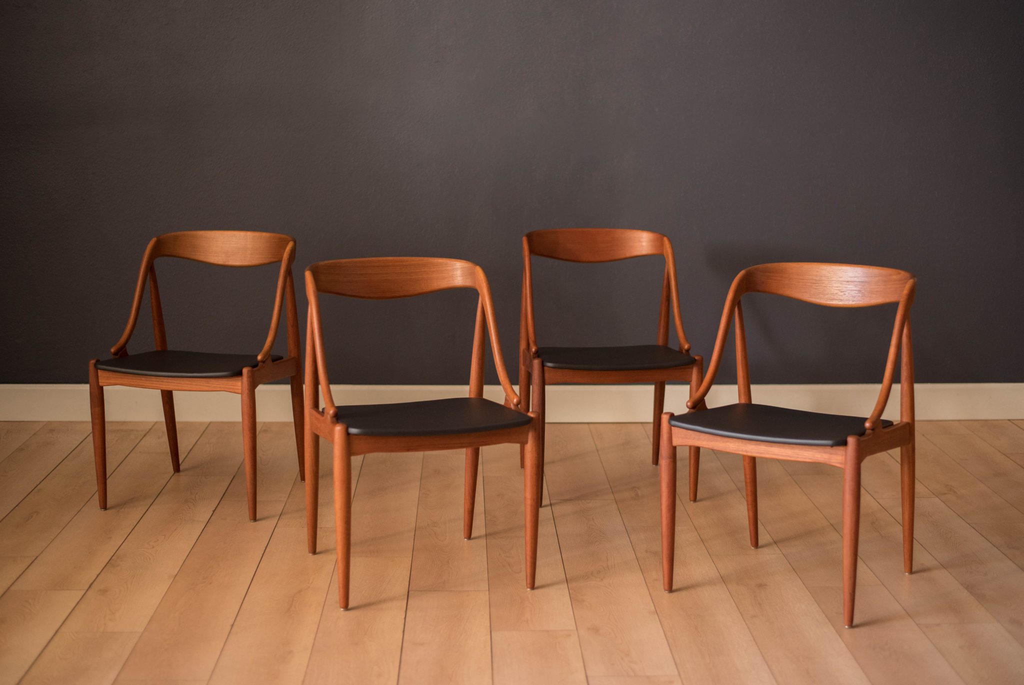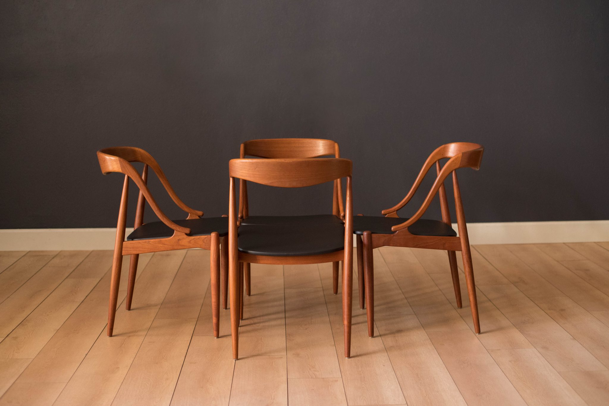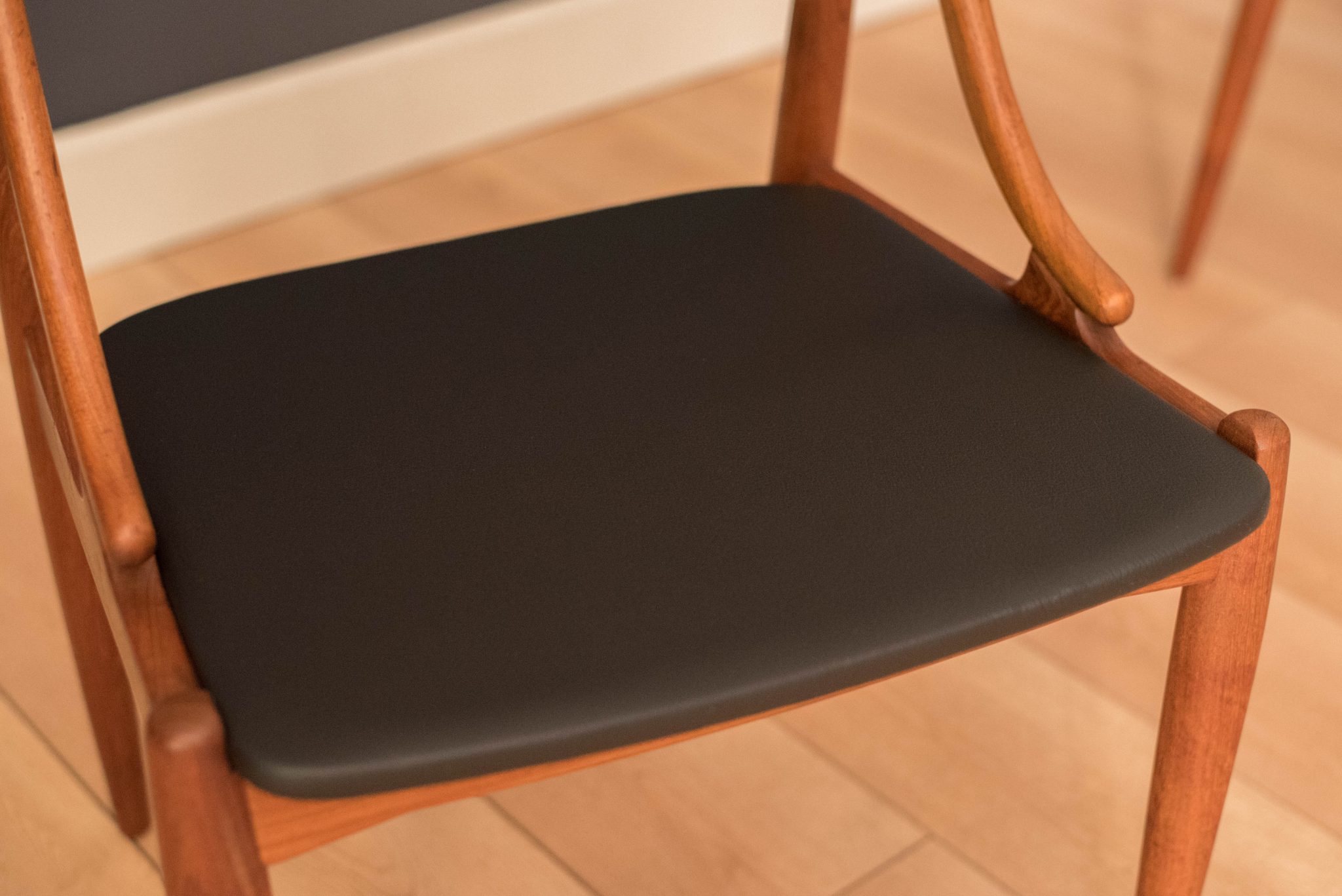 Mid century modern teak dining chairs by Johannes Andersen for Uldum Mobelfabrik. This set includes four dining chairs with newly reupholstered black vinyl seats. Designed with curved backrests and sculptural teak frames. Price is for the set.