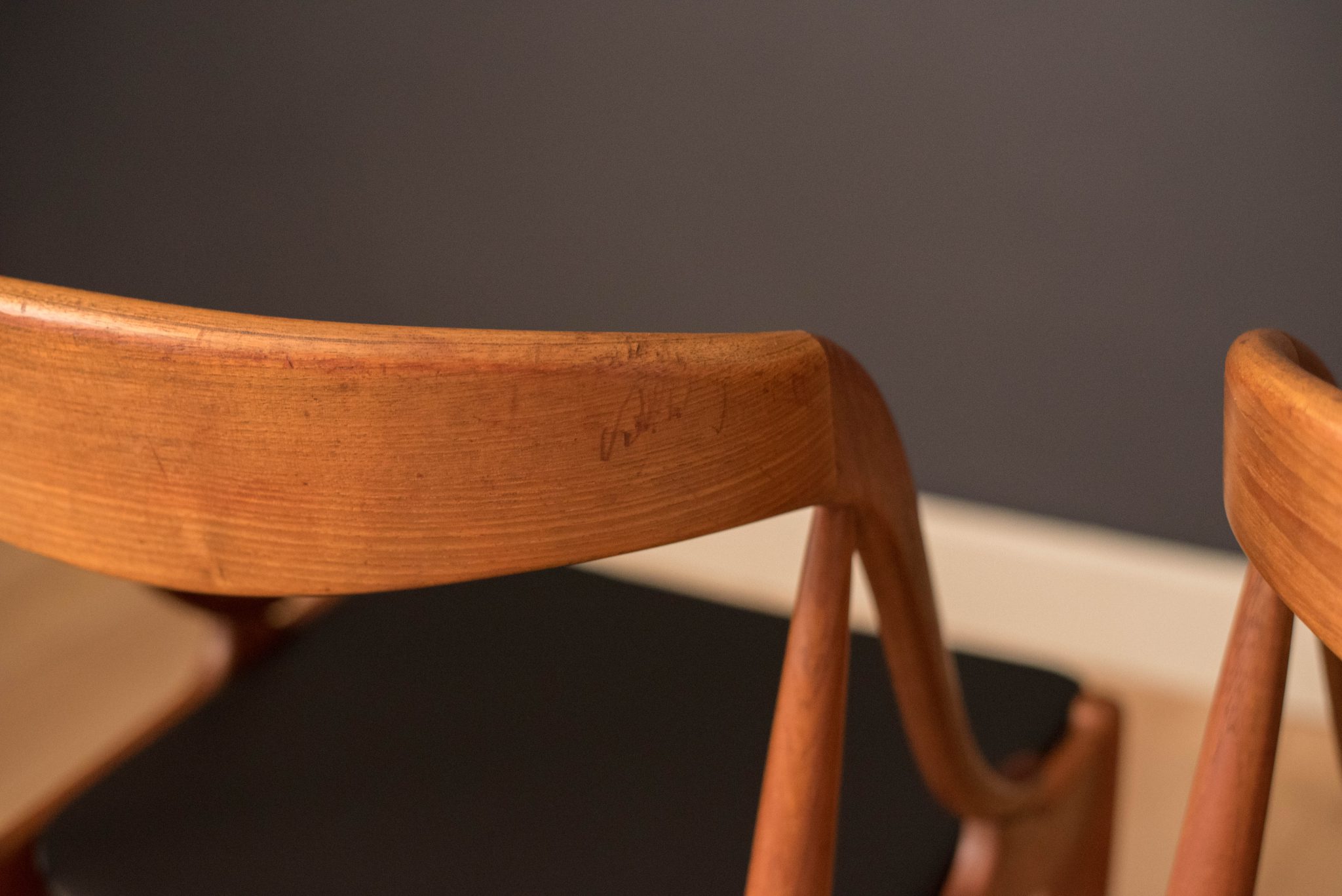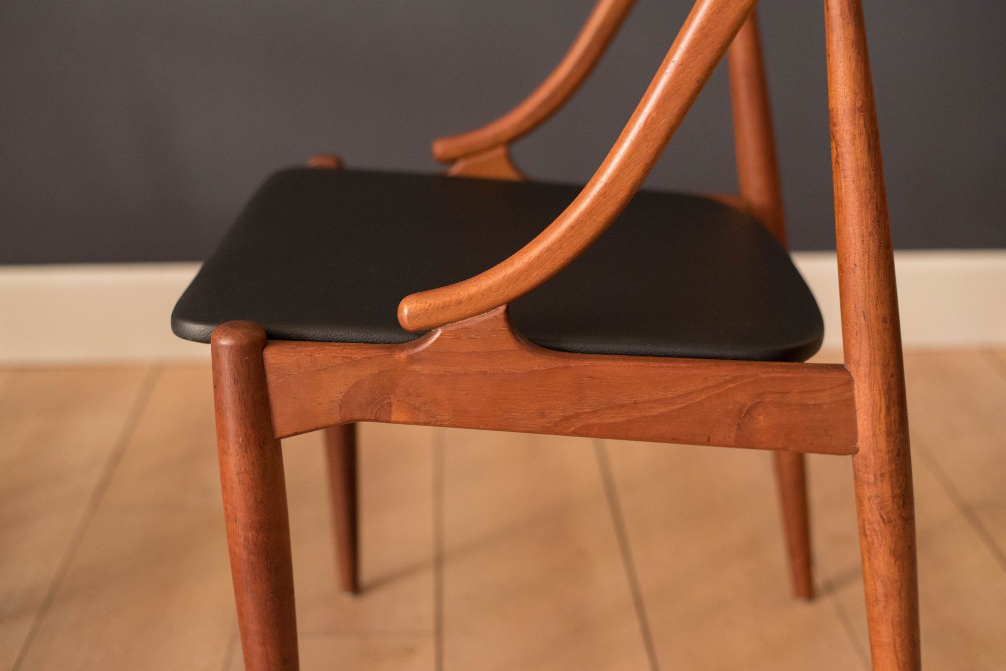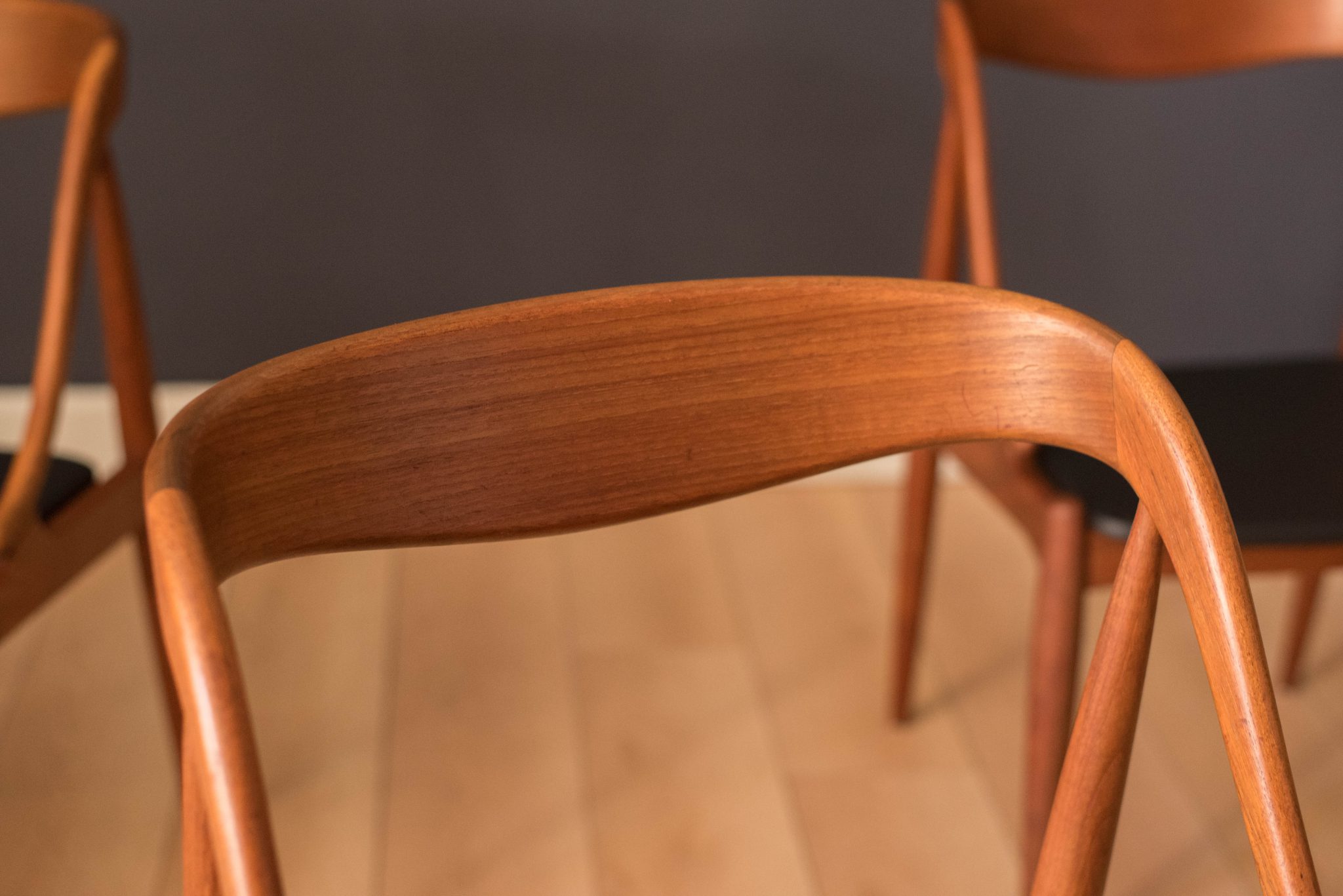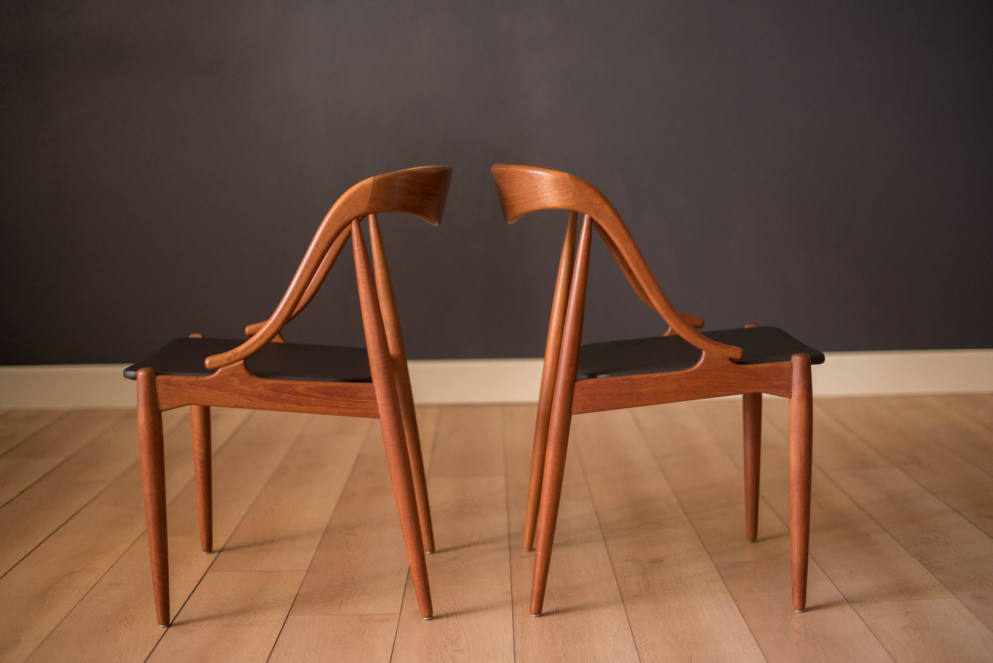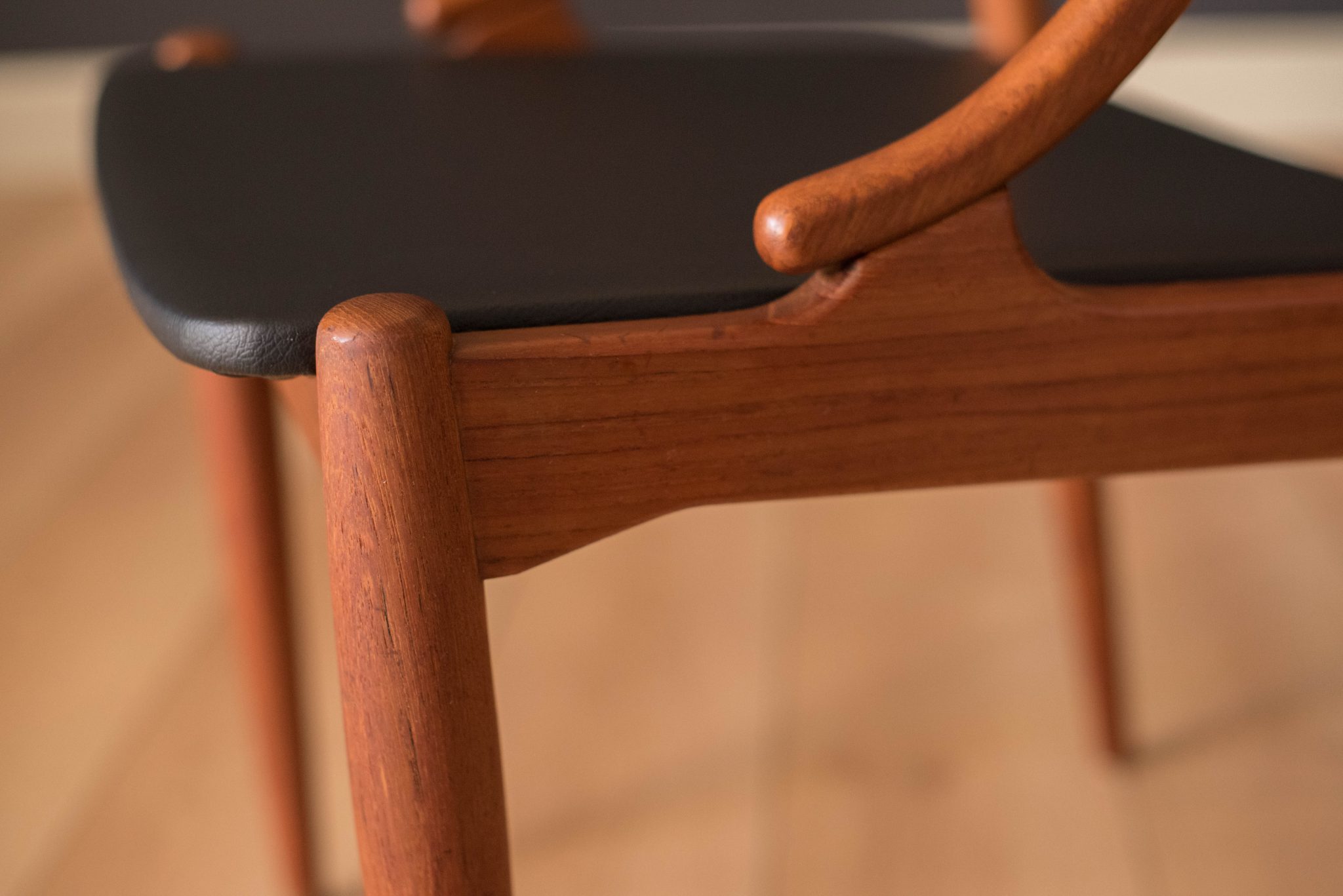 Mid century modern teak dining chairs by Johannes Andersen for Uldum Mobelfabrik. This set includes four dining chairs with newly reupholstered black vinyl seats. Designed with curved backrests and sculptural teak frames. Price is for the set.