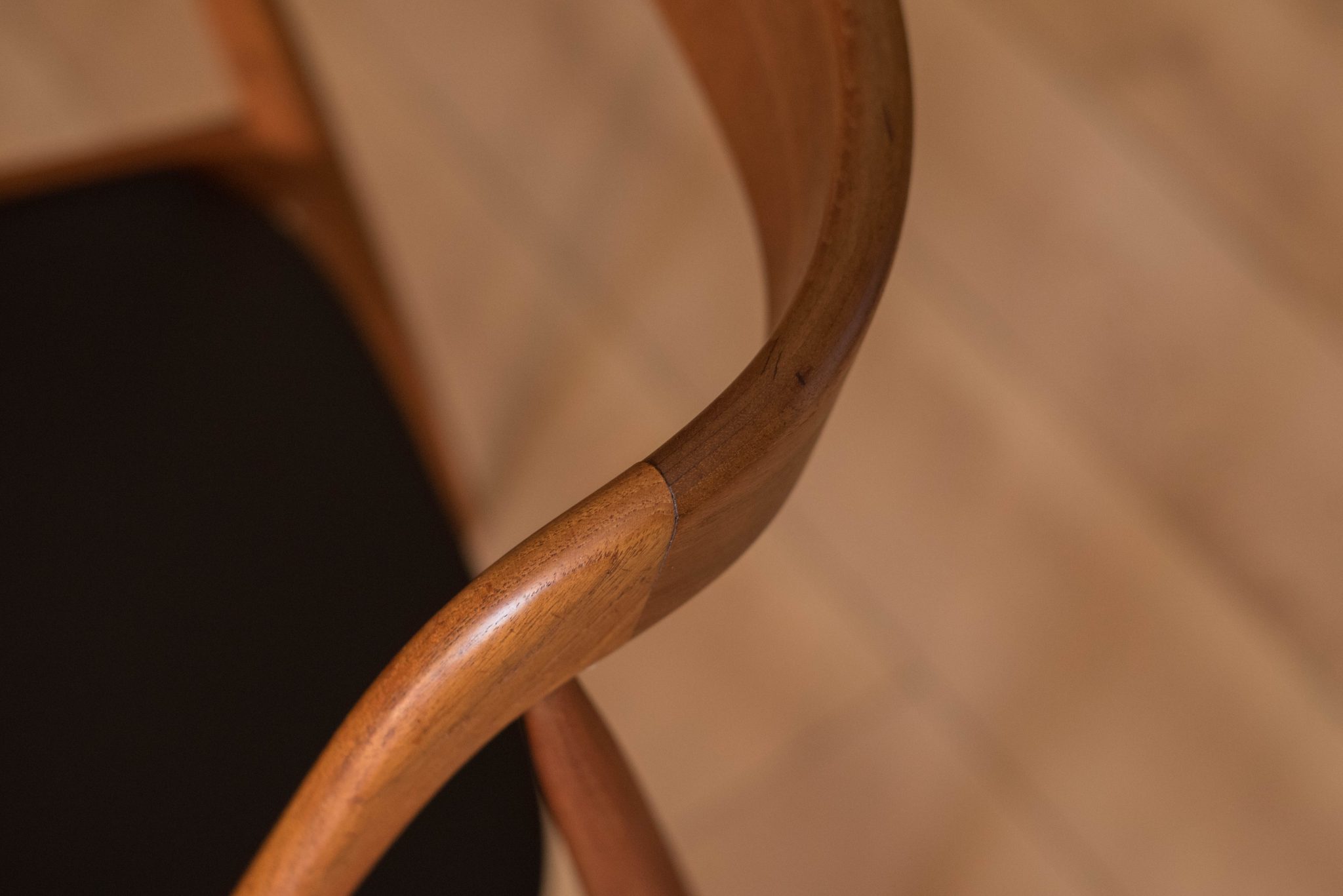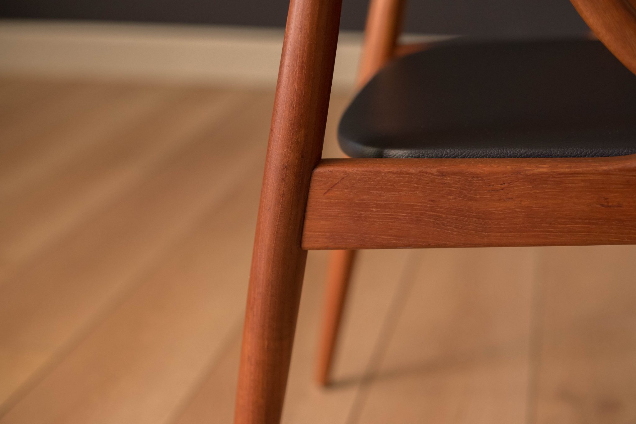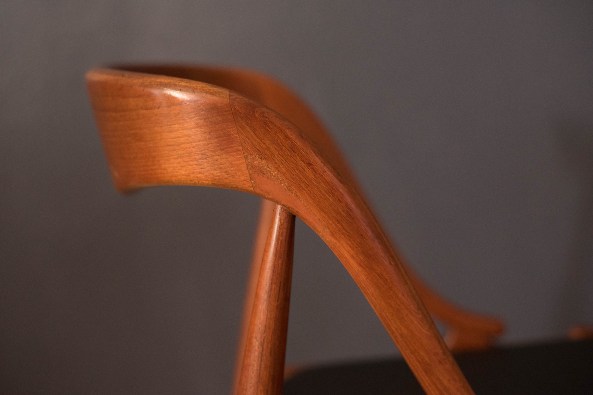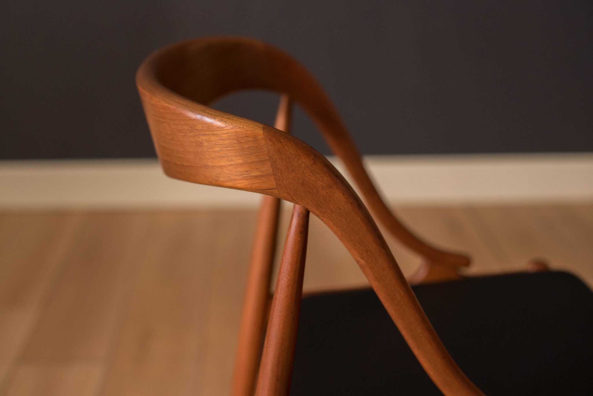 Mid century modern teak dining chairs by Johannes Andersen for Uldum Mobelfabrik. This set includes four dining chairs with newly reupholstered black vinyl seats. Designed with curved backrests and sculptural teak frames. Price is for the set.