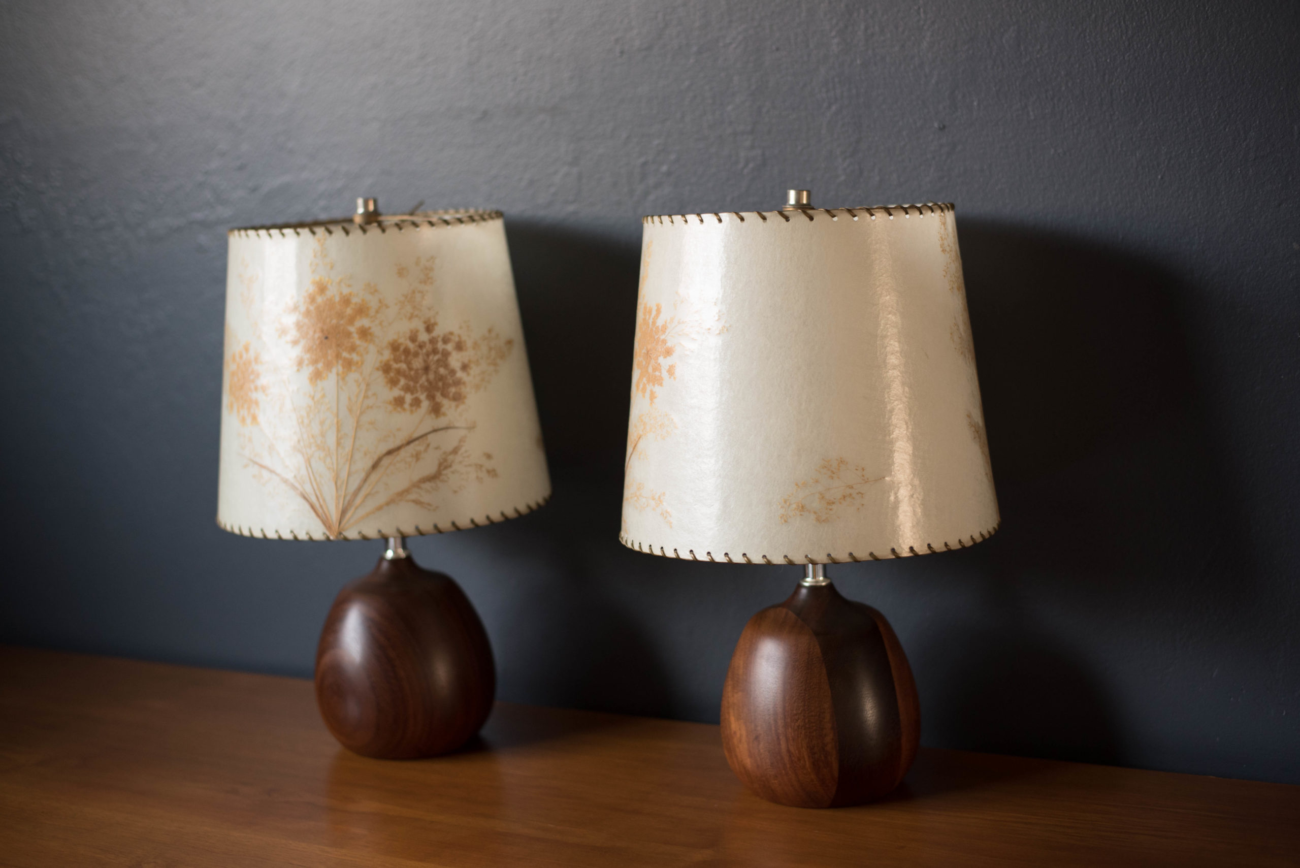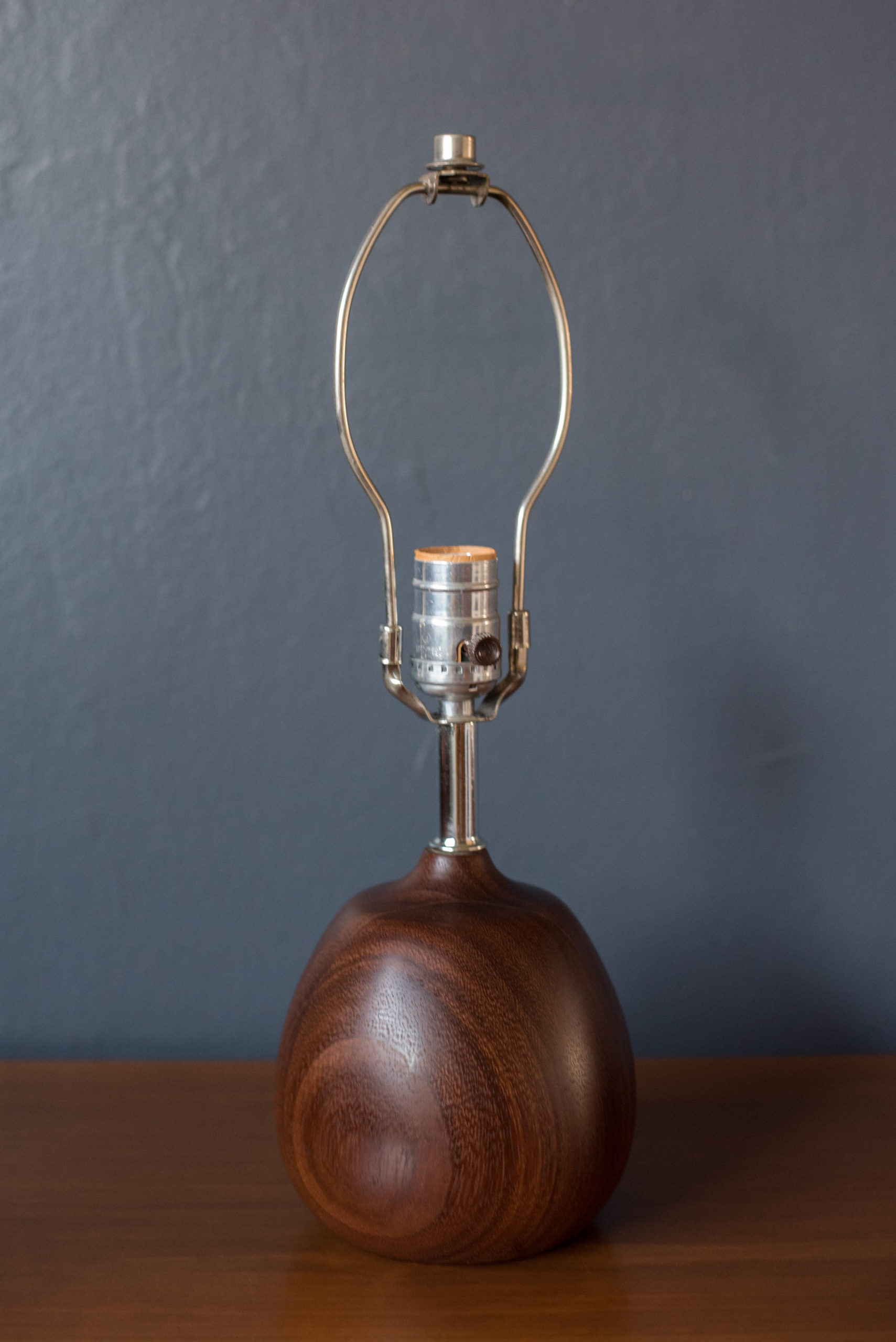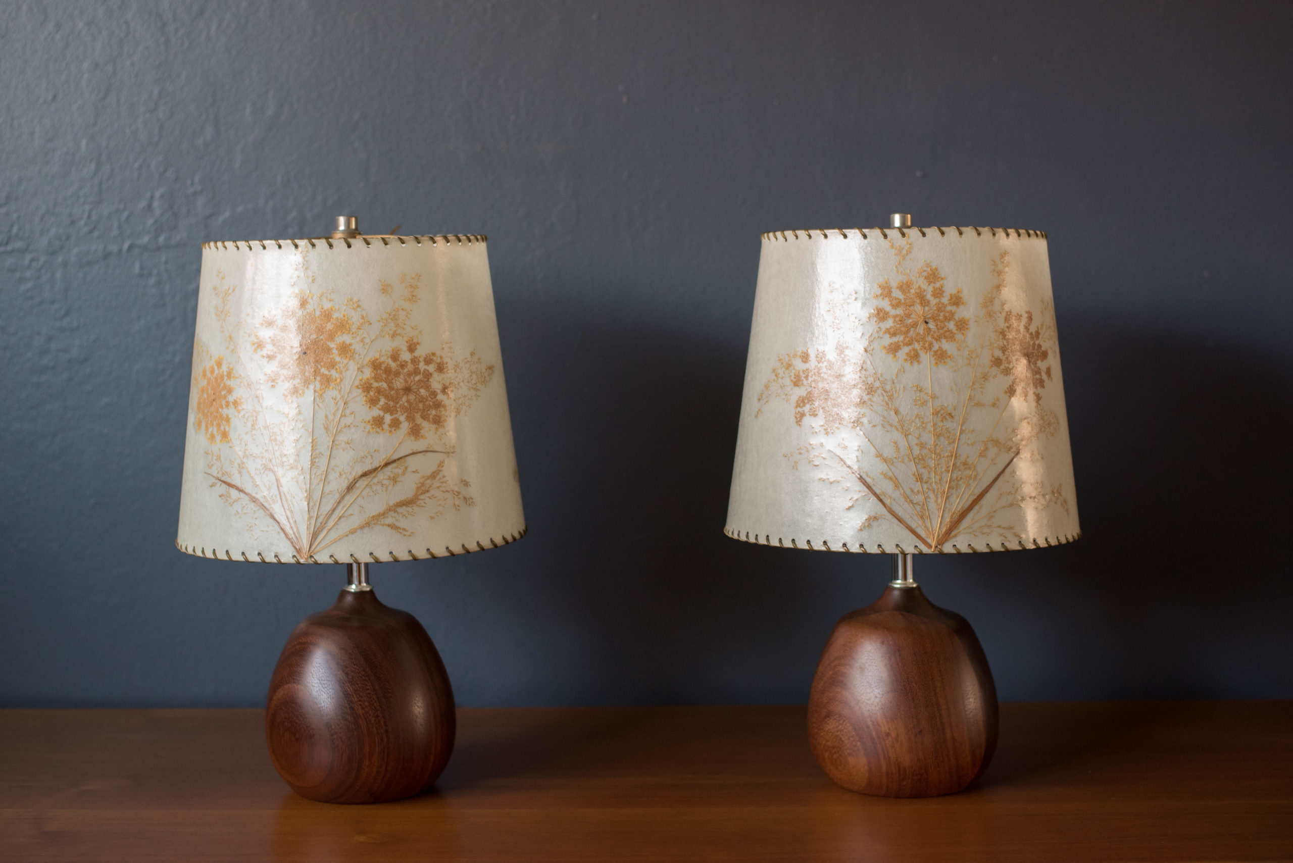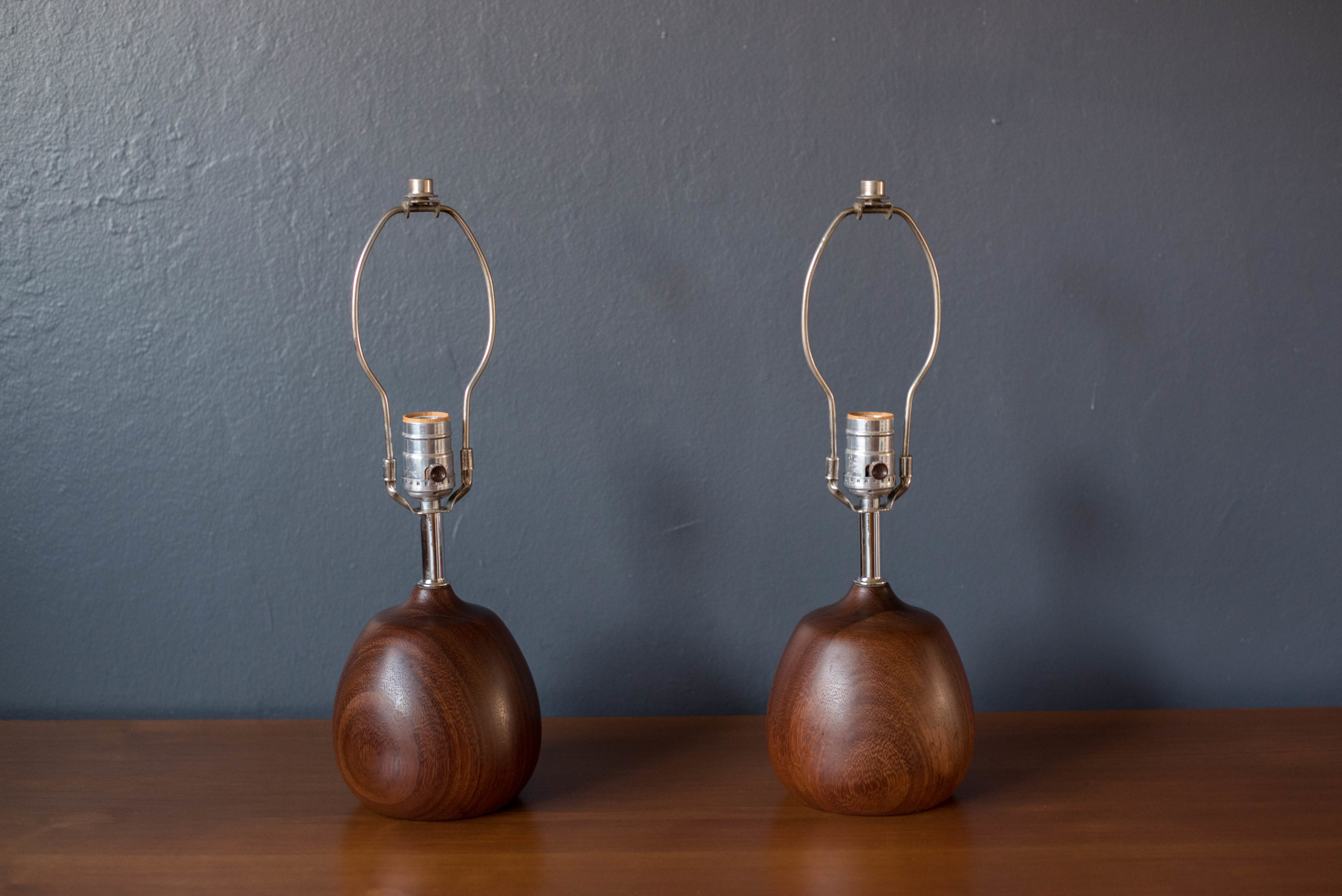 Vintage pair of Scandinavian Modern lamps circa 1960s. This unique set features a sculptural solid turned base in old growth teak accented with chrome hardware. Equipped with 3-way switch lighting. Shades are not included. Price is for the pair.