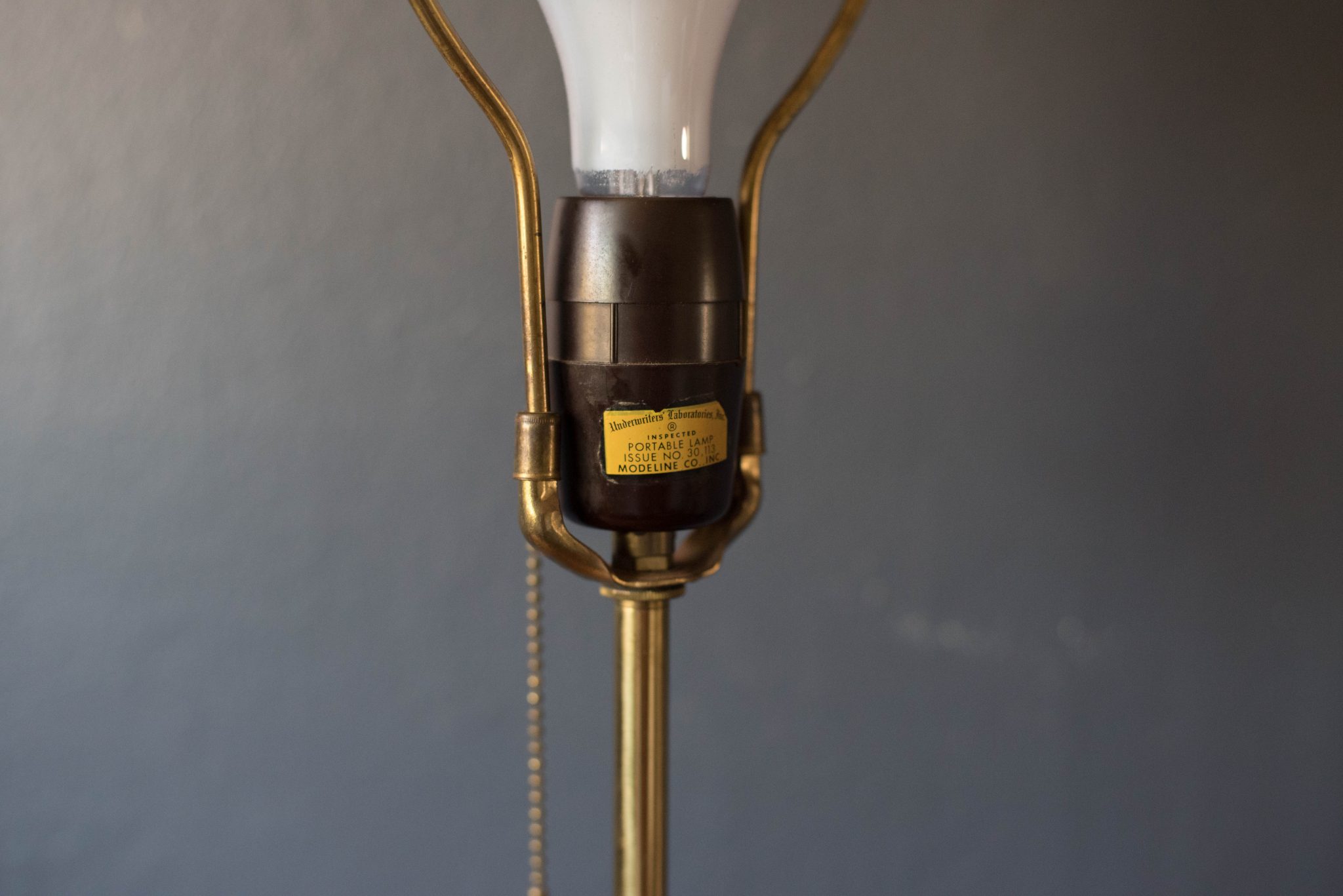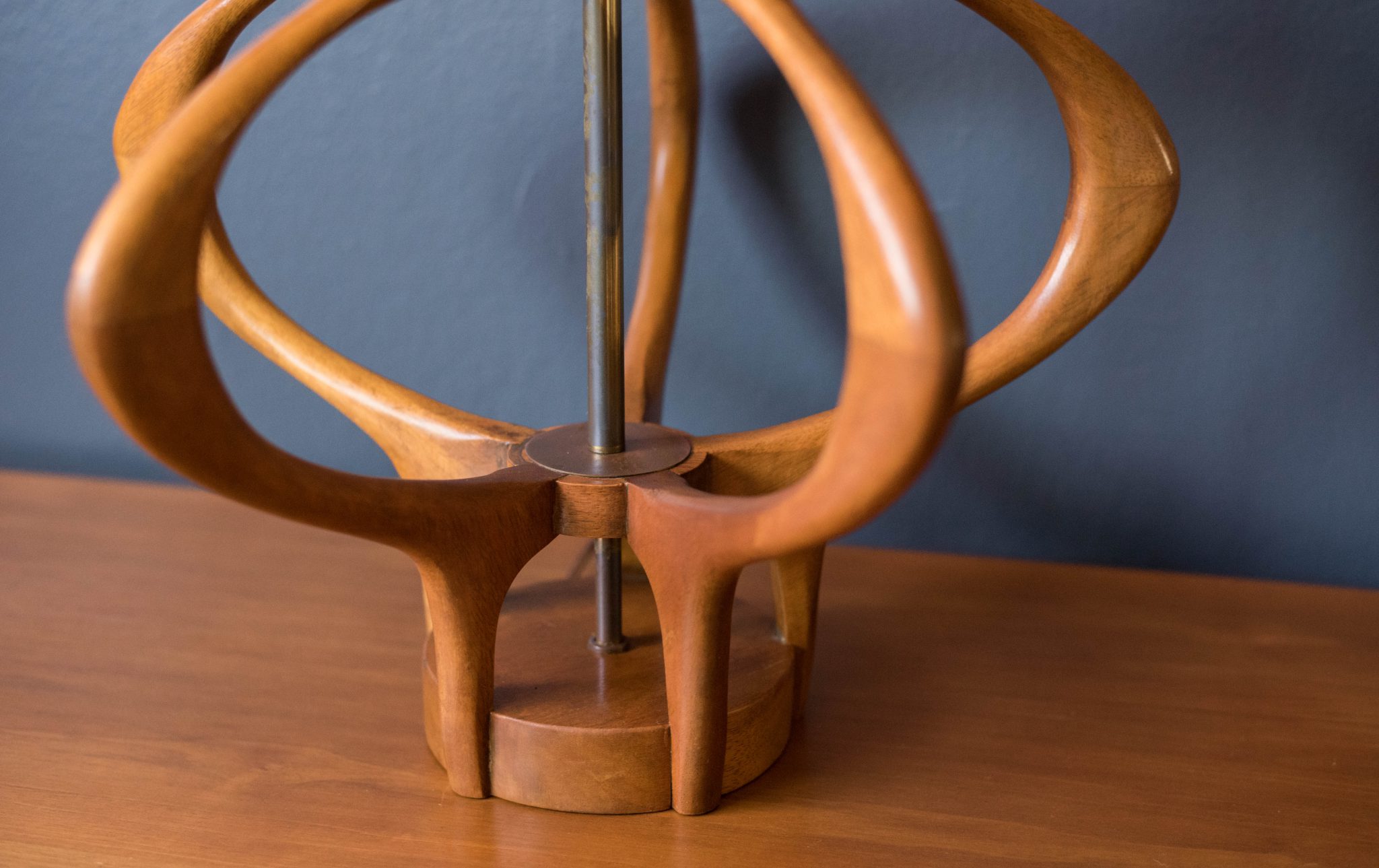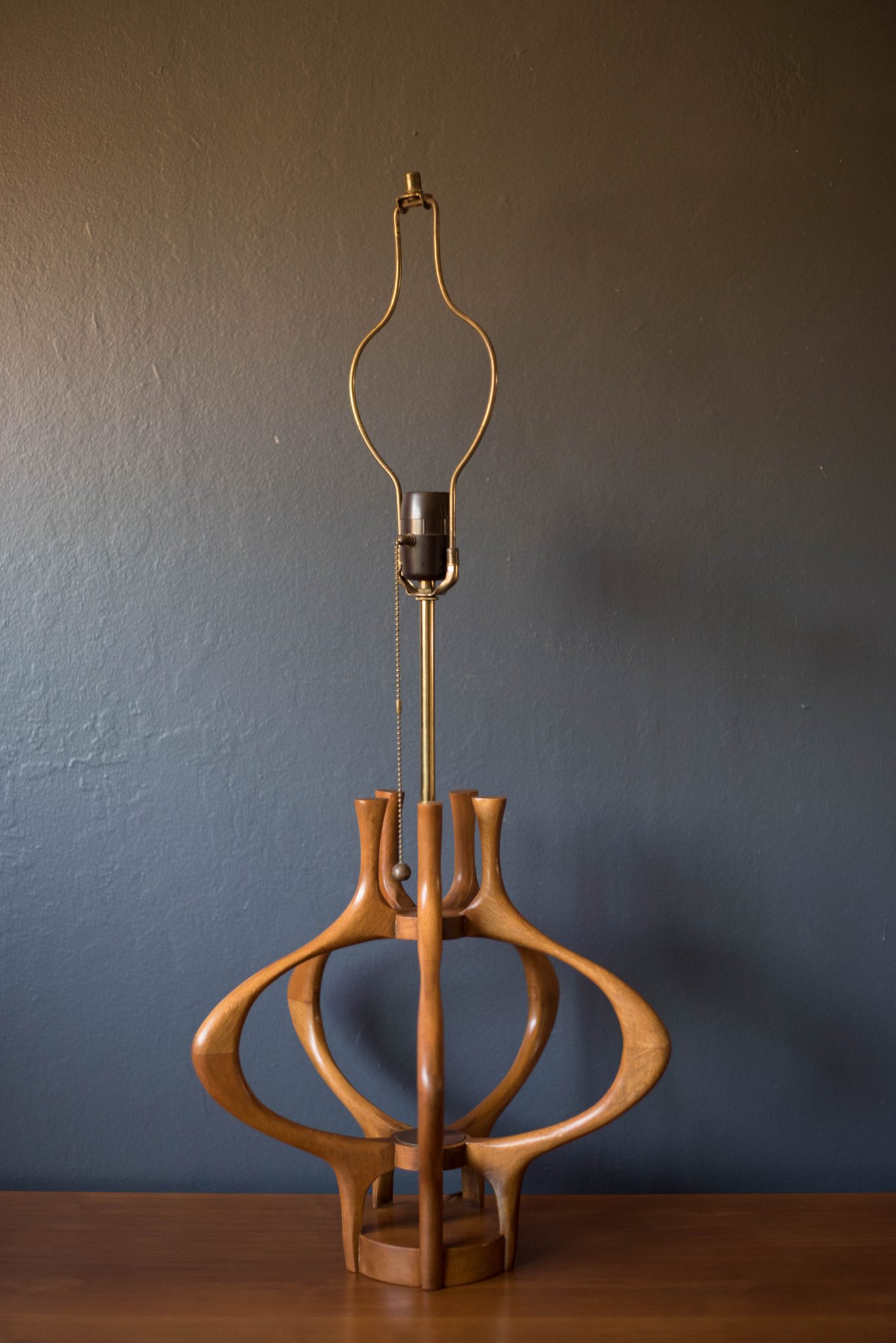 Mid-Century Modern lamp designed by Modeline, circa 1960s. This sculptural piece includes brass accents and a three way switch. Shade is not included.