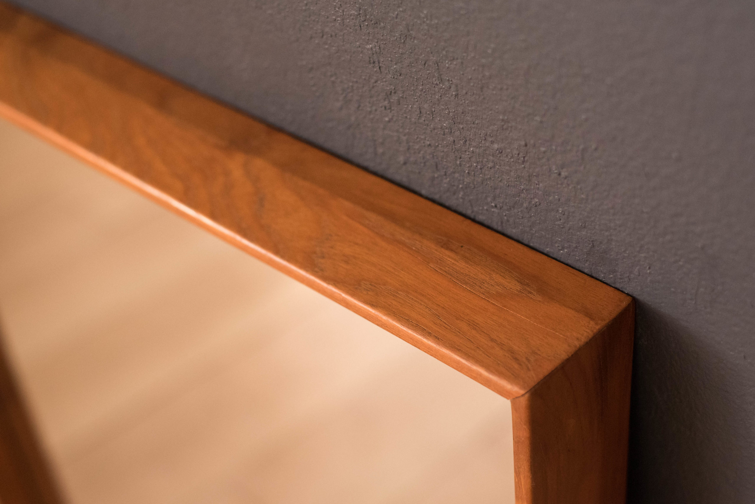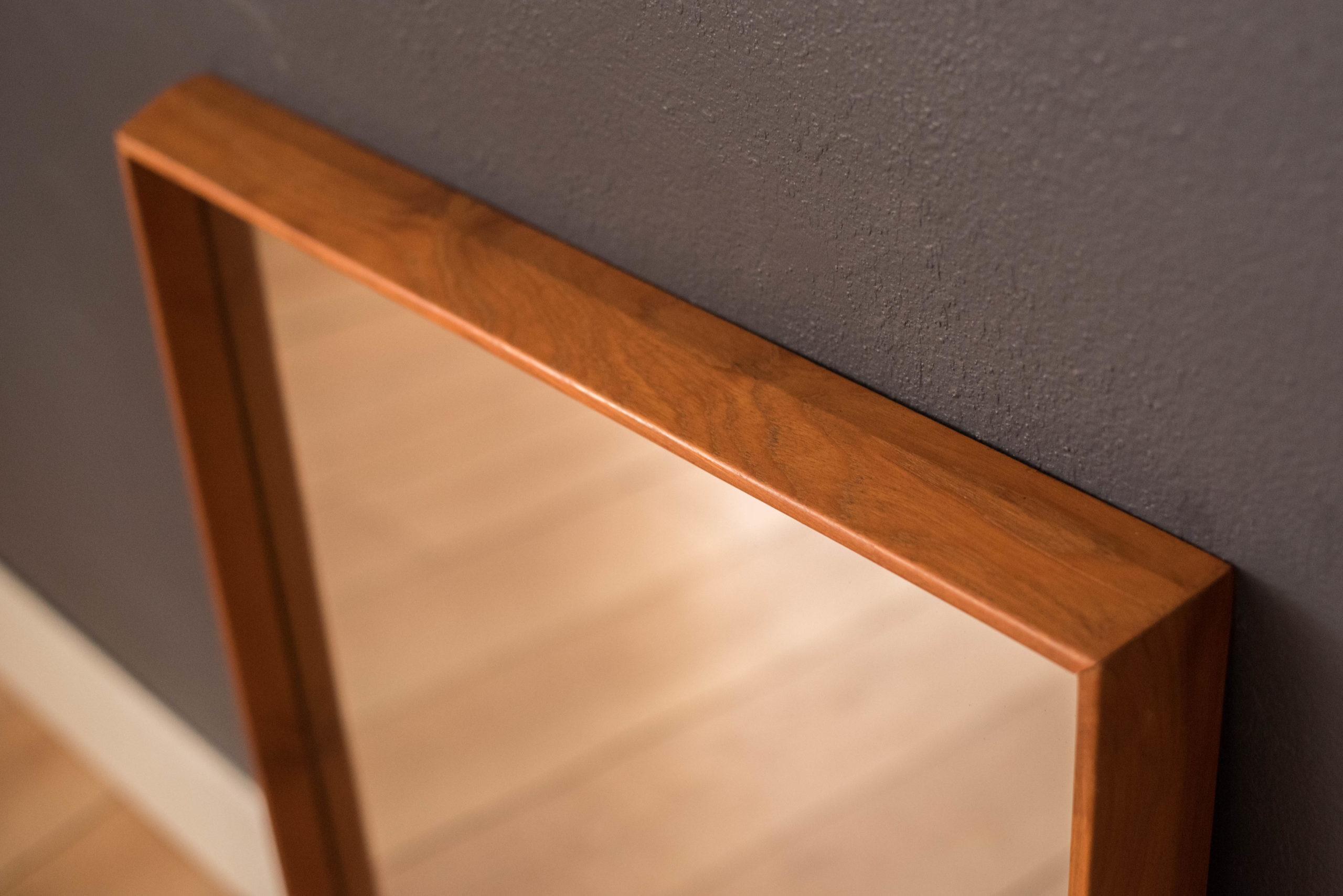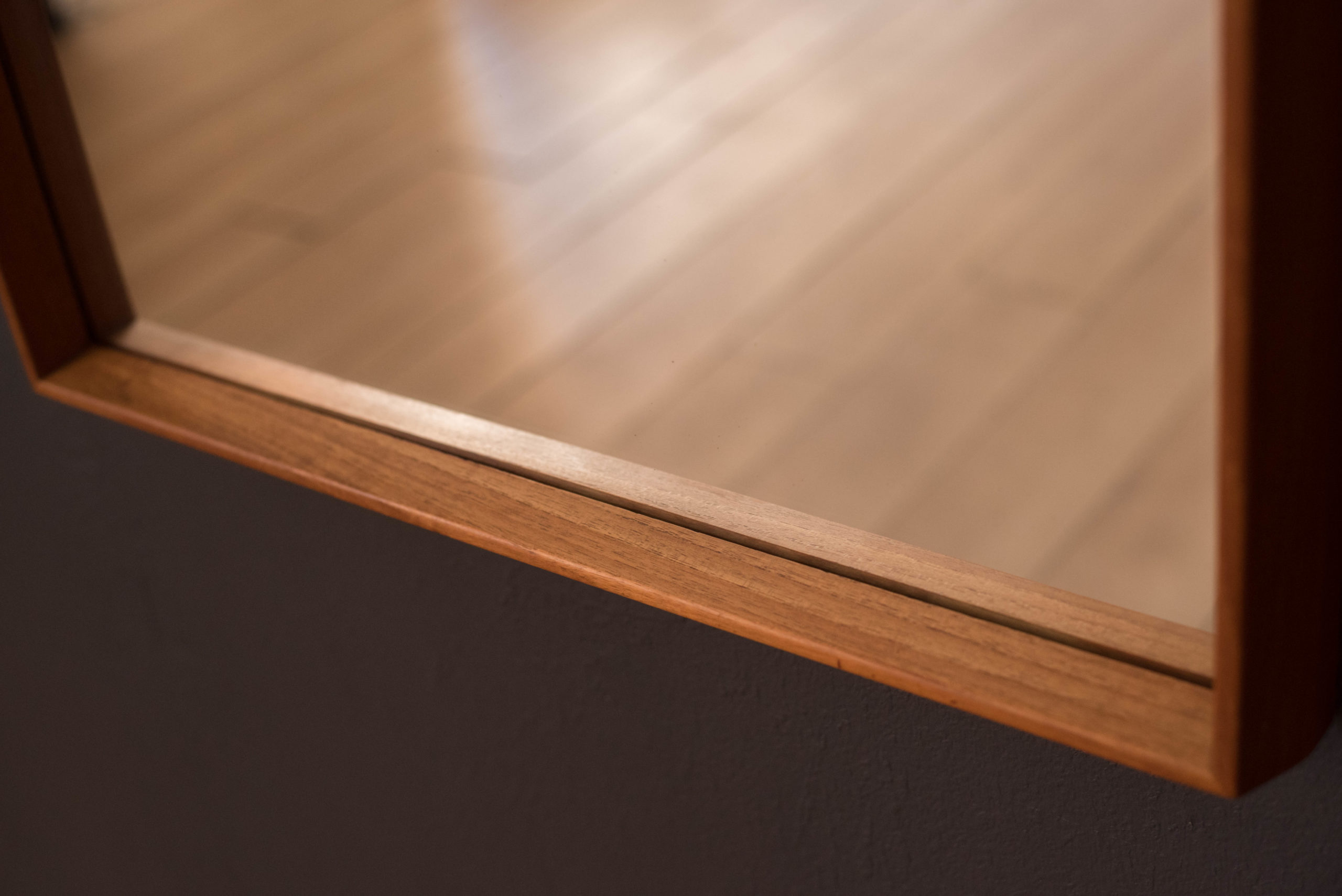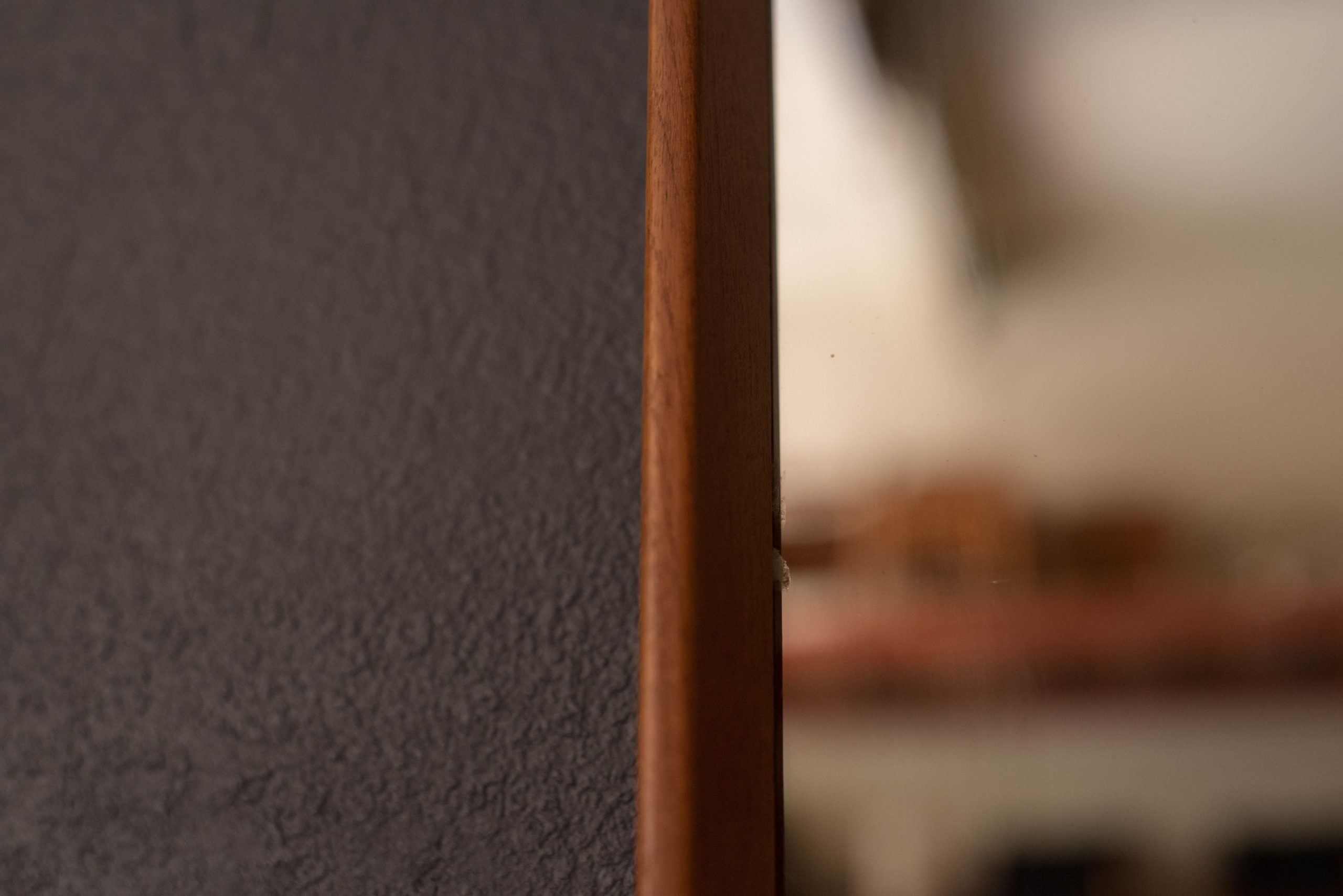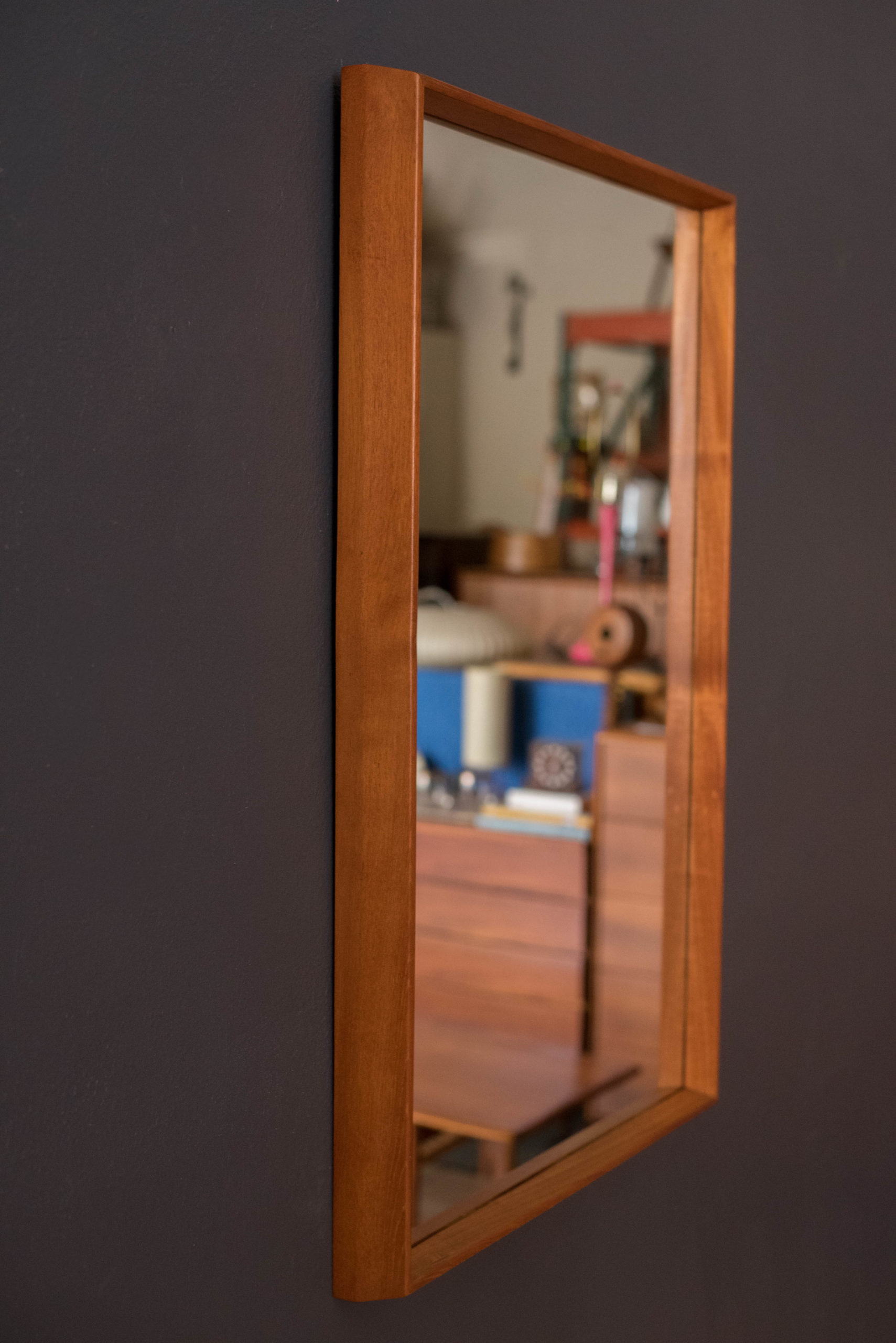 Mid-Century Modern accent hanging wall mirror in teak circa 1960s. This versatile piece displays a contoured natural wood frame in a rectangular mid-length shape. Fits perfectly in an entryway, bedroom or hallway space and can be mounted wide or tall.