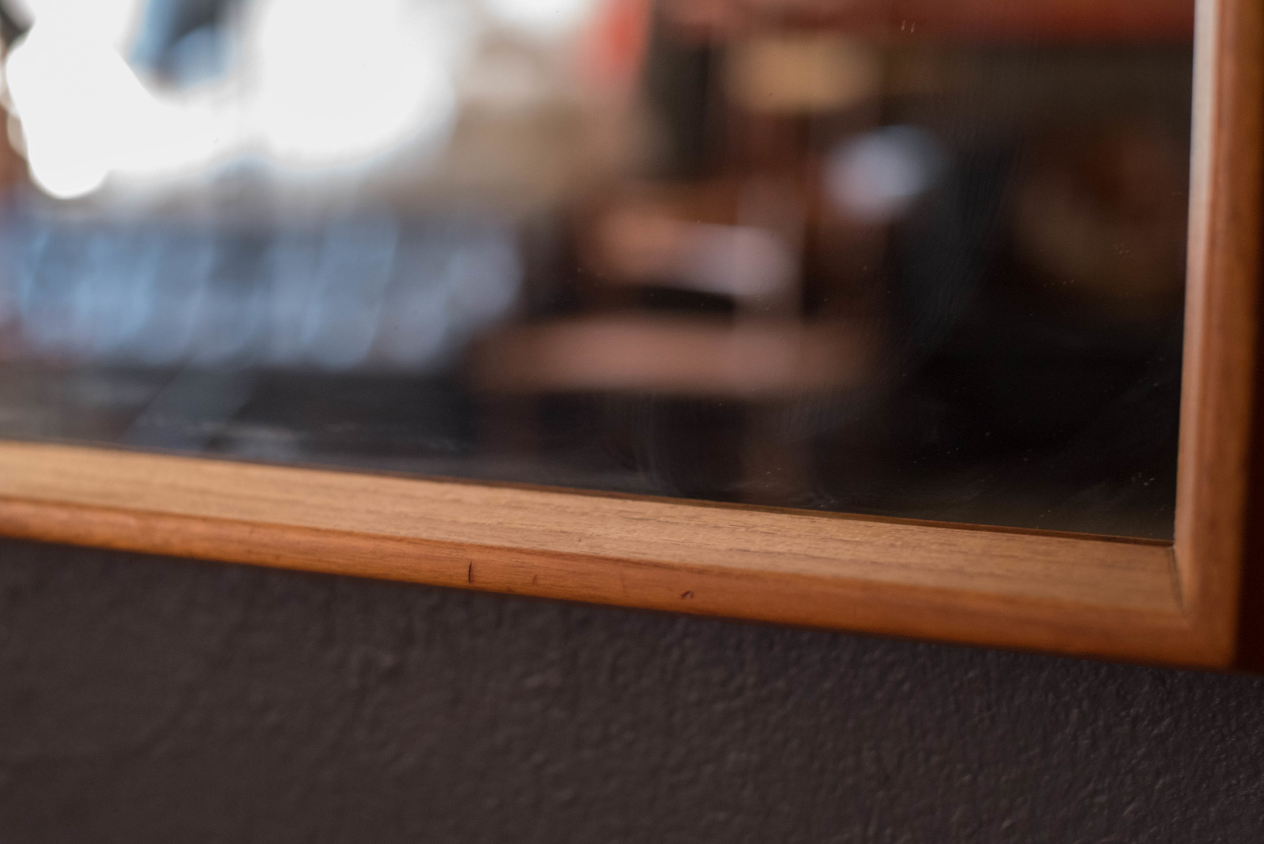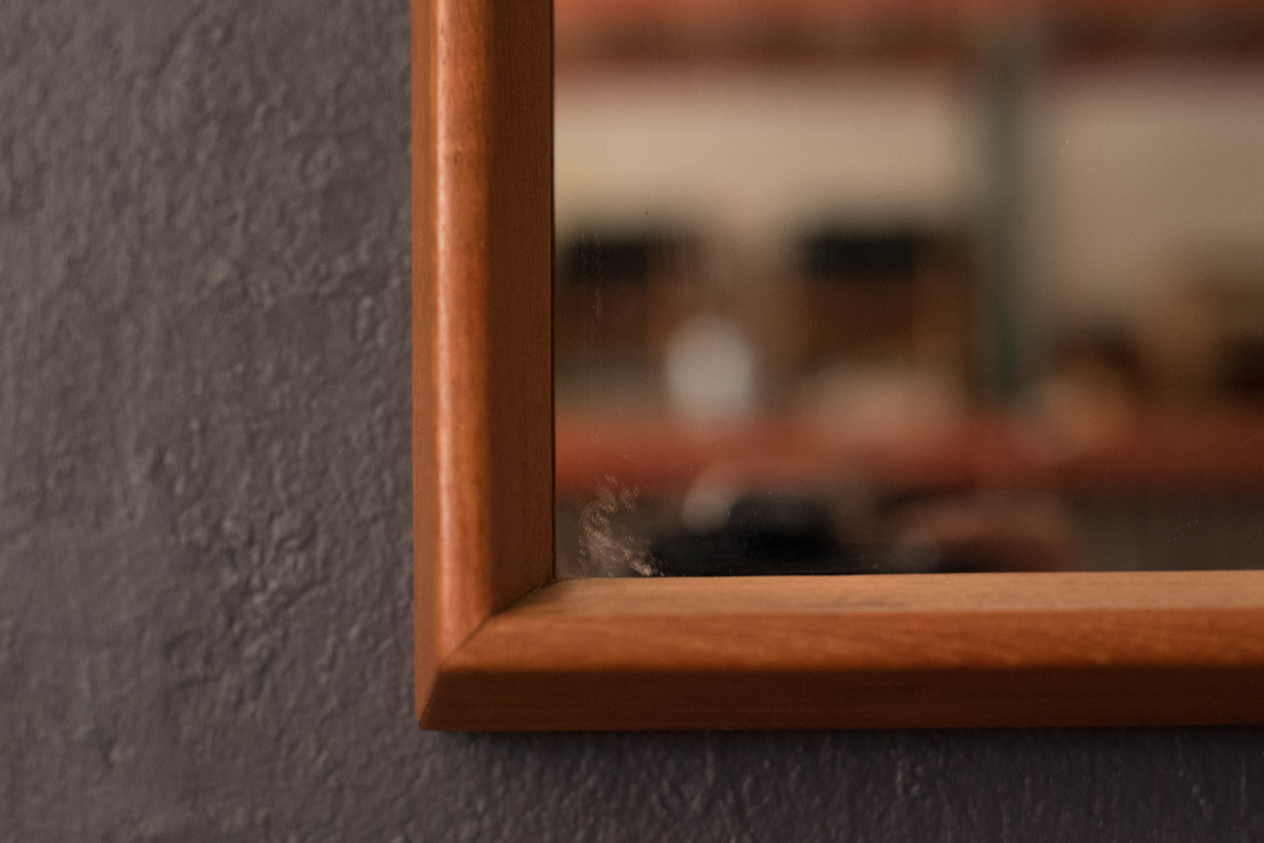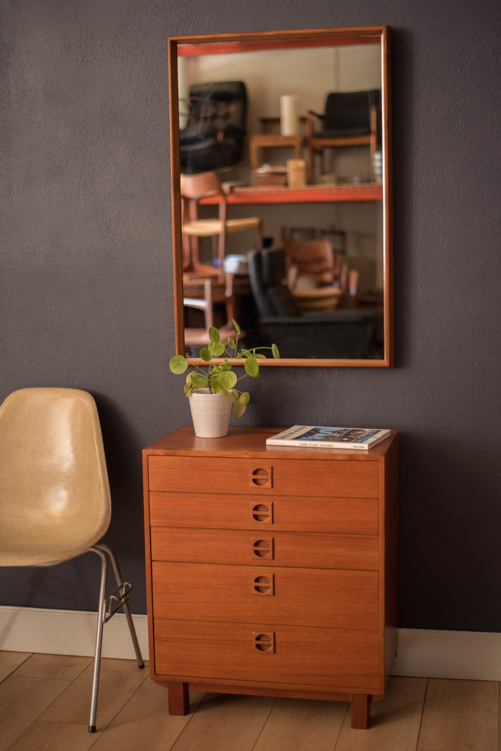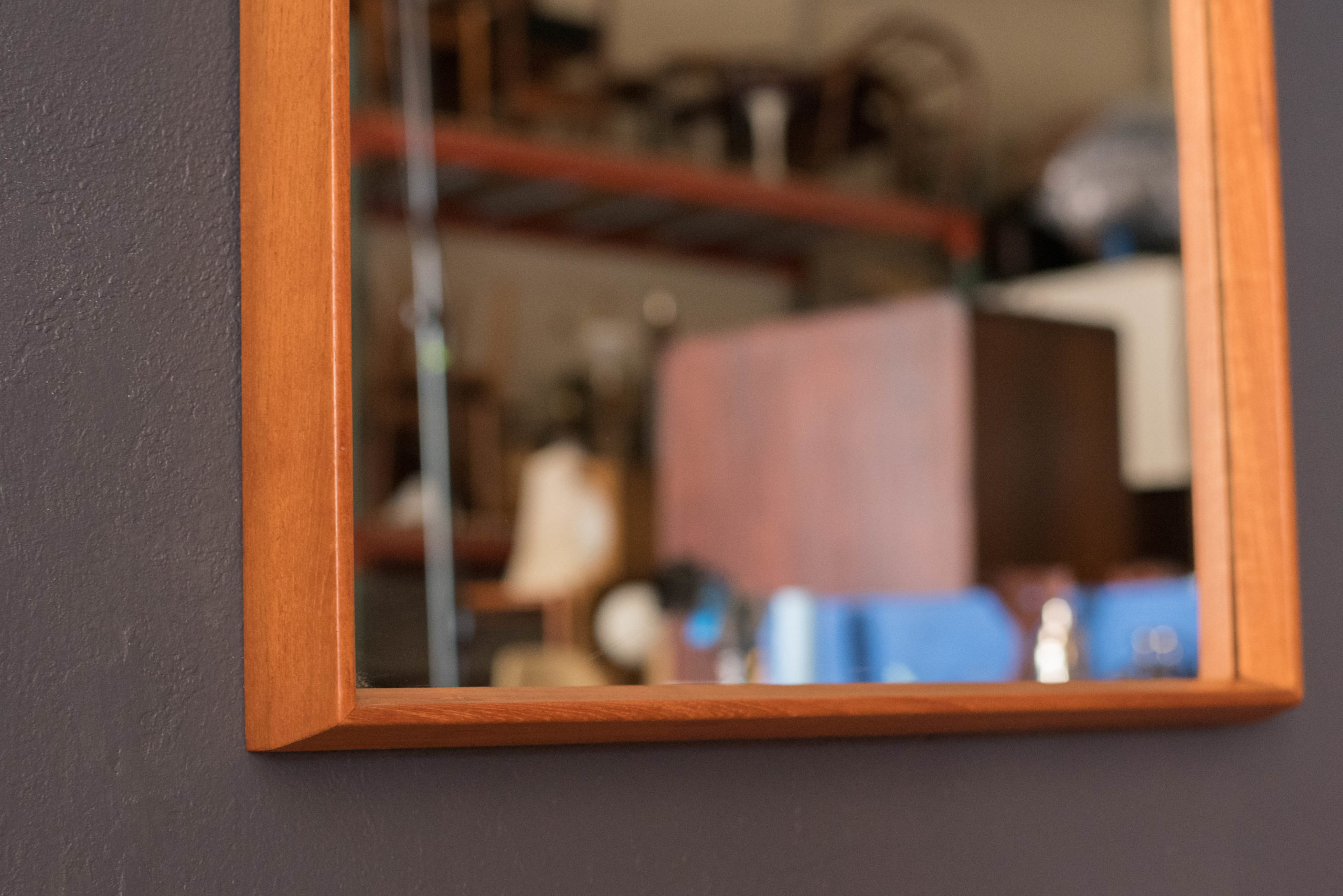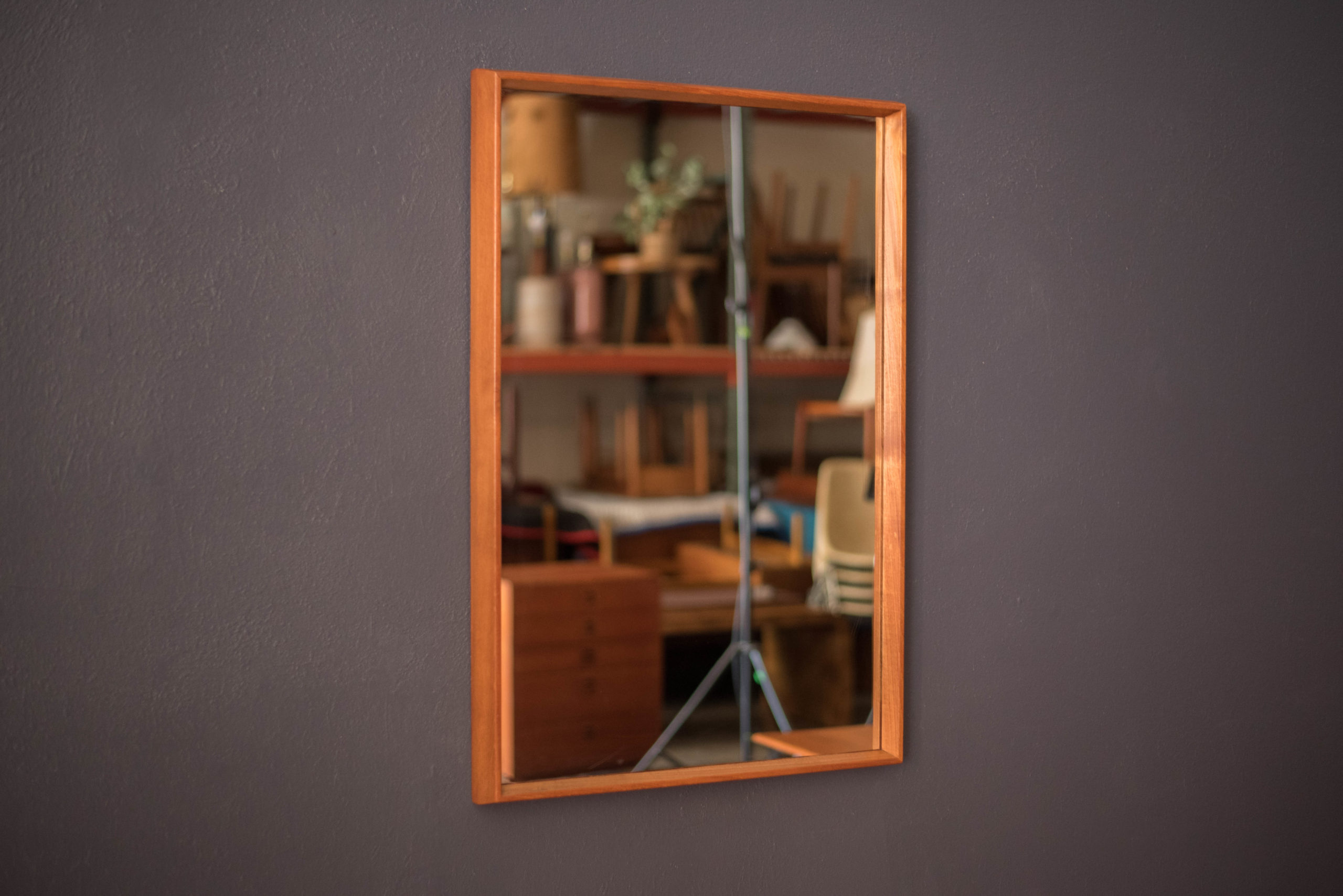 Mid-Century Modern accent hanging wall mirror in teak circa 1960s. This versatile piece displays a contoured natural wood frame in a rectangular mid-length shape. Fits perfectly in an entryway, bedroom or hallway space and can be mounted wide or tall.