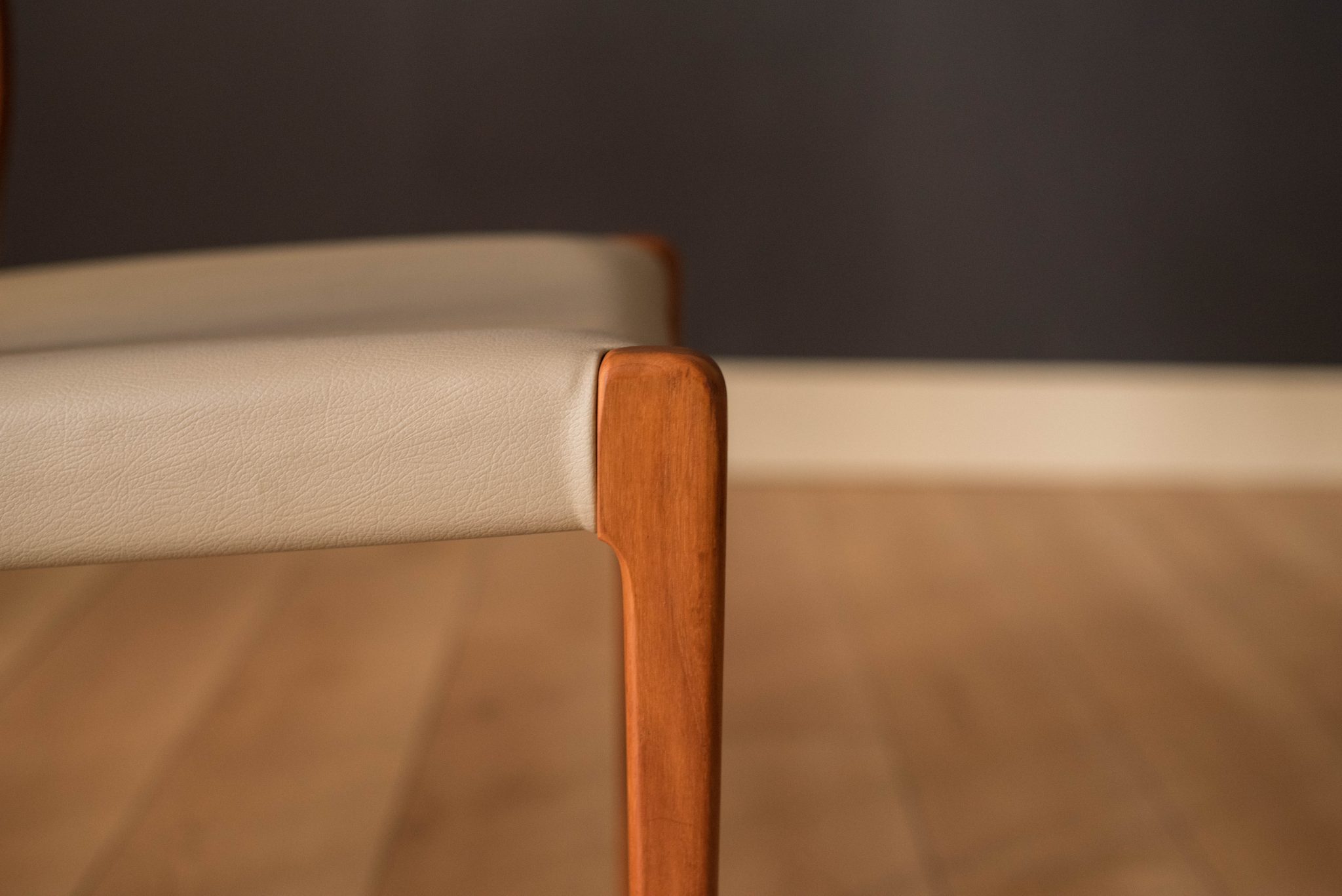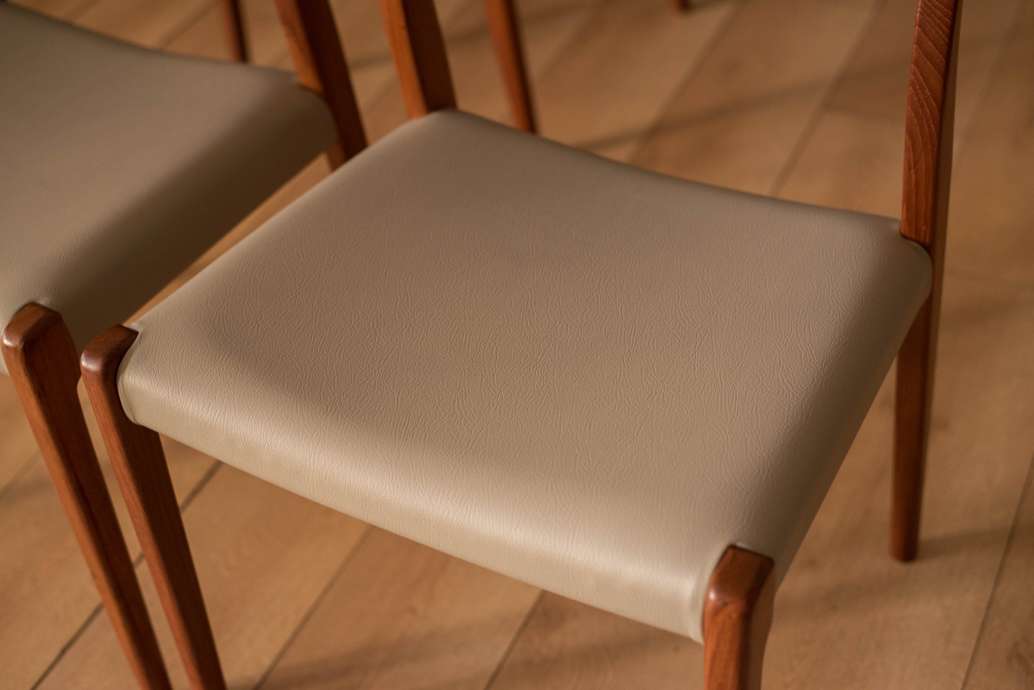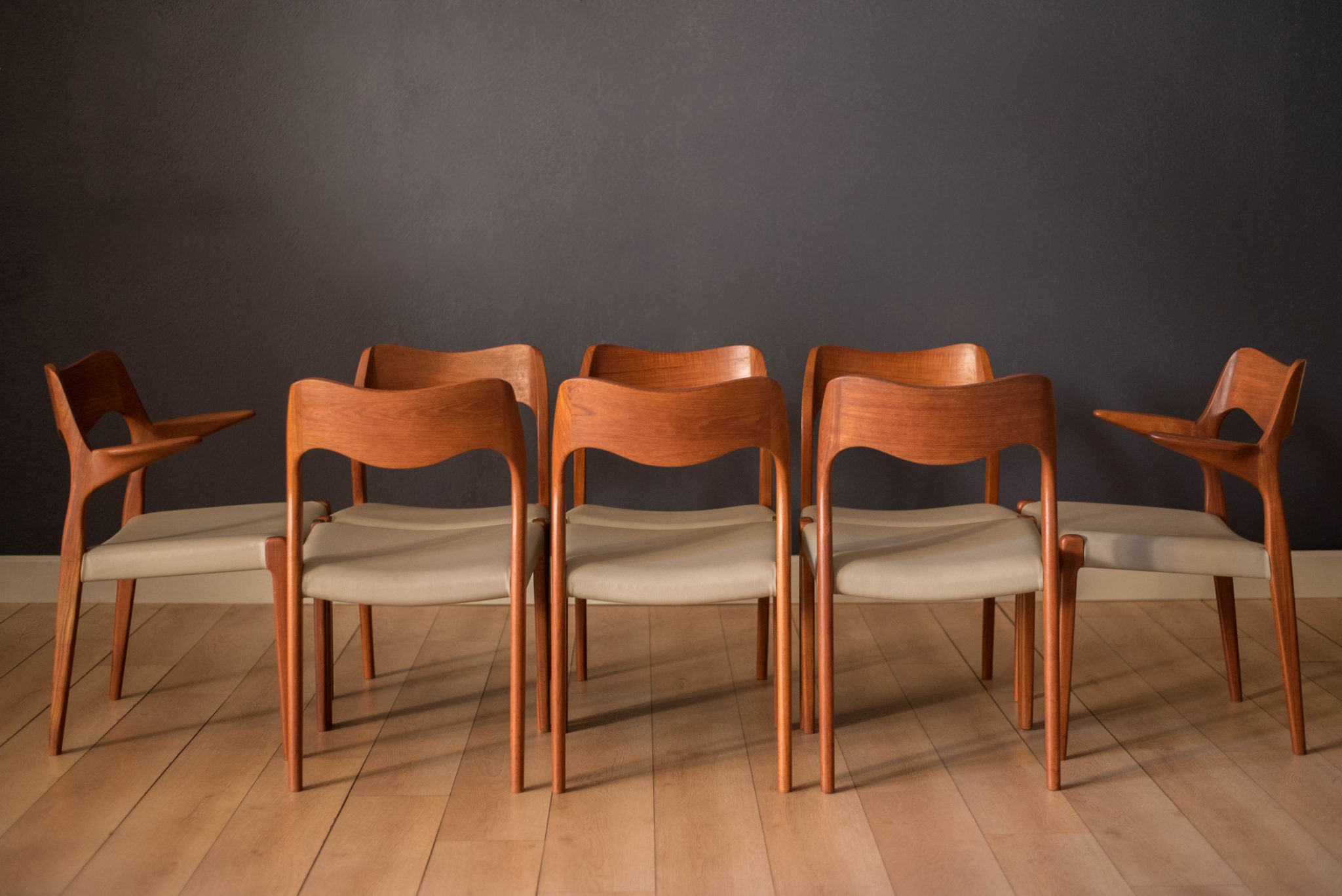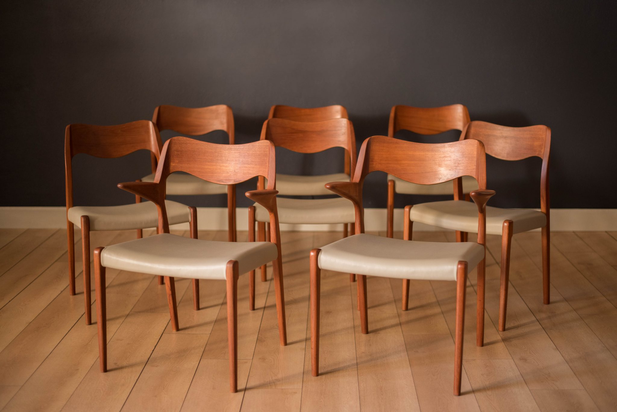 Mid century set of eight Danish dining chairs by Niels Møller for J.L. Møller Møbelfabrik in teak. This set includes six model 71 side chairs and two 55 armchairs. The seats have been professionally reupholstered in a nude gray leatherette. Price is for the set.