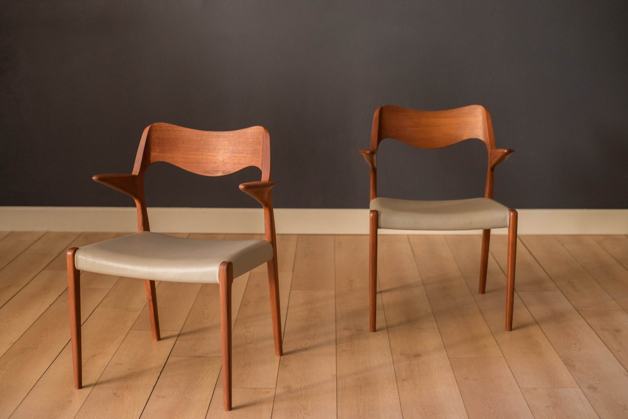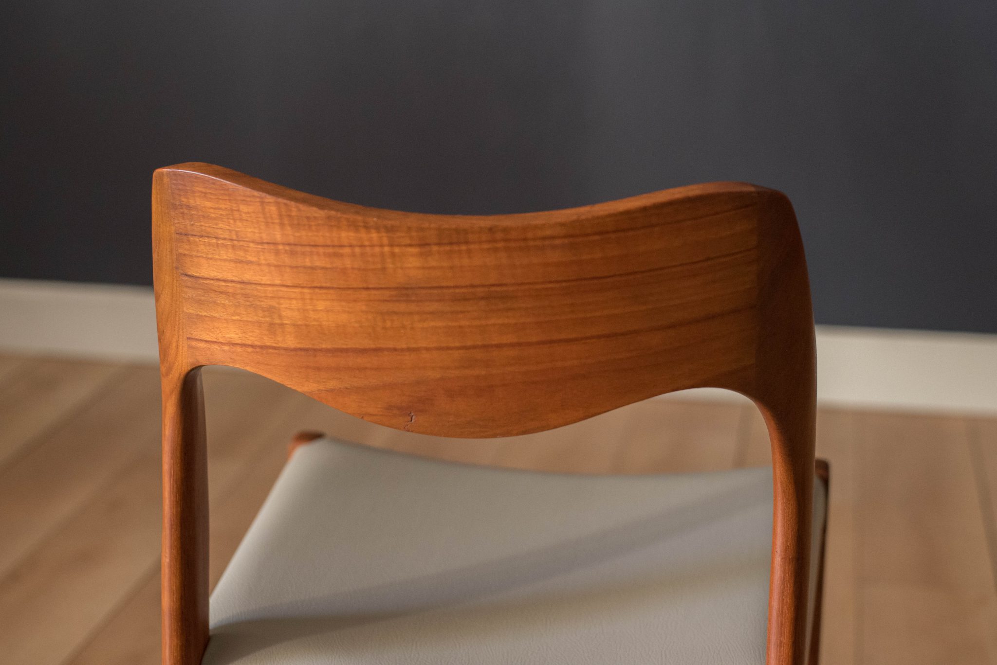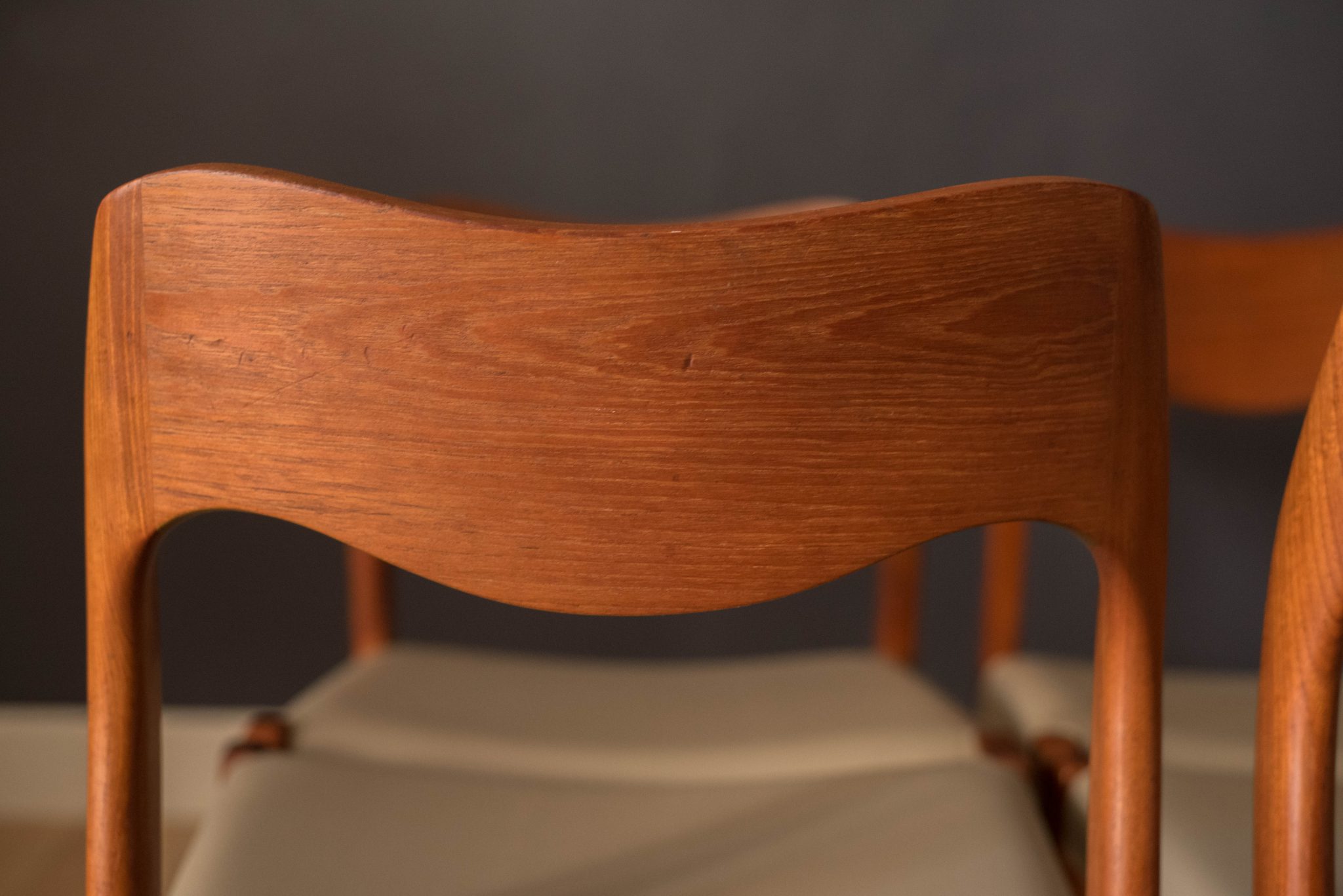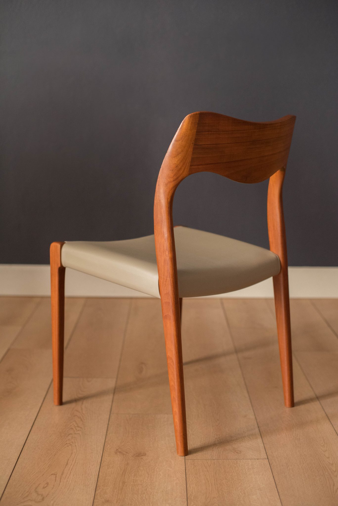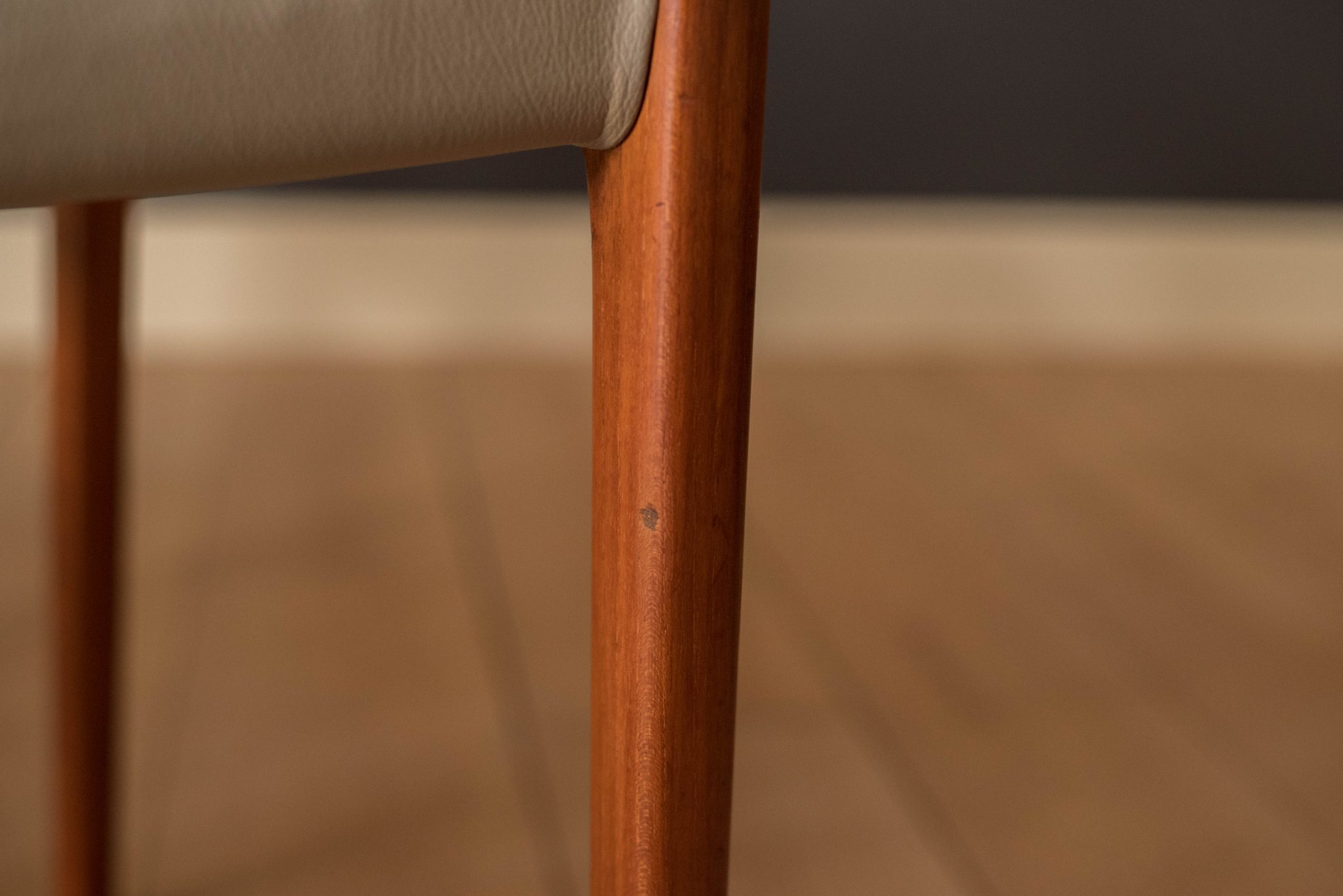 Mid century set of eight Danish dining chairs by Niels Møller for J.L. Møller Møbelfabrik in teak. This set includes six model 71 side chairs and two 55 armchairs. The seats have been professionally reupholstered in a nude gray leatherette. Price is for the set.
