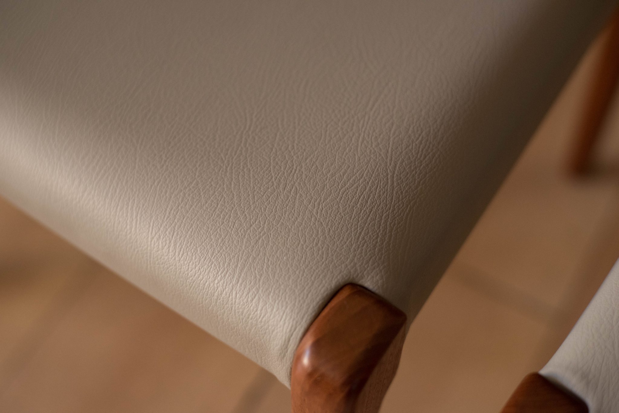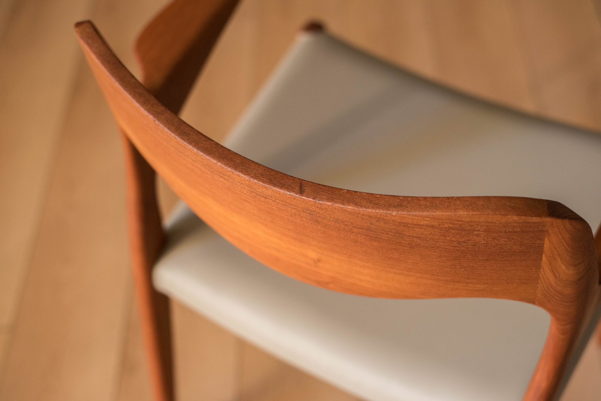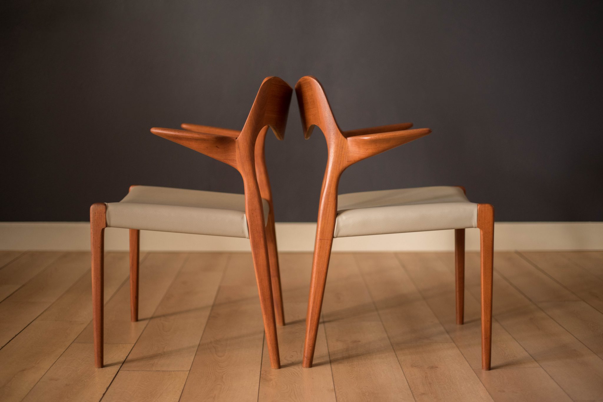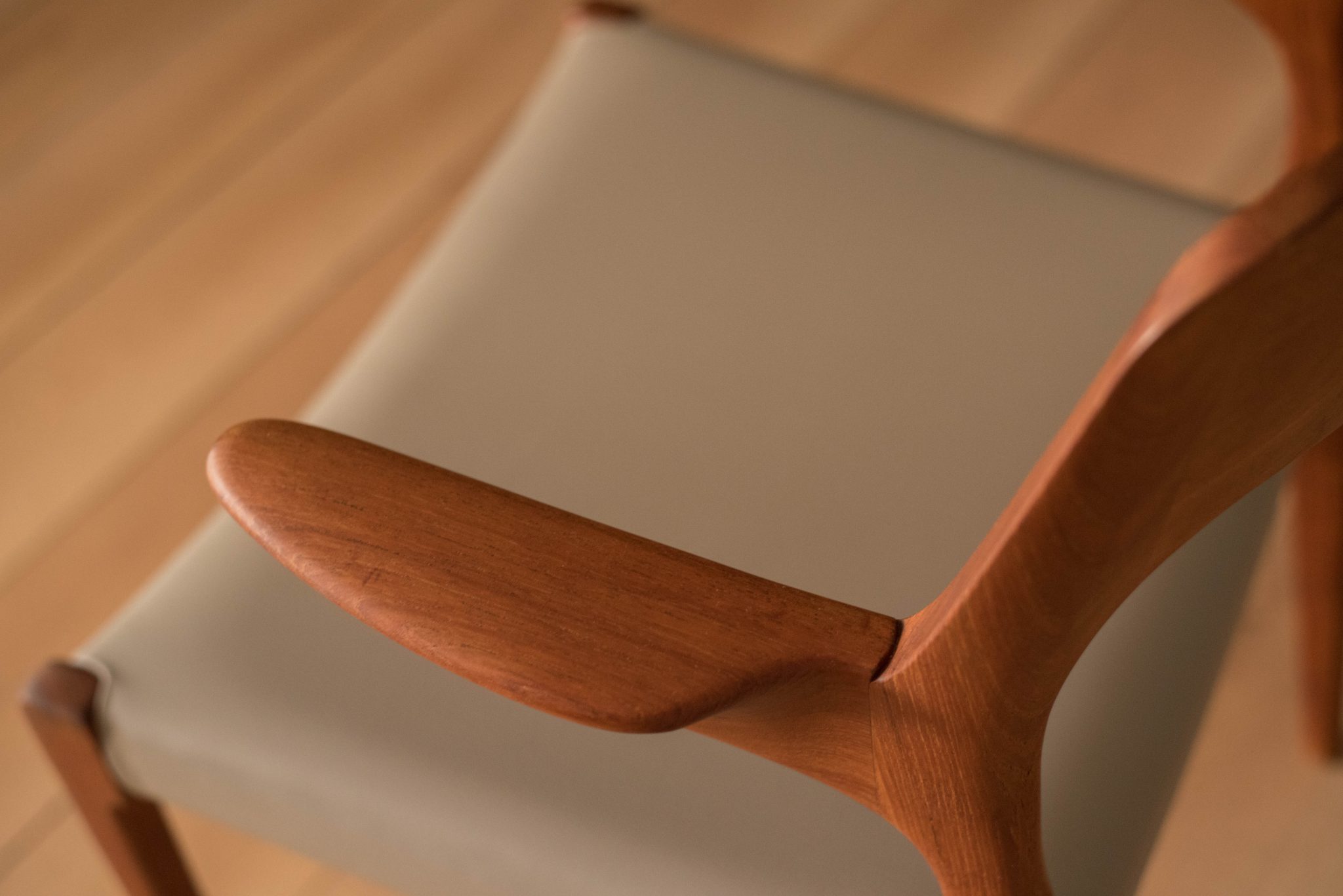 Mid century set of eight Danish dining chairs by Niels Møller for J.L. Møller Møbelfabrik in teak. This set includes six model 71 side chairs and two 55 armchairs. The seats have been professionally reupholstered in a nude gray leatherette. Price is for the set.