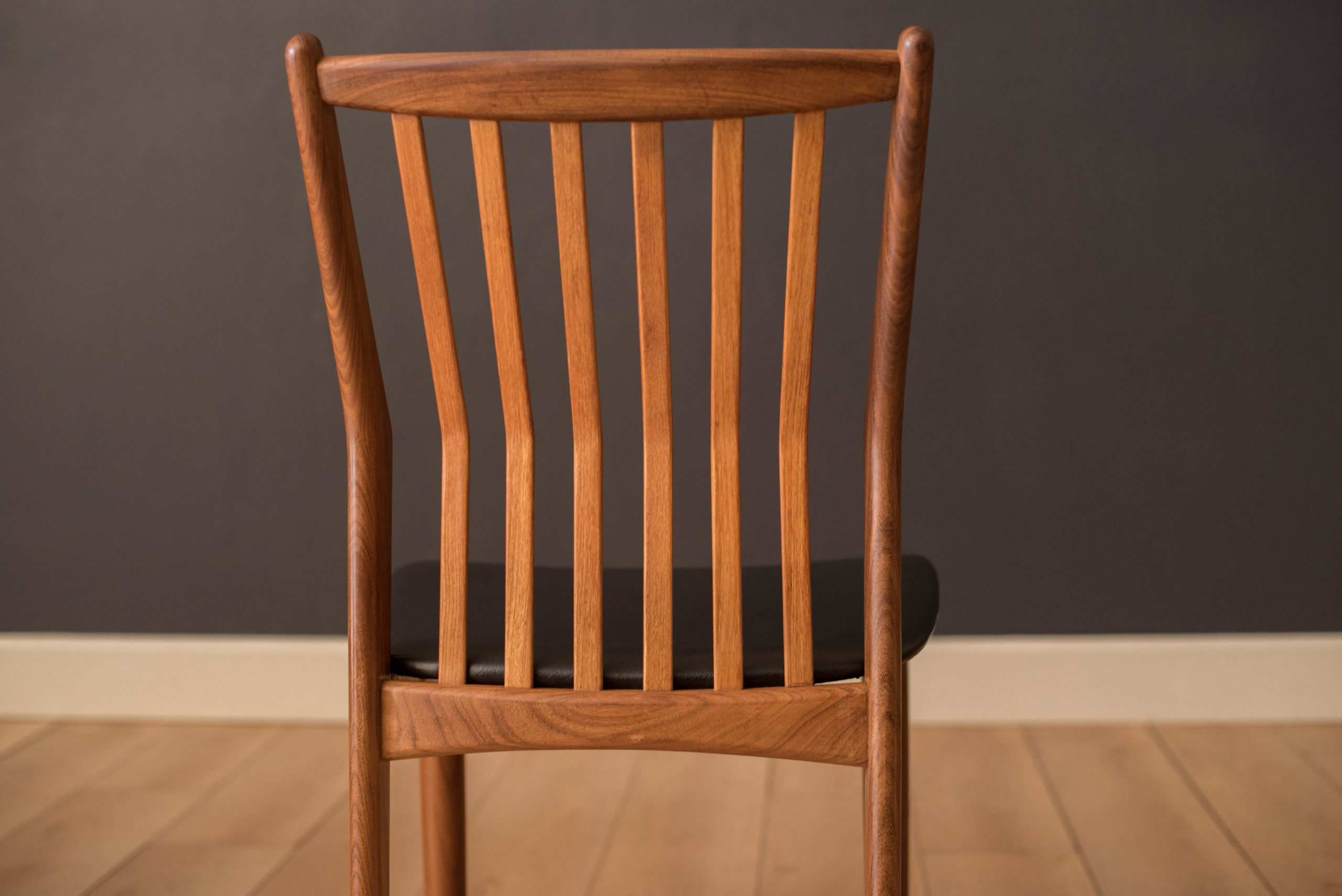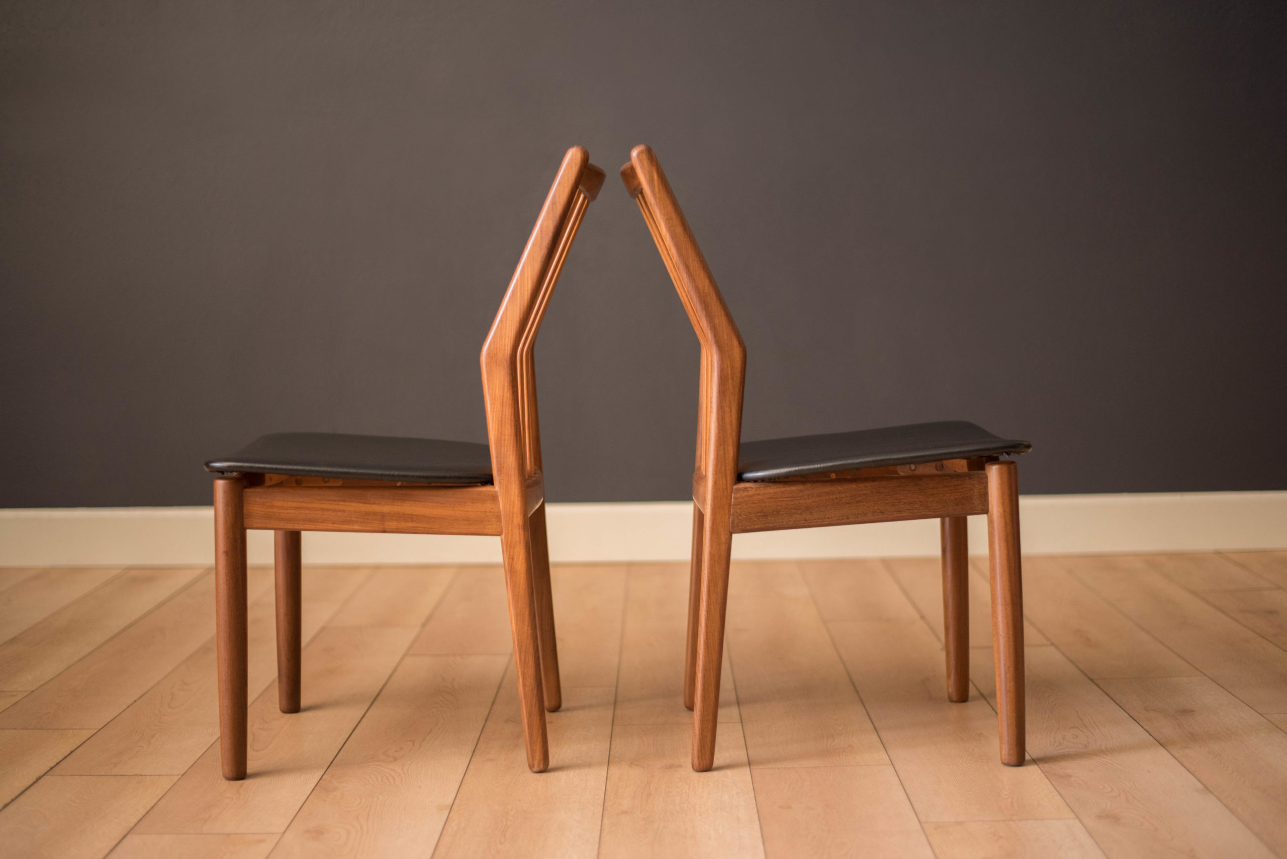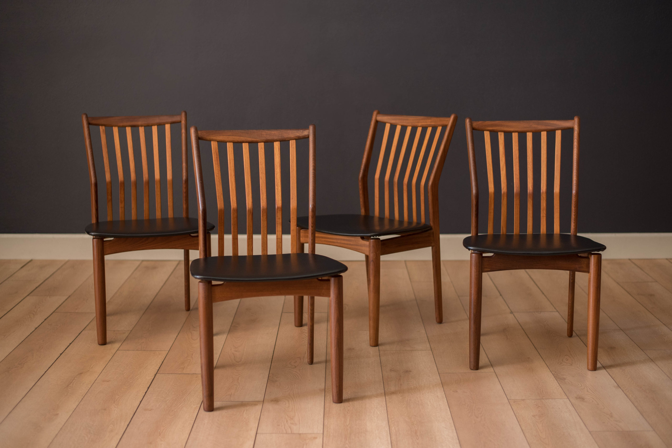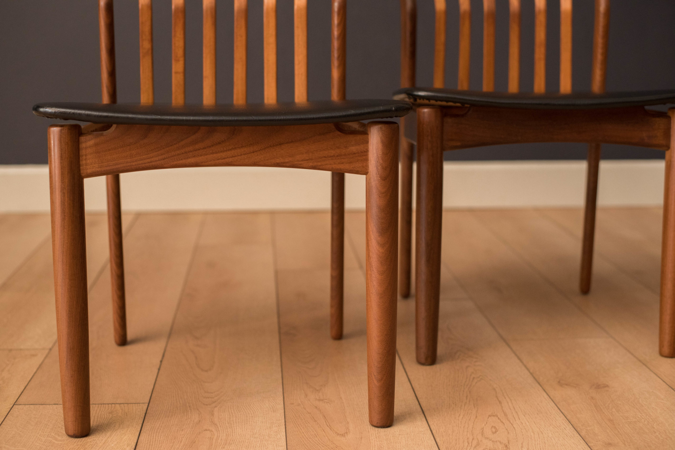 Mid-Century Modern set of four dining chairs in teak and afromasia by Svend Madsen for Moreddi, Denmark circa 1960’s. Features a supporting curved backrest and a wide frame seat unusual for Danish design. Retains the original black leatherette seats.