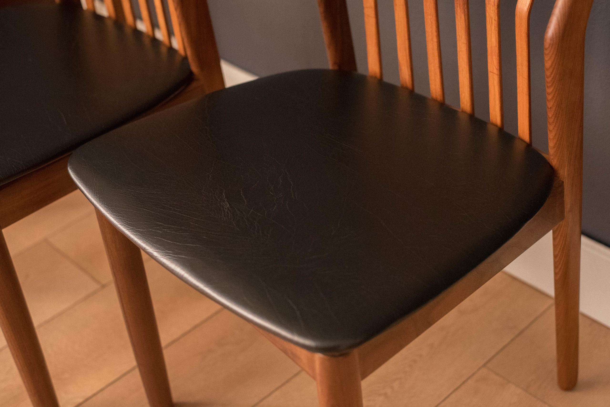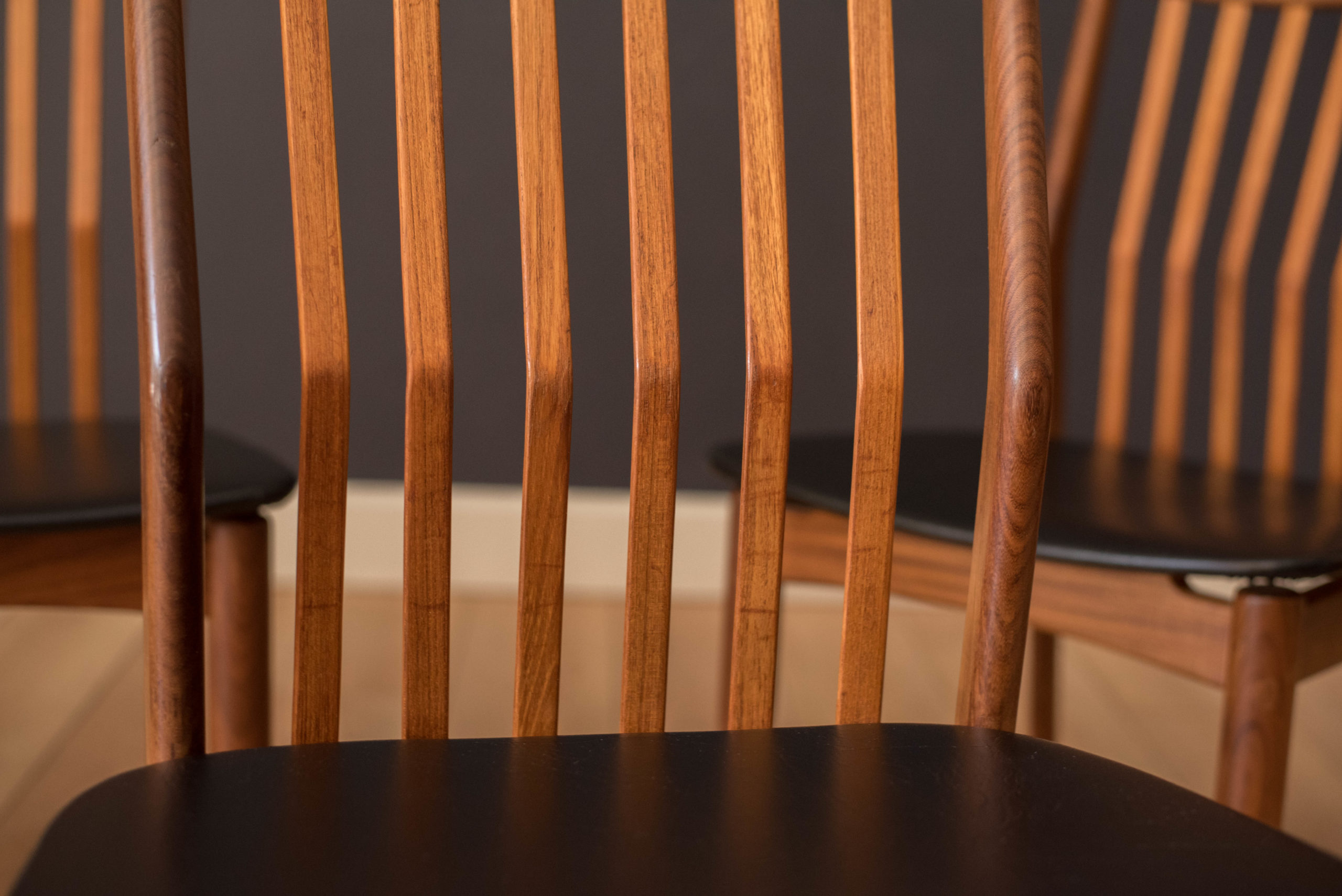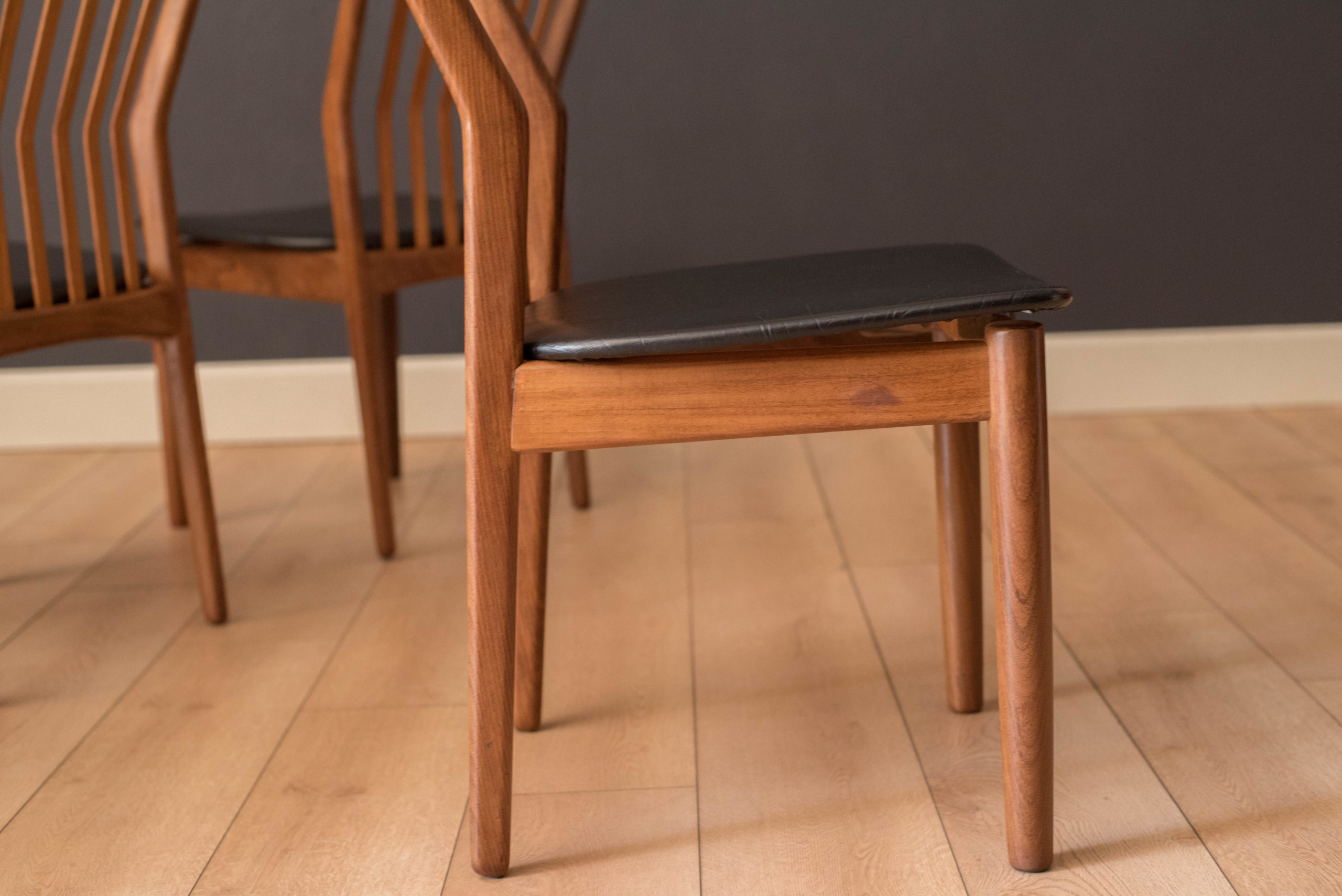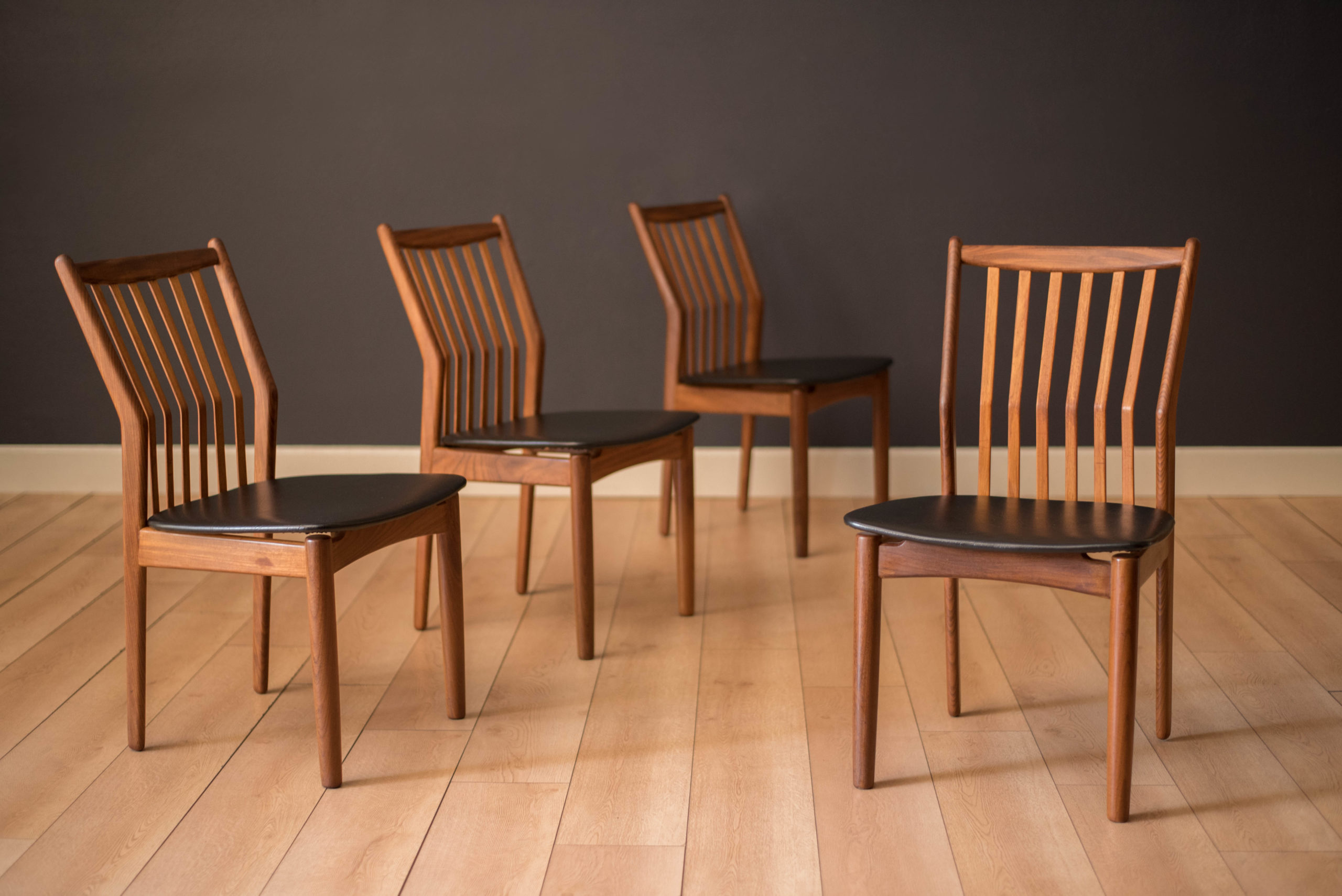 Mid-Century Modern set of four dining chairs in teak and afromasia by Svend Madsen for Moreddi, Denmark circa 1960’s. Features a supporting curved backrest and a wide frame seat unusual for Danish design. Retains the original black leatherette seats.