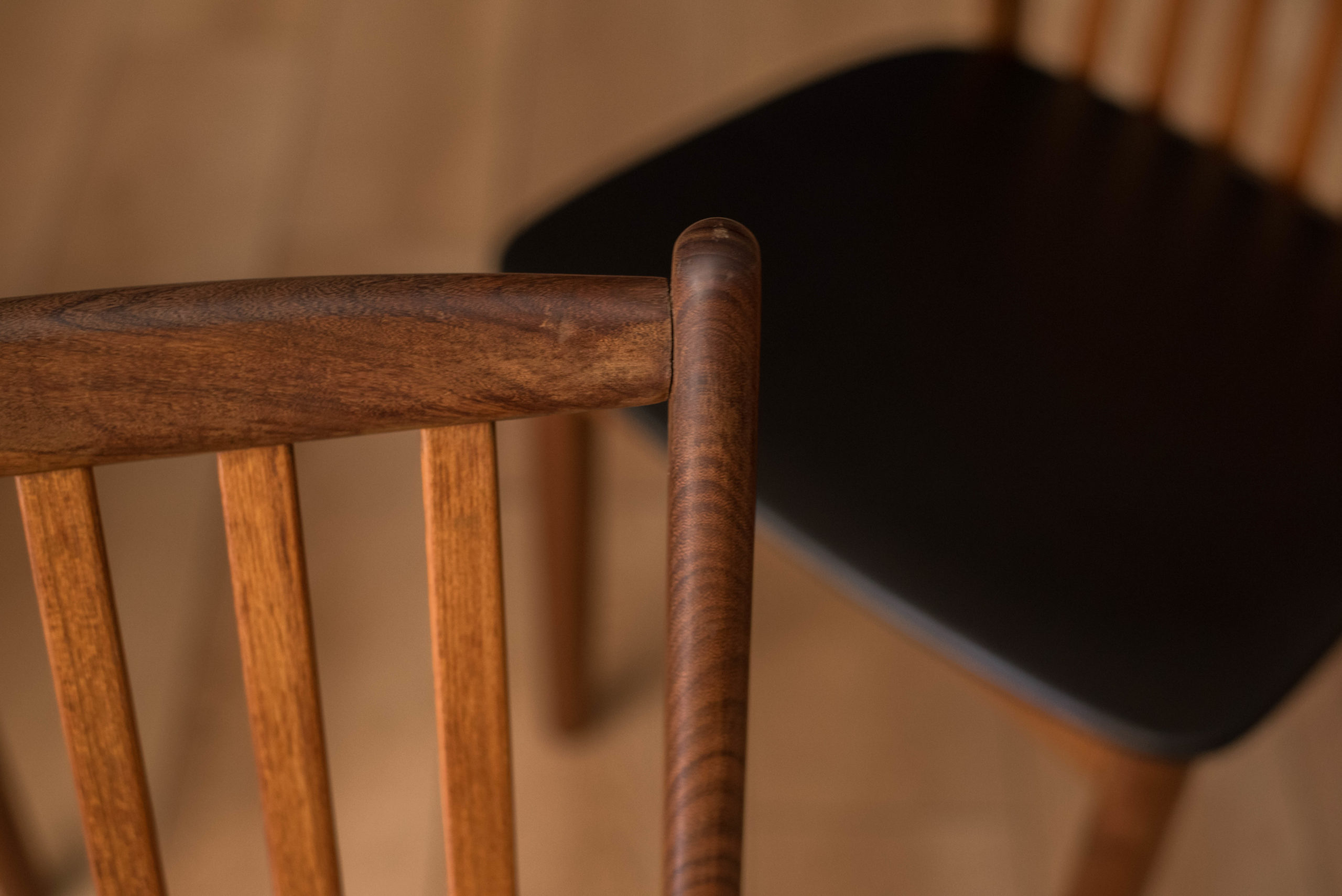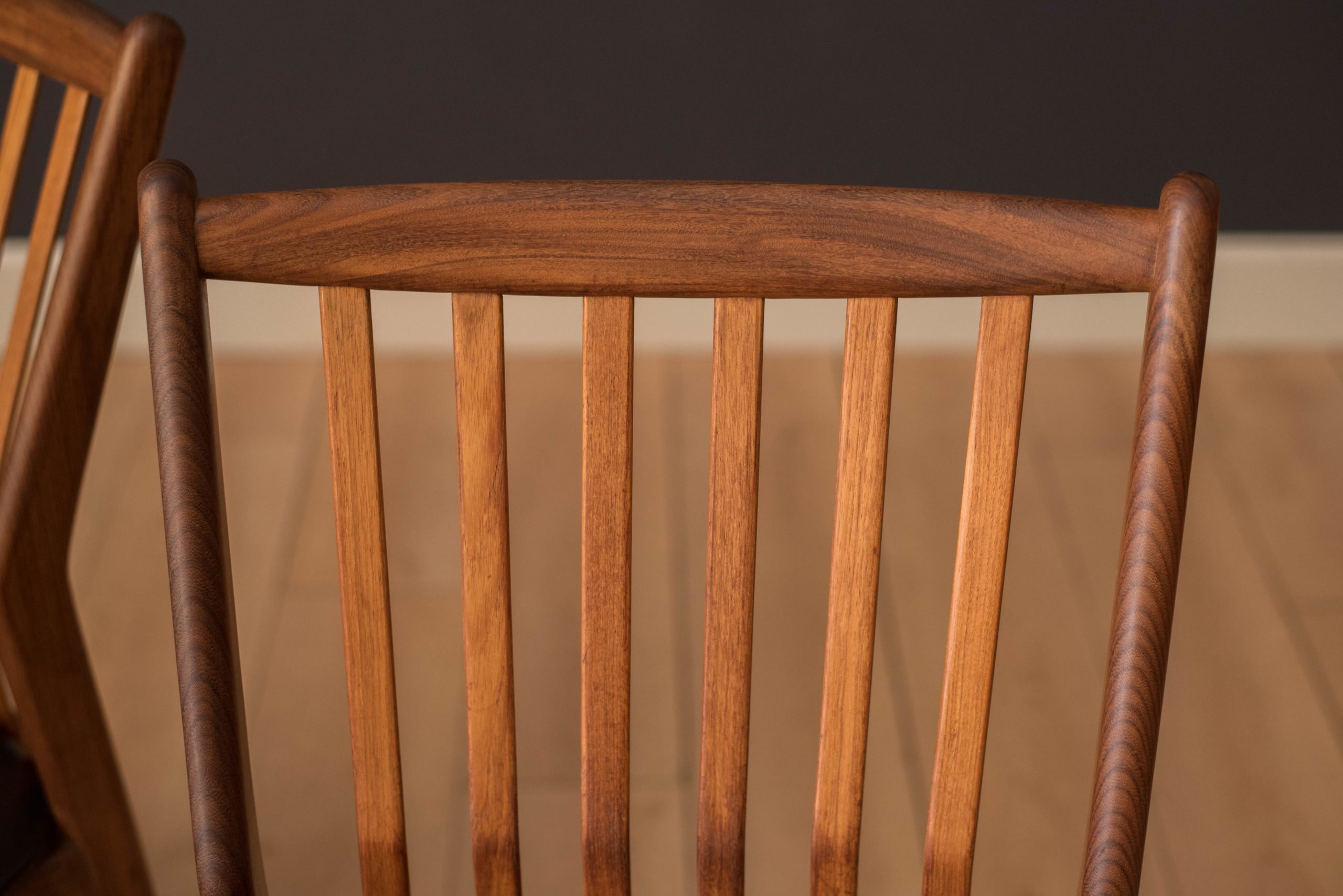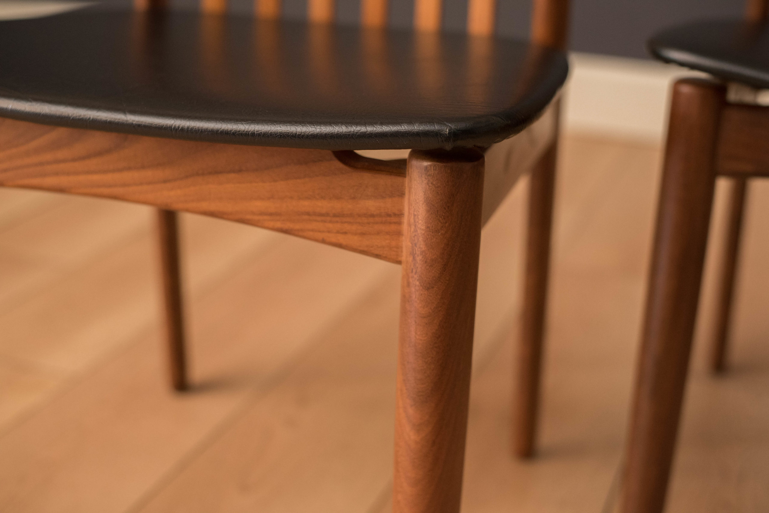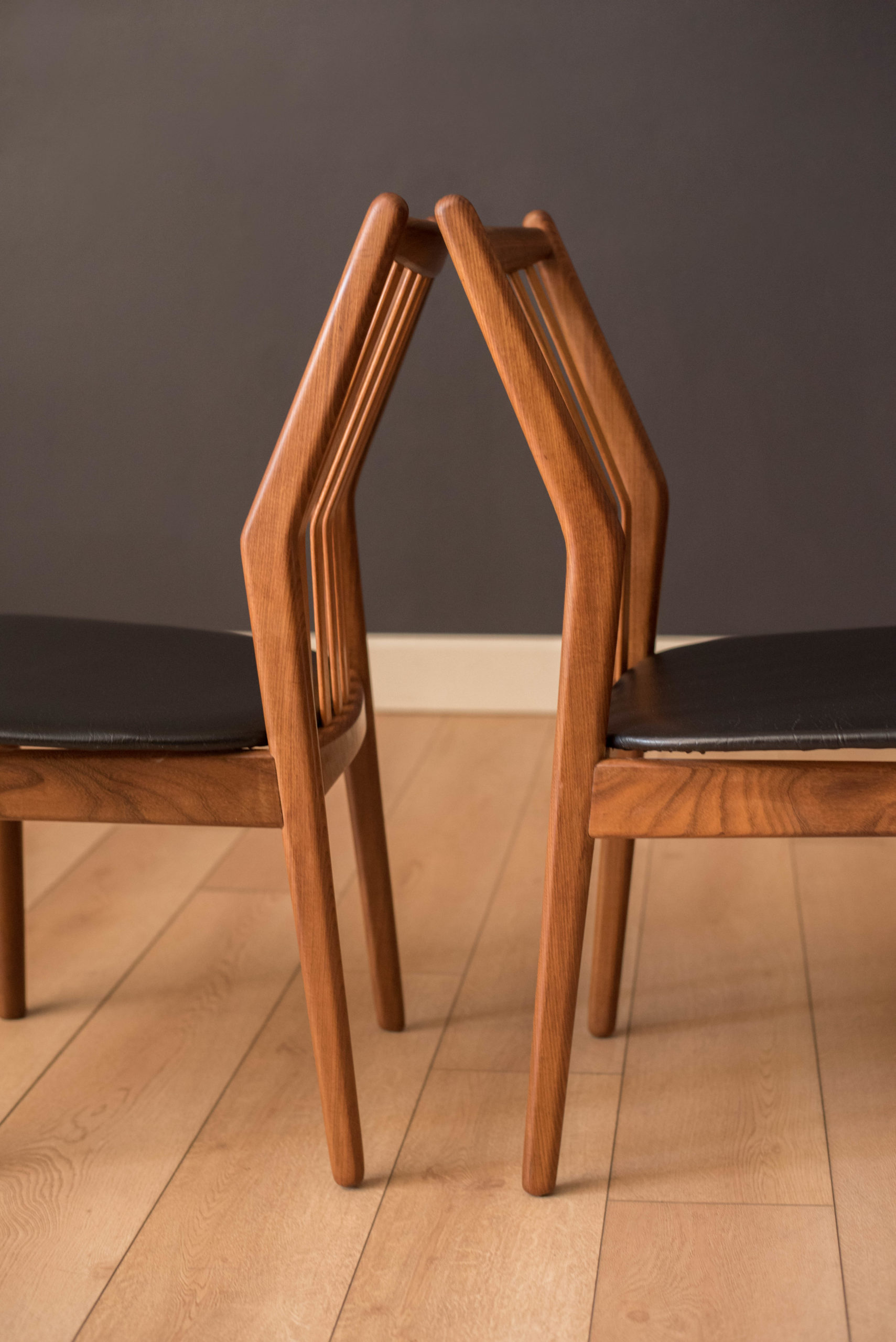 Mid-Century Modern set of four dining chairs in teak and afromasia by Svend Madsen for Moreddi, Denmark circa 1960’s. Features a supporting curved backrest and a wide frame seat unusual for Danish design. Retains the original black leatherette seats.