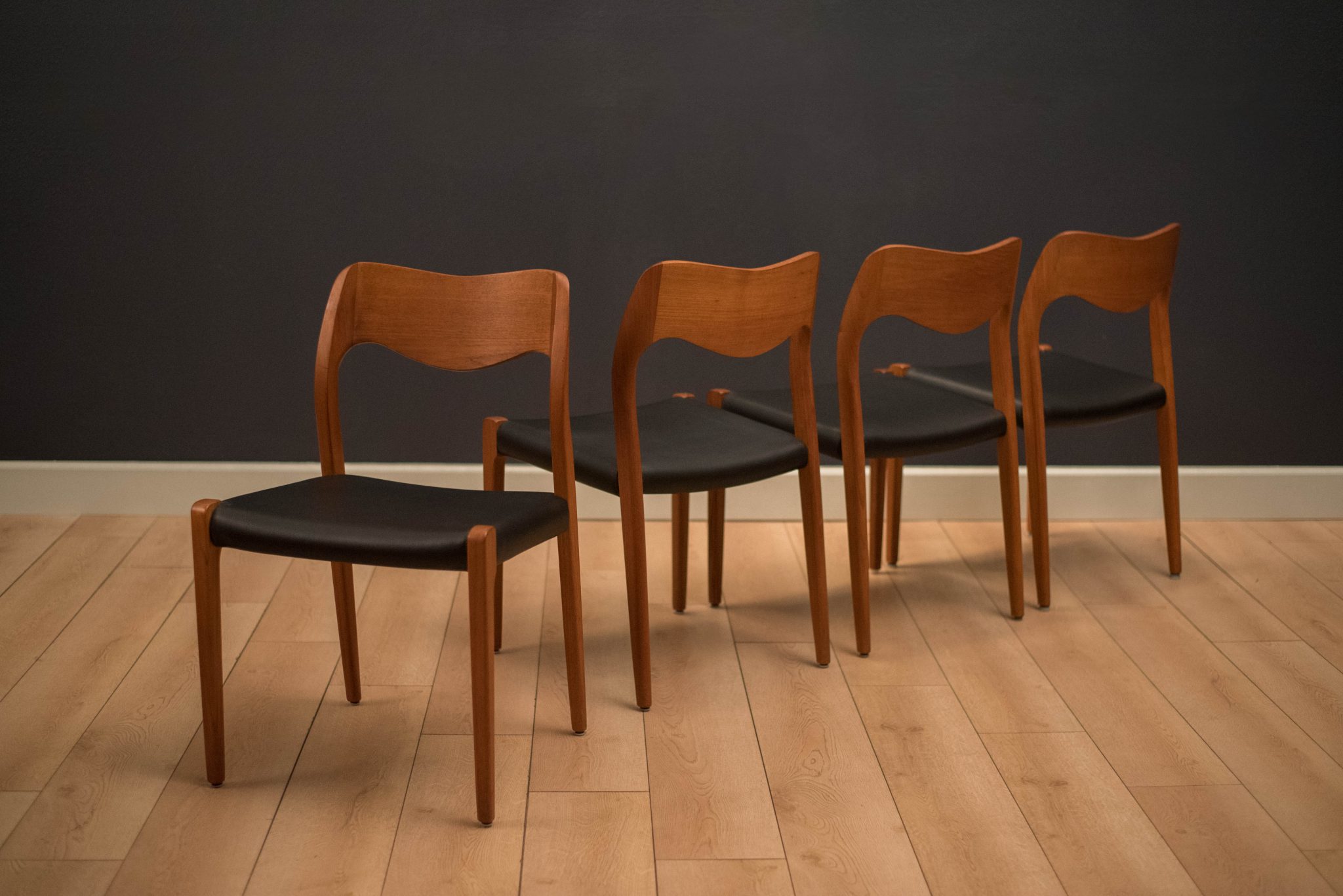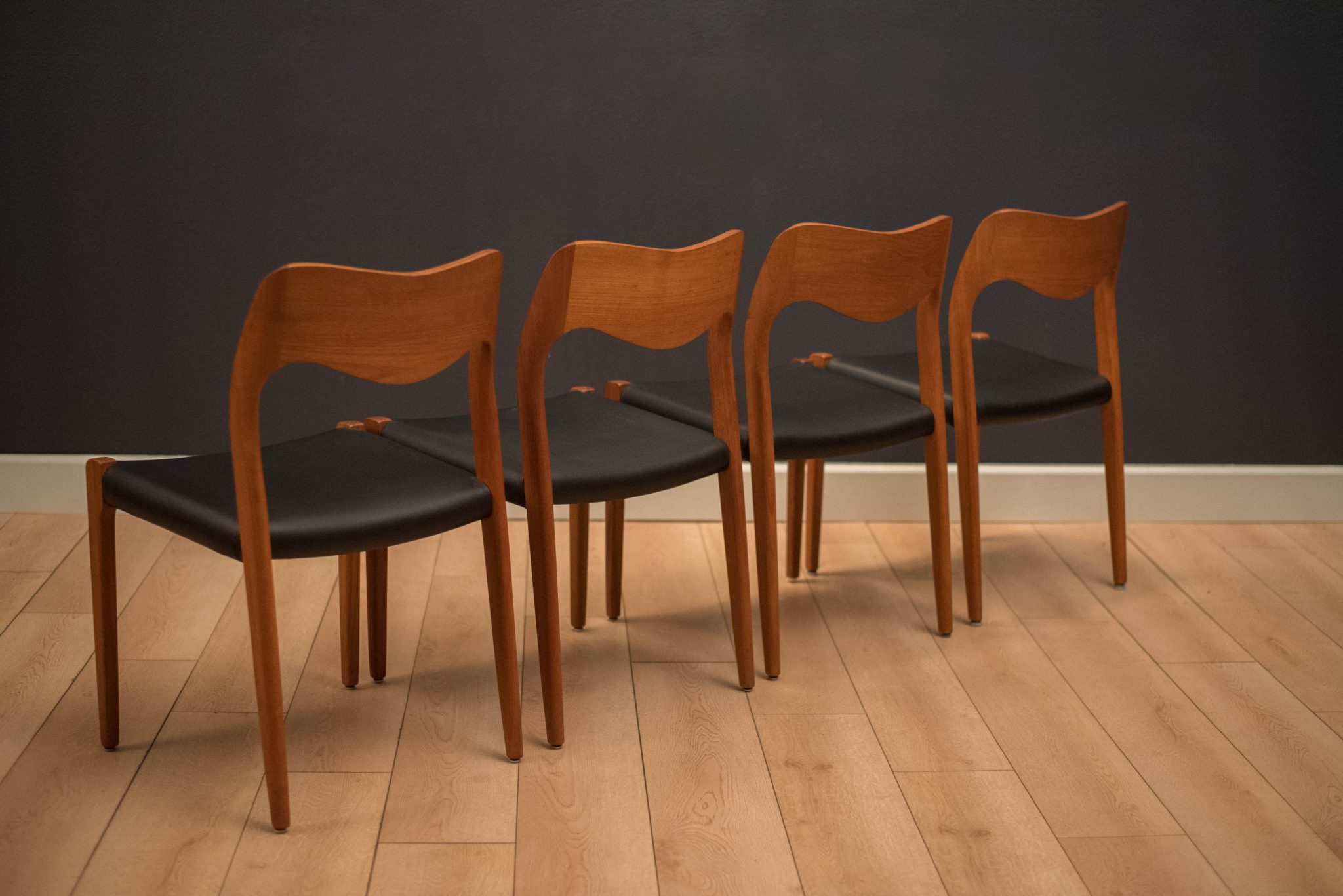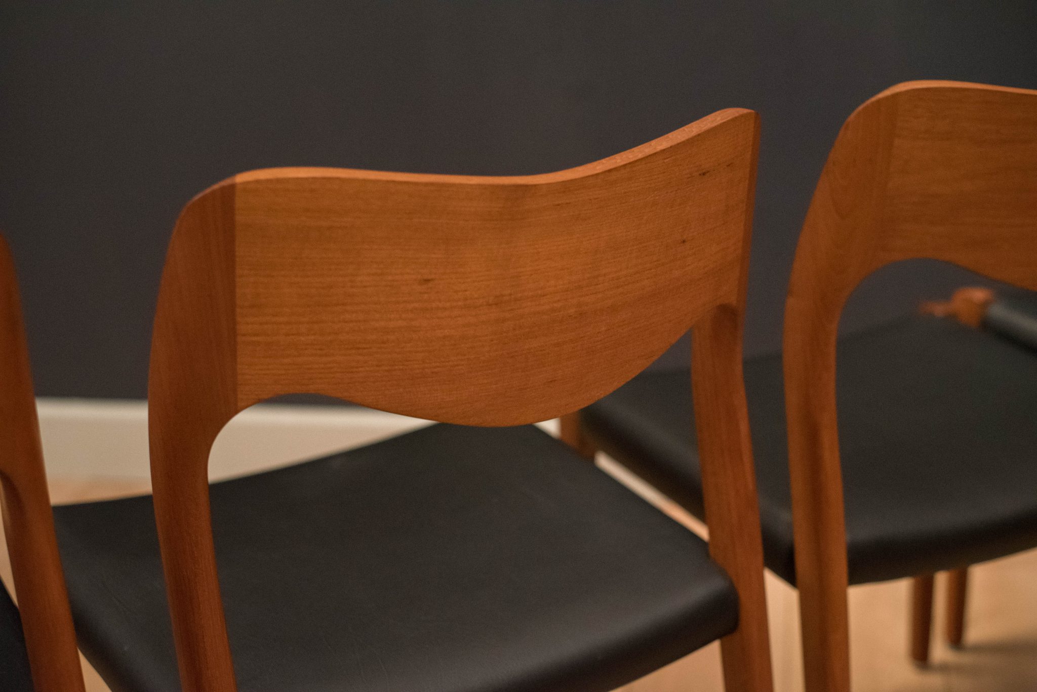 Mid Century set of four Danish dining chairs by Niels Møller for J.L. Møller Møbelfabrik in teak. This set includes four model no. 71 chairs and seats are covered in black vinyl. Price is for the set of four.