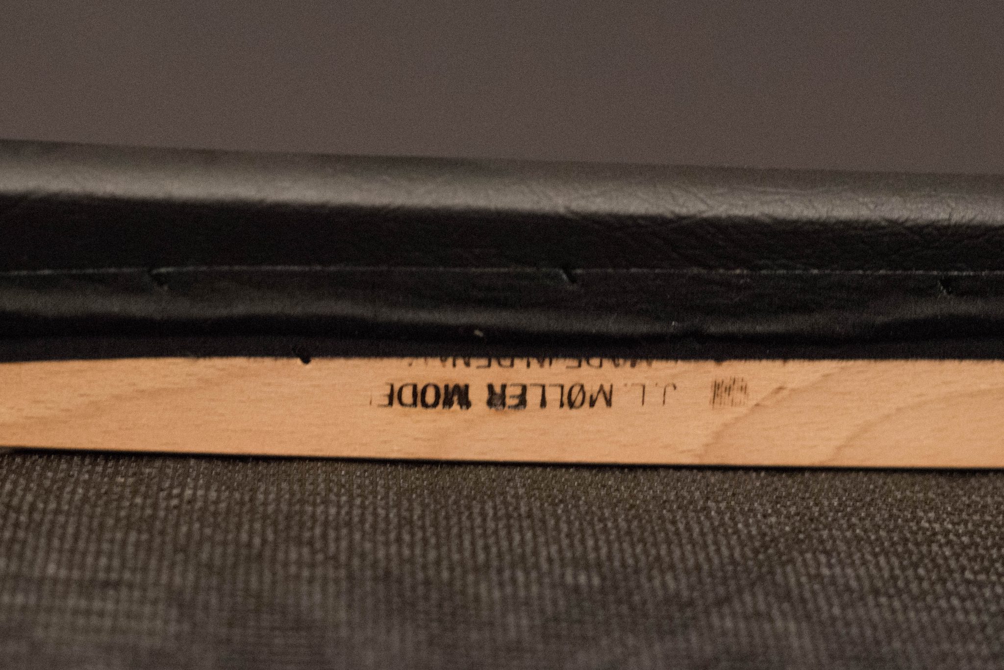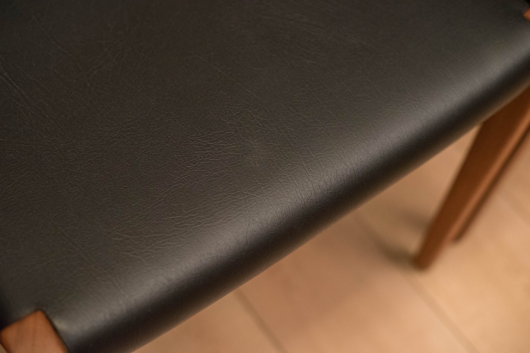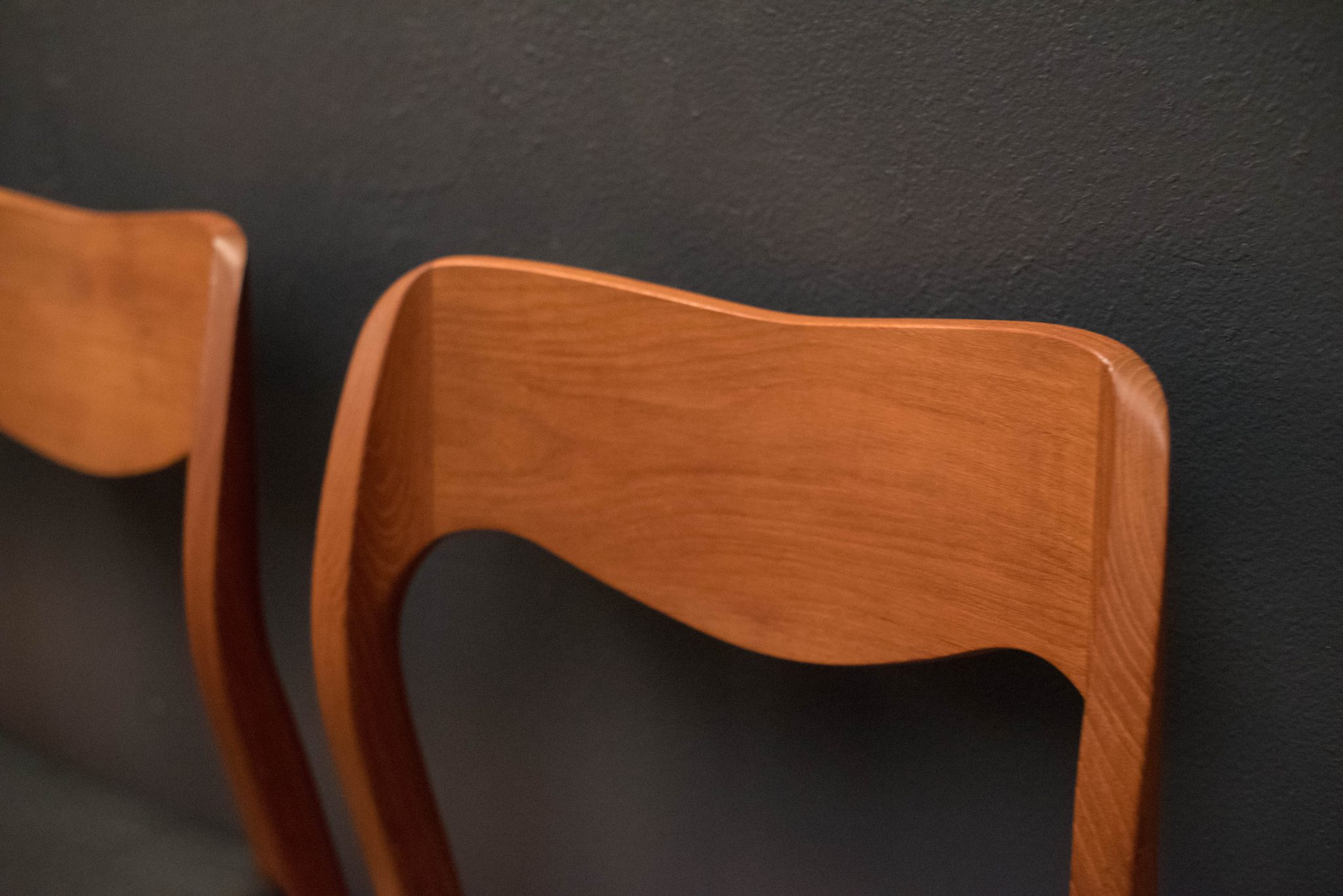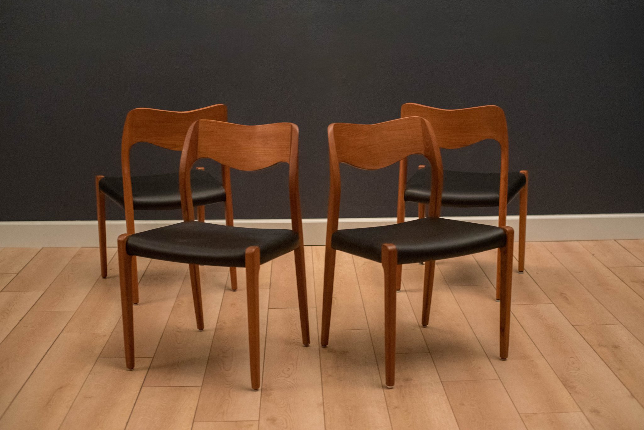 Mid Century set of four Danish dining chairs by Niels Møller for J.L. Møller Møbelfabrik in teak. This set includes four model no. 71 chairs and seats are covered in black vinyl. Price is for the set of four.