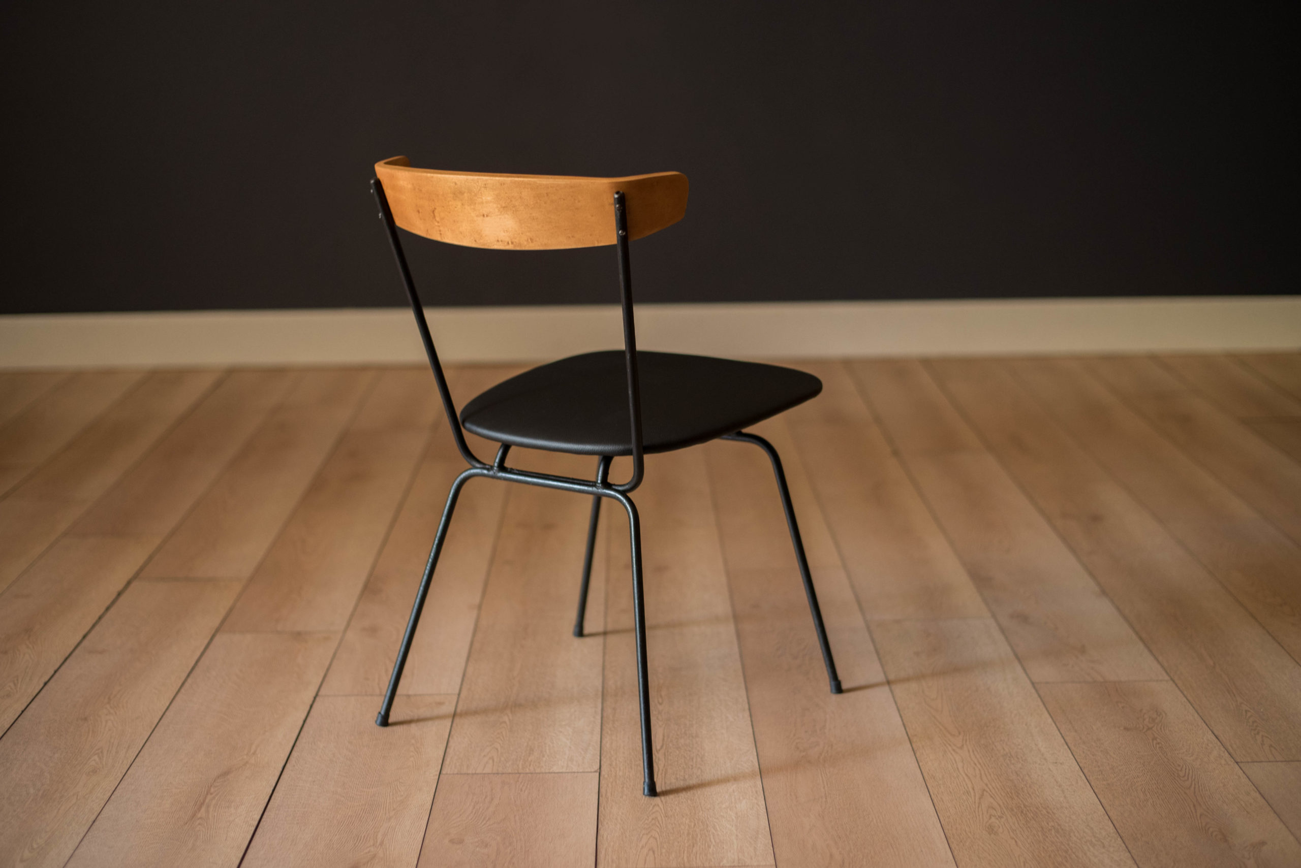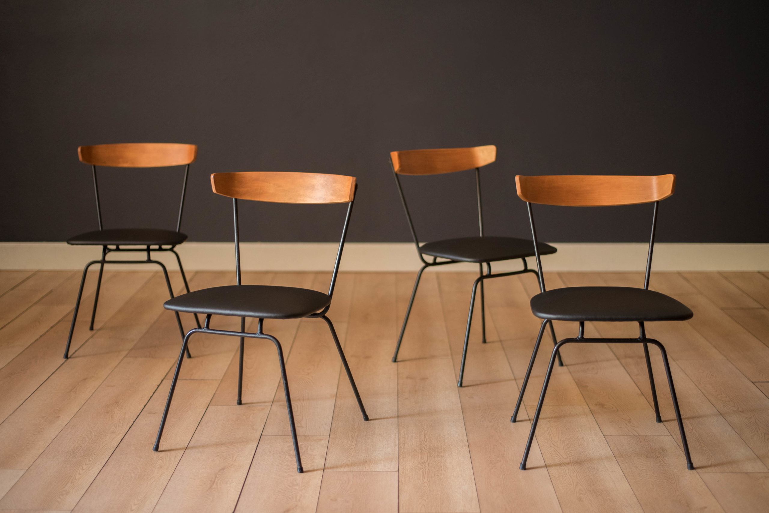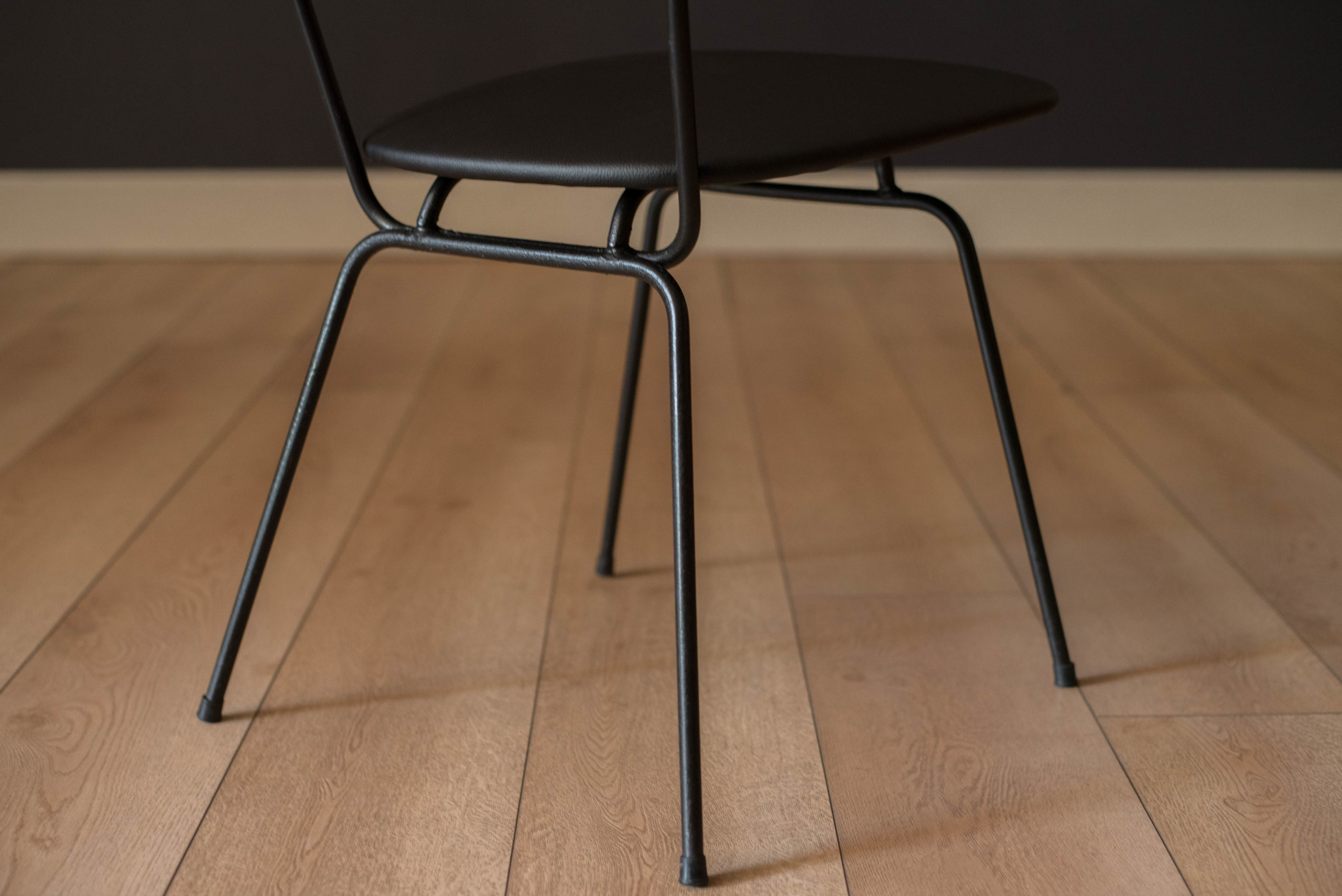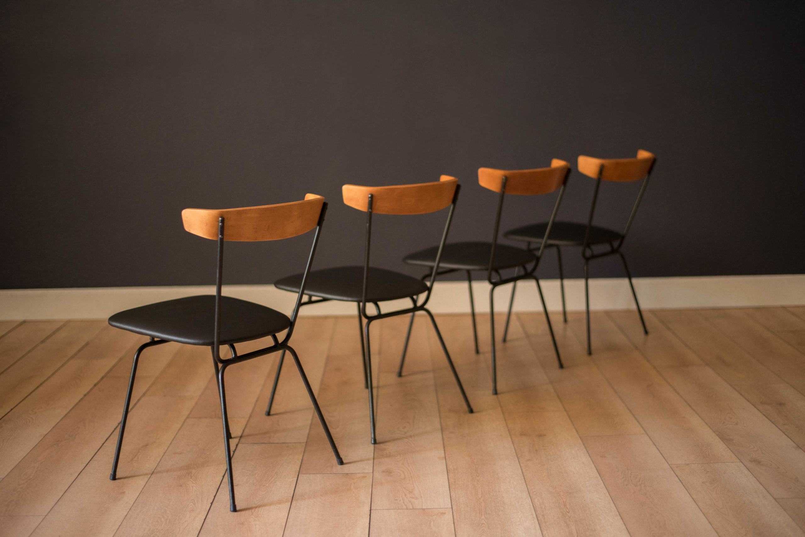 Mid century modern dining chairs designed by Clifford Pascoe for Modernmasters Inc., circa 1950’s. Features a sculpted wood backrest supported by a sturdy black iron frame. Seats have been reupholstered in black vinyl. Price is for the set of four. In good condition with wear such as blemishes and nicks. Repair fill on one the backrests. Patina on the metal frames. See photos.