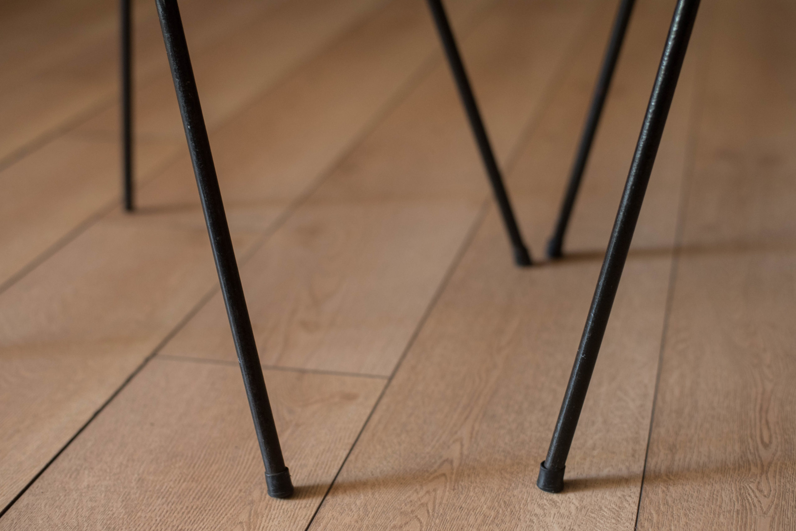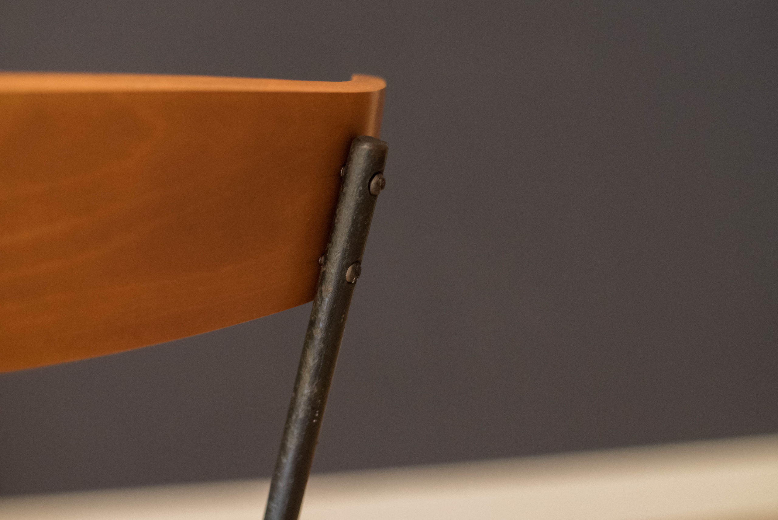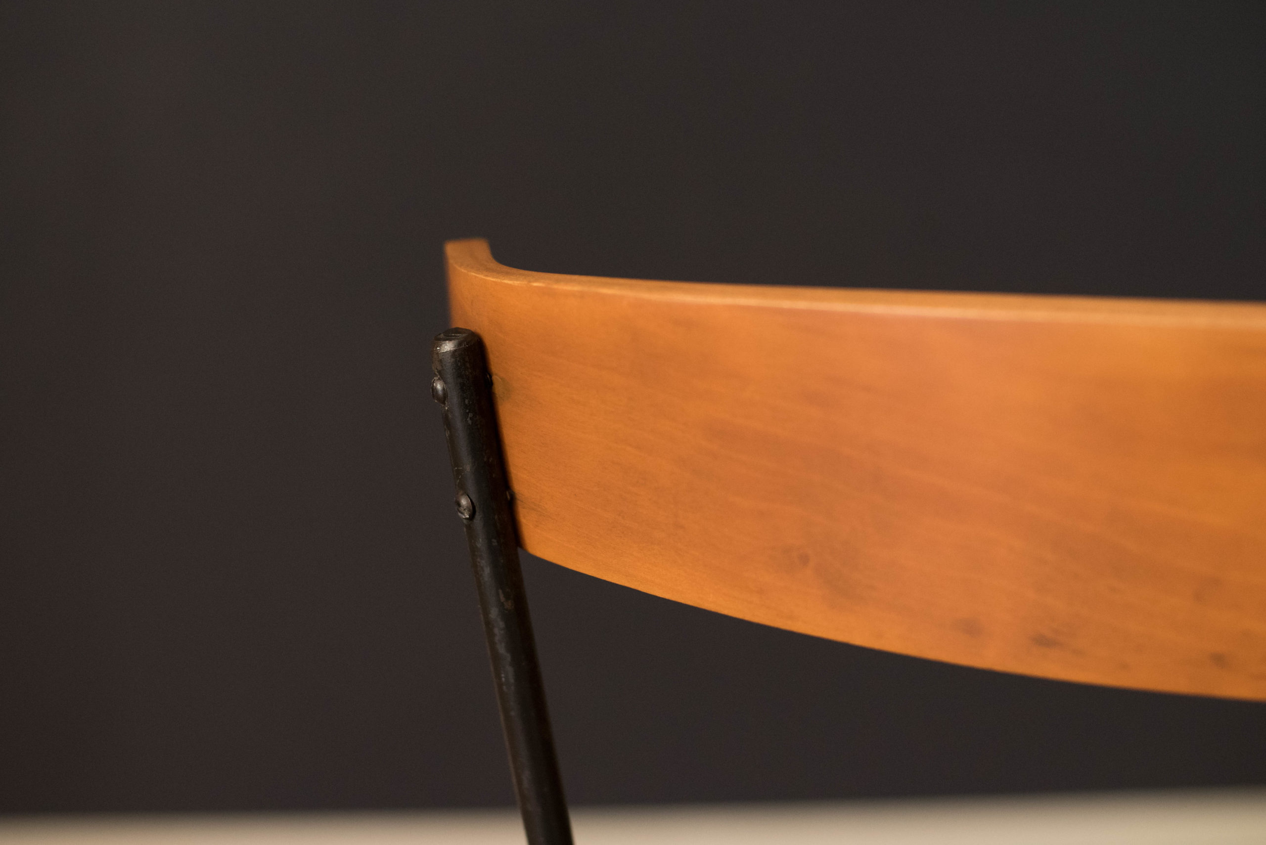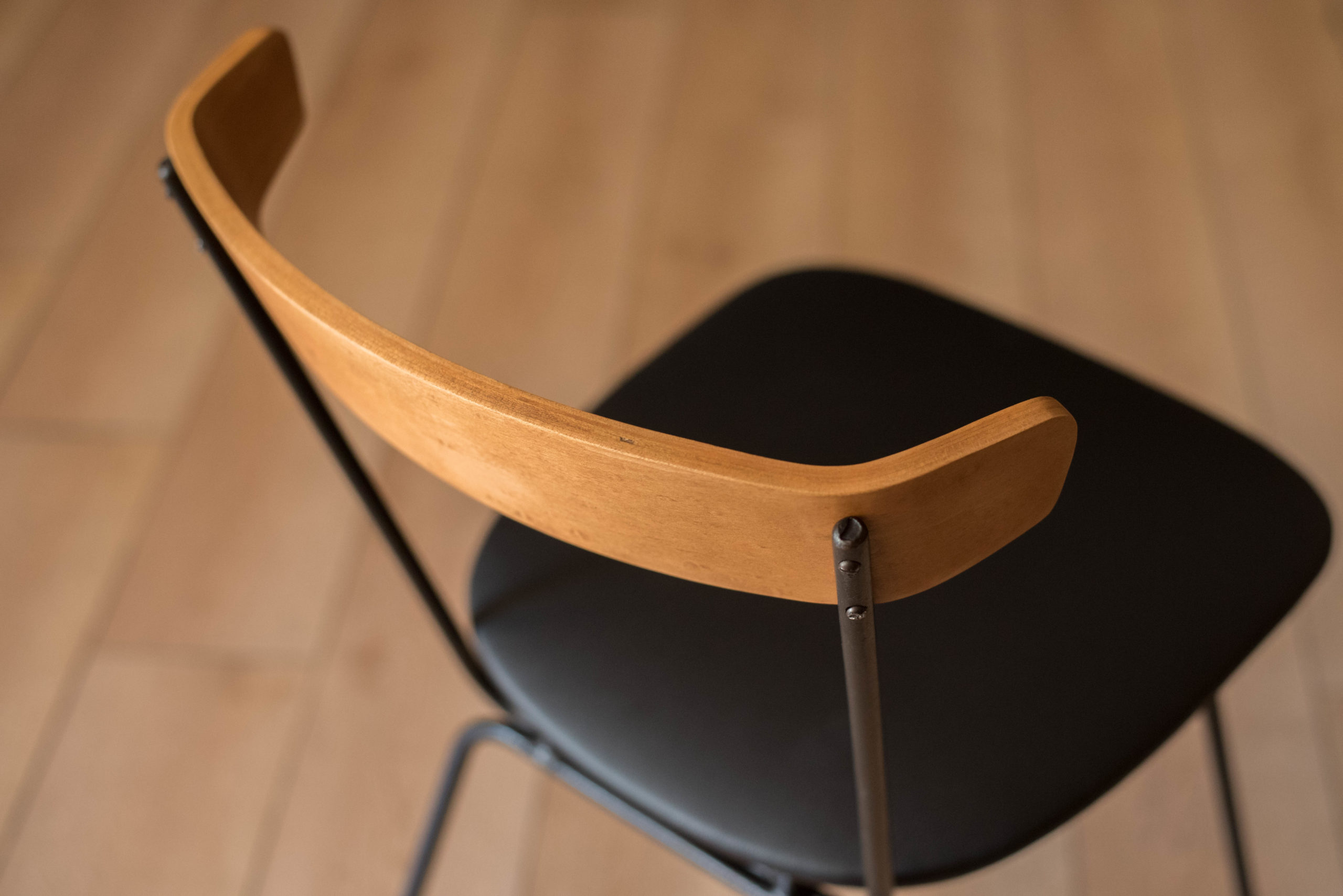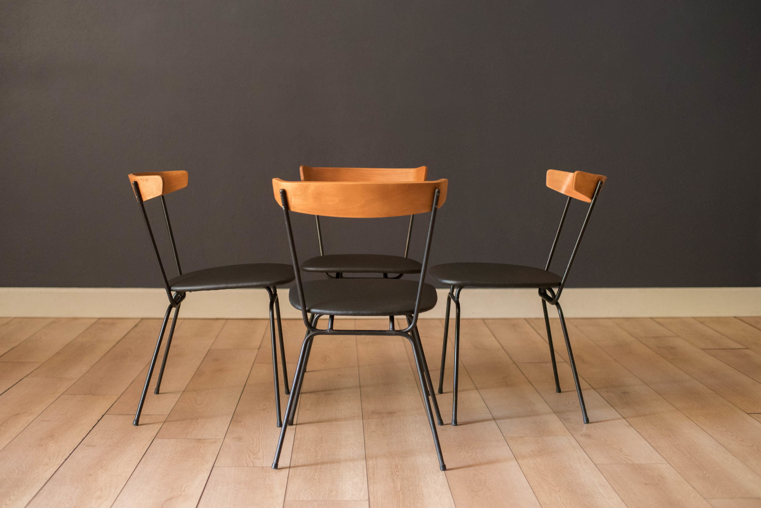 Mid century modern dining chairs designed by Clifford Pascoe for Modernmasters Inc., circa 1950’s. Features a sculpted wood backrest supported by a sturdy black iron frame. Seats have been reupholstered in black vinyl. Price is for the set of four. In good condition with wear such as blemishes and nicks. Repair fill on one the backrests. Patina on the metal frames. See photos.