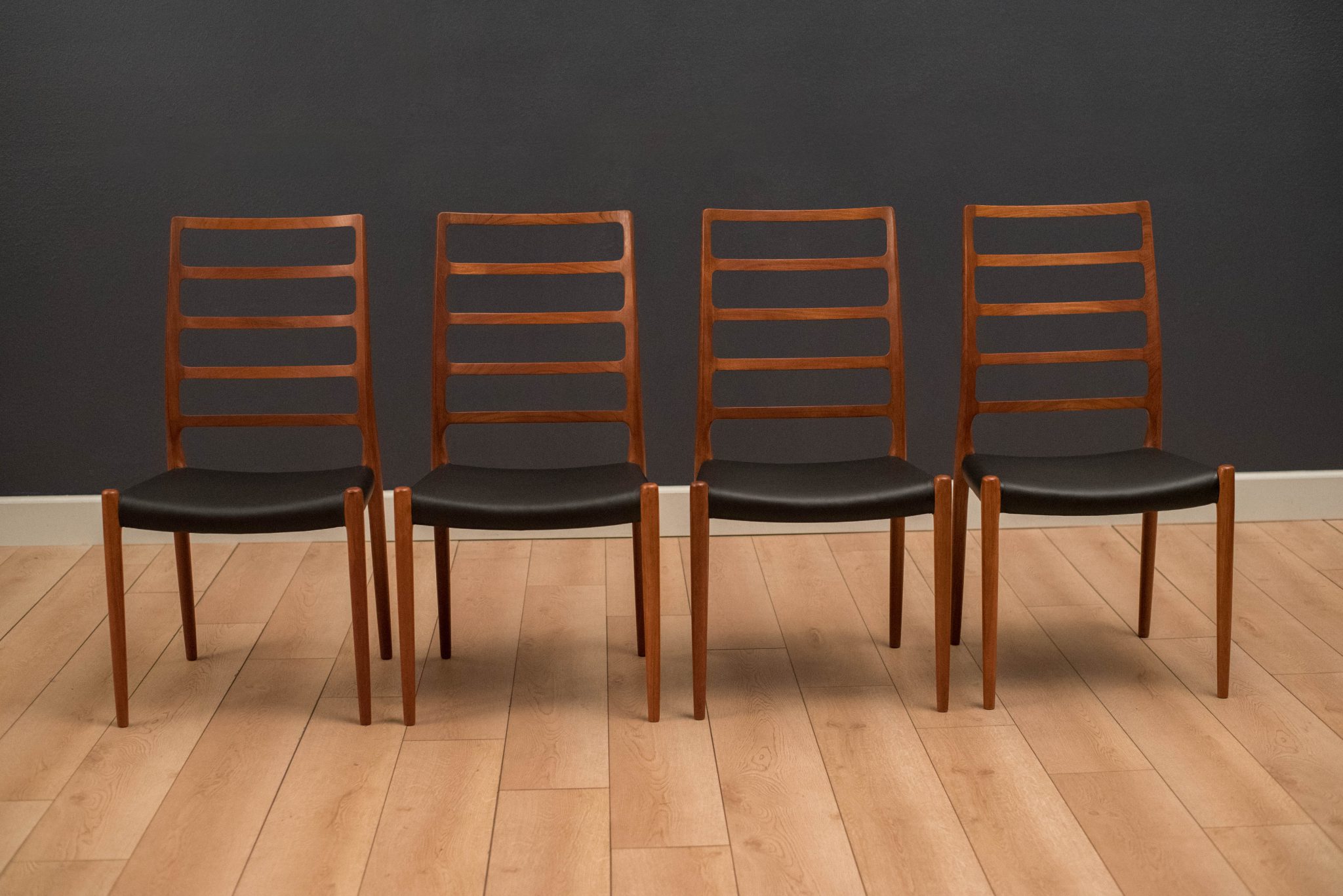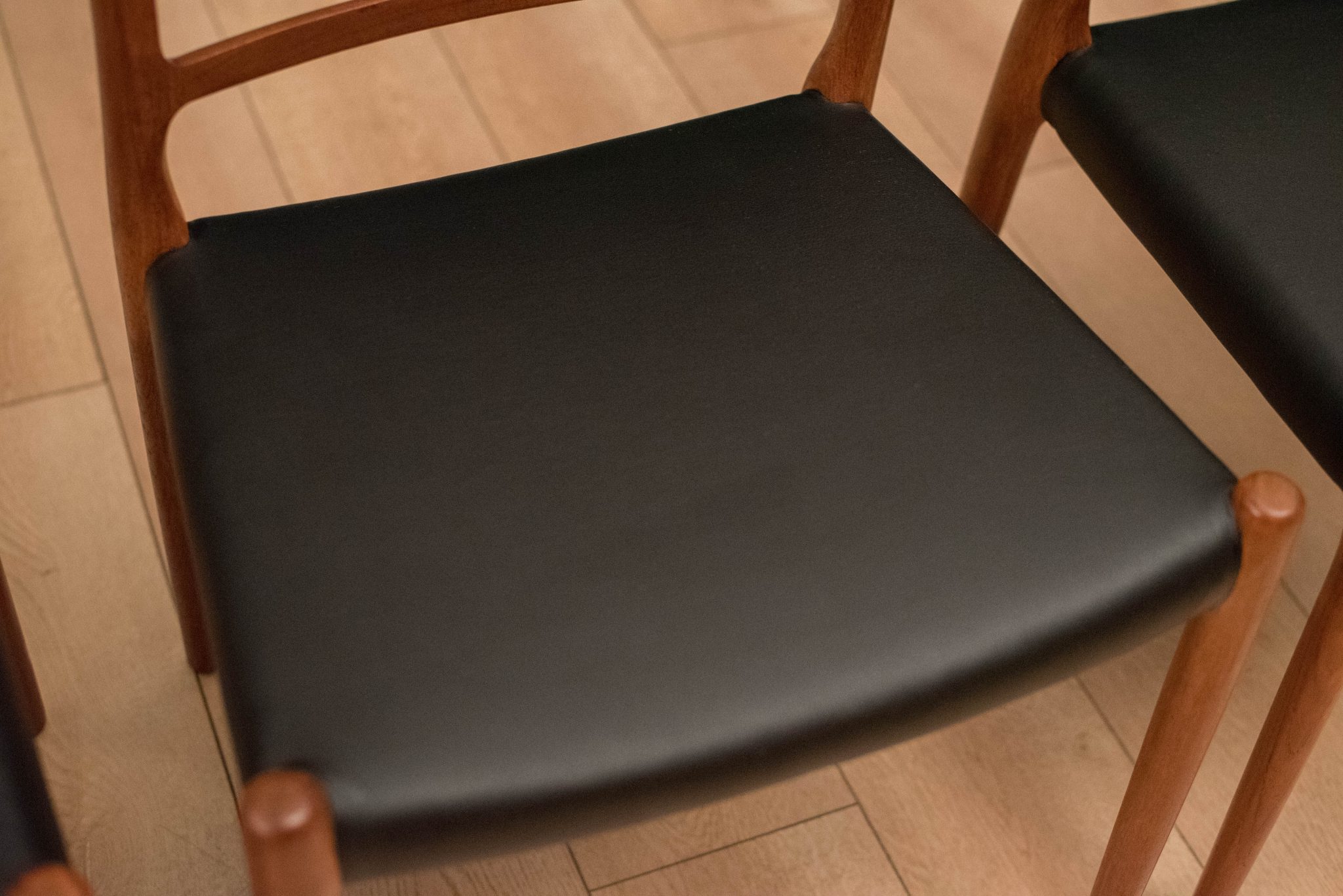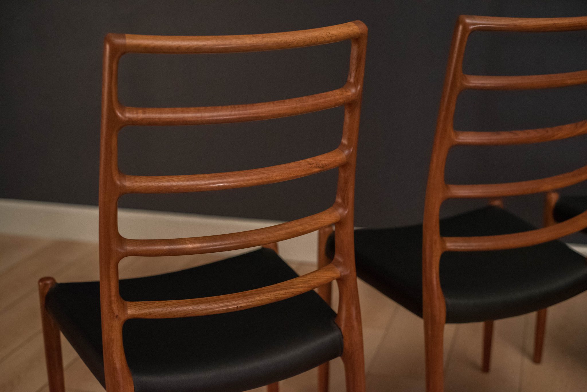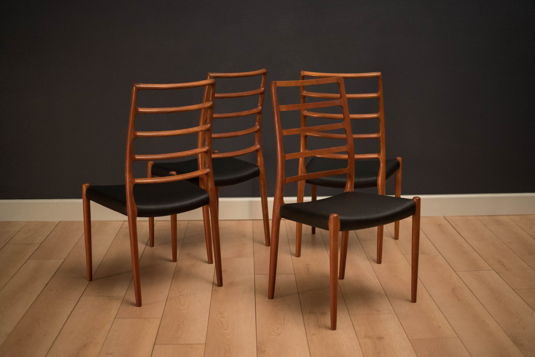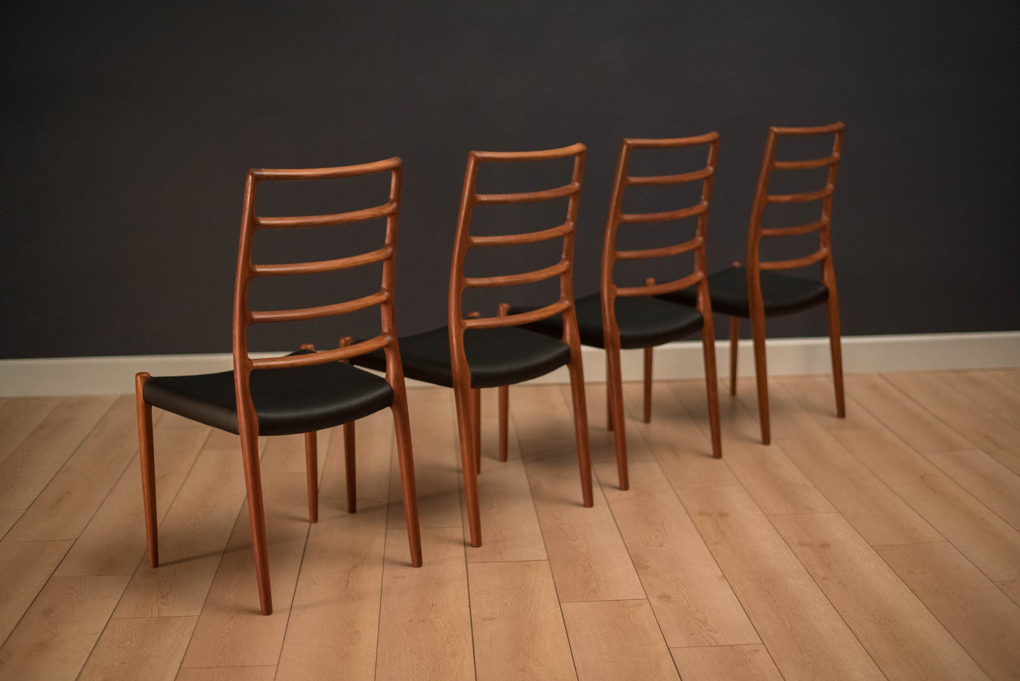 Danish Niels Otto Møller dining chairs model no. 82 in teak. This set of four displays sculpted high back teak frames and newly reupholstered black leatherette seats. Price is for the set of four chairs.