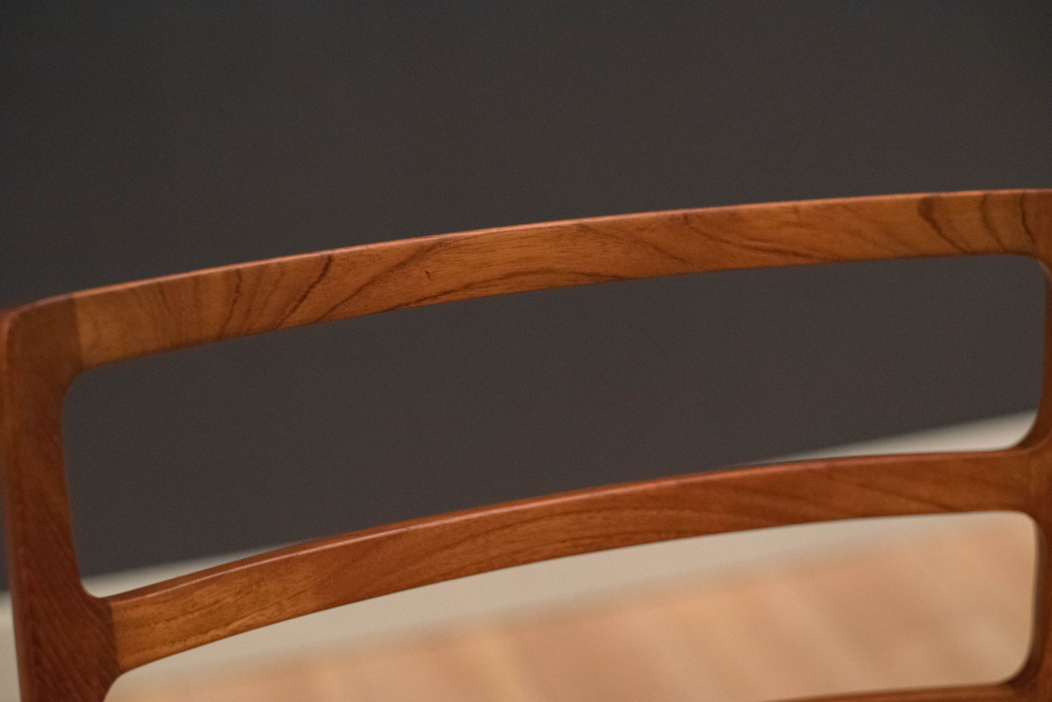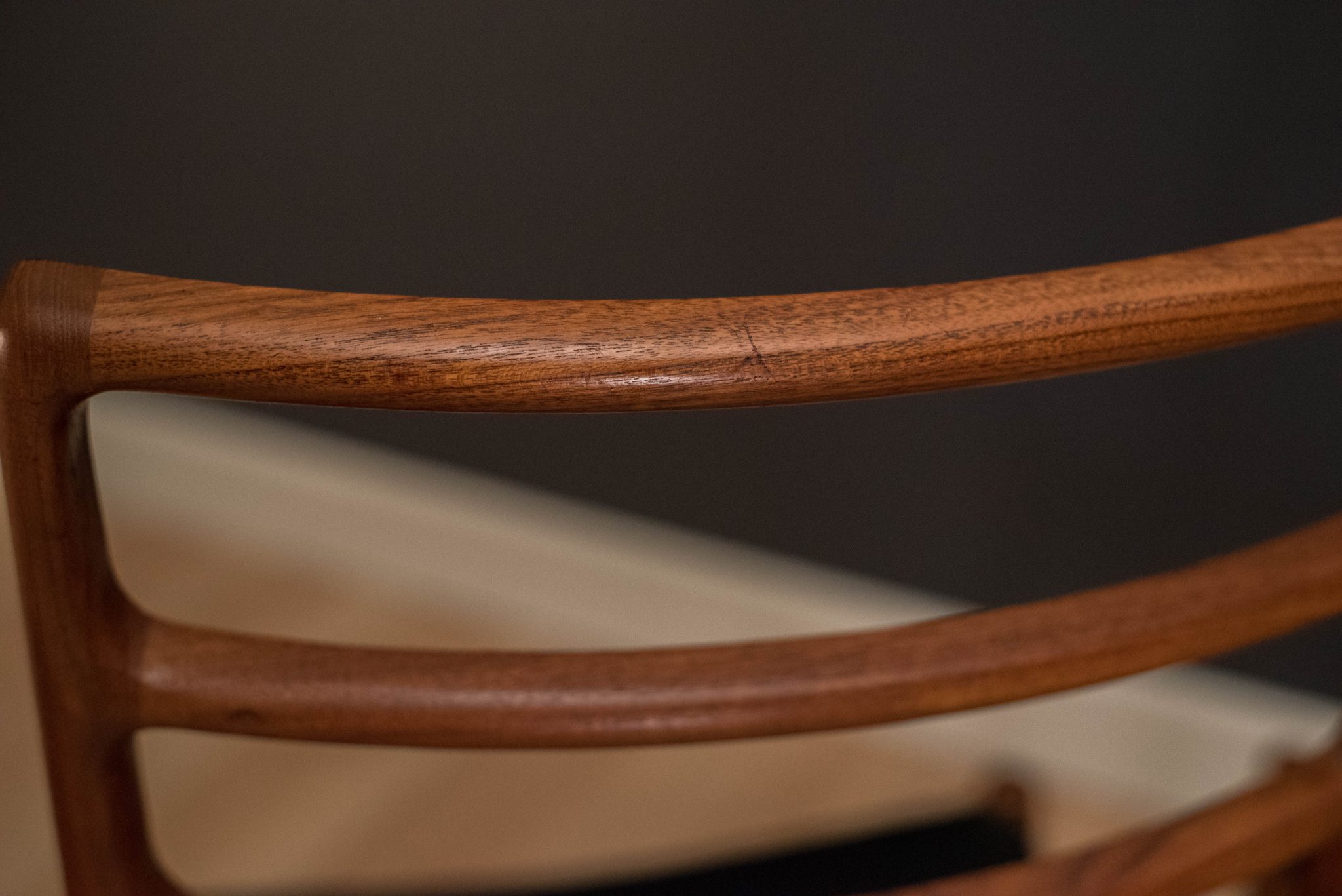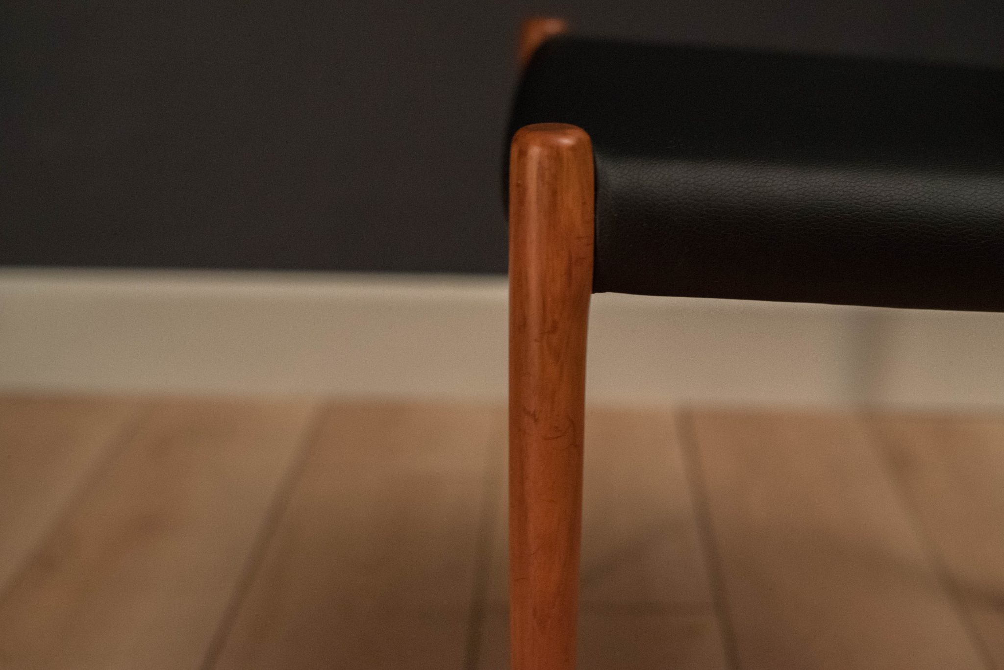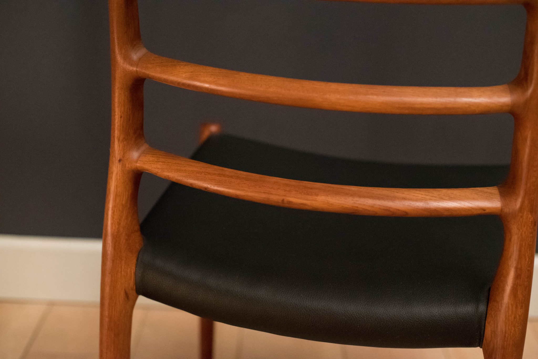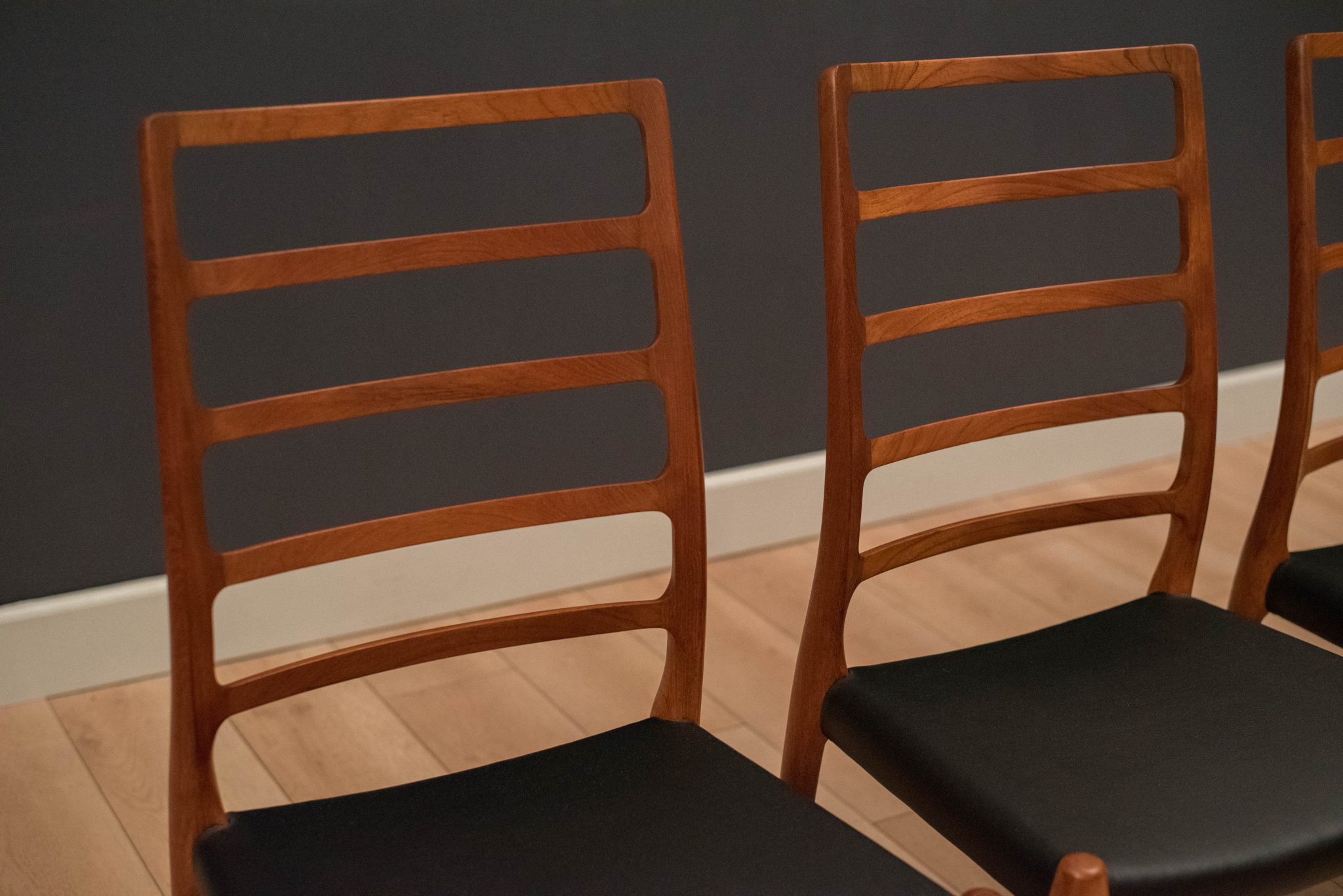 Danish Niels Otto Møller dining chairs model no. 82 in teak. This set of four displays sculpted high back teak frames and newly reupholstered black leatherette seats. Price is for the set of four chairs.