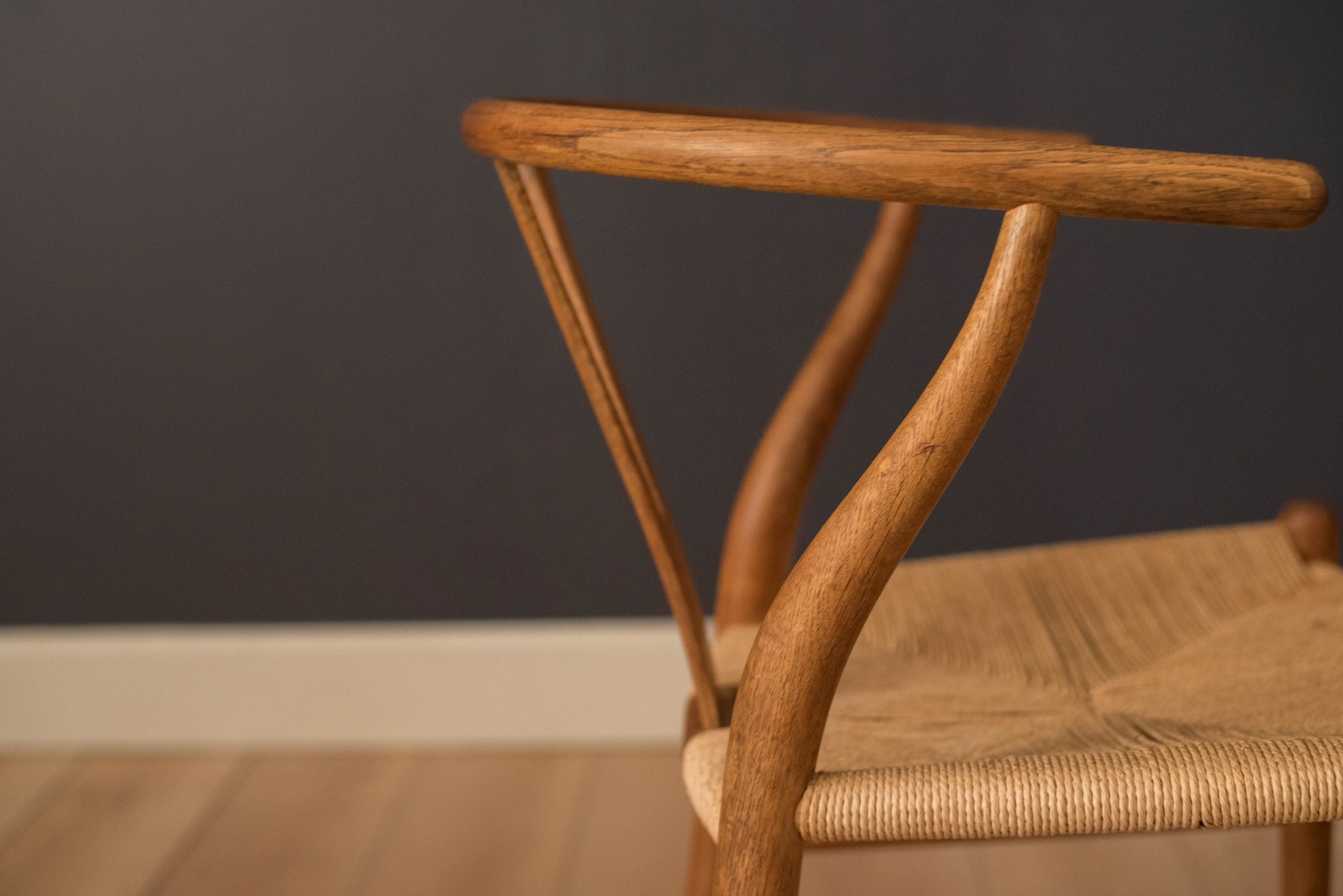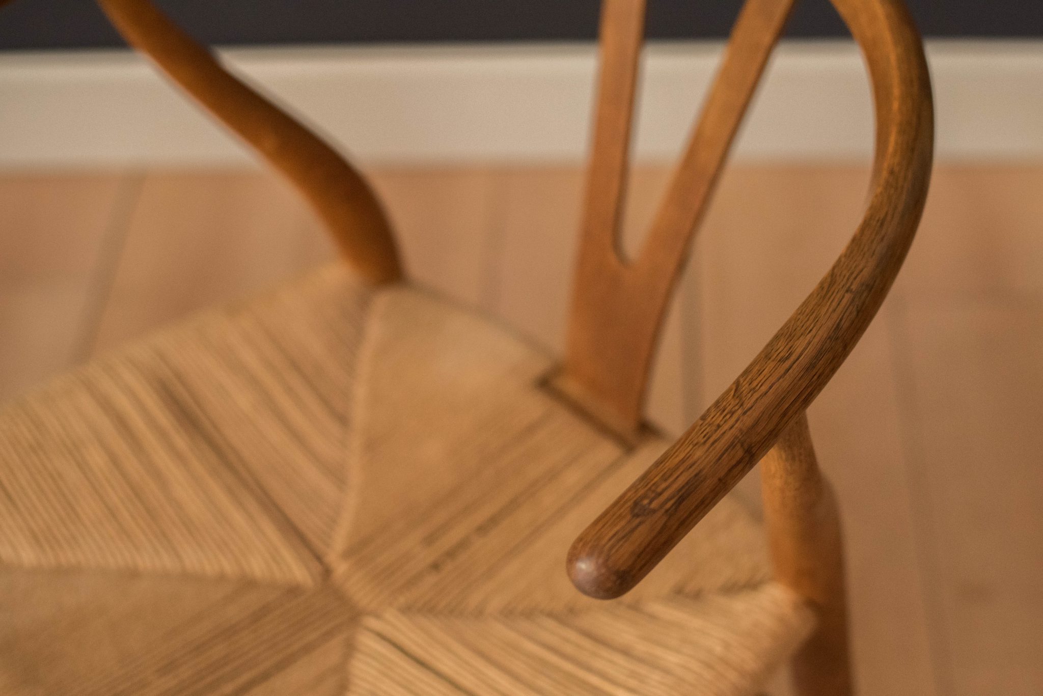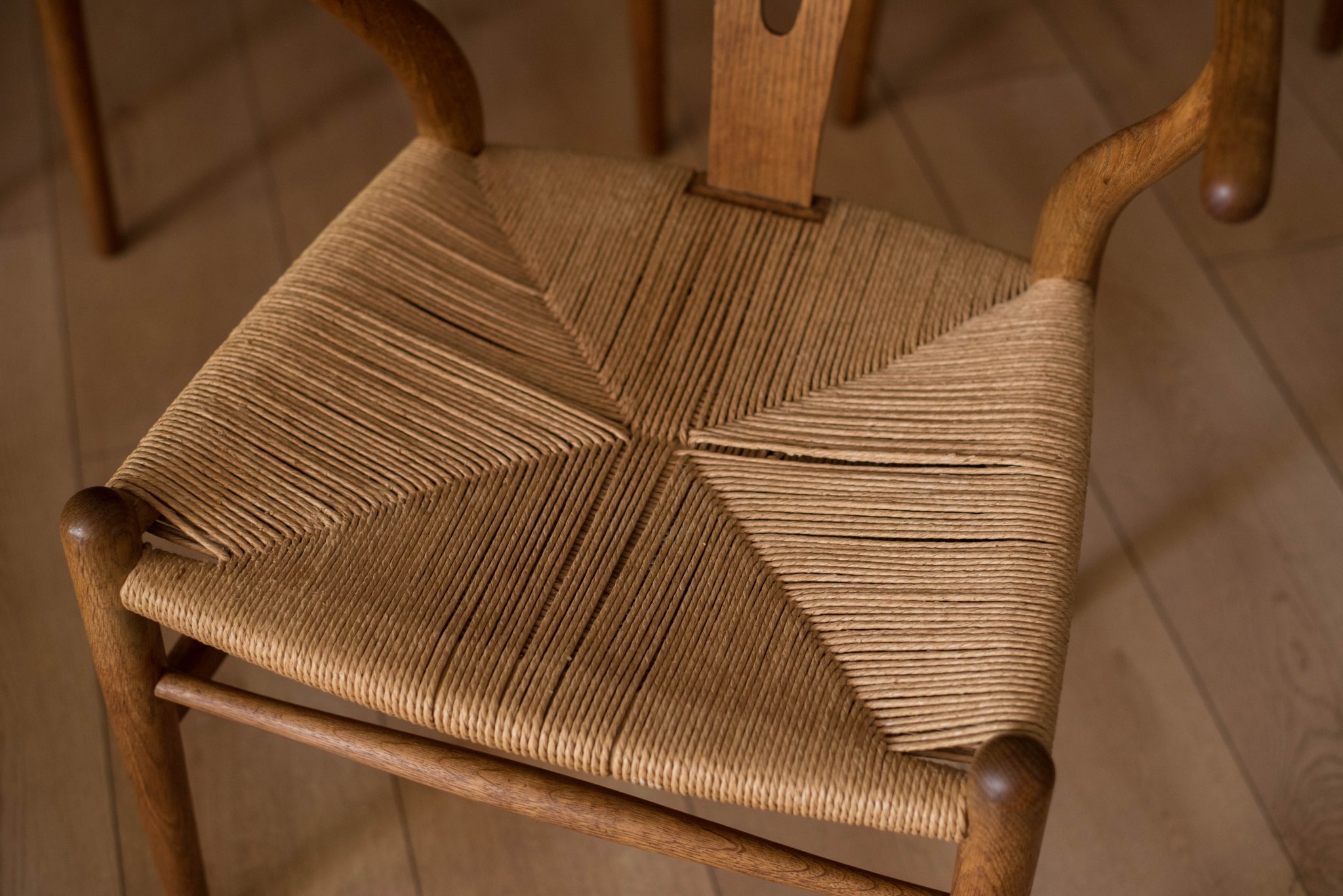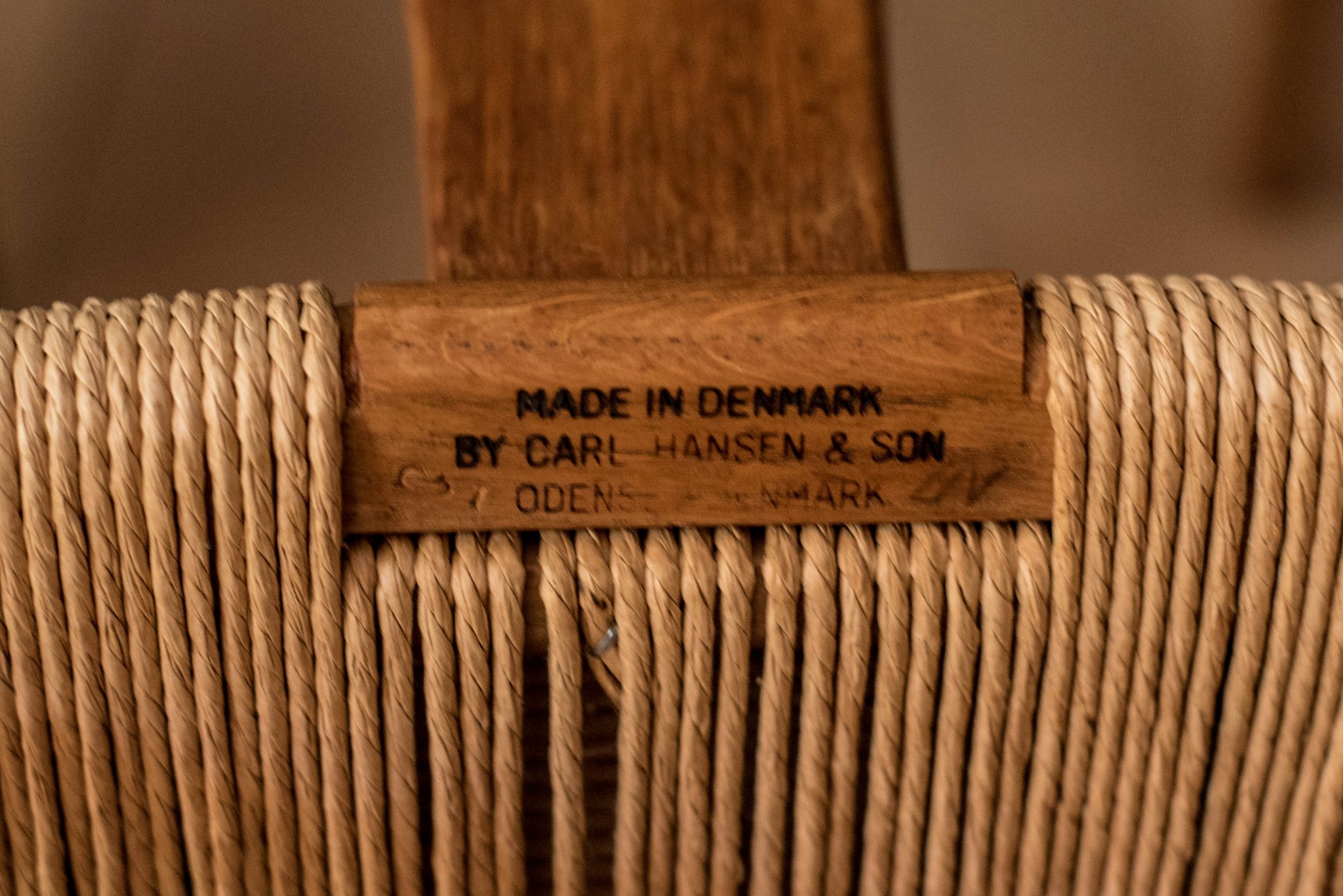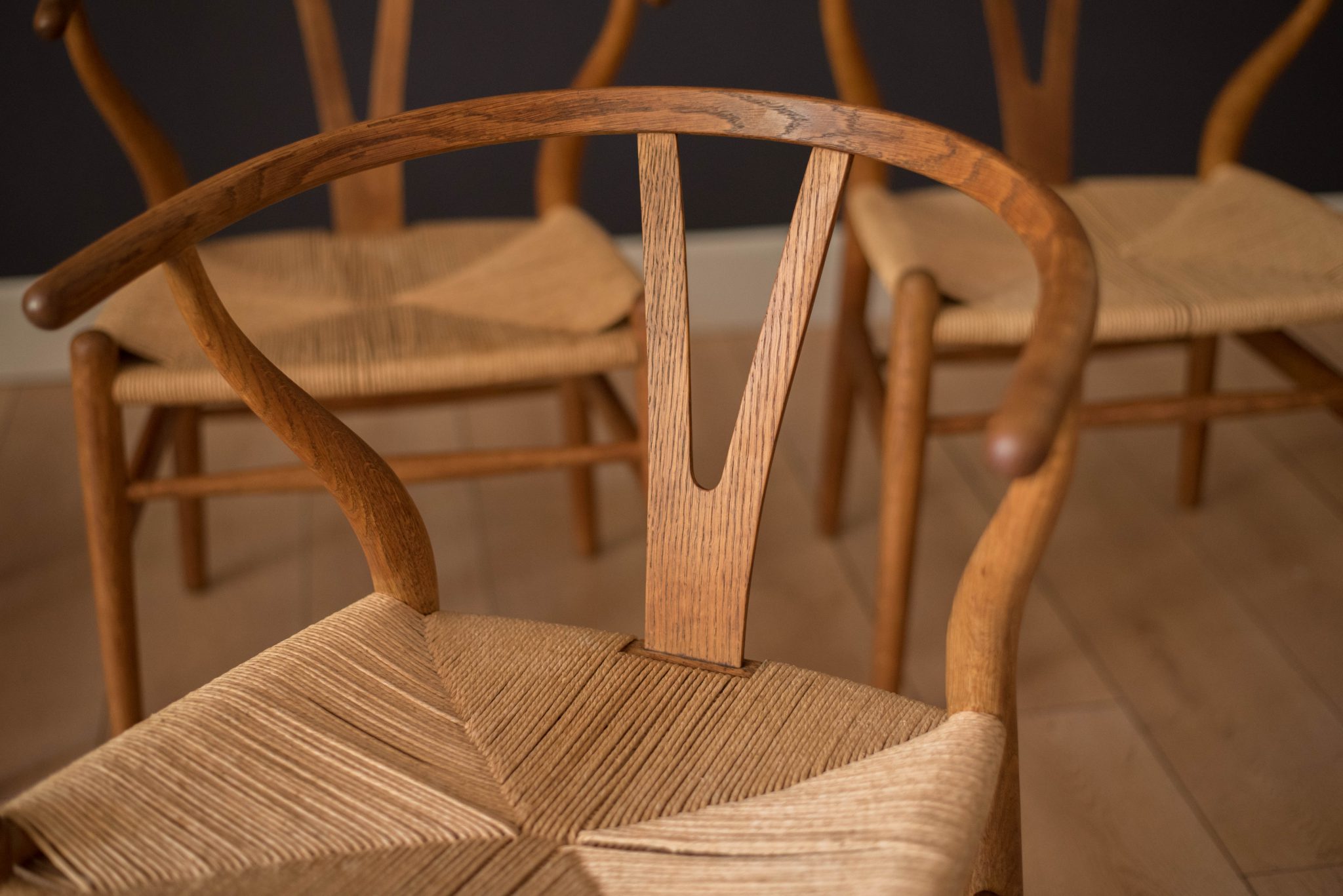 Mid-Century Modern Danish dining chairs designed by Hans J. Wegner for Carl Hansen & Søn manufactured in Odense, Denmark. This set includes six dining chairs with sculpted oak frames and handwoven paper cord seats. Backrest transitions to armrest in one solid bentwood piece supported by it’s signature ‘Y’ wishbone design. An early example of this iconic chair and is branded underneath.