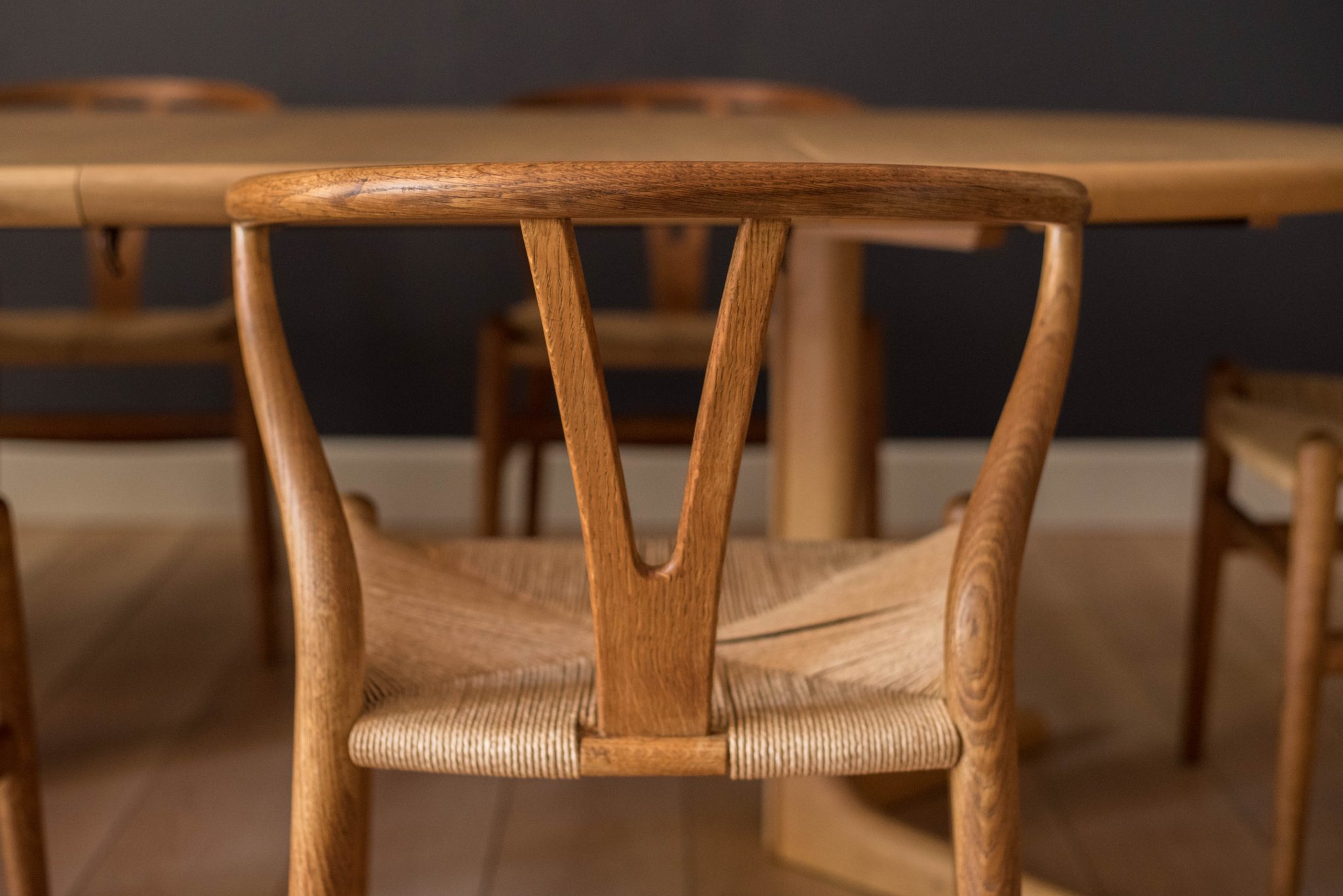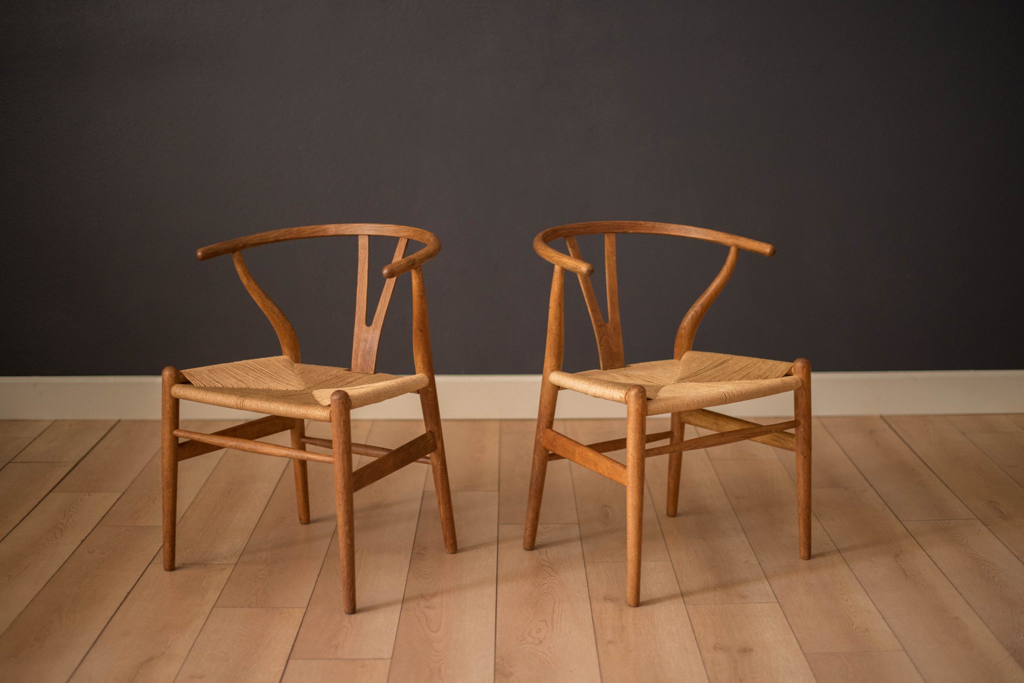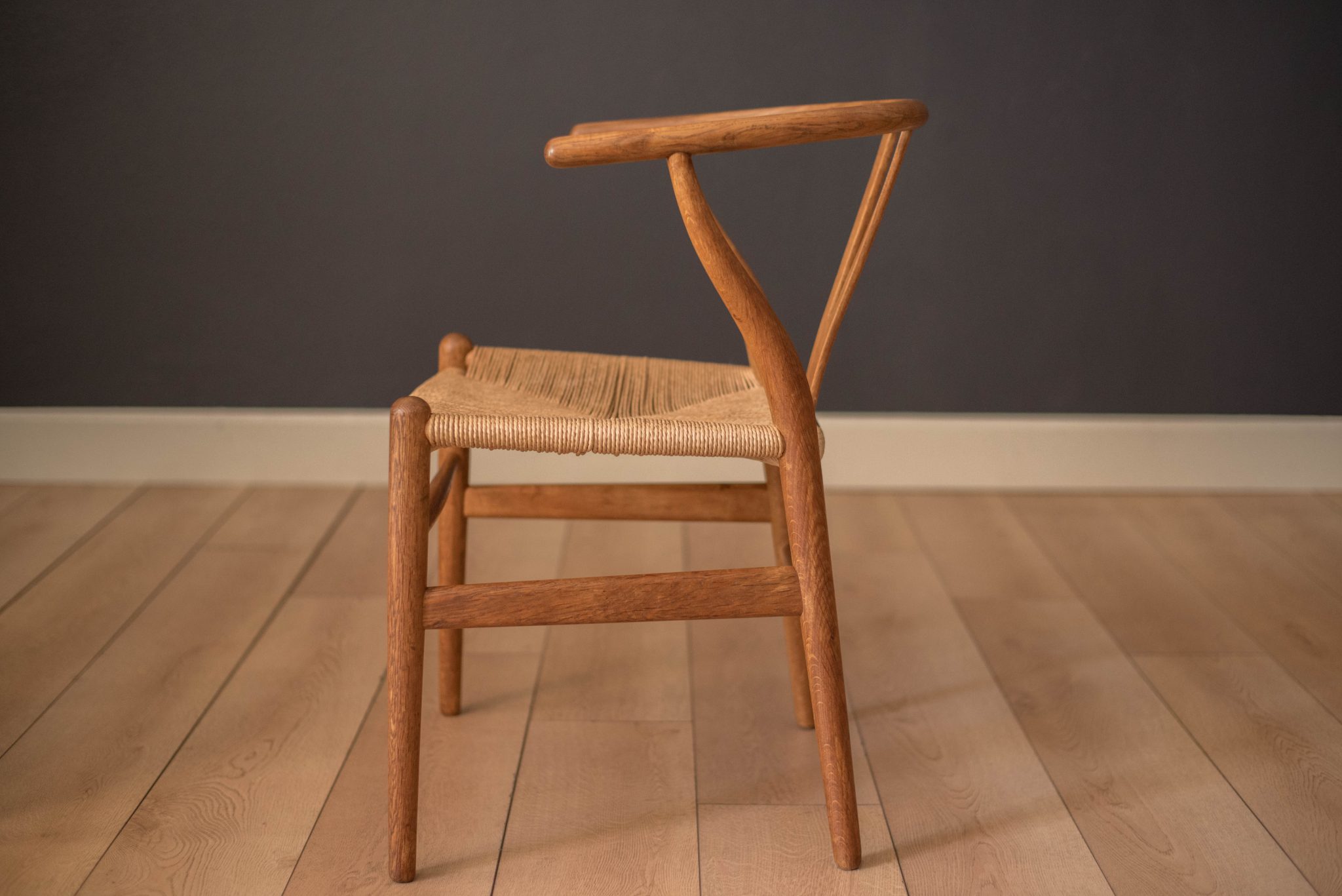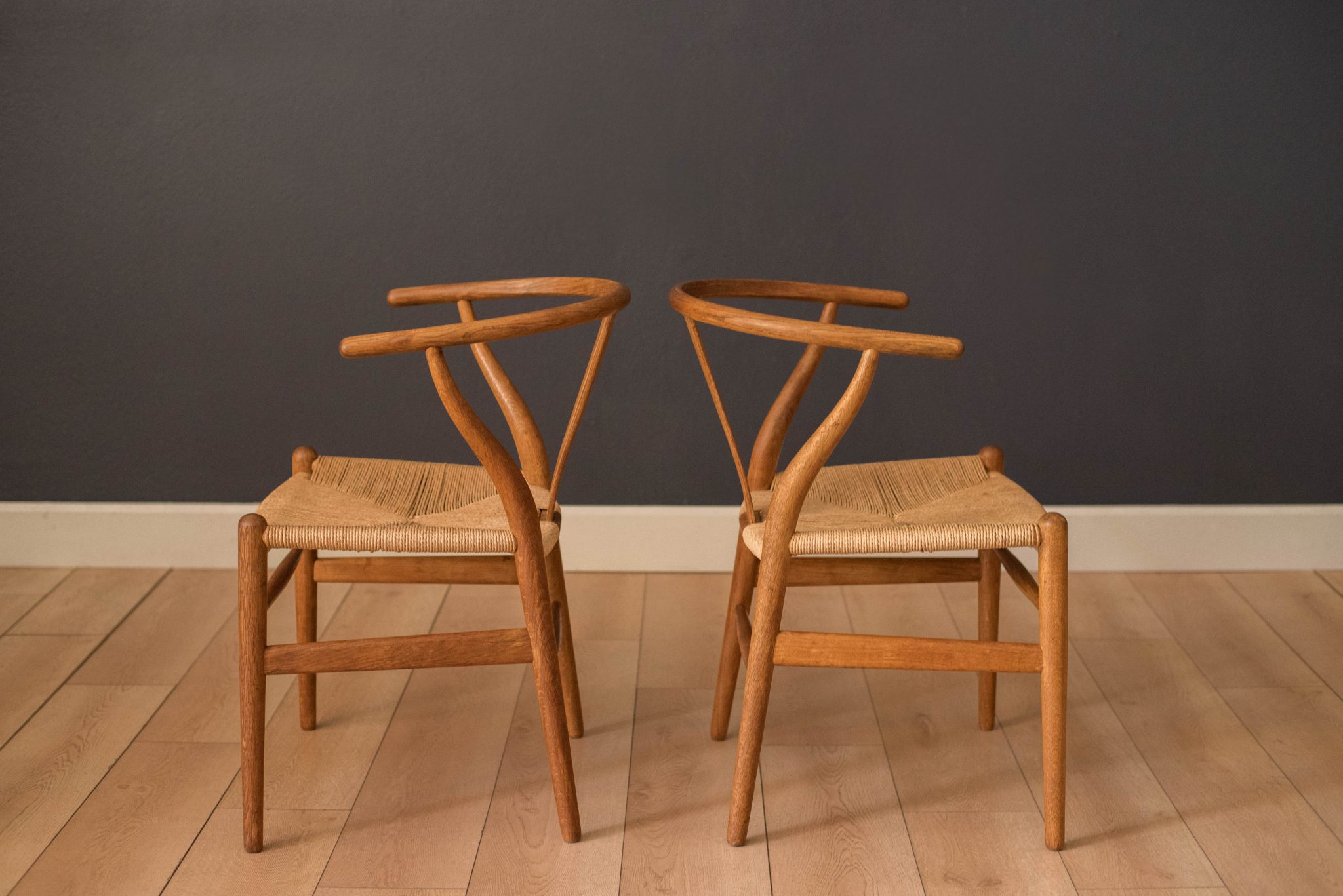 Mid-Century Modern Danish dining chairs designed by Hans J. Wegner for Carl Hansen & Søn manufactured in Odense, Denmark. This set includes six dining chairs with sculpted oak frames and handwoven paper cord seats. Backrest transitions to armrest in one solid bentwood piece supported by it’s signature ‘Y’ wishbone design. An early example of this iconic chair and is branded underneath.