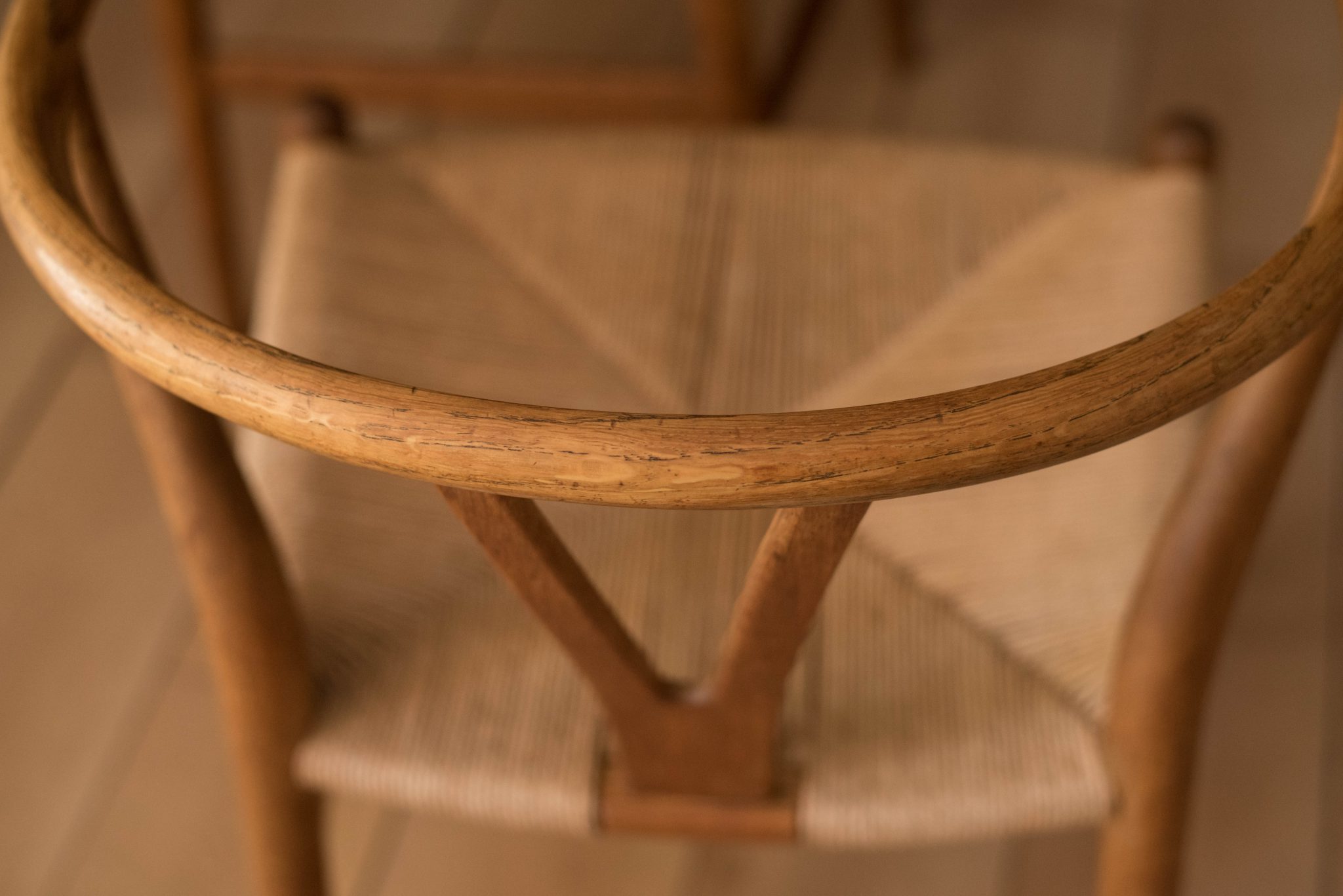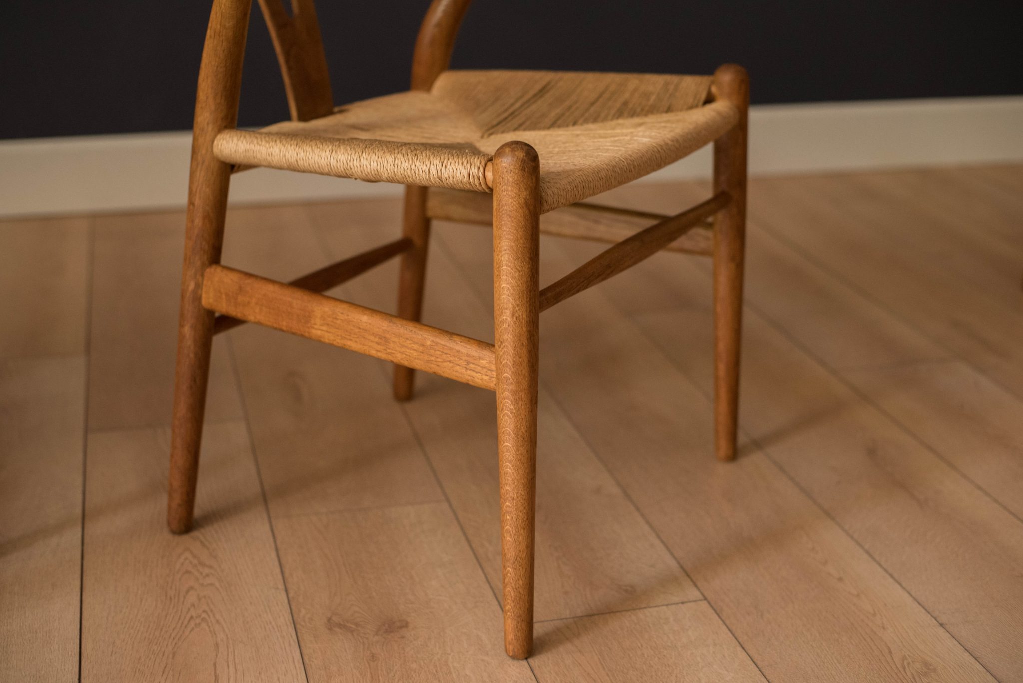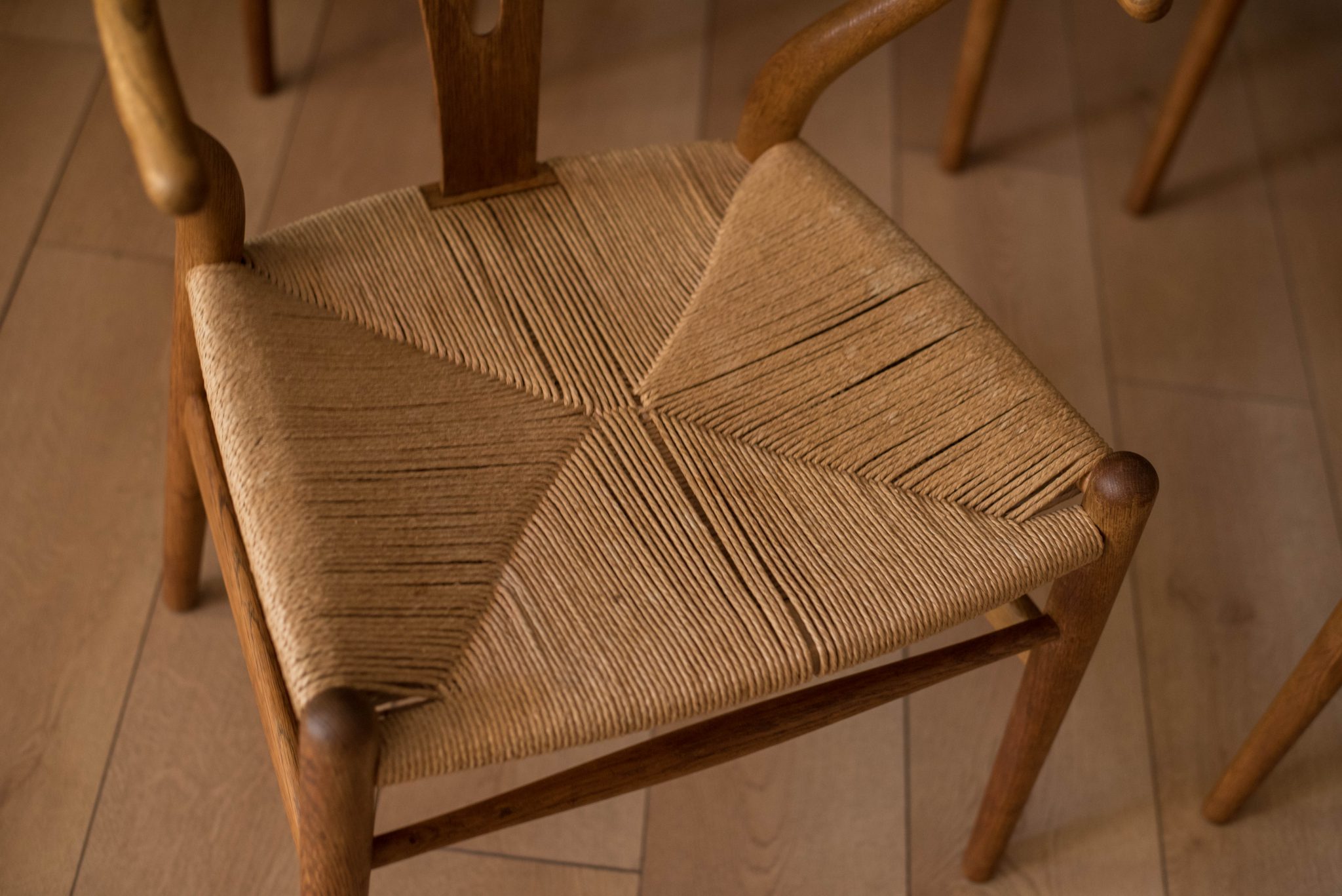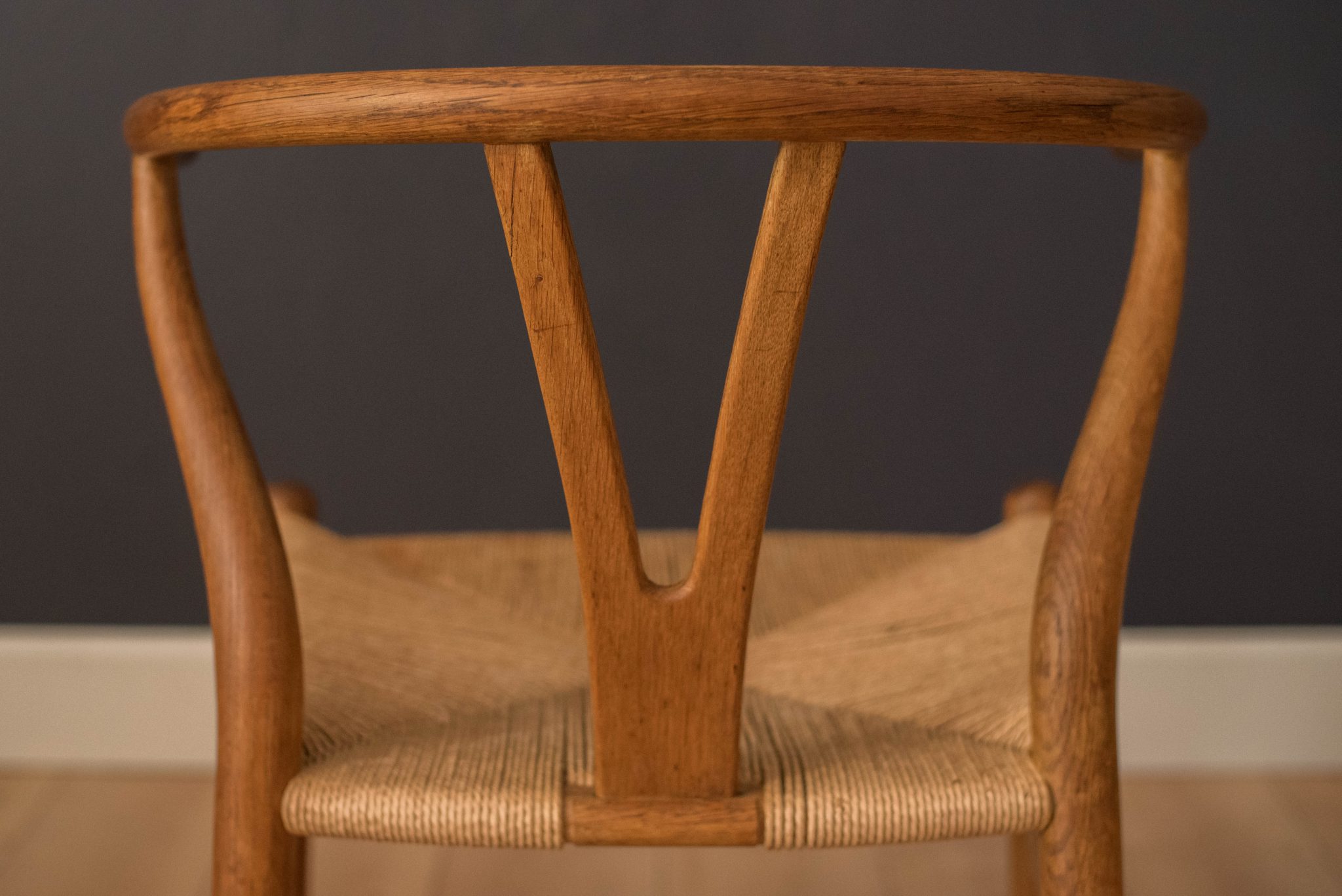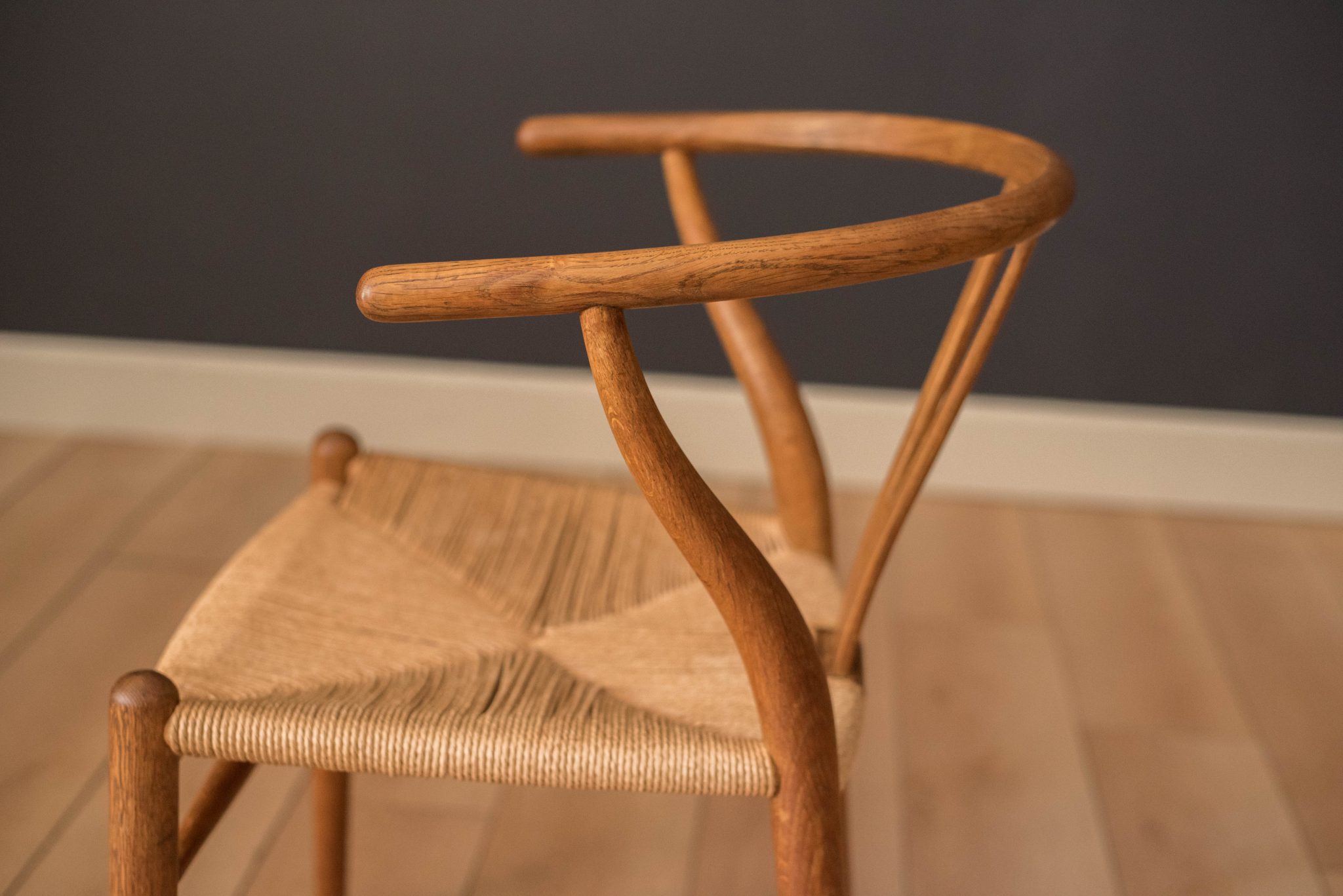 Mid-Century Modern Danish dining chairs designed by Hans J. Wegner for Carl Hansen & Søn manufactured in Odense, Denmark. This set includes six dining chairs with sculpted oak frames and handwoven paper cord seats. Backrest transitions to armrest in one solid bentwood piece supported by it’s signature ‘Y’ wishbone design. An early example of this iconic chair and is branded underneath.