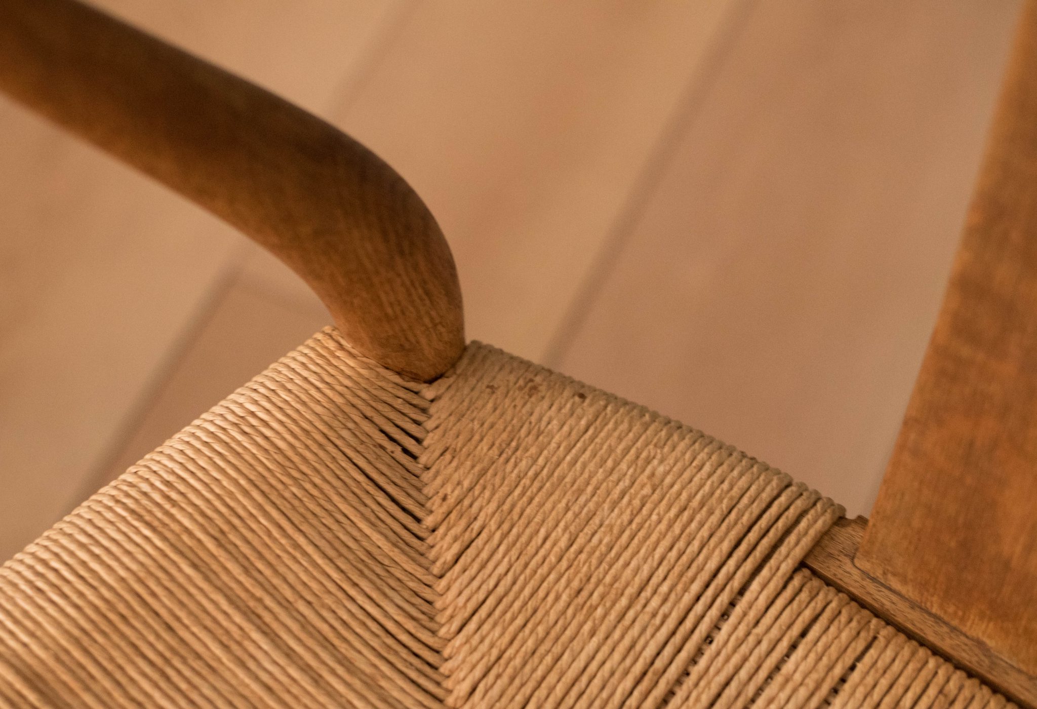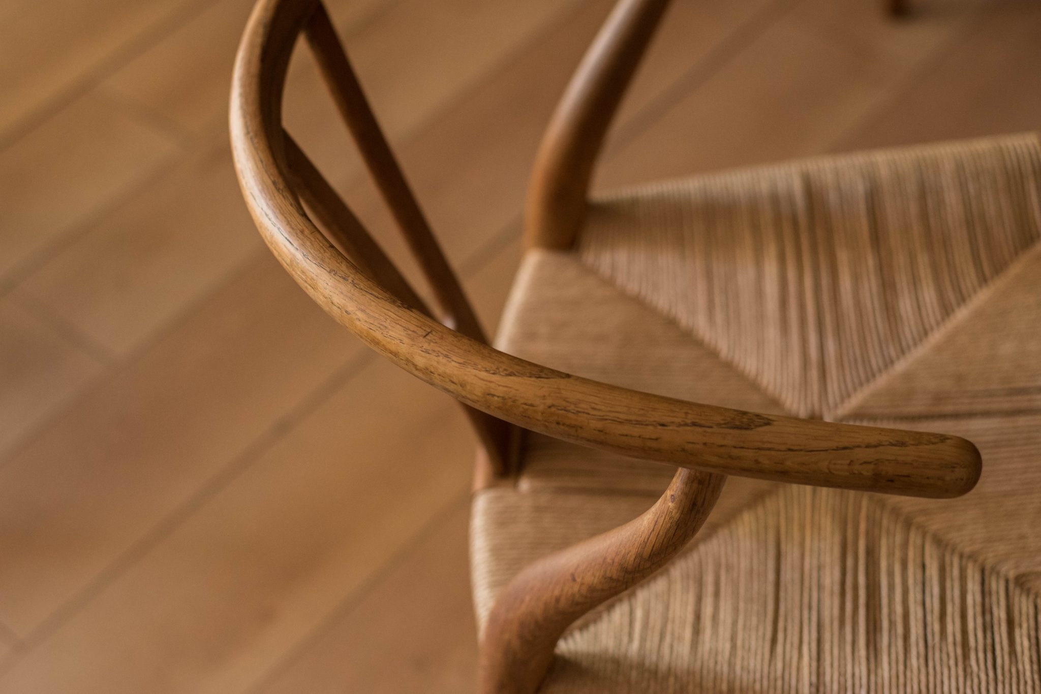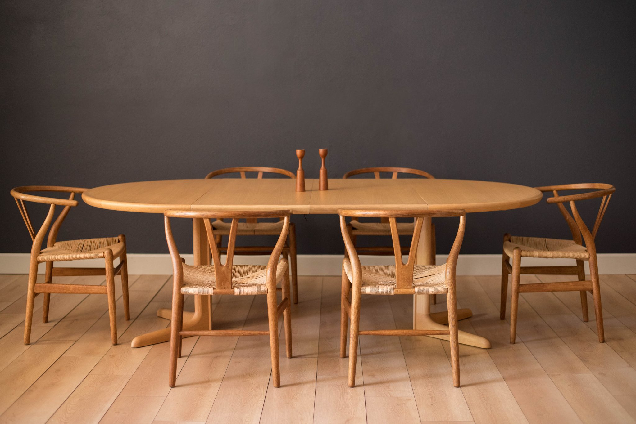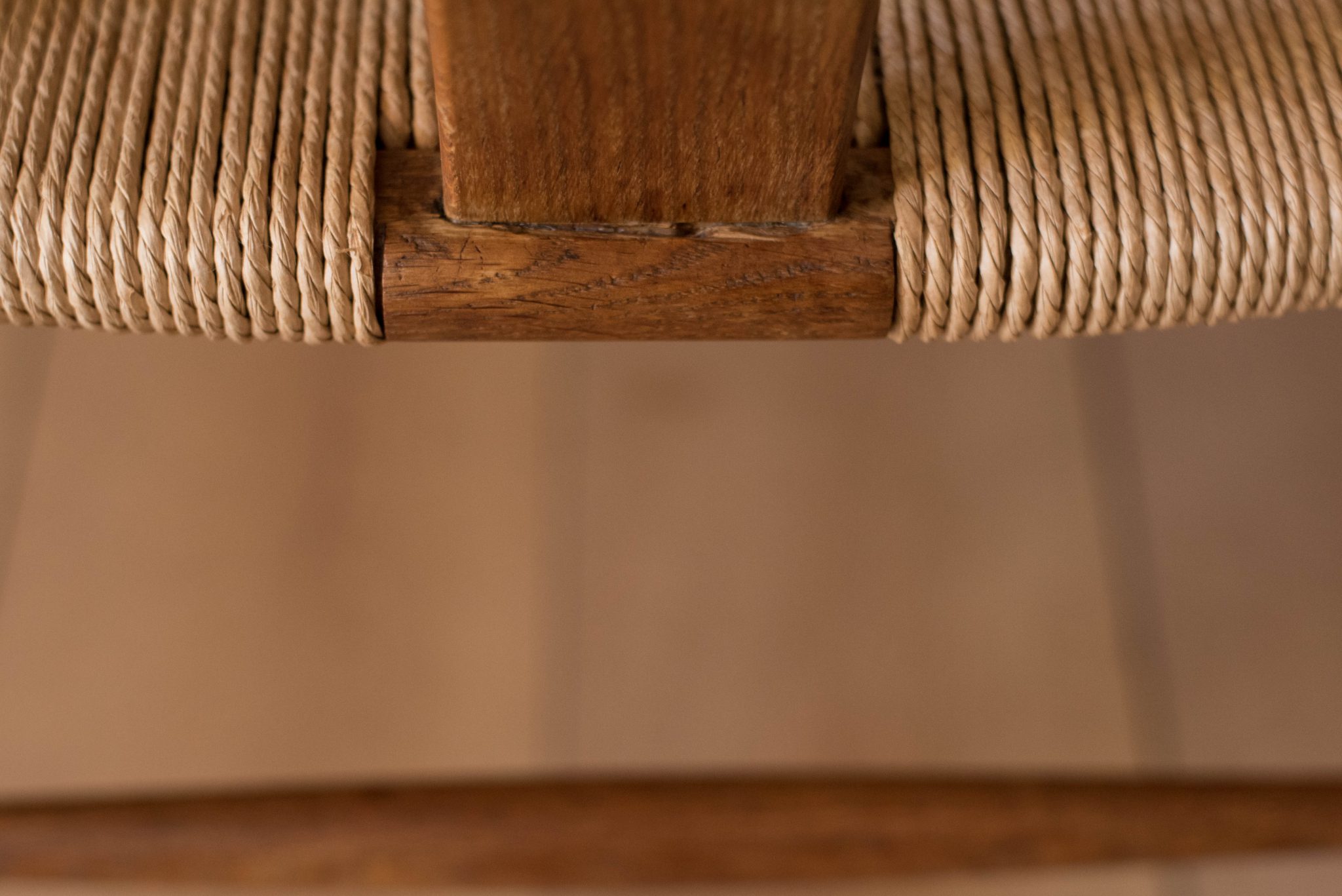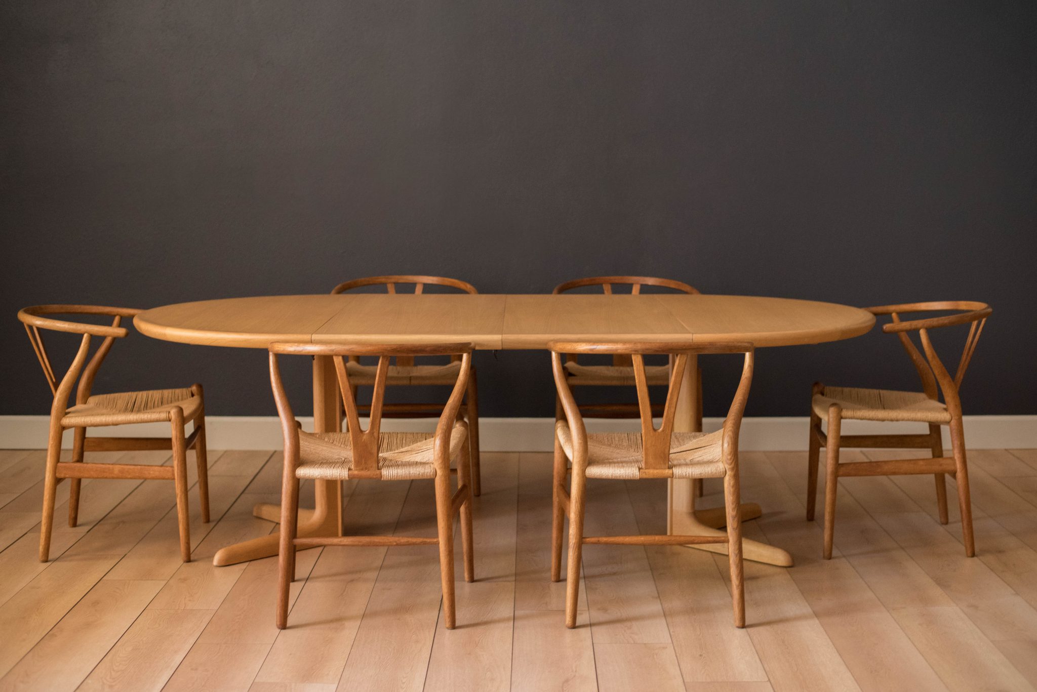 Mid-Century Modern Danish dining chairs designed by Hans J. Wegner for Carl Hansen & Søn manufactured in Odense, Denmark. This set includes six dining chairs with sculpted oak frames and handwoven paper cord seats. Backrest transitions to armrest in one solid bentwood piece supported by it’s signature ‘Y’ wishbone design. An early example of this iconic chair and is branded underneath.