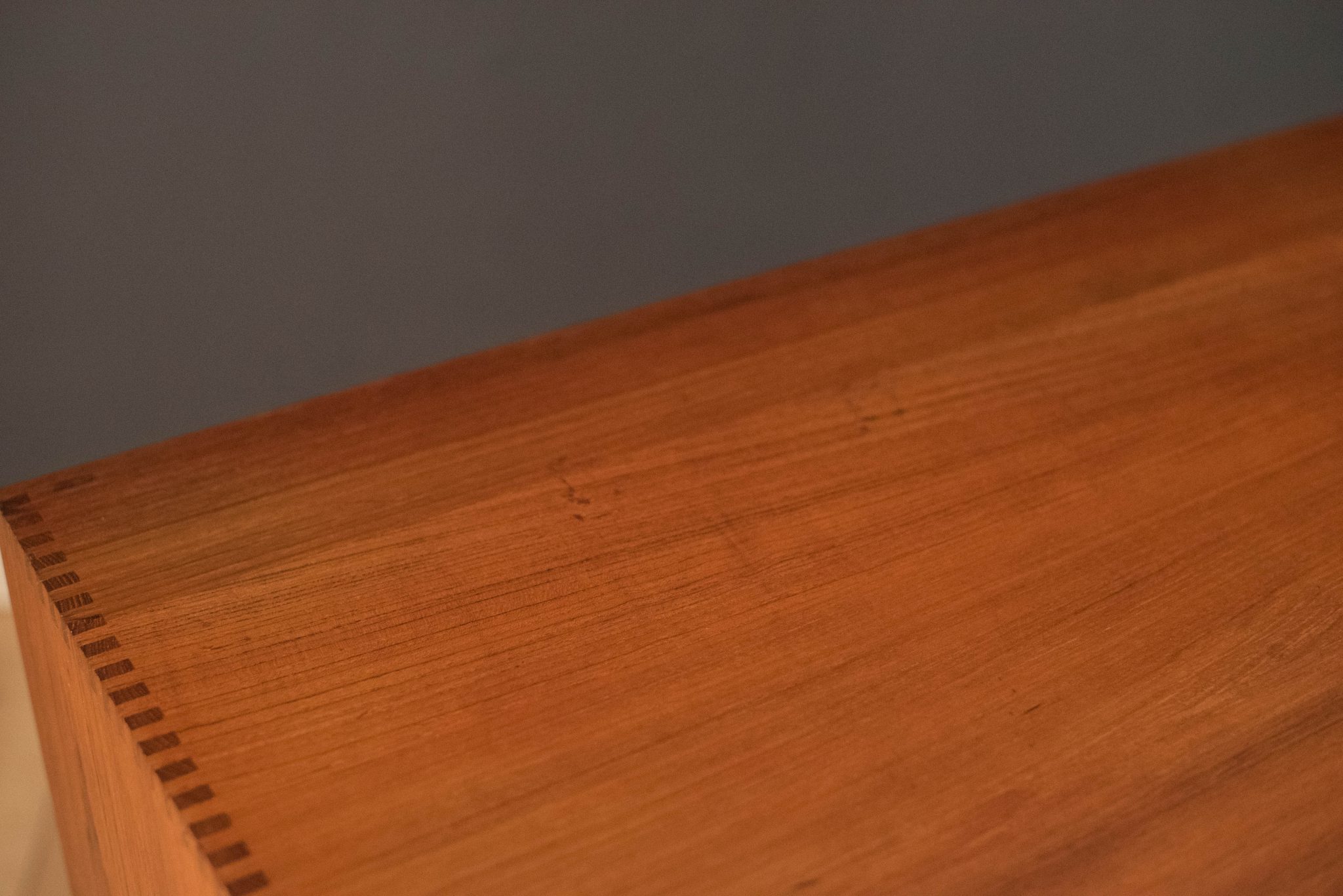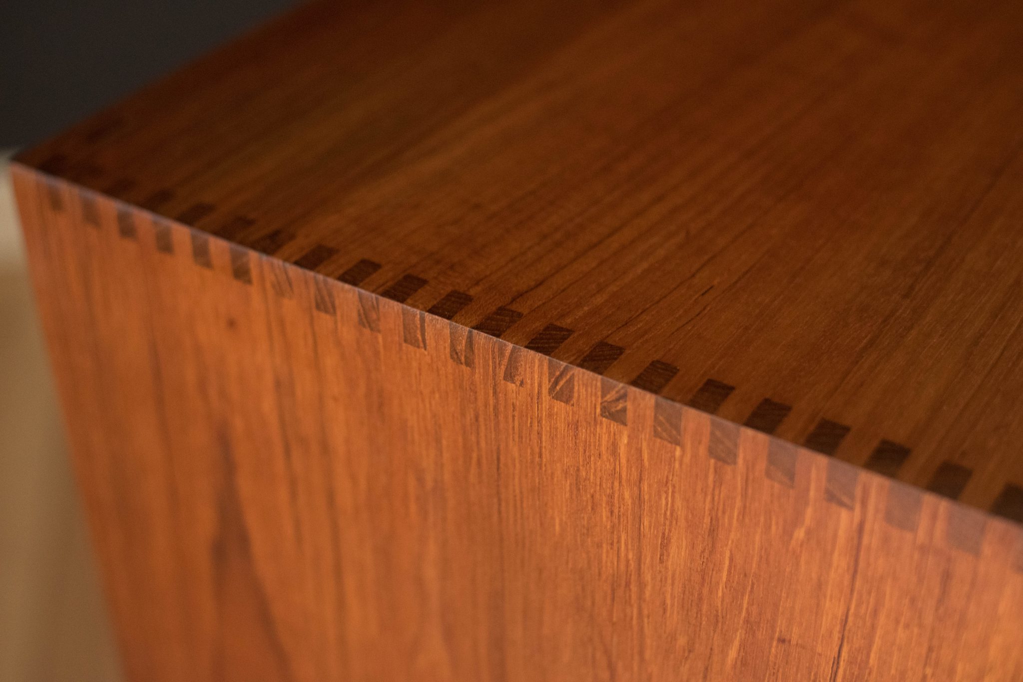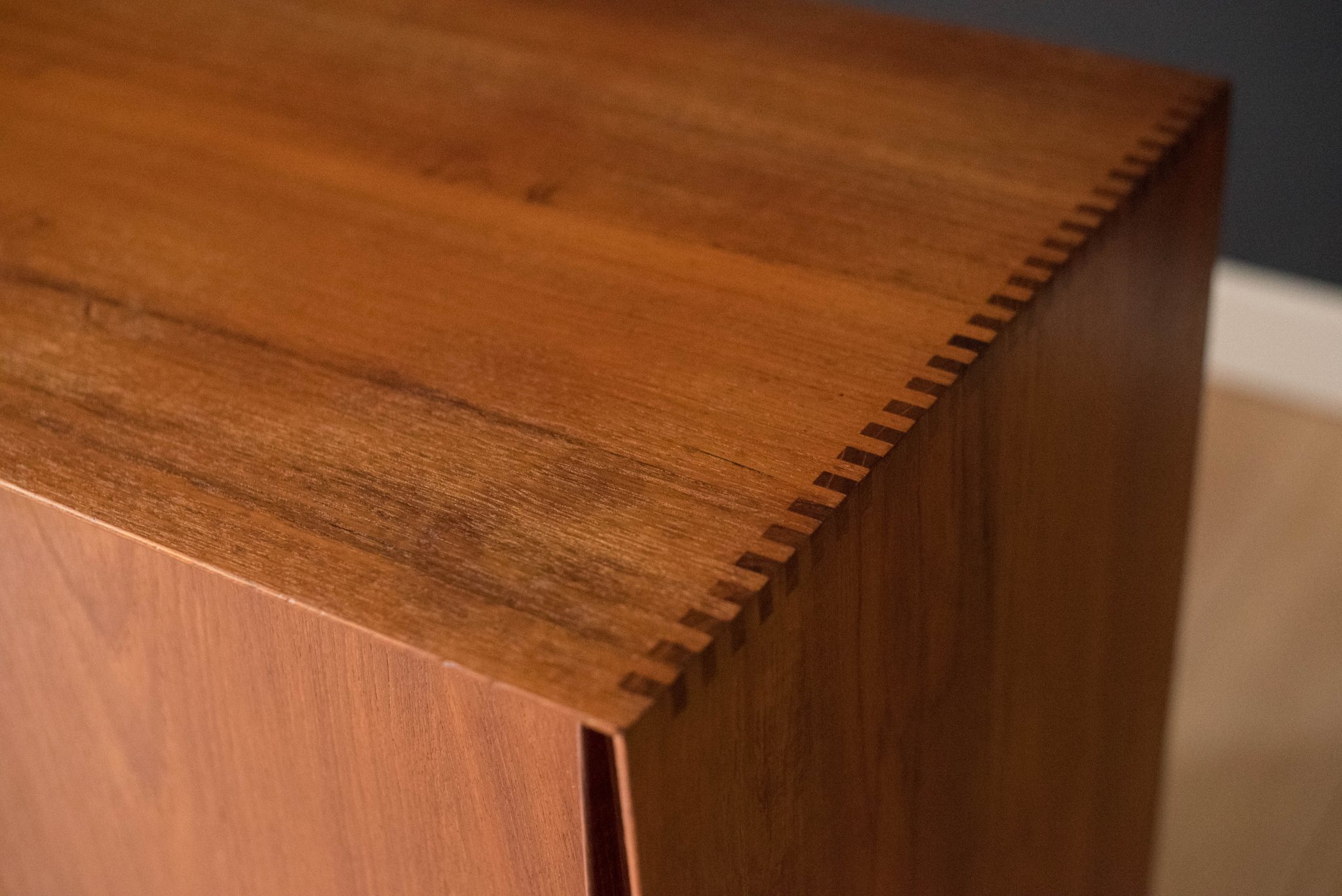 Mid-Century Modern two-tier cabinet designed by Peter Hvidt & Orla Mølgaard-Nielsen for Søborg Møbler in solid teak. This piece features sculpted wood handles and detailed finger joint construction. Includes one adjustable shelf on top cabinet and open compartment space on the bottom.