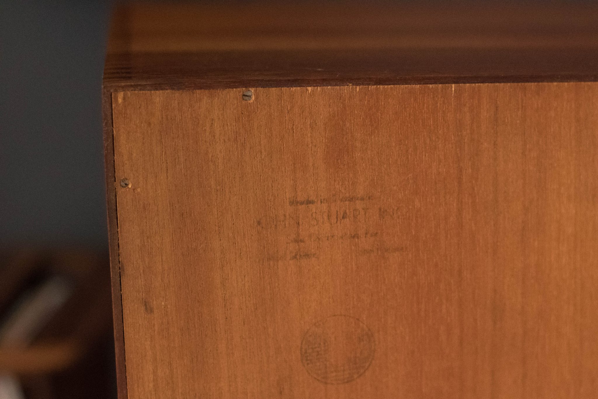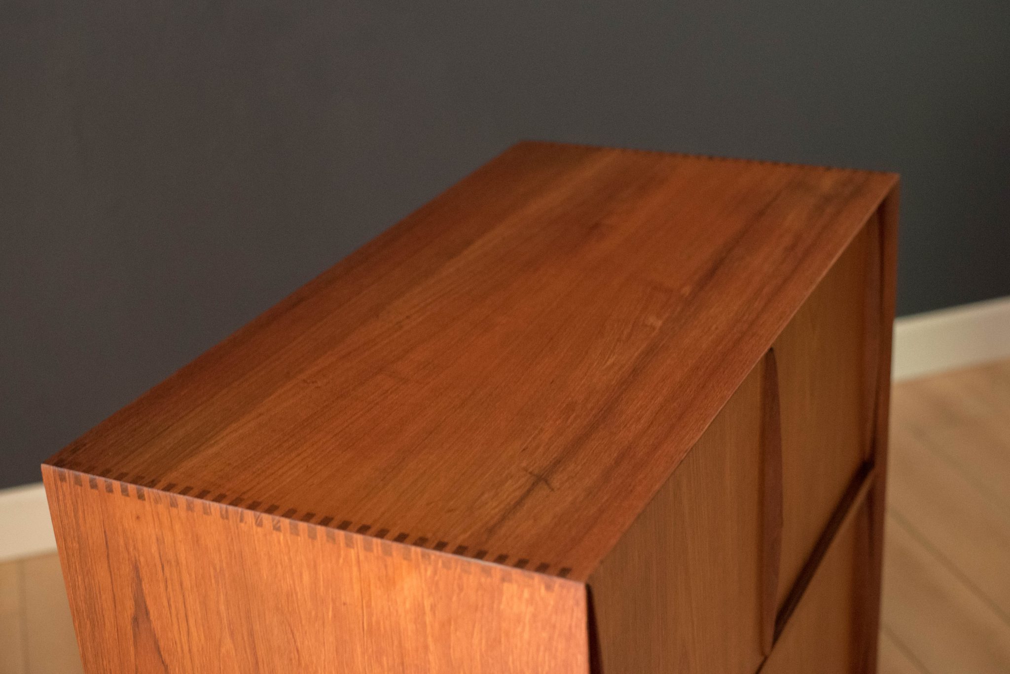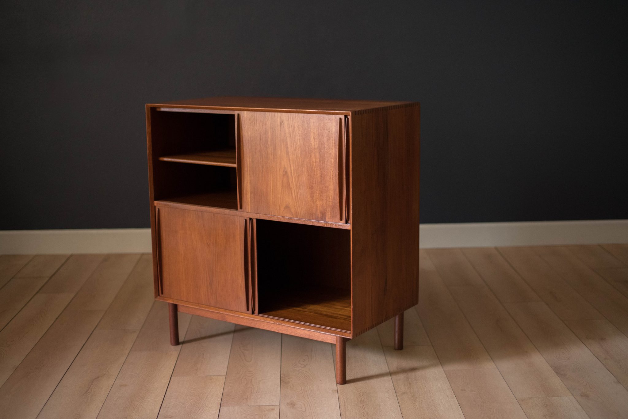Mid-Century Modern two-tier cabinet designed by Peter Hvidt & Orla Mølgaard-Nielsen for Søborg Møbler in solid teak. This piece features sculpted wood handles and detailed finger joint construction. Includes one adjustable shelf on top cabinet and open compartment space on the bottom.