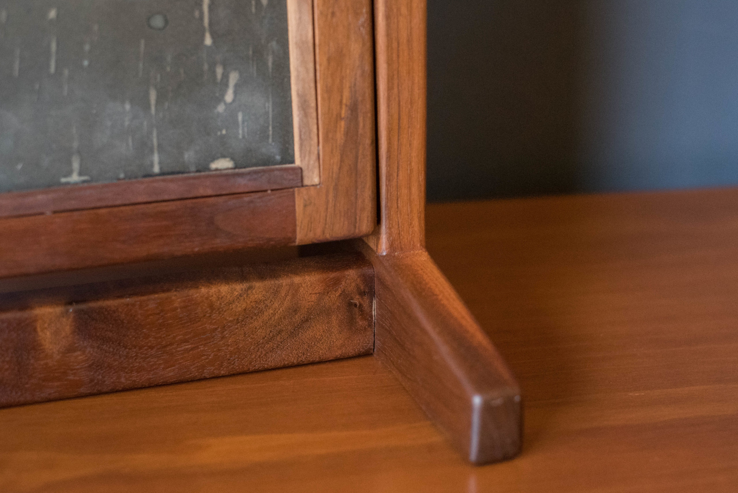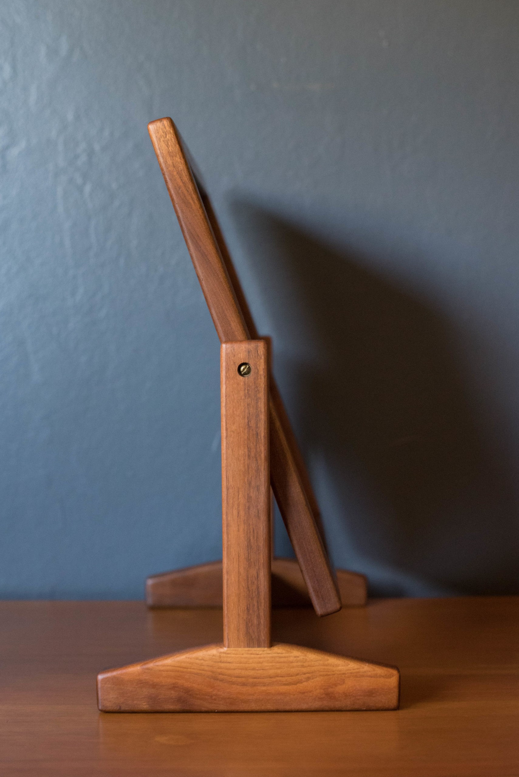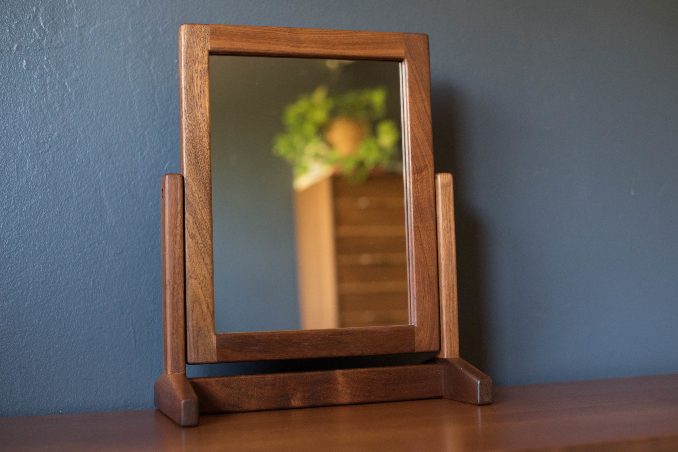 Vintage studio makeup vanity table mirror with stand circa 1960’s. This unique pivoting accent mirror is framed in solid walnut wood and is perfect for everyday use in the bathroom, dressing room, or accented on a bedroom dresser.