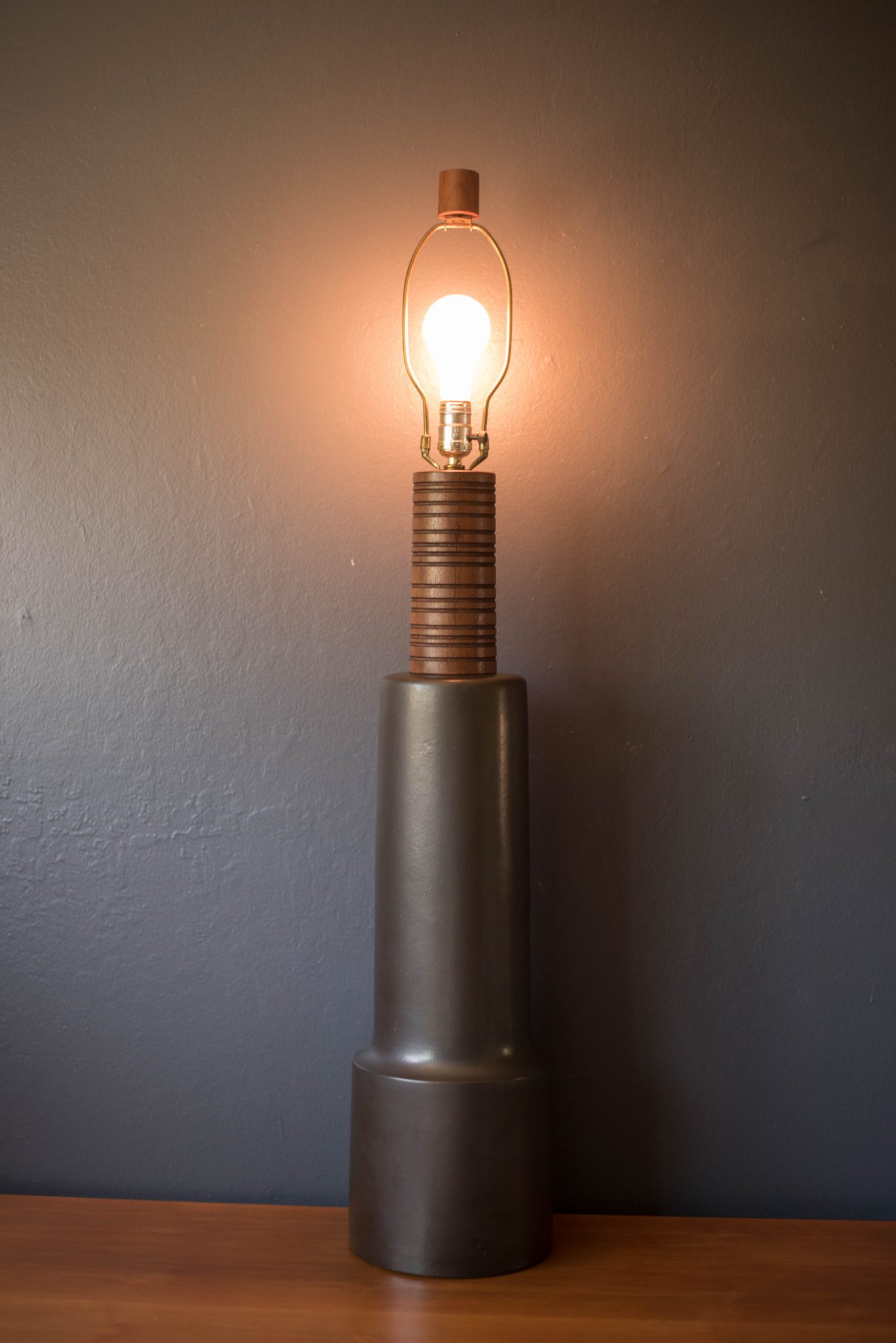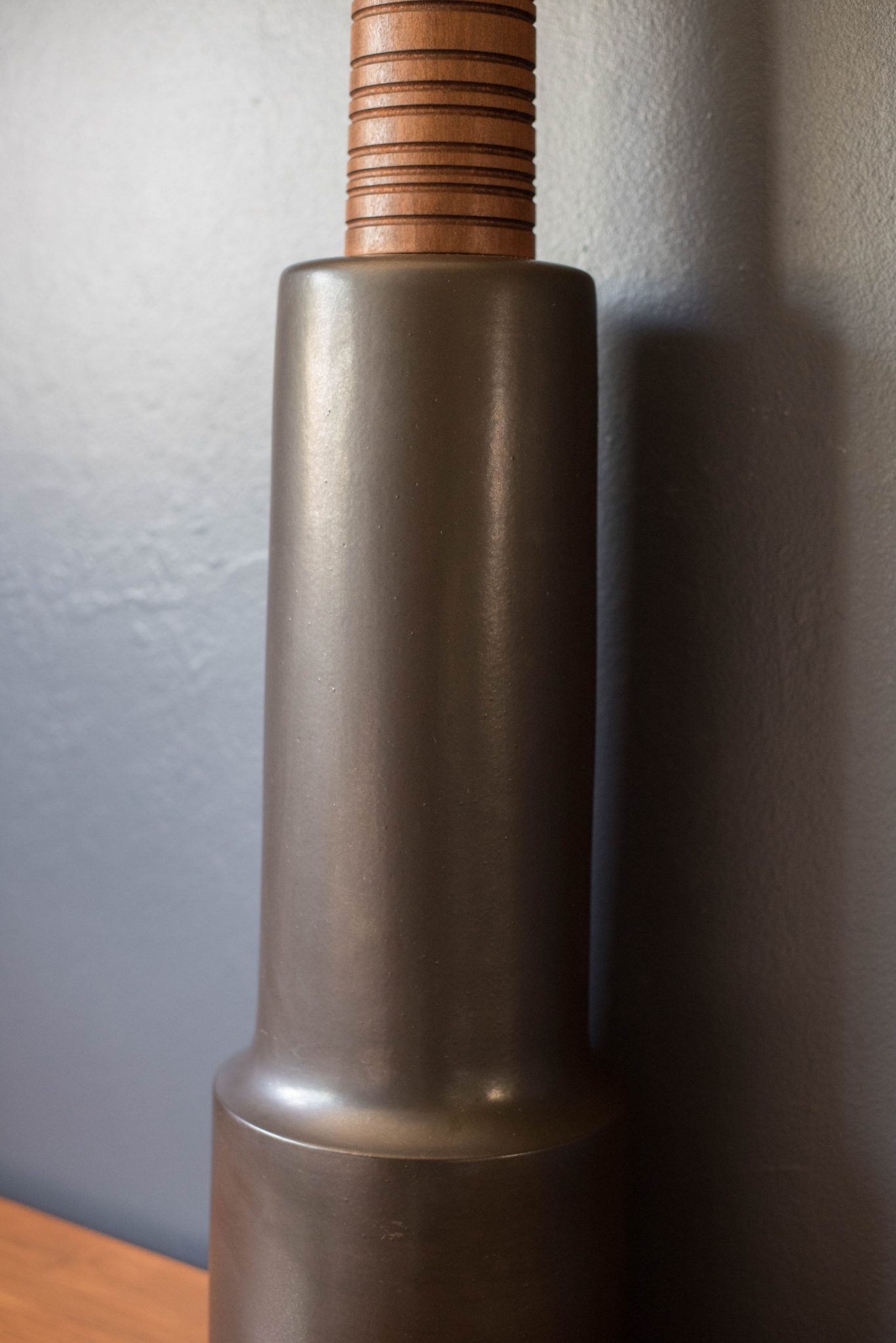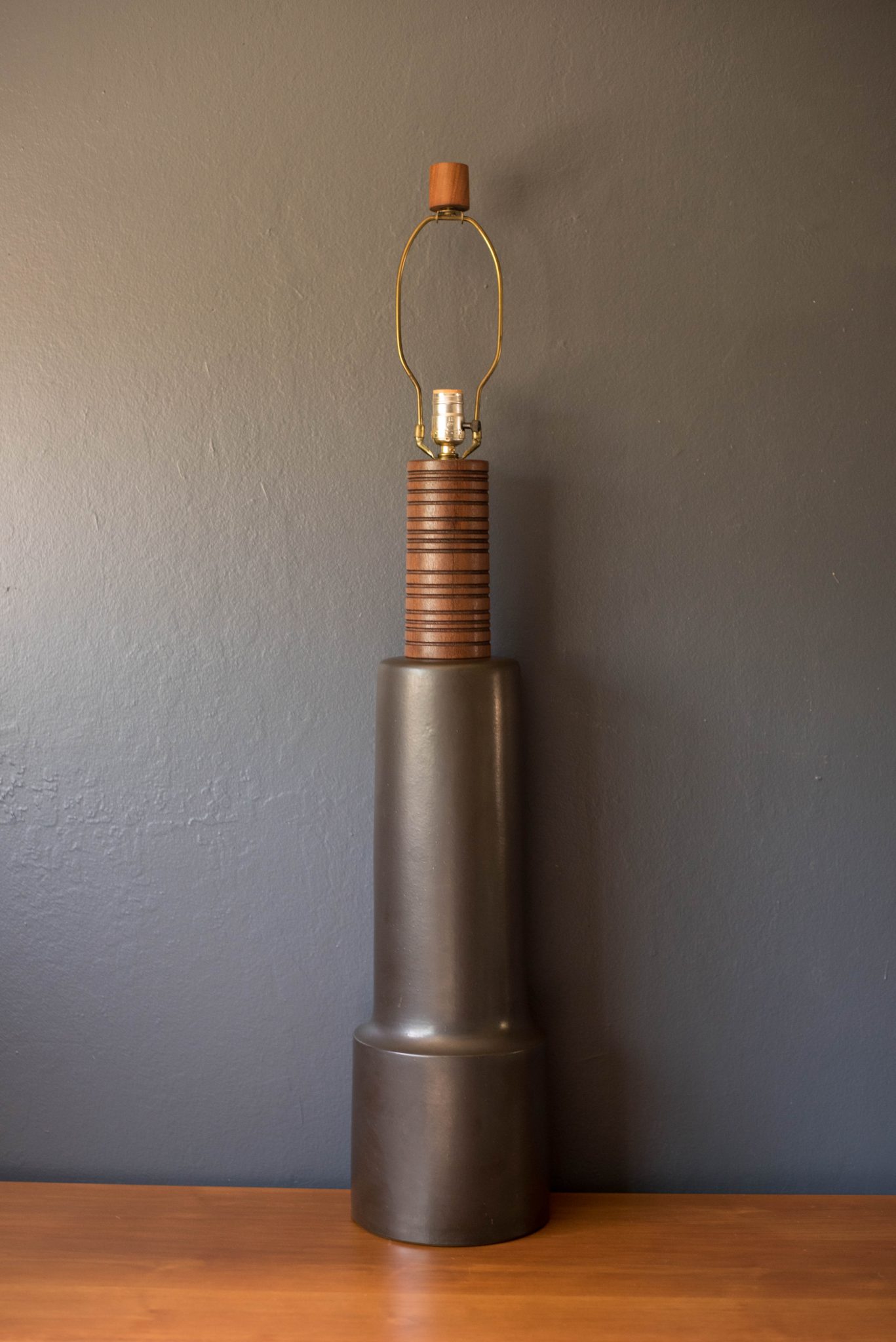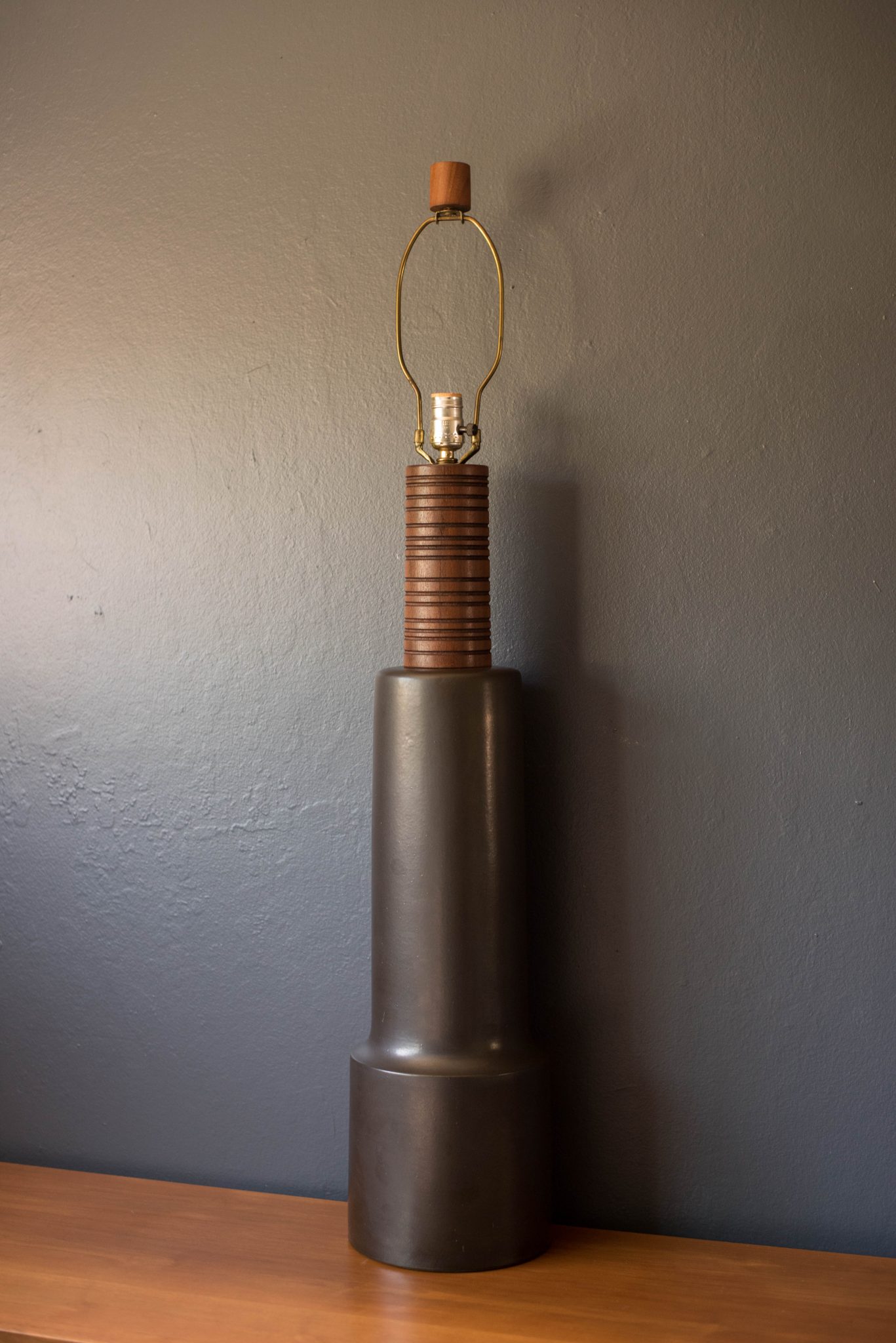 Mid-Century Modern tall pottery lamp by Jane and Gordon Martz for Marshall Studios. This oversized piece has a charcoal matte finish with walnut stem and finial. Includes a three way switch.