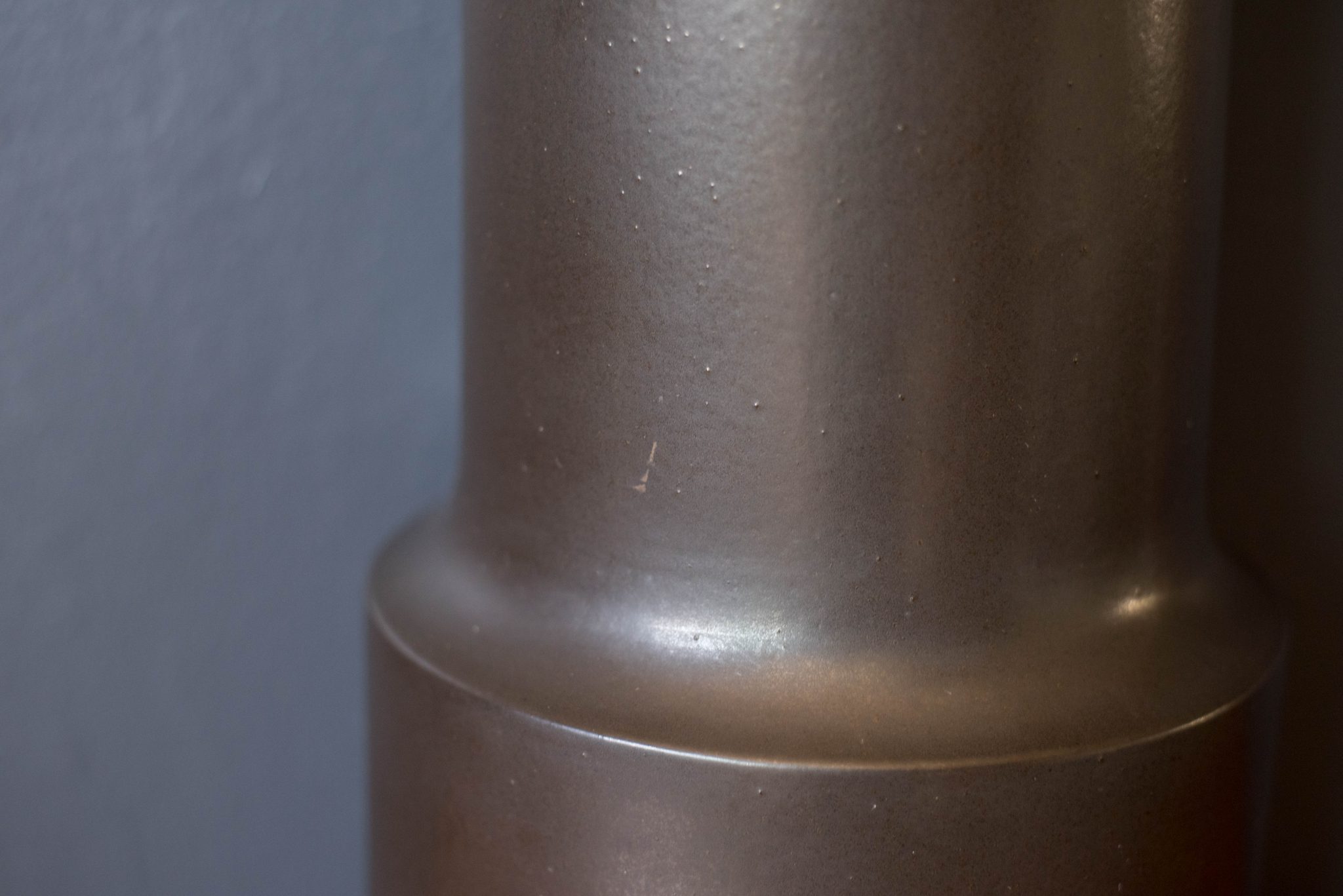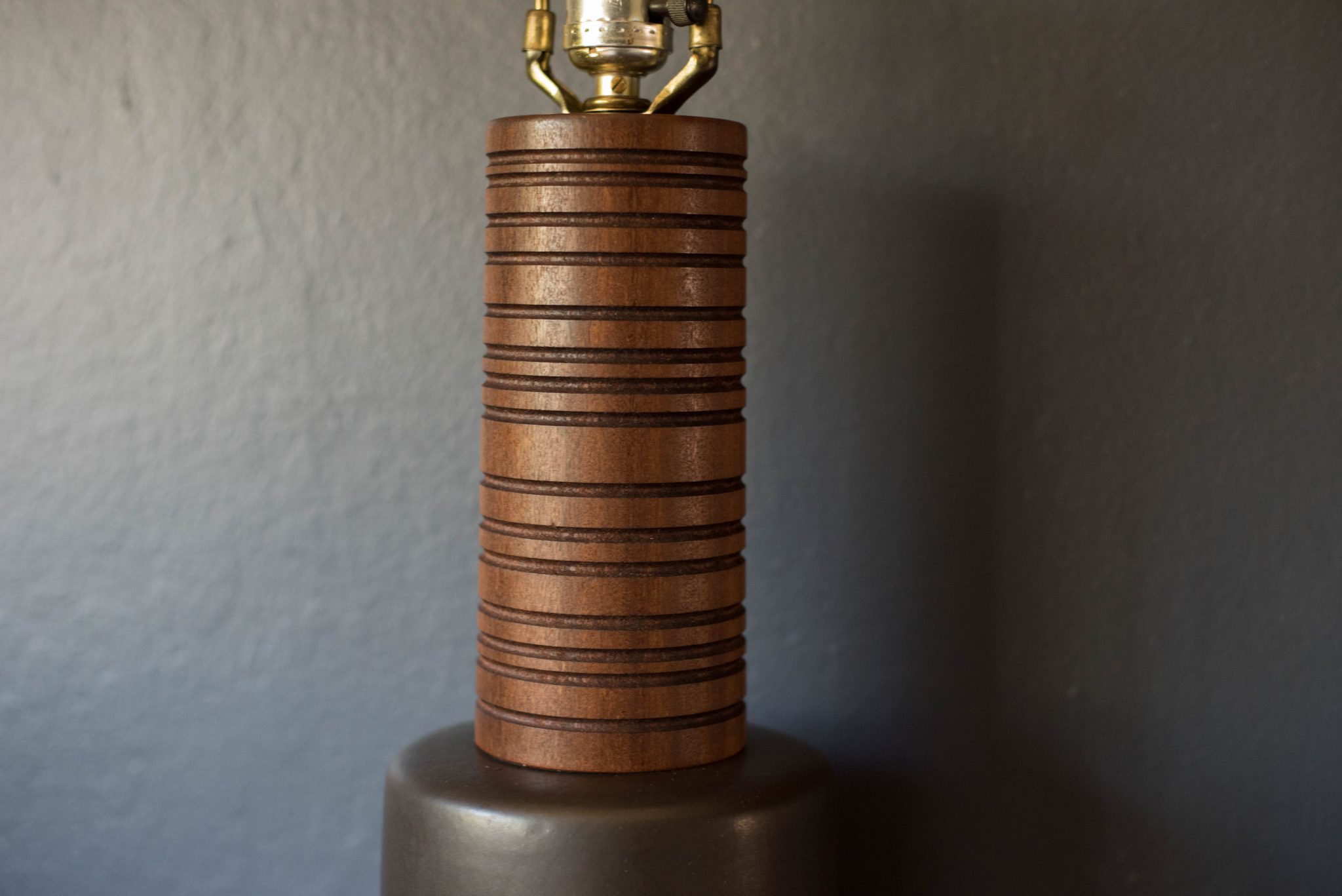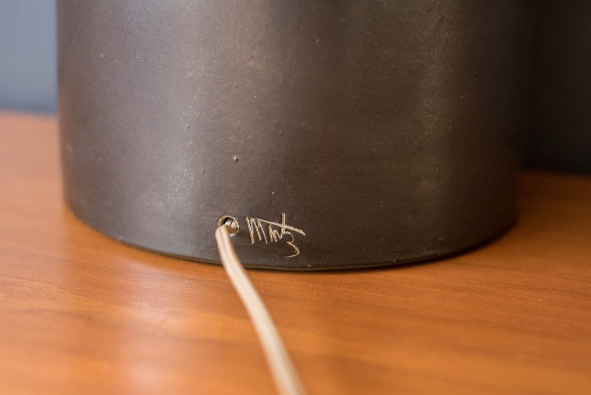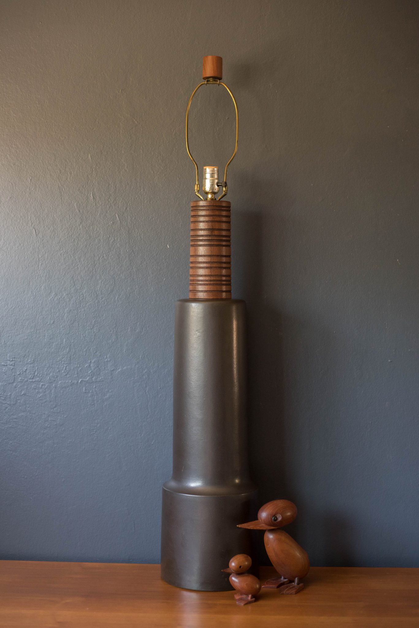 Mid-Century Modern tall pottery lamp by Jane and Gordon Martz for Marshall Studios. This oversized piece has a charcoal matte finish with walnut stem and finial. Includes a three way switch.