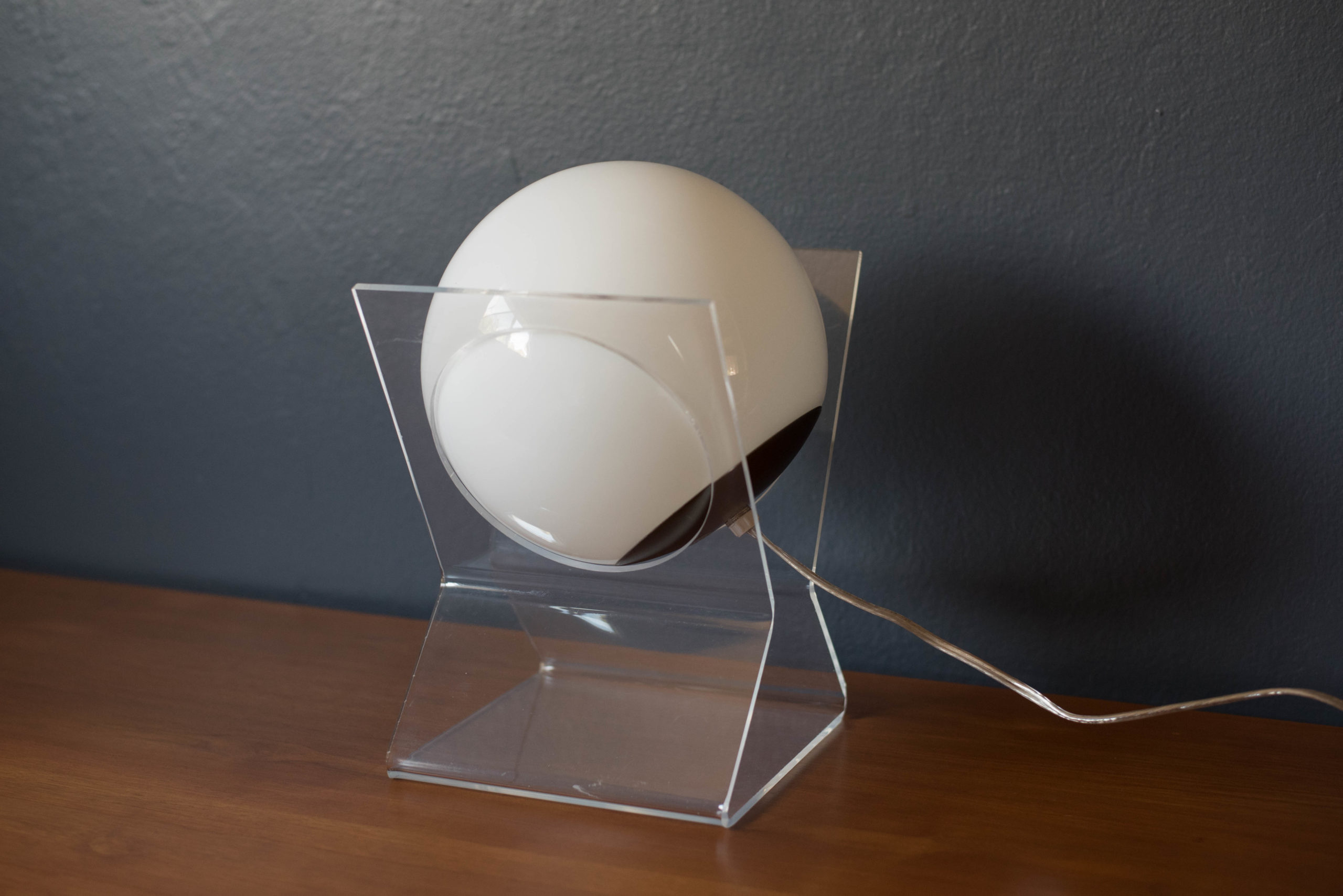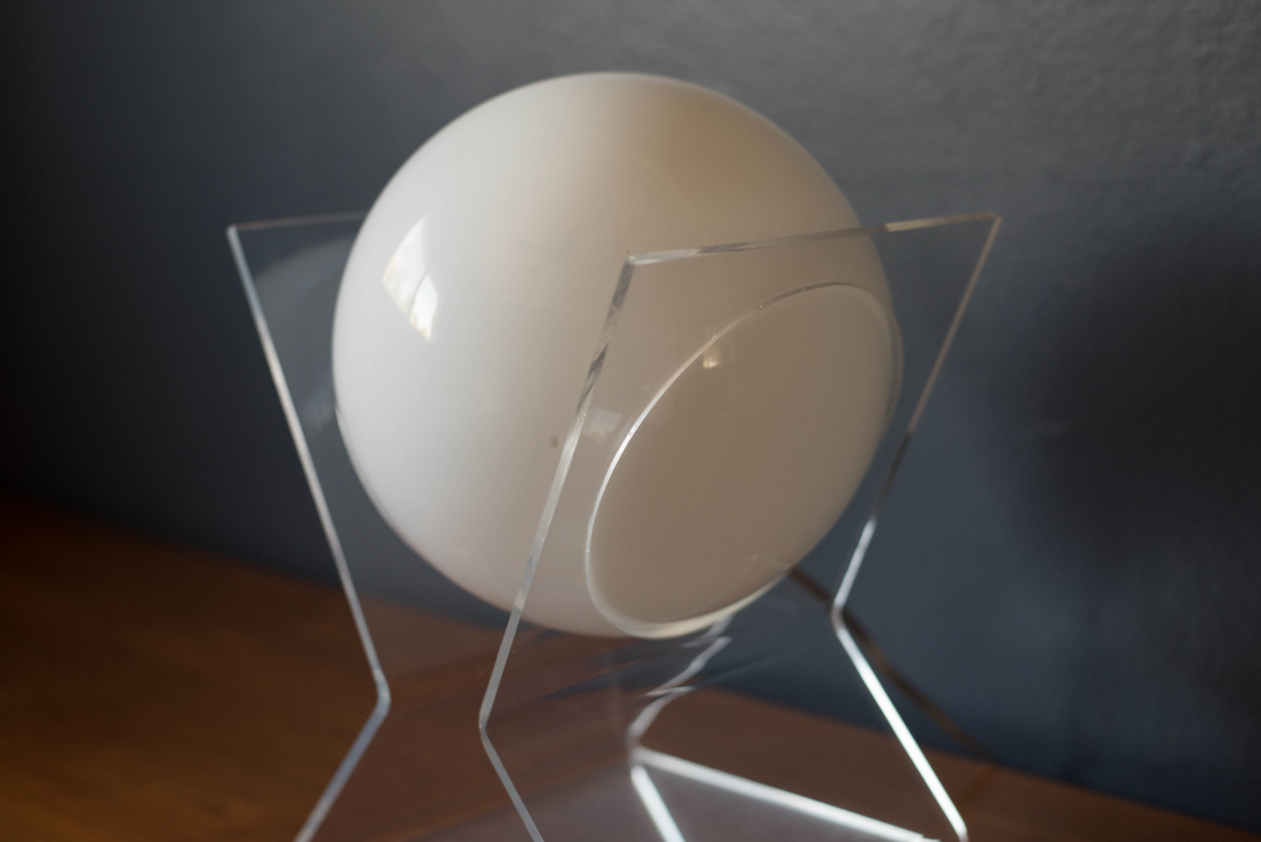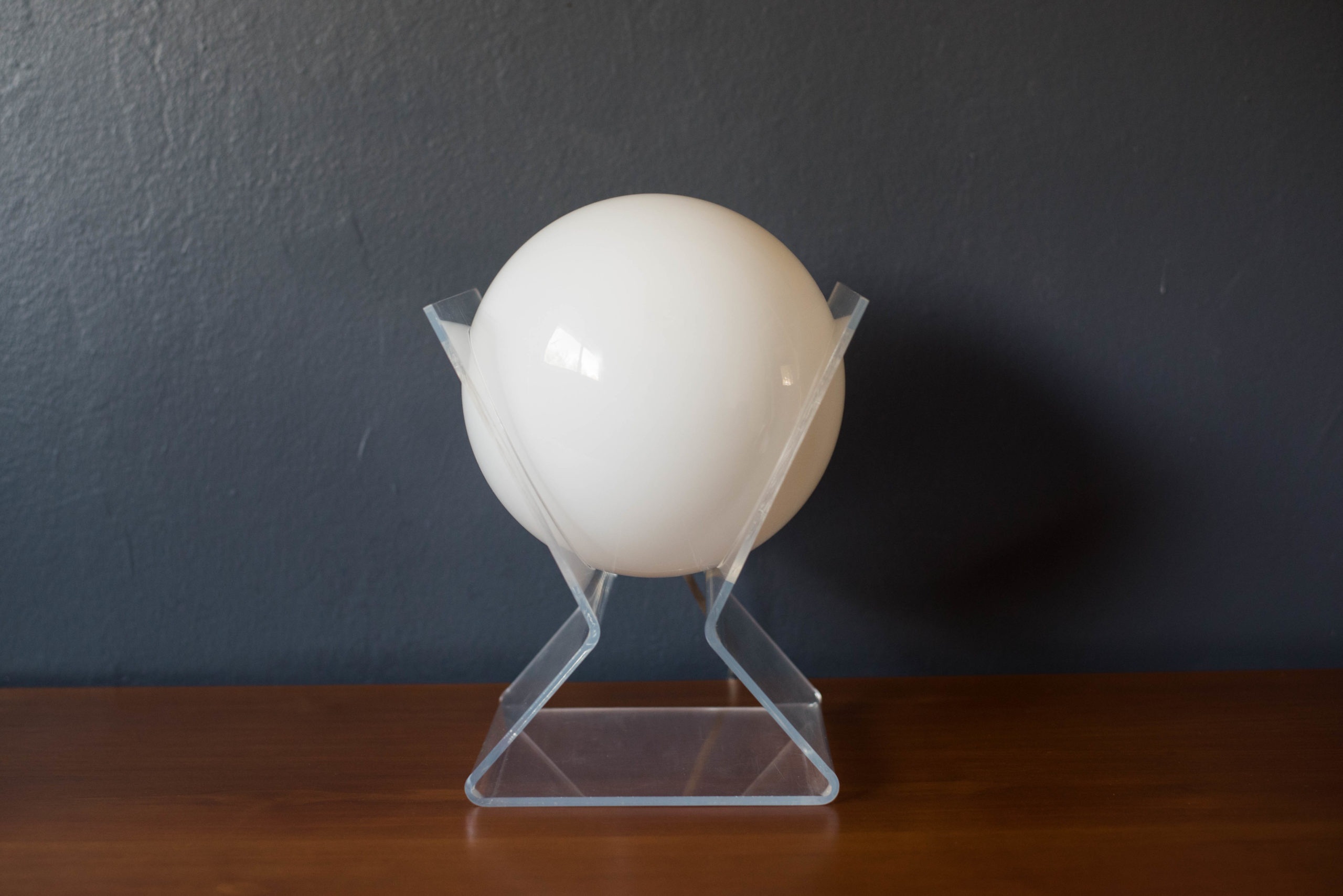 Mid-Century Modern accent globe table lamp, circa 1970s. This piece features a floating moon glass globe that emits a soft glow supported by a lucite angular frame.