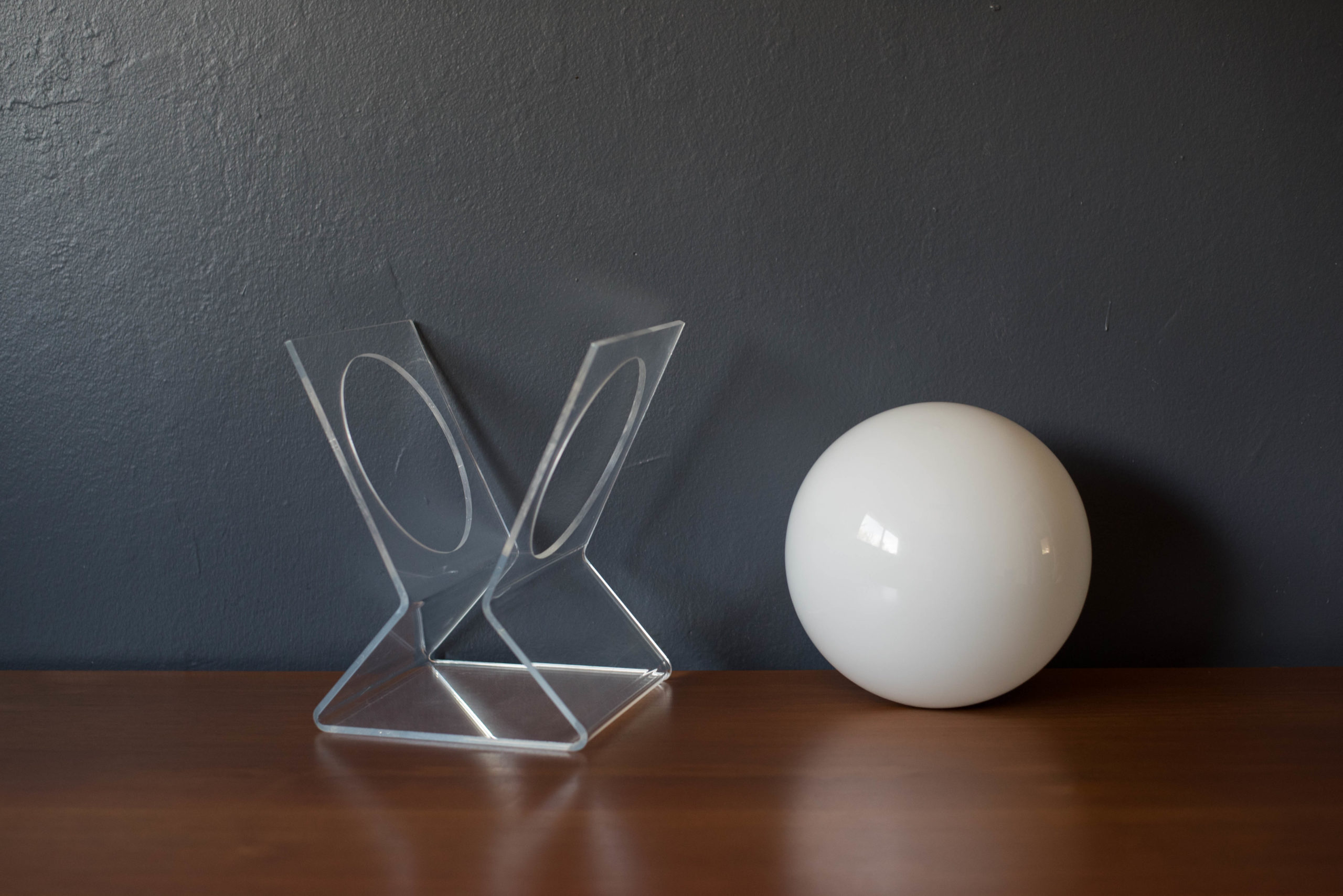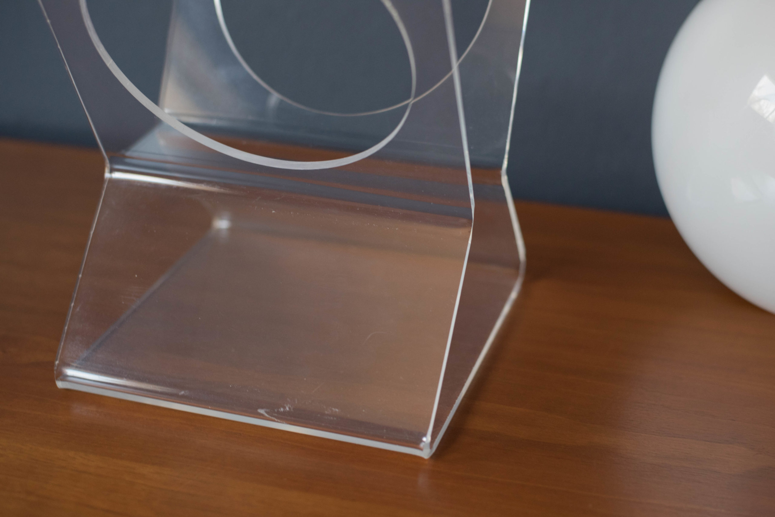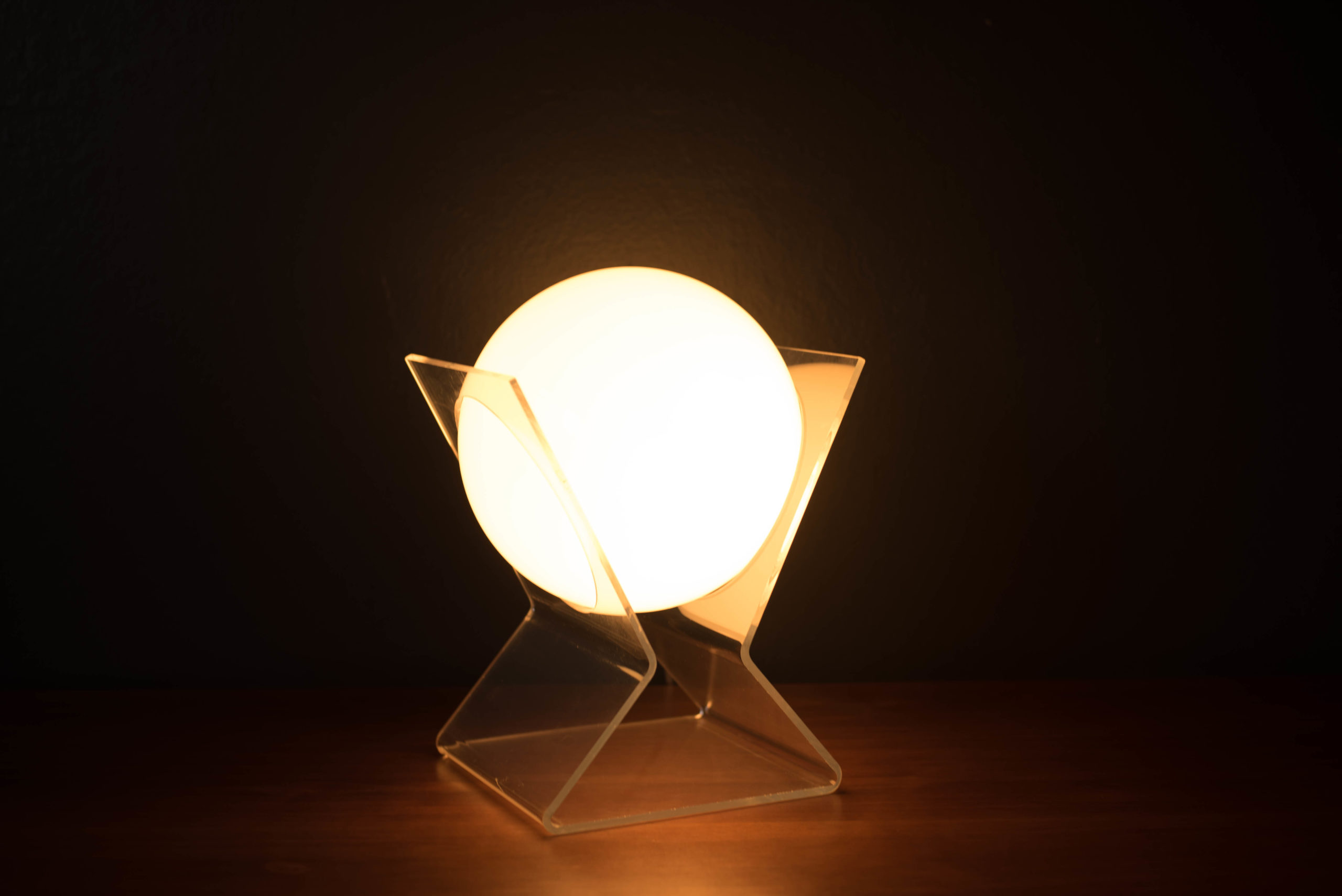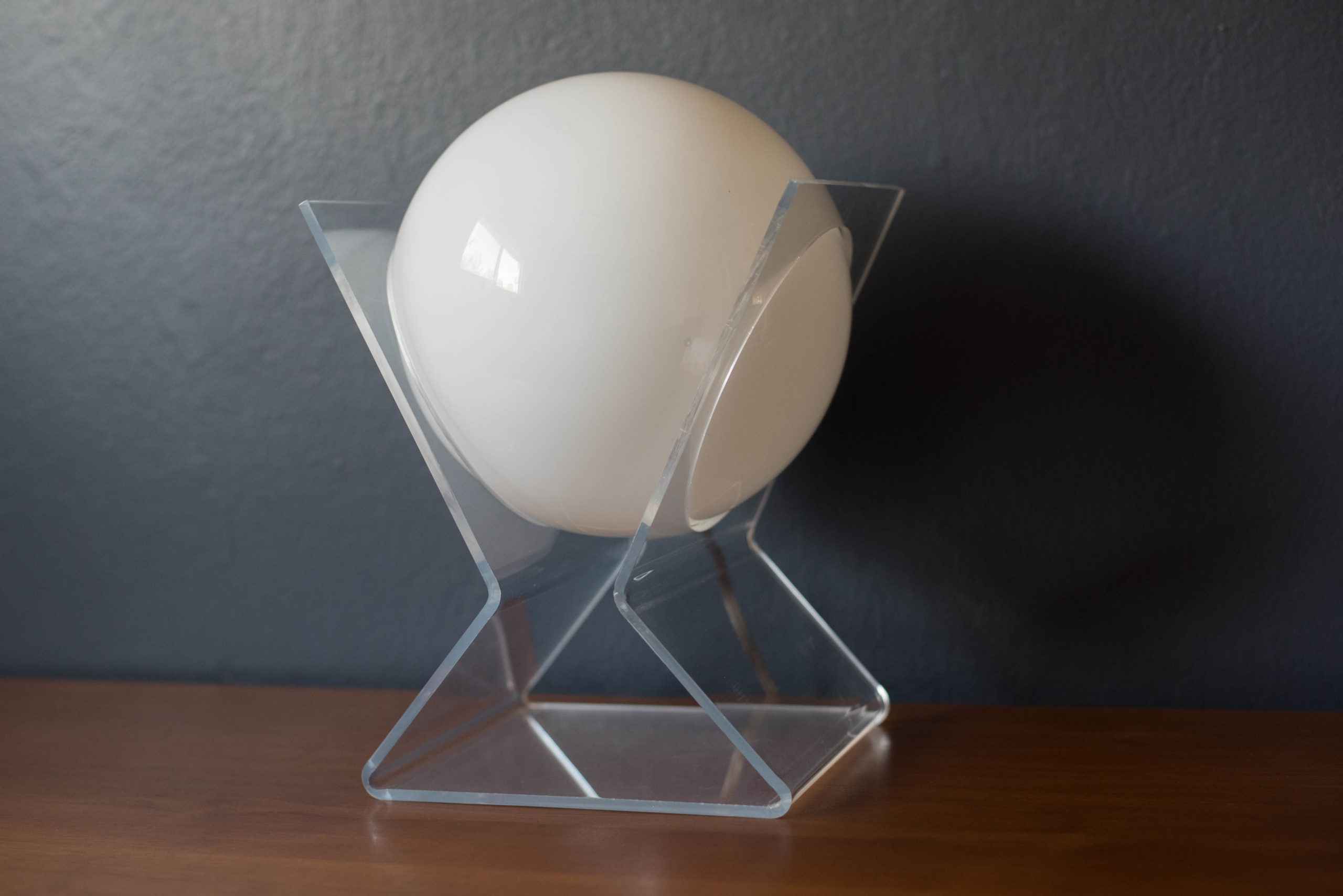 Mid-Century Modern accent globe table lamp, circa 1970s. This piece features a floating moon glass globe that emits a soft glow supported by a lucite angular frame.