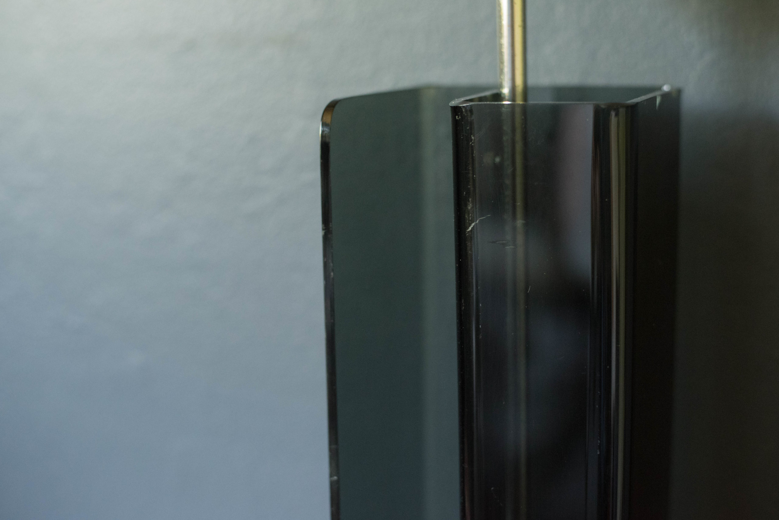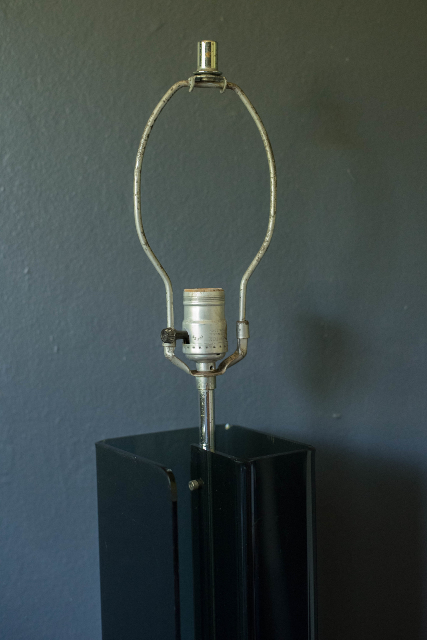 Mid-Century Modern Space Age accent table lamp circa 1970s. Features a tall smoked acrylic base with a floating aluminum center rod. Lamp shade is not included. In good condition with scuffs and scratches on the acrylic base. Patina on the metal rod and hardware. See photos.