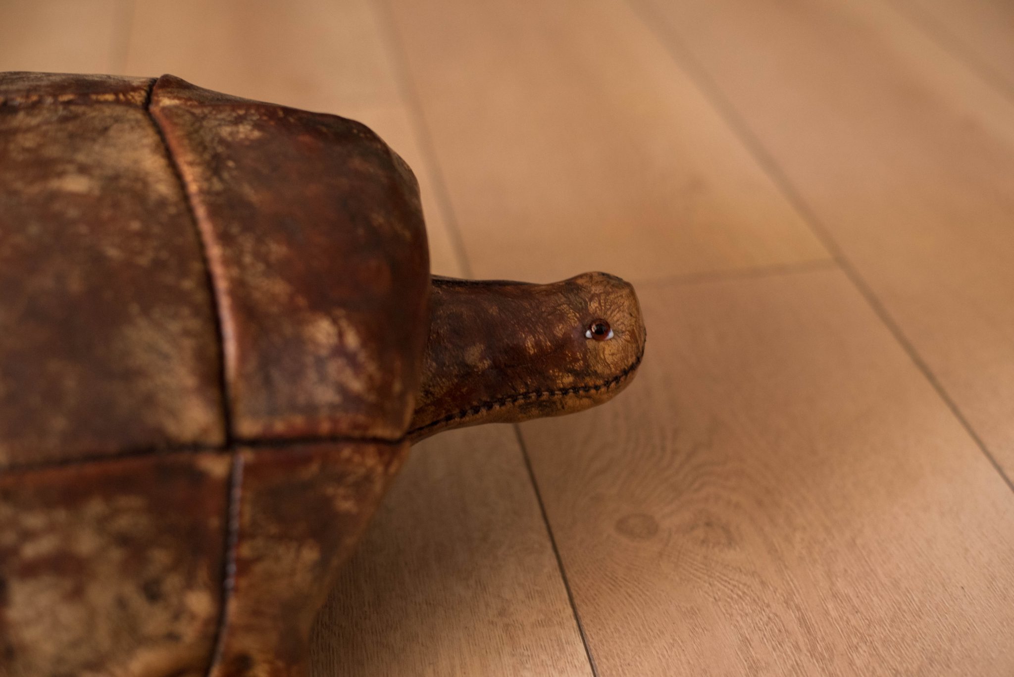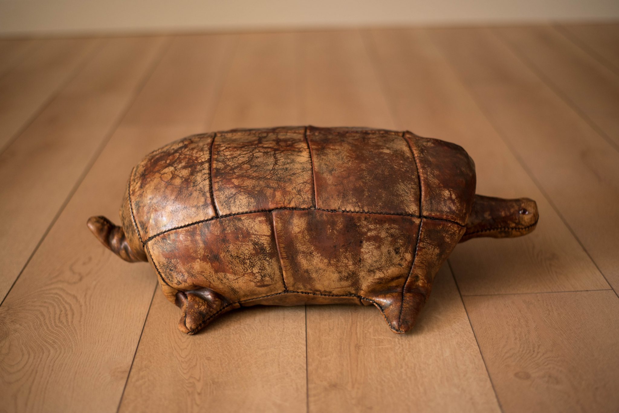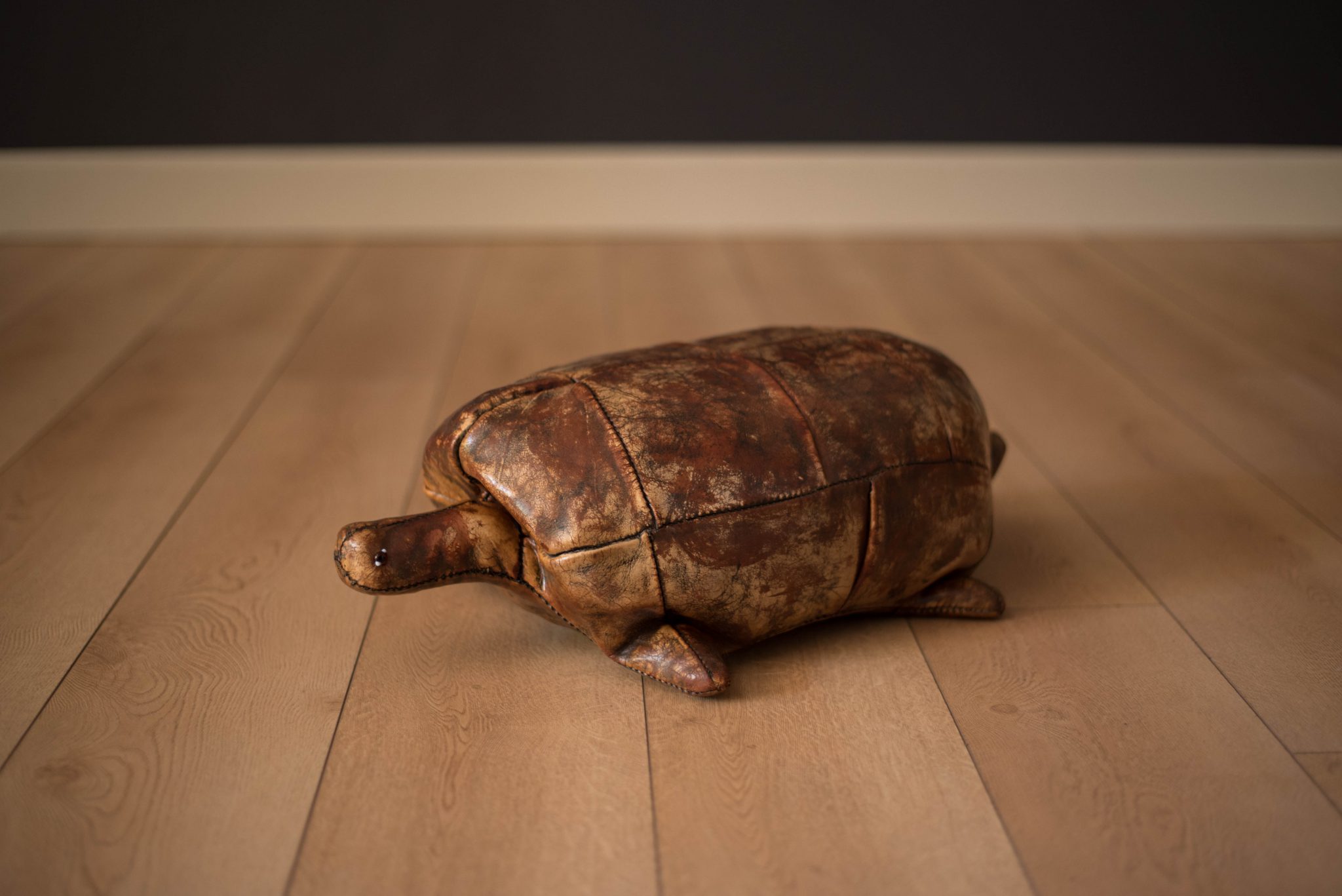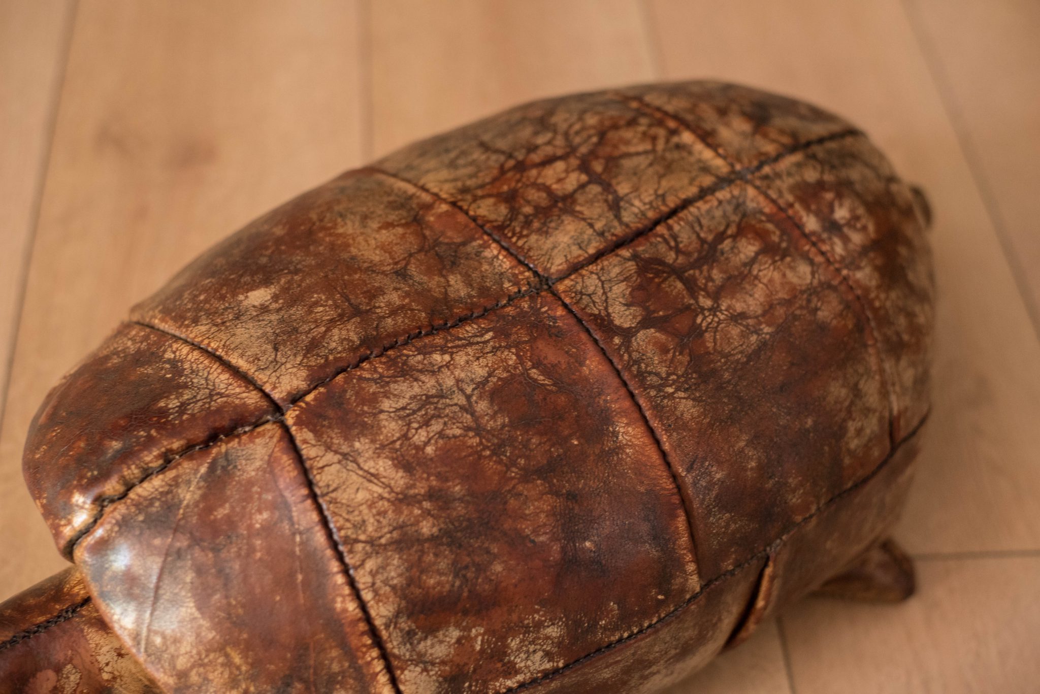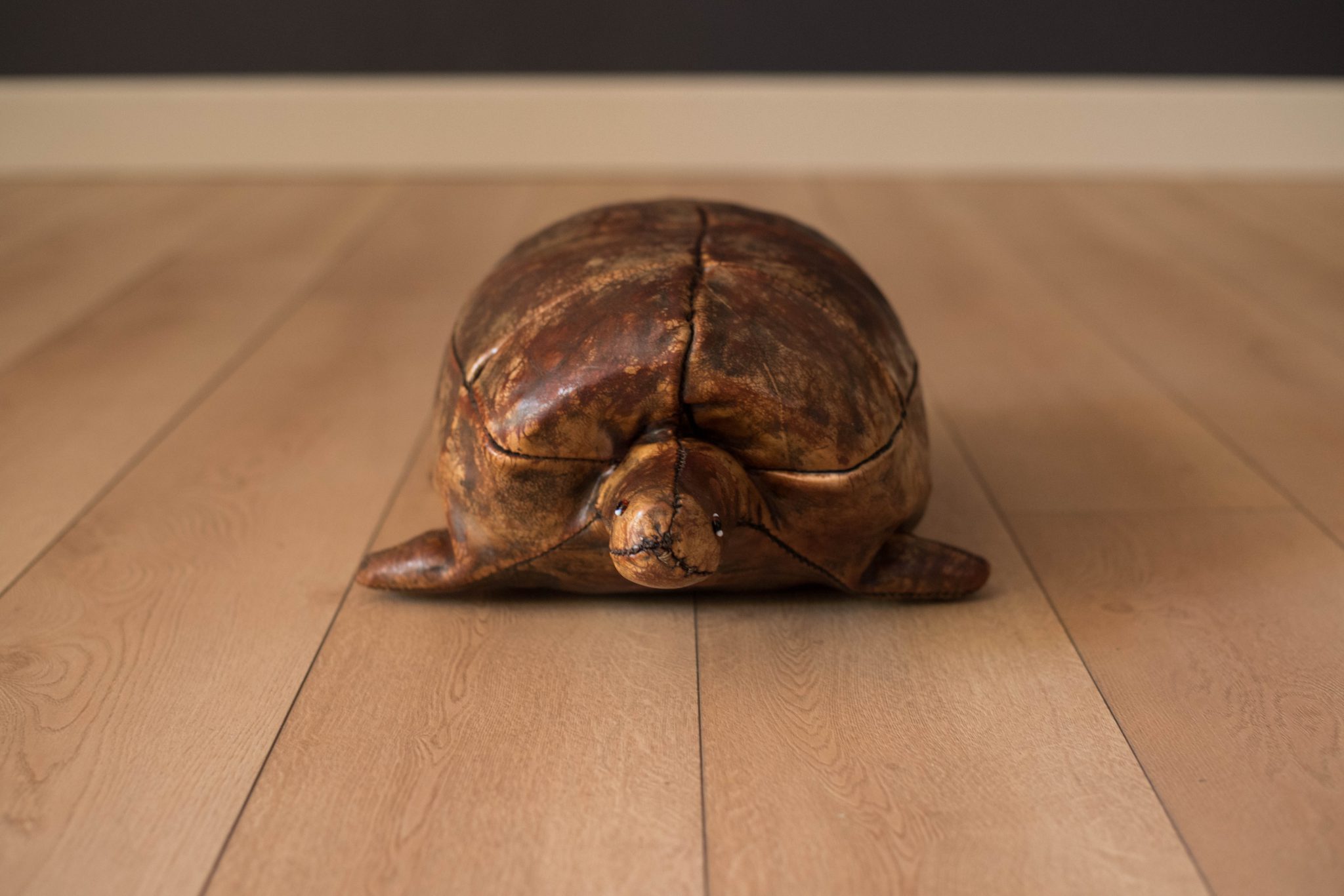 Mid-Century Modern original leather turtle designed by Dimitri Omersa for Abercrombie & Fitch, circa 1960s. This unique piece is handstitched with leather and glass eyes. Displays an aged leather patina and is branded ‘Made in England’.