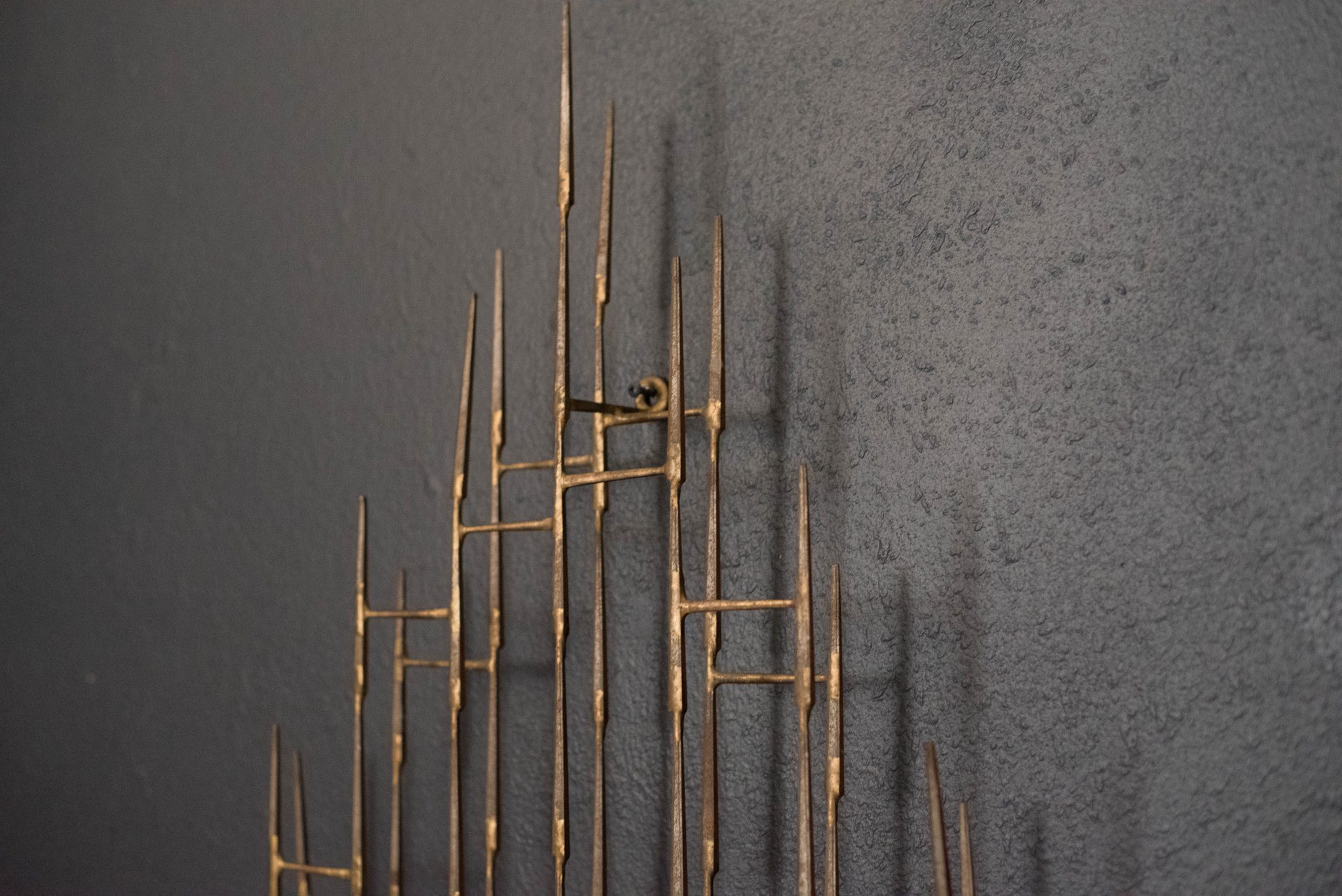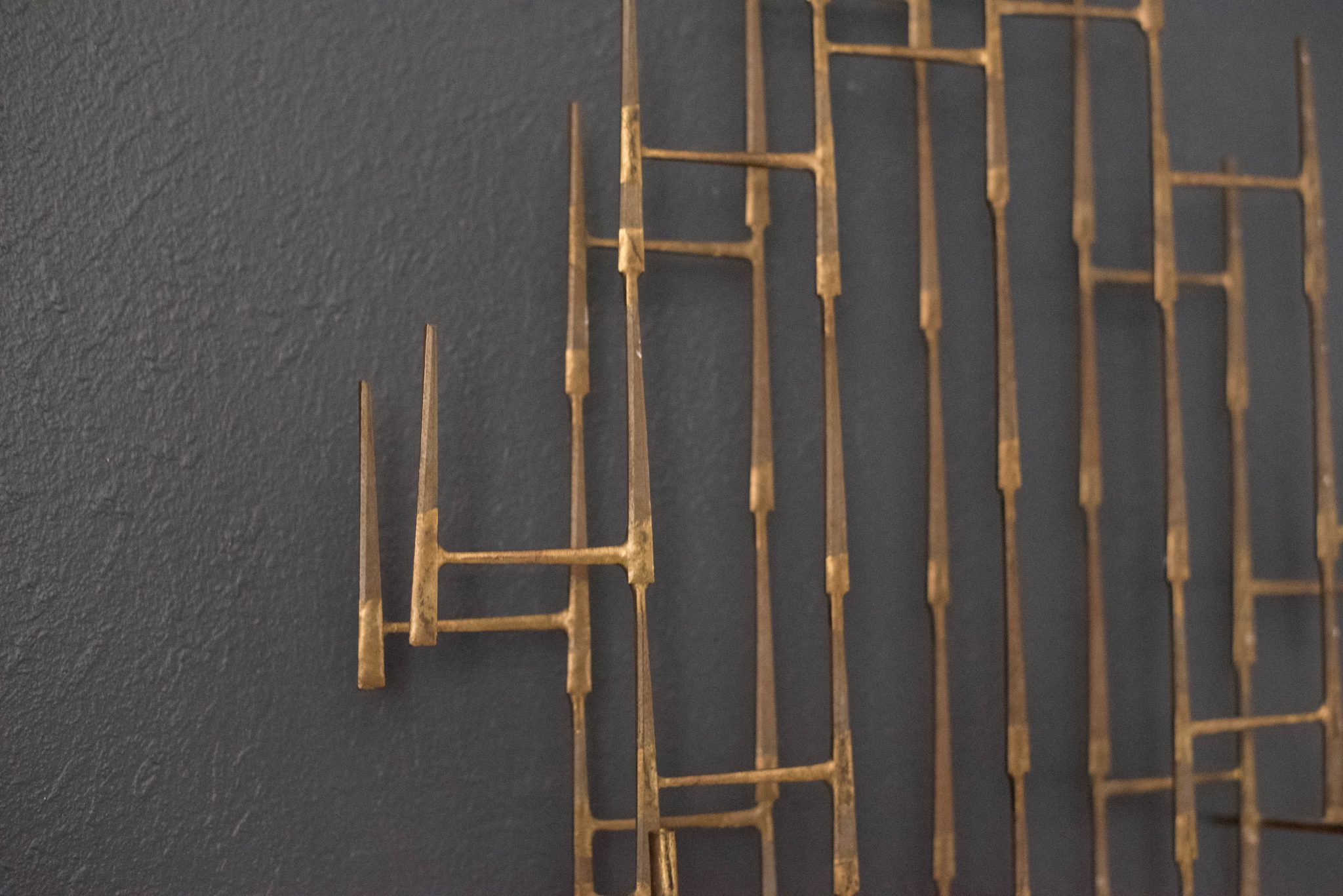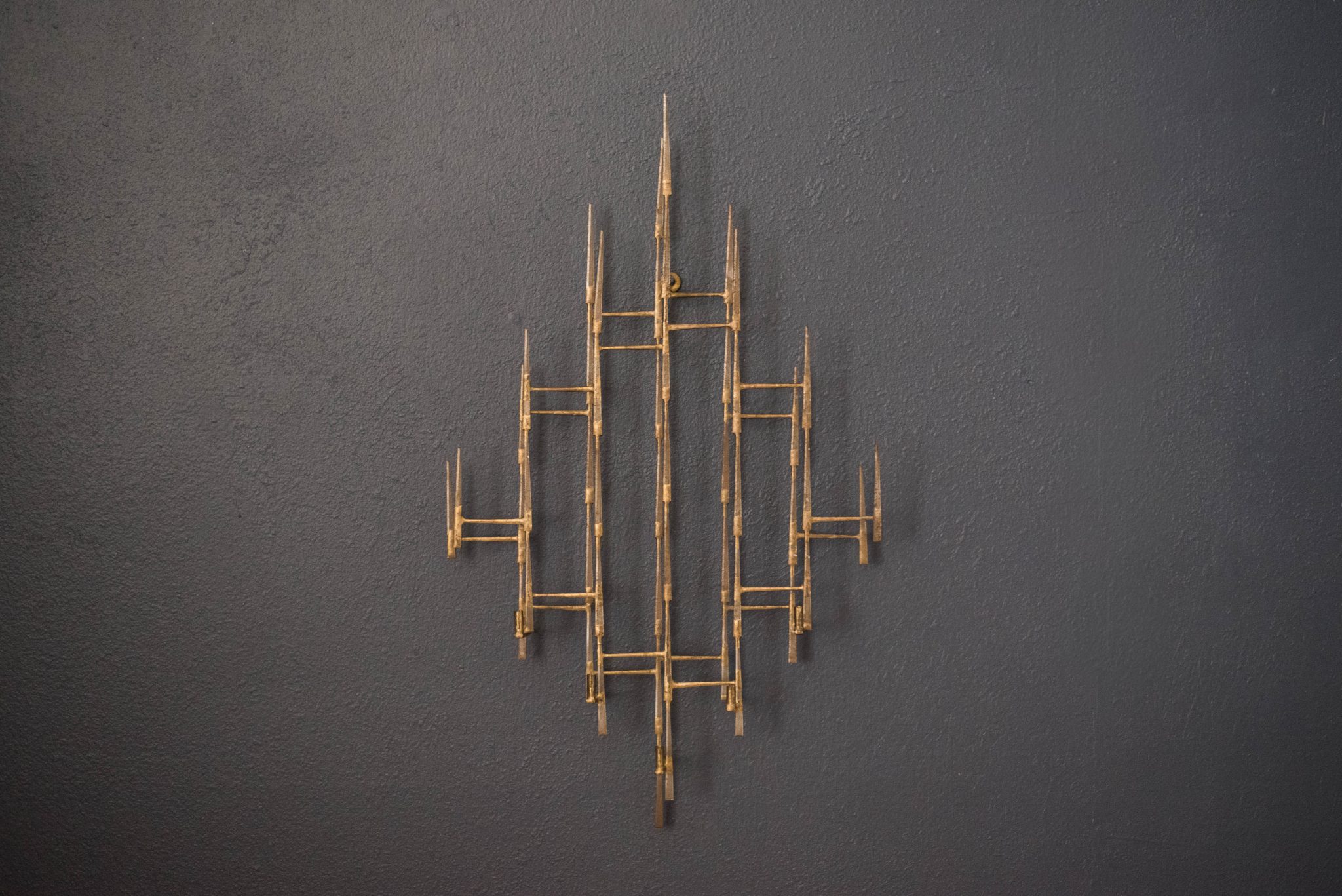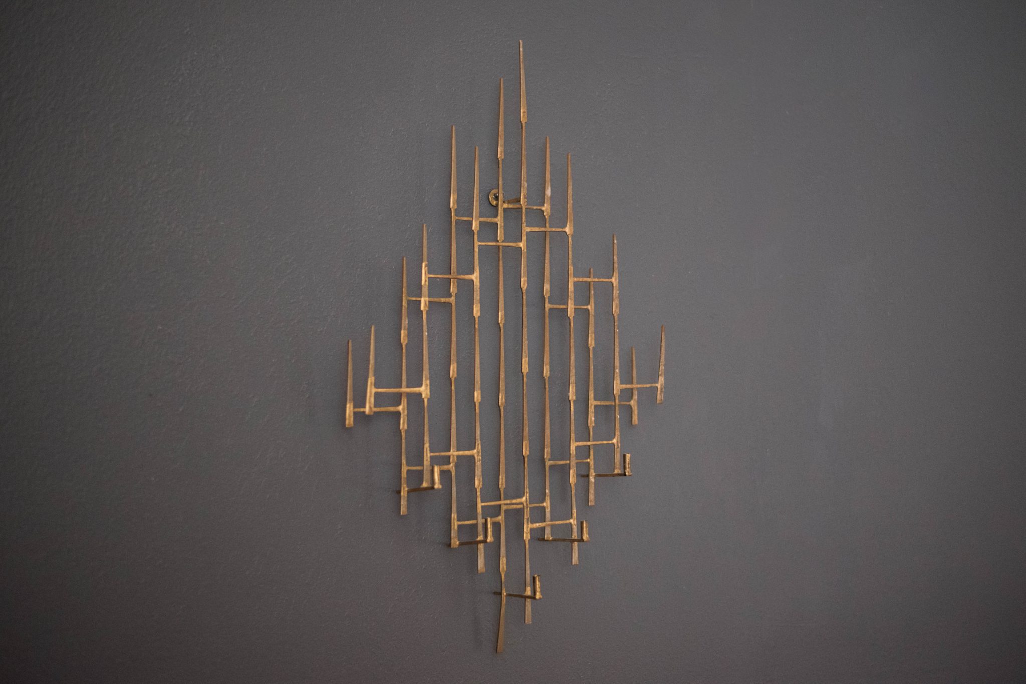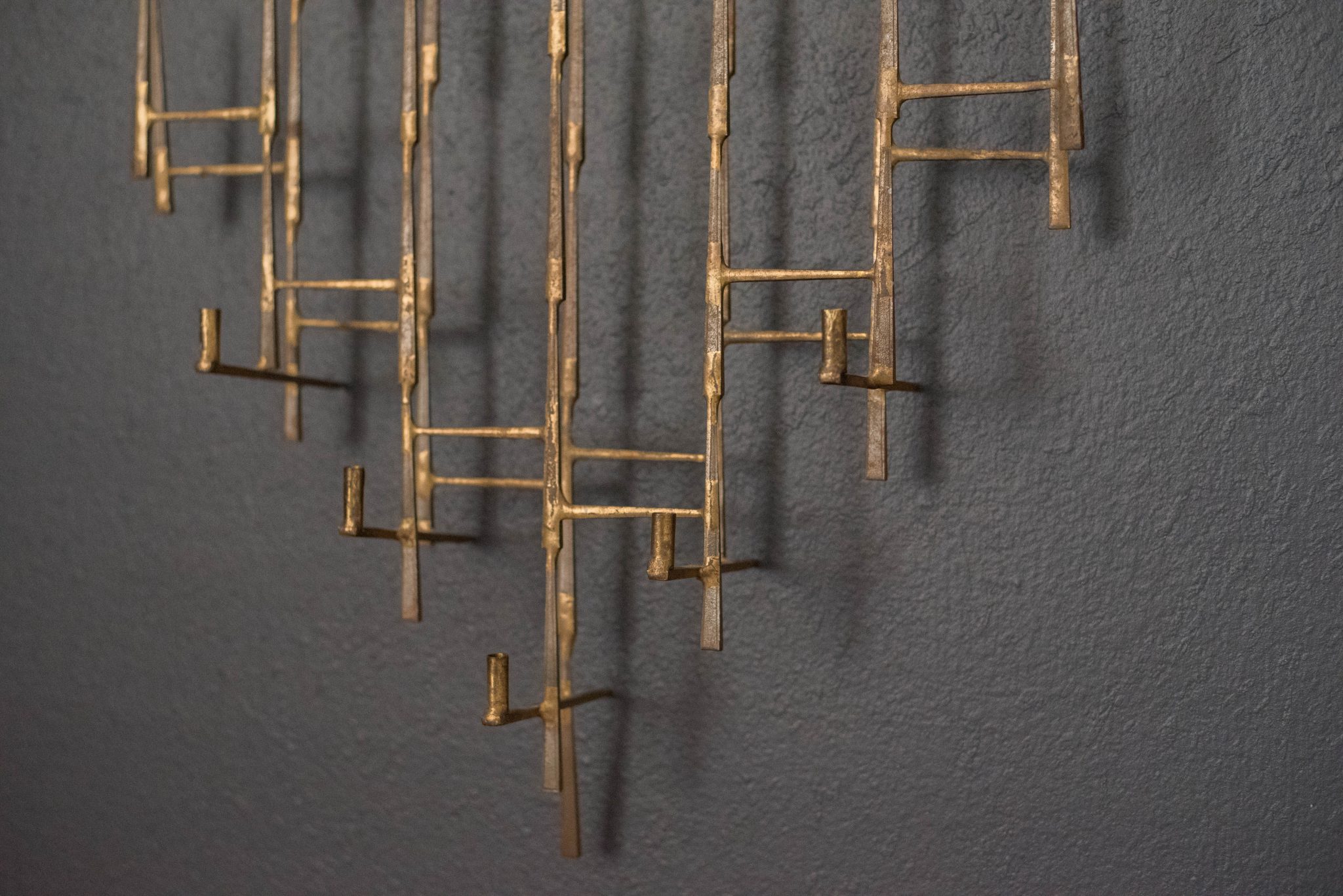 Mid-Century Modern abstract wall sculpture in mixed metals circa 1960s. This decorative piece includes five candle holders fit for 1/4″ taper candles.