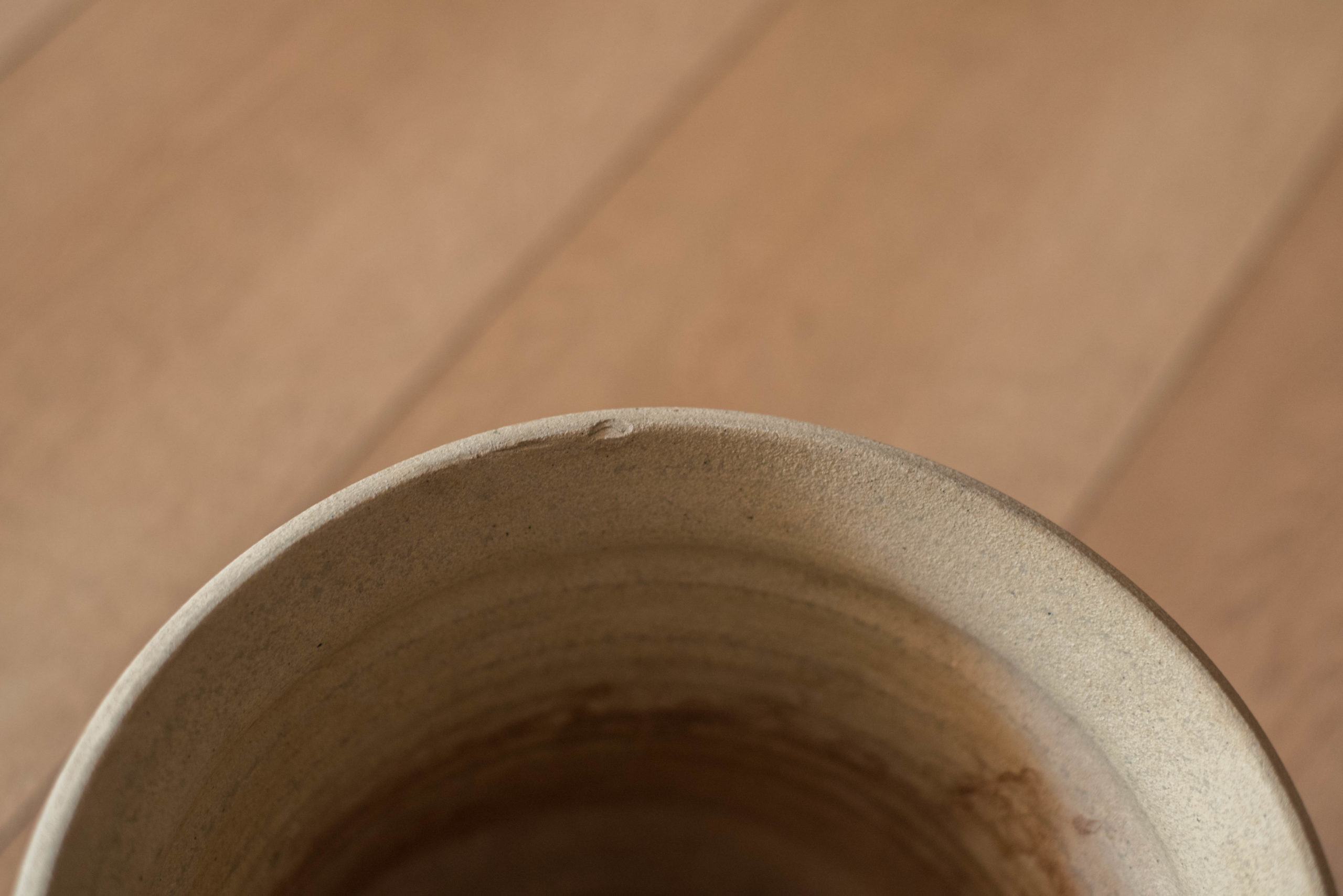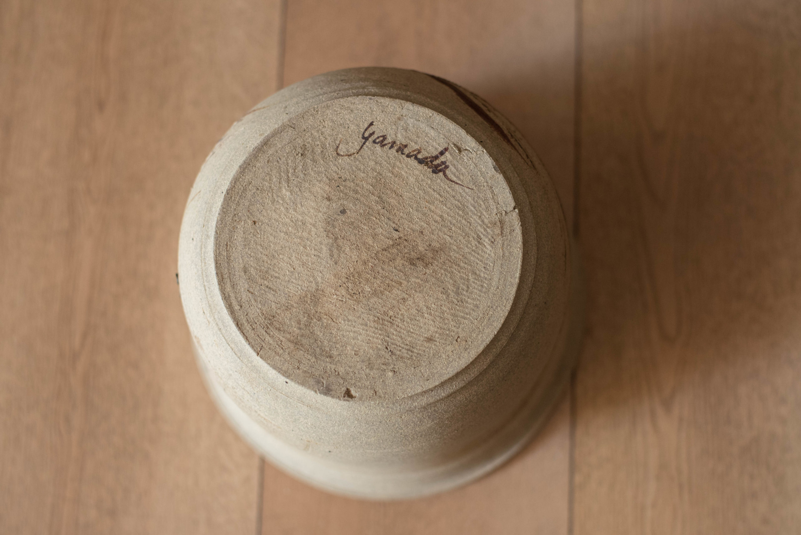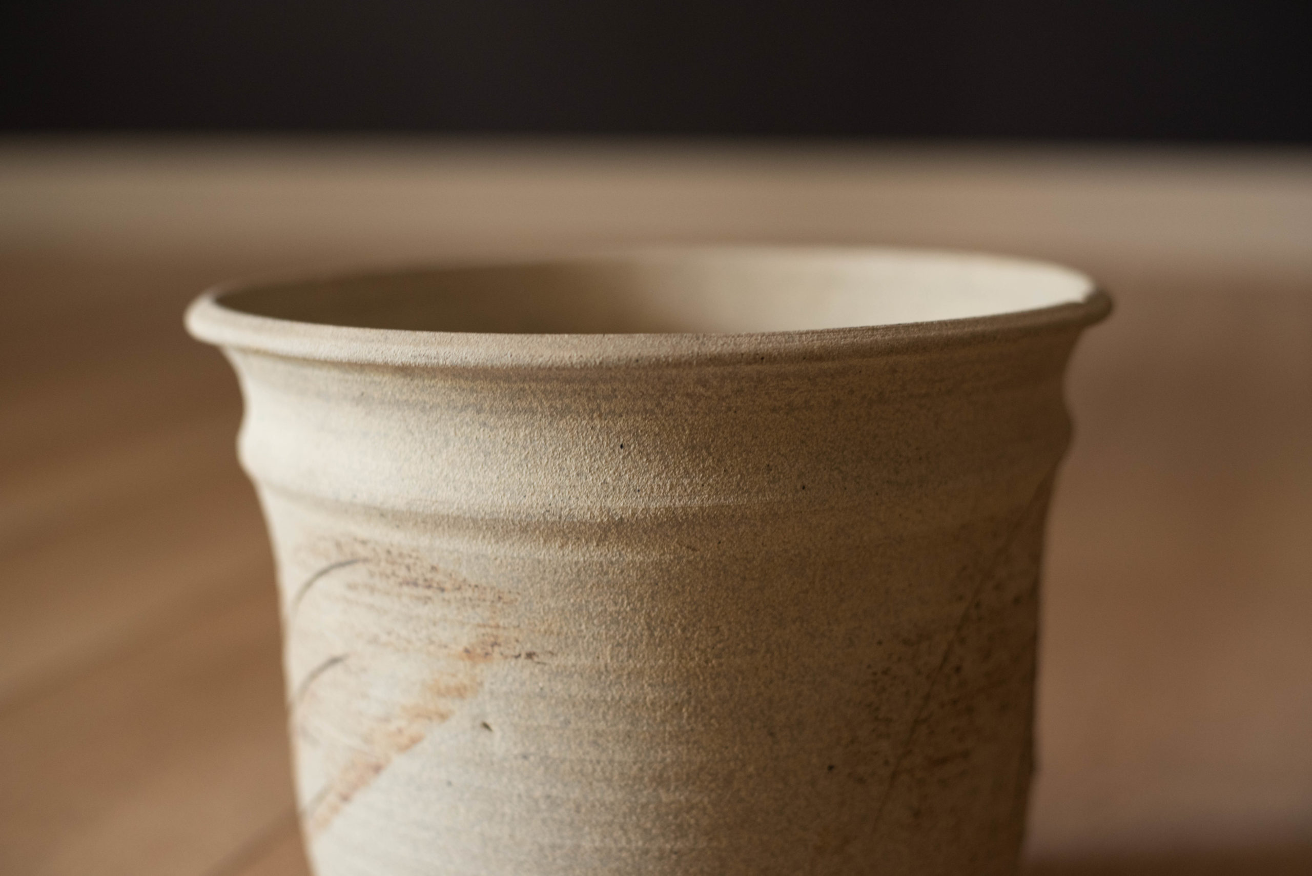 Mid-Century Modern ceramic planter pot circa 1970s. This high fired stoneware vessel displays a two-tone natural matte finish featuring an abstract textured clay relief. Recommended for indoor or outdoor use. Signed Yamada on the base.