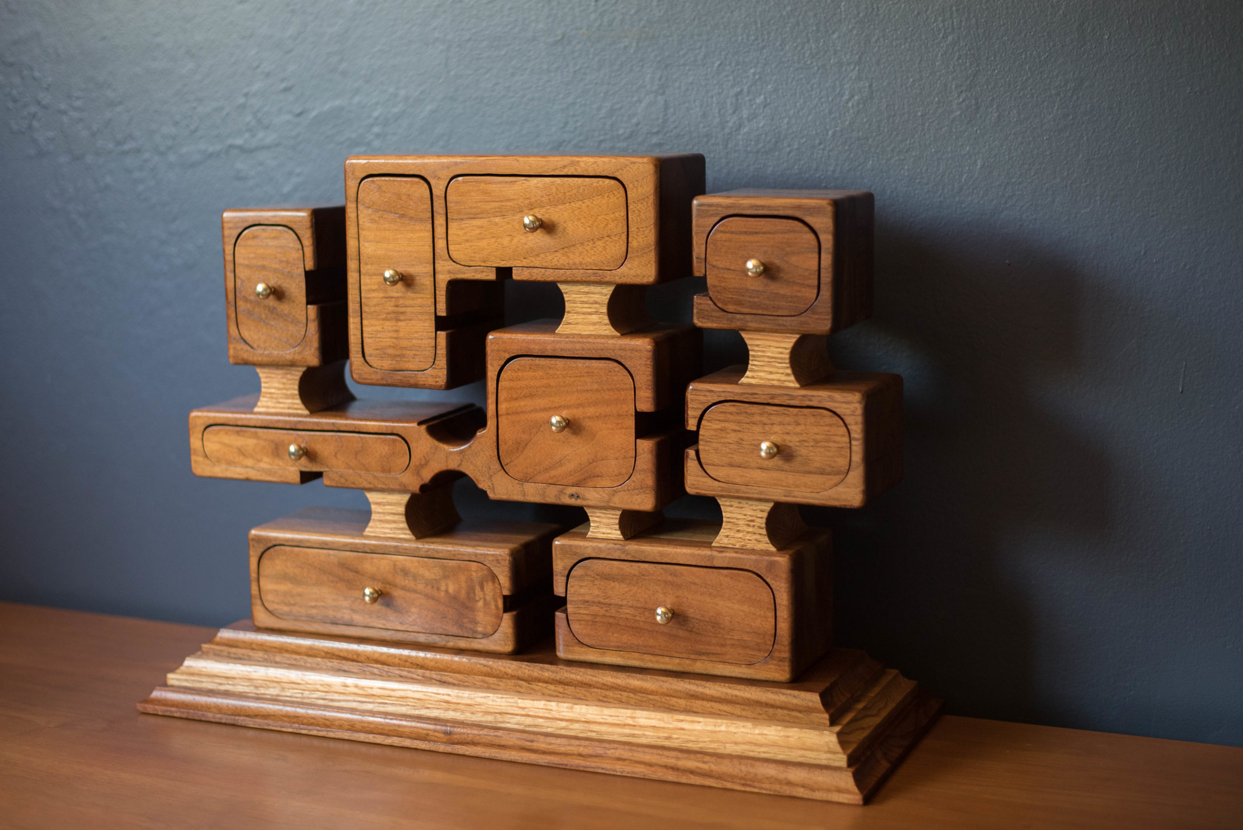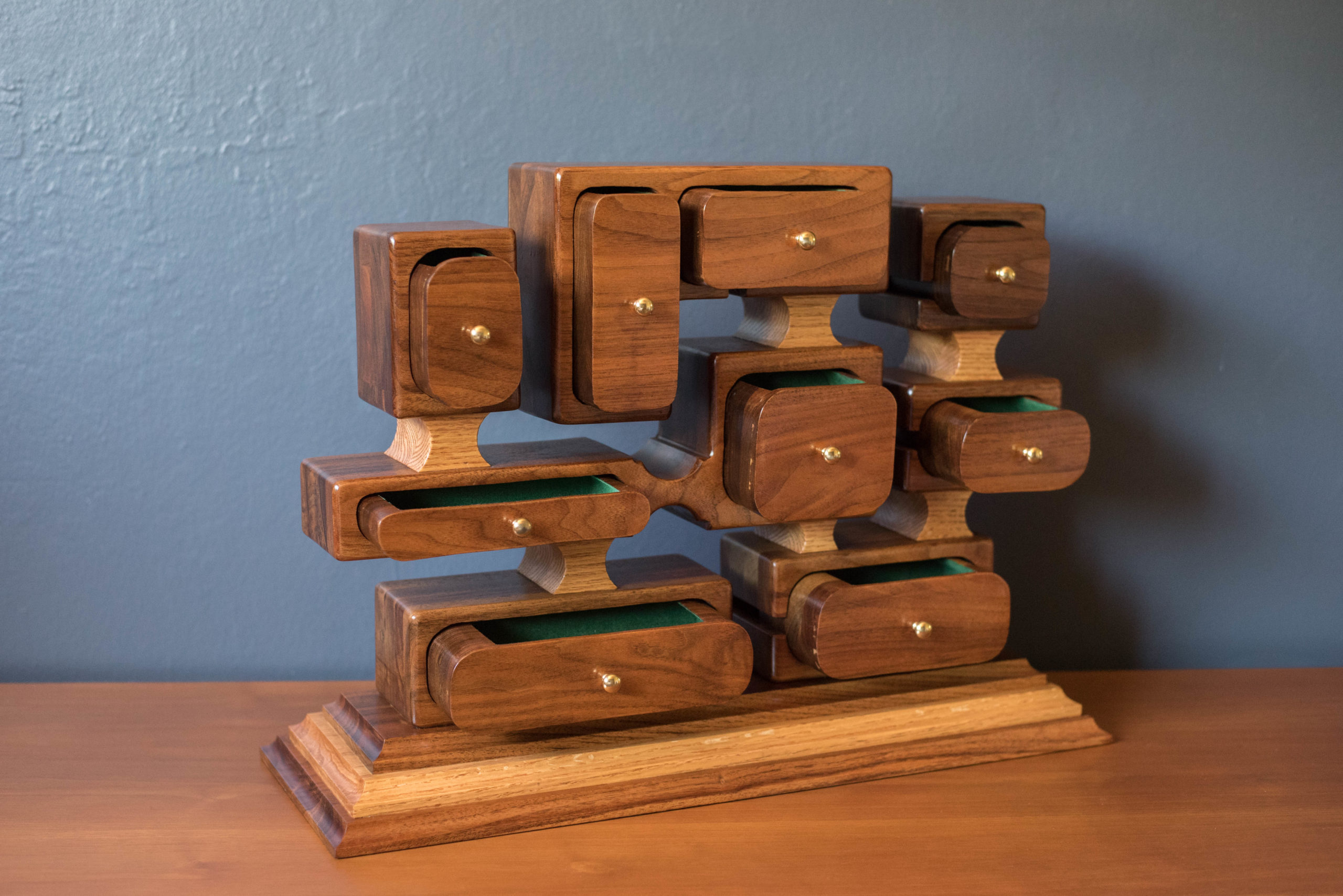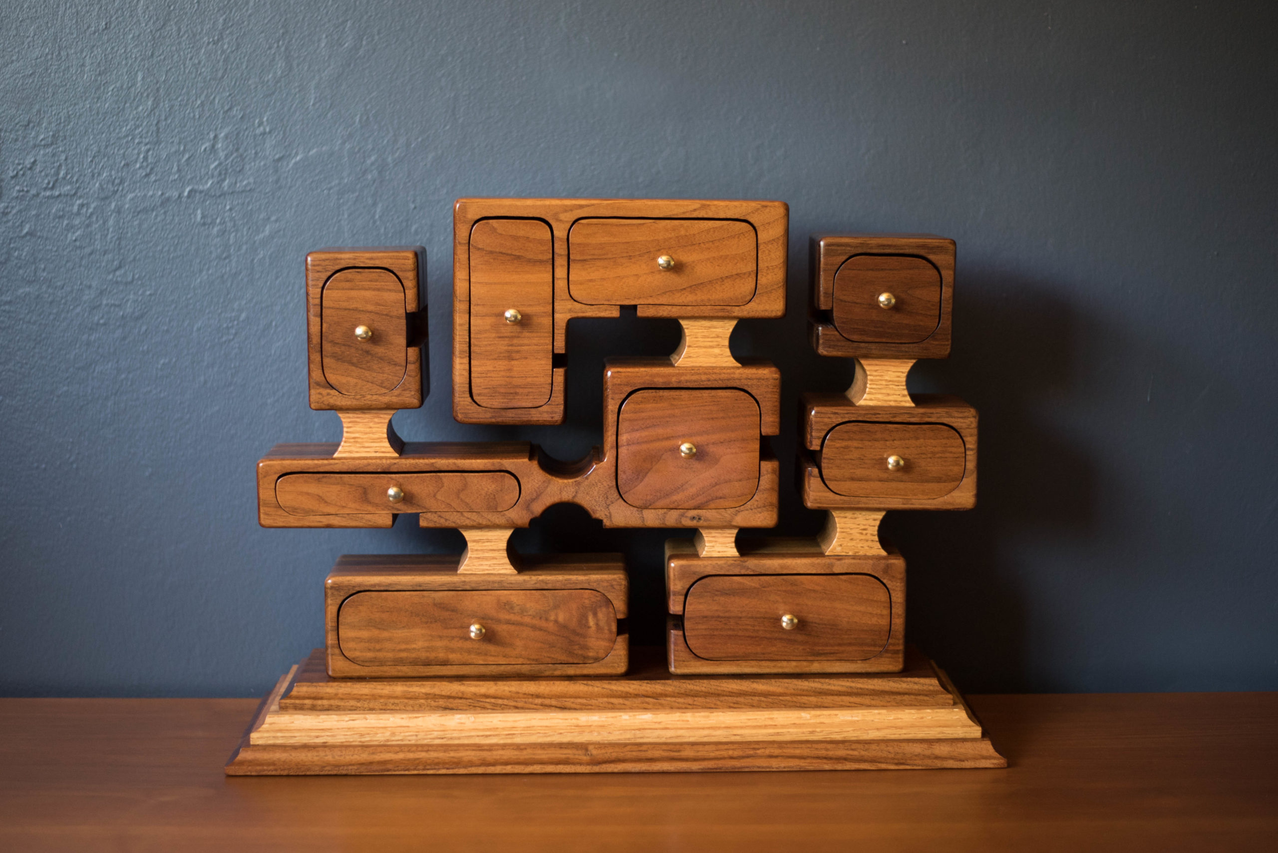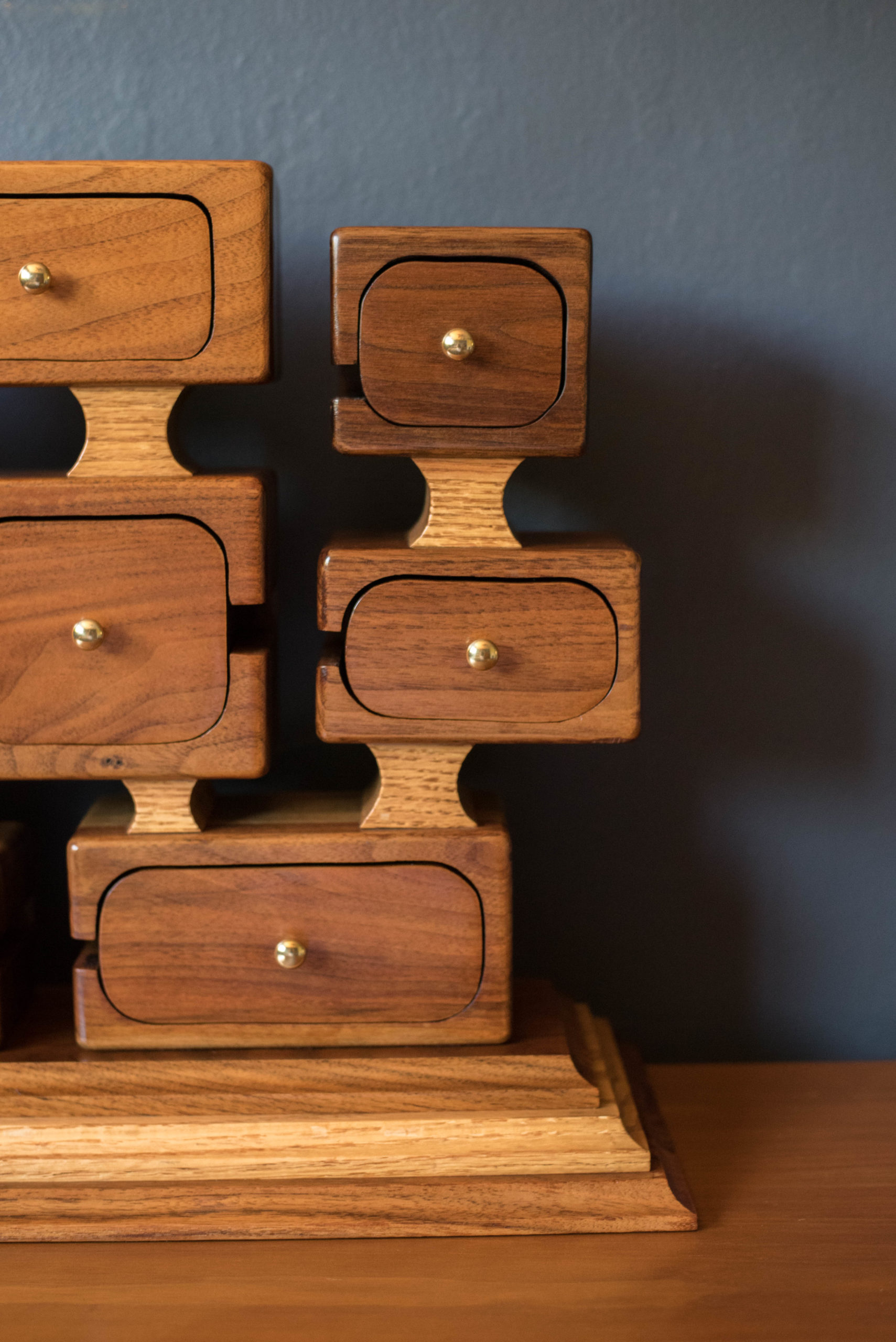 Mid century modern studio organizing jewelry box circa 1970’s. This unique piece is handcrafted in solid walnut and oak. Equipped with nine sculptural compartment boxes in various shapes and sizes accented with brass pulls and includes interior felt lined drawers. The perfect decorative storage piece for a bedroom vanity or dresser.