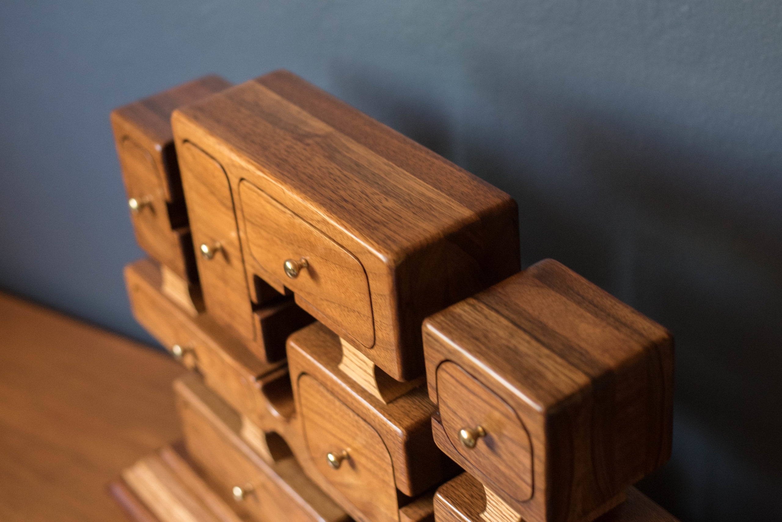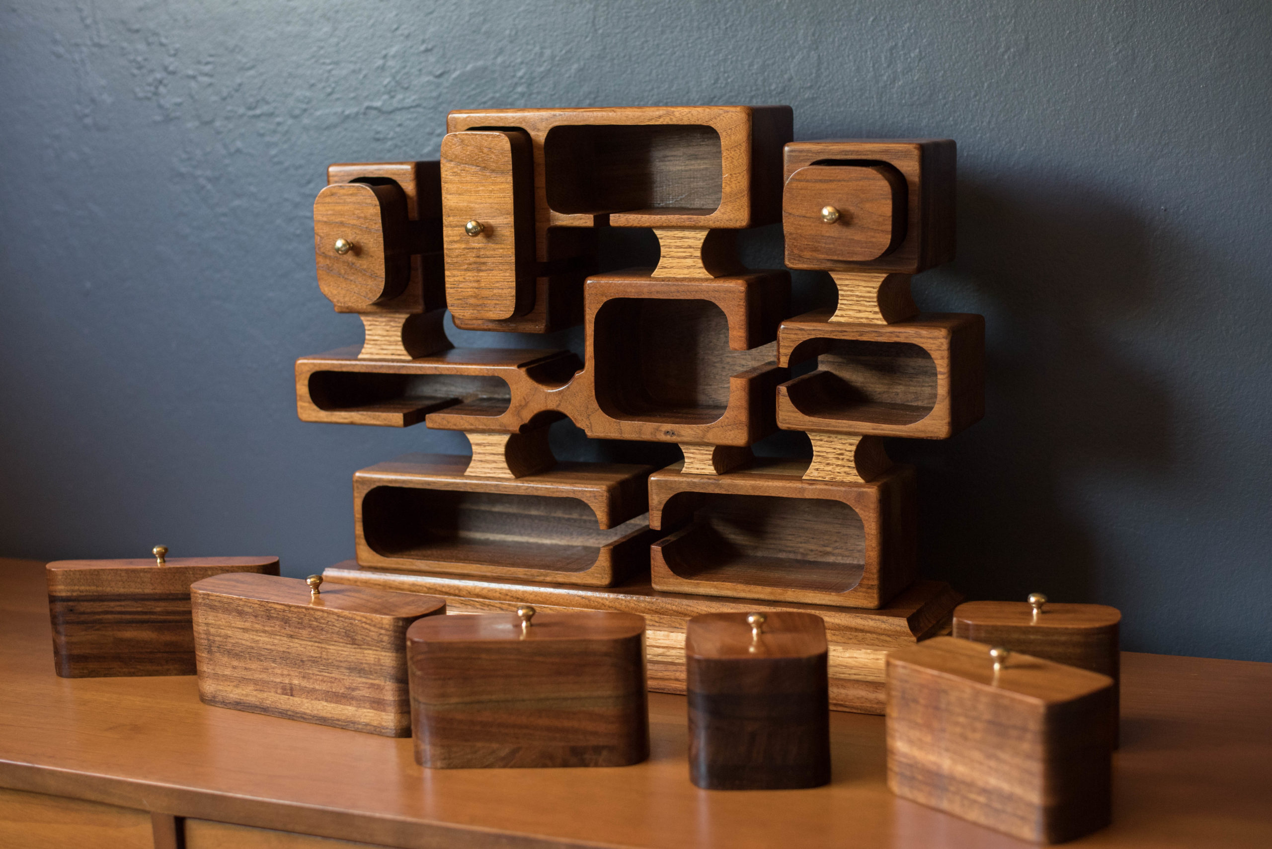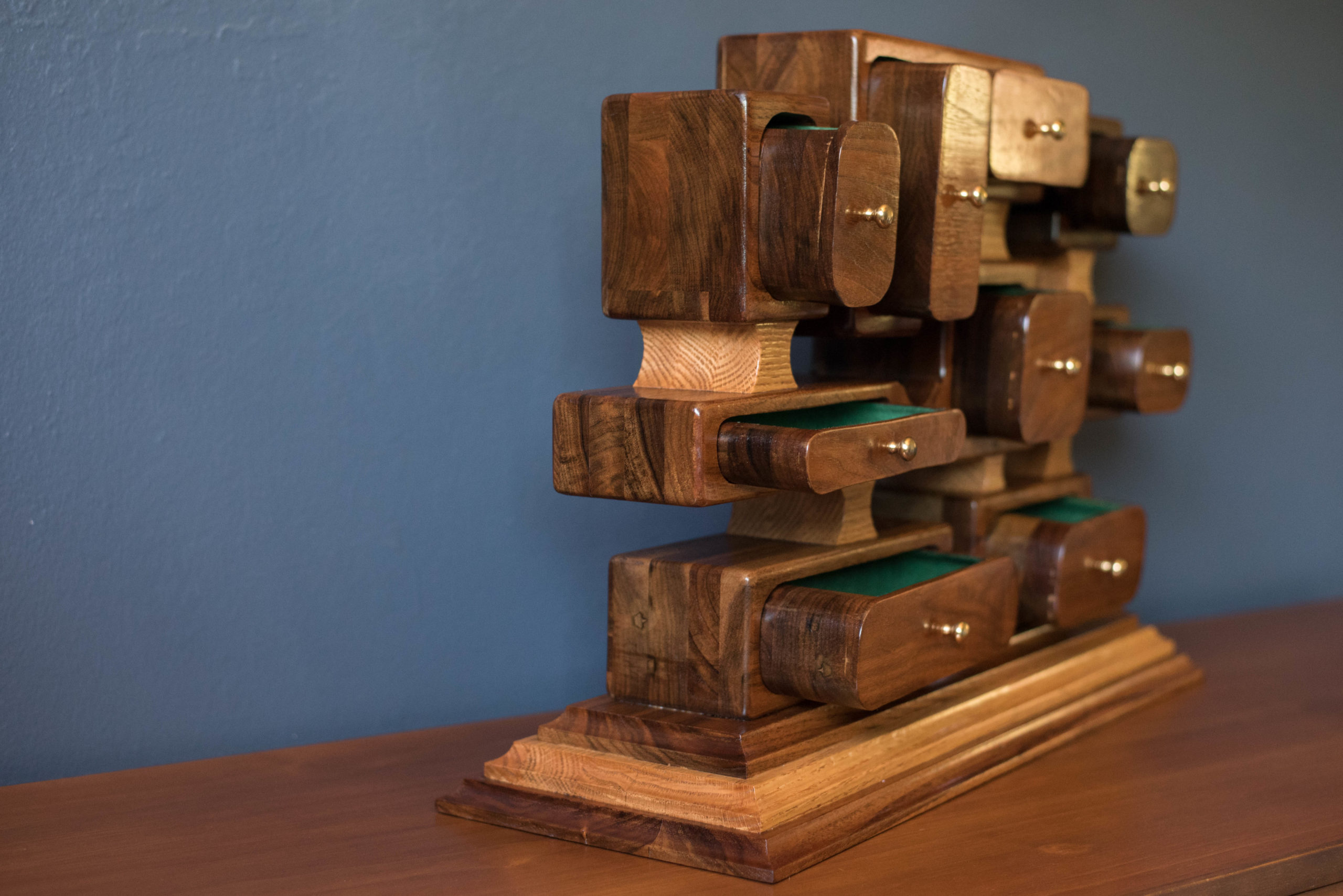 Mid century modern studio organizing jewelry box circa 1970’s. This unique piece is handcrafted in solid walnut and oak. Equipped with nine sculptural compartment boxes in various shapes and sizes accented with brass pulls and includes interior felt lined drawers. The perfect decorative storage piece for a bedroom vanity or dresser.