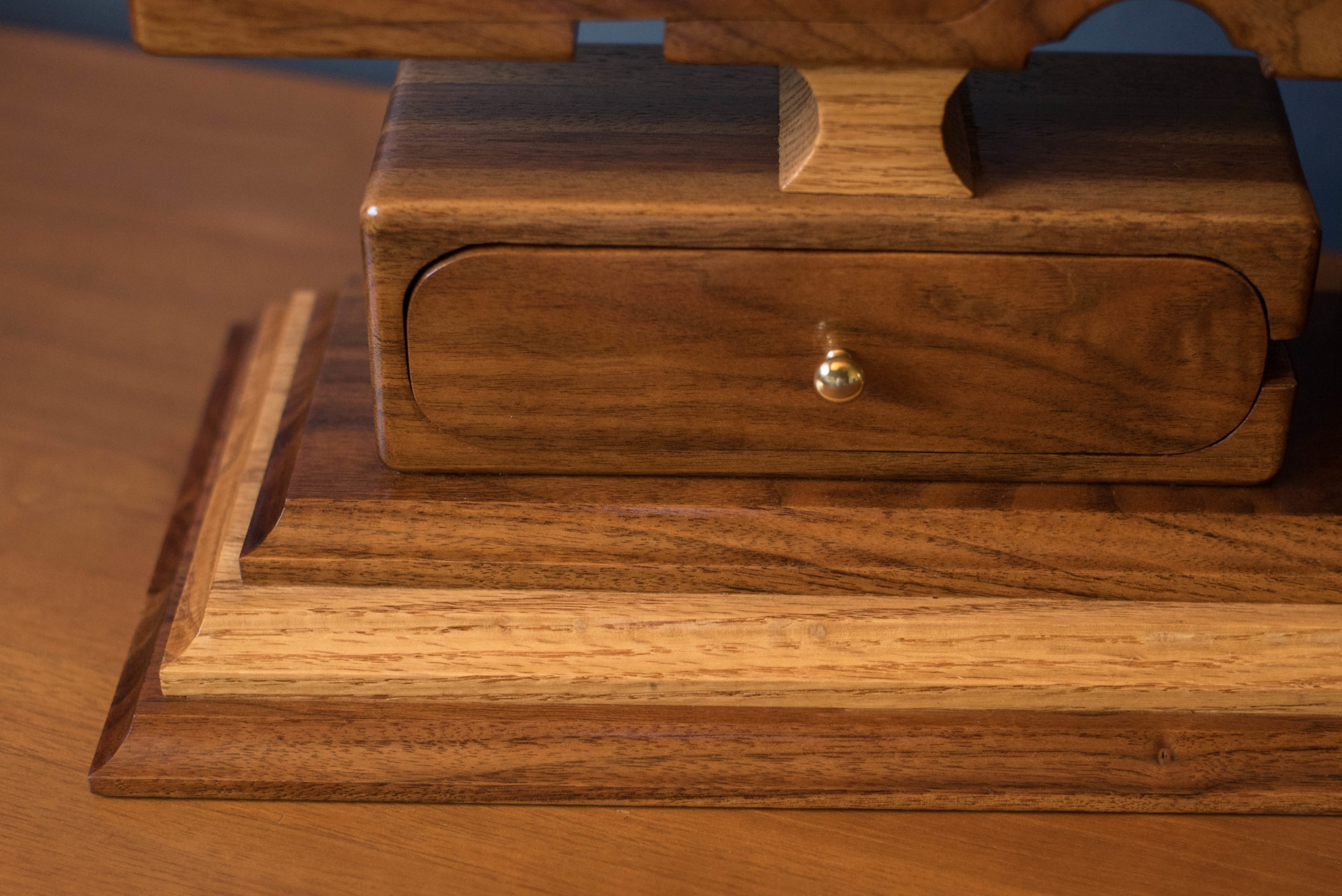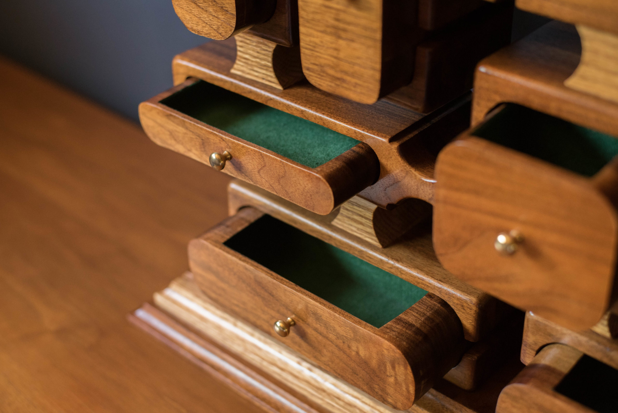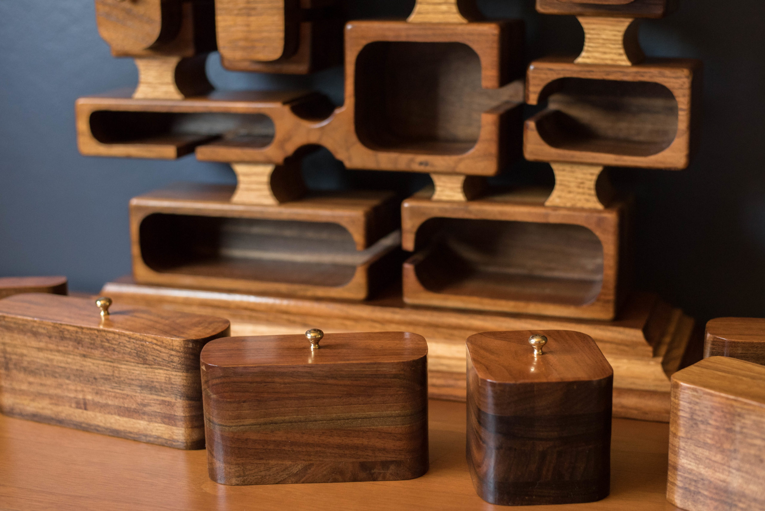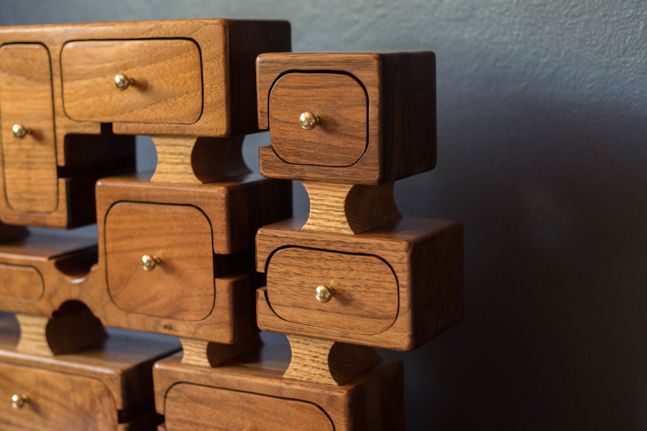 Mid century modern studio organizing jewelry box circa 1970’s. This unique piece is handcrafted in solid walnut and oak. Equipped with nine sculptural compartment boxes in various shapes and sizes accented with brass pulls and includes interior felt lined drawers. The perfect decorative storage piece for a bedroom vanity or dresser.