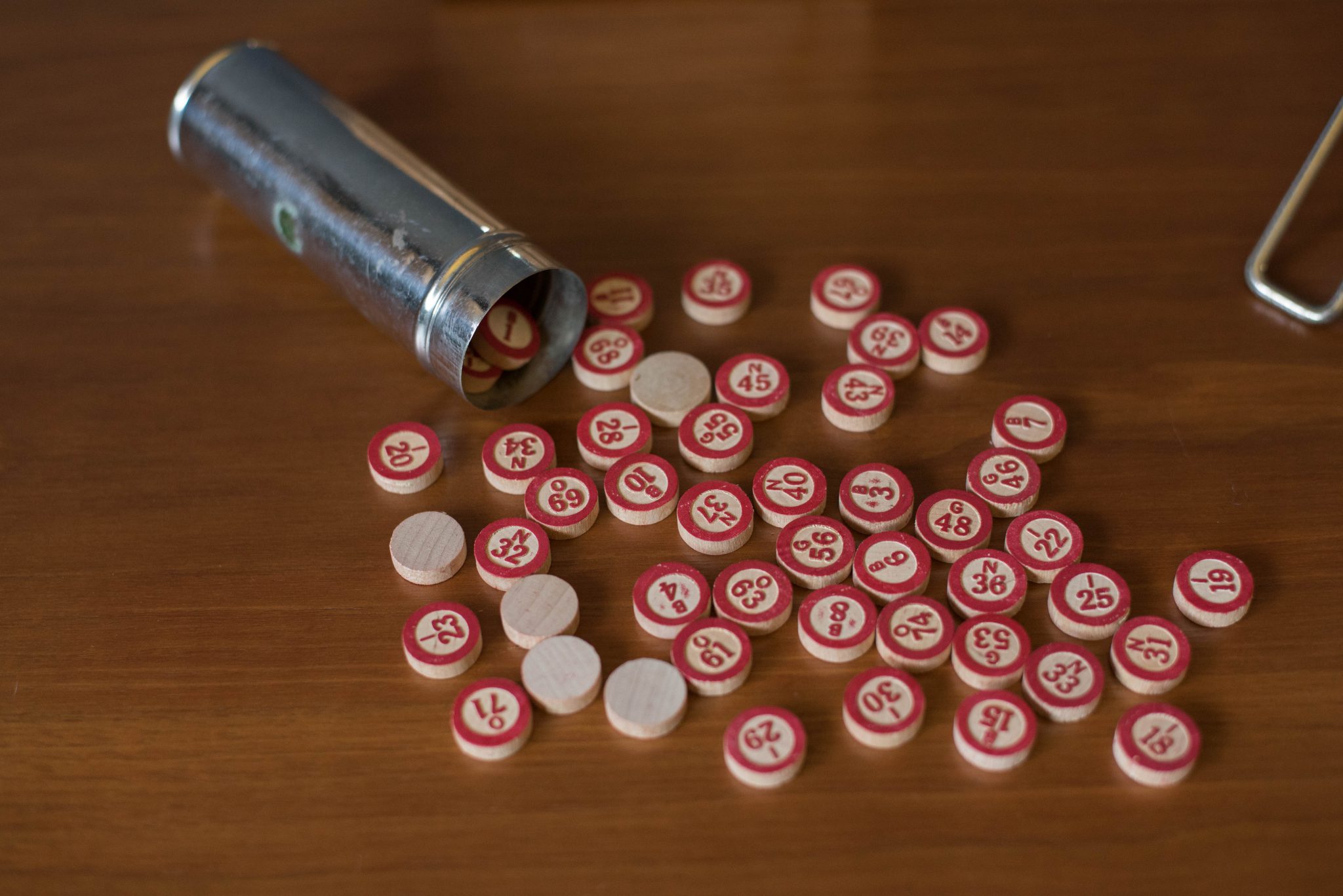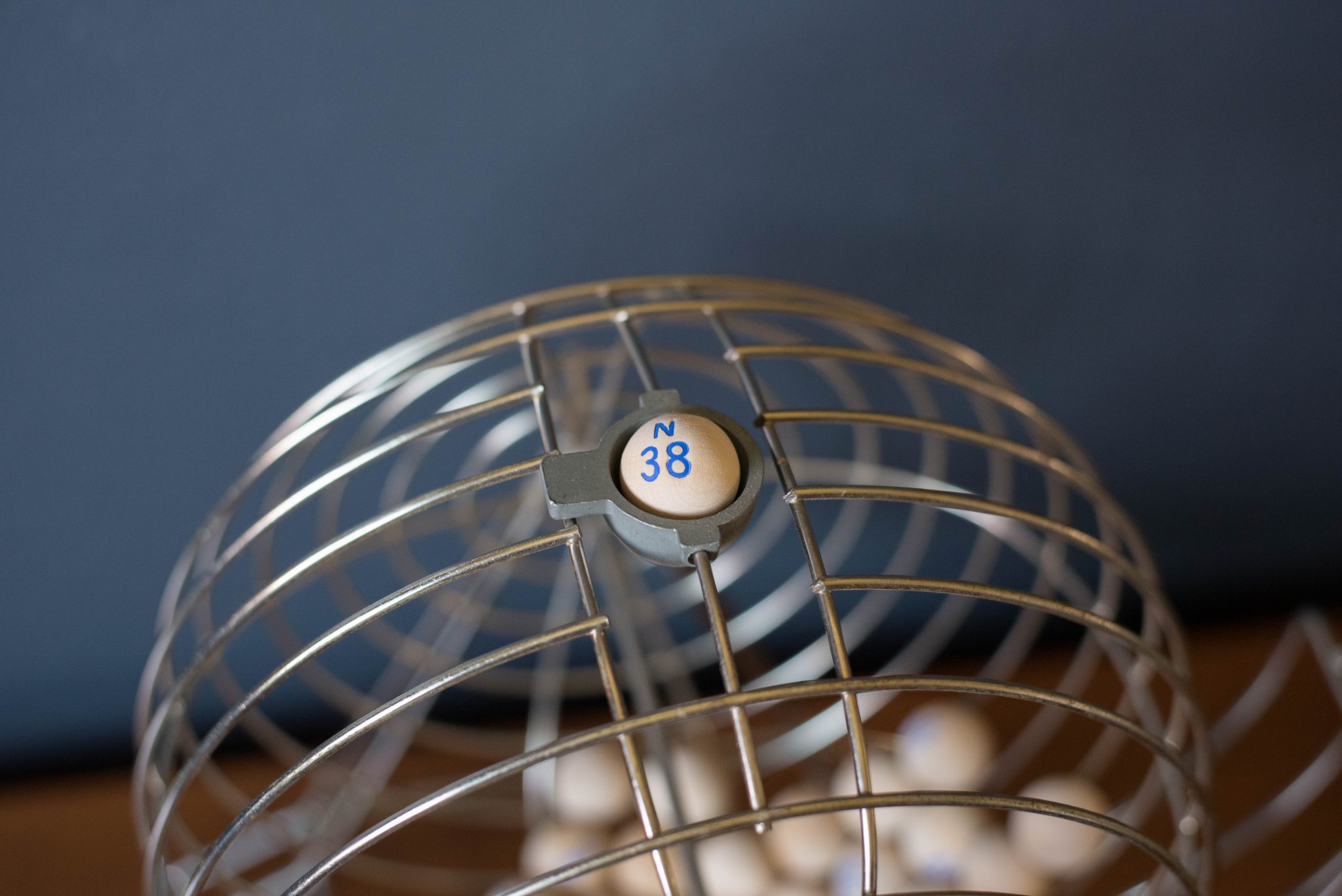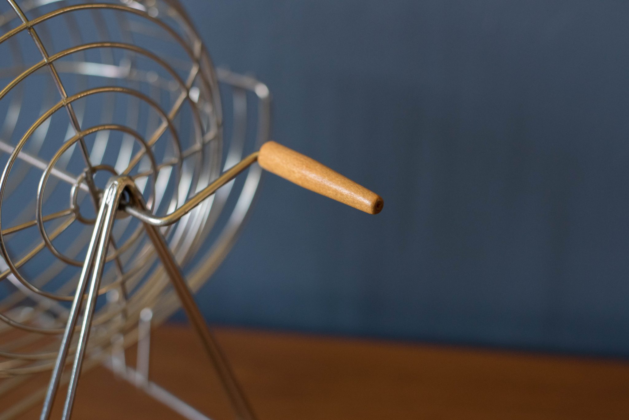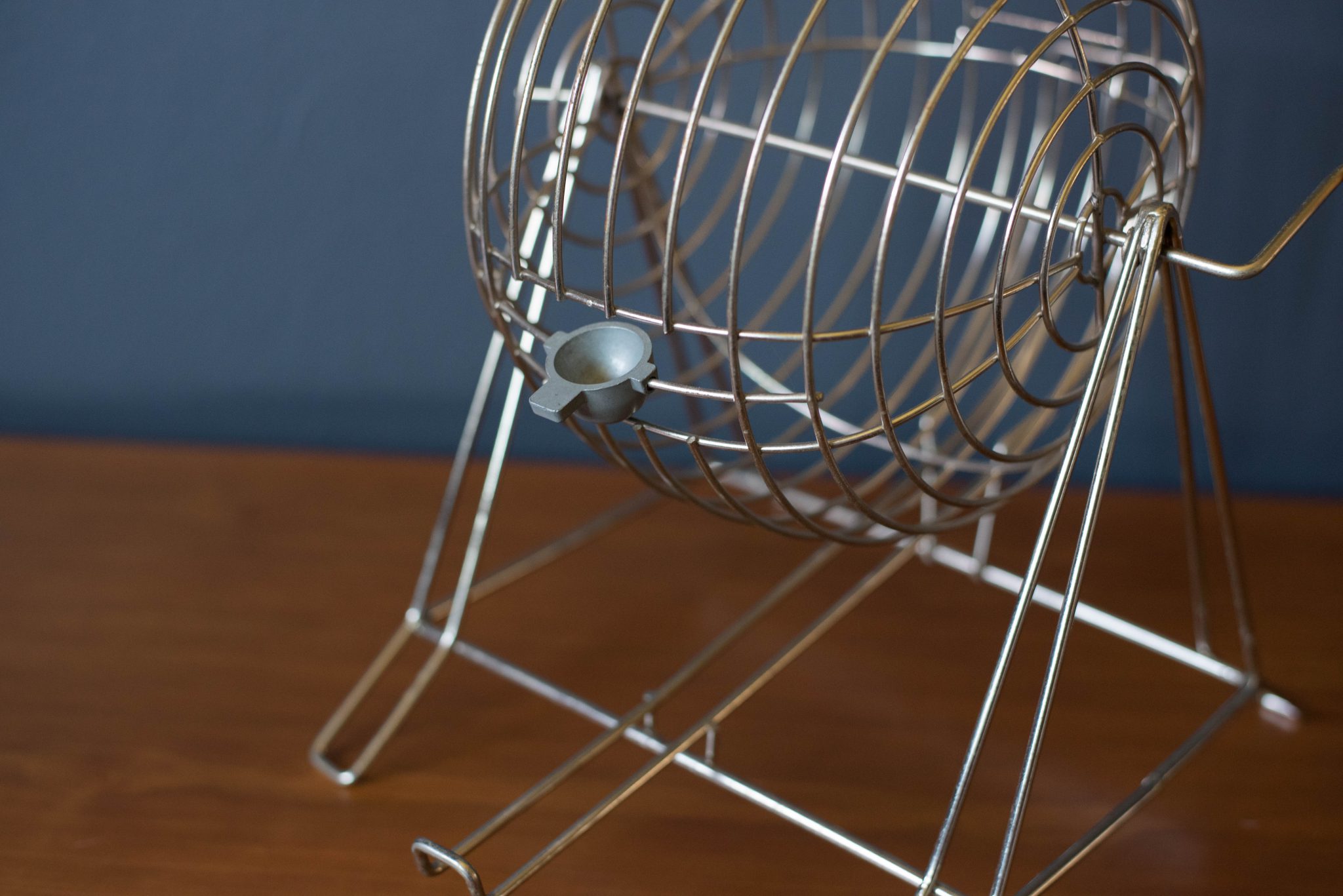 Vintage original Bingo game set, circa 1950s. This set includes the metal cage with rotating wood handle, wooden token red embossed markers, and wooden numbered balls stamped in blue. Great accessory for a game room. The set does not include bingo board or cards.