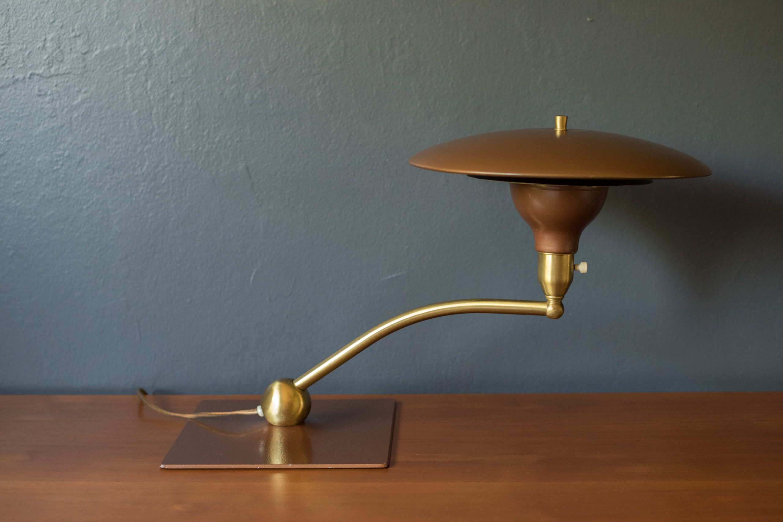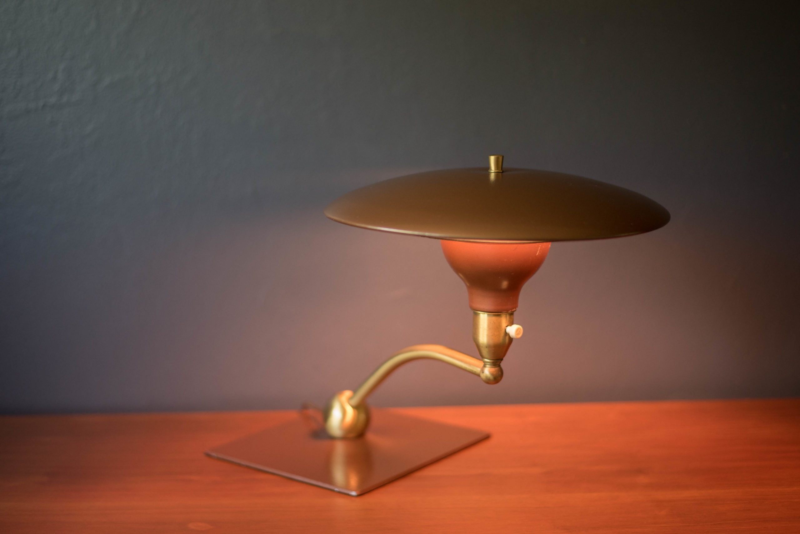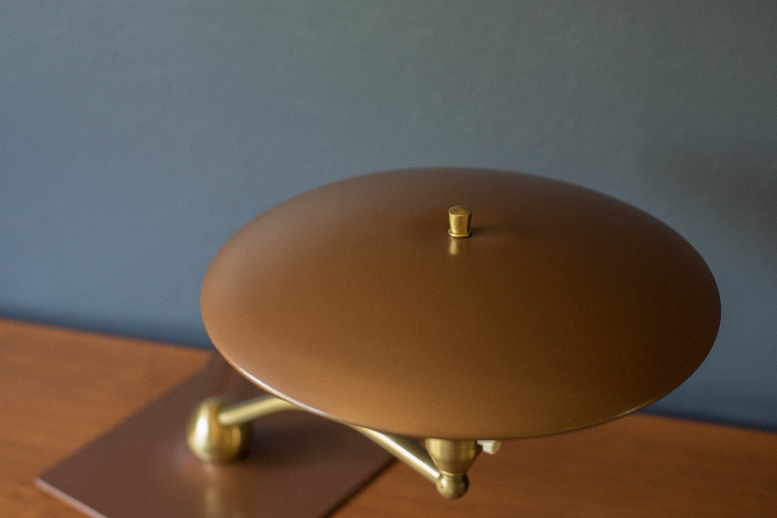 Vintage sight light desk lamp manufactured by M.G. Wheeler Company, circa 1960’s. Features a rotating swivel arm and supporting weighted brass base. Perfect to use as an office desk lamp or reading light. This unique piece pairs well with art deco or mid century modern decor. In good condition with wear such as patina and scuffs on the finish. Light dents on the metal saucer shade.