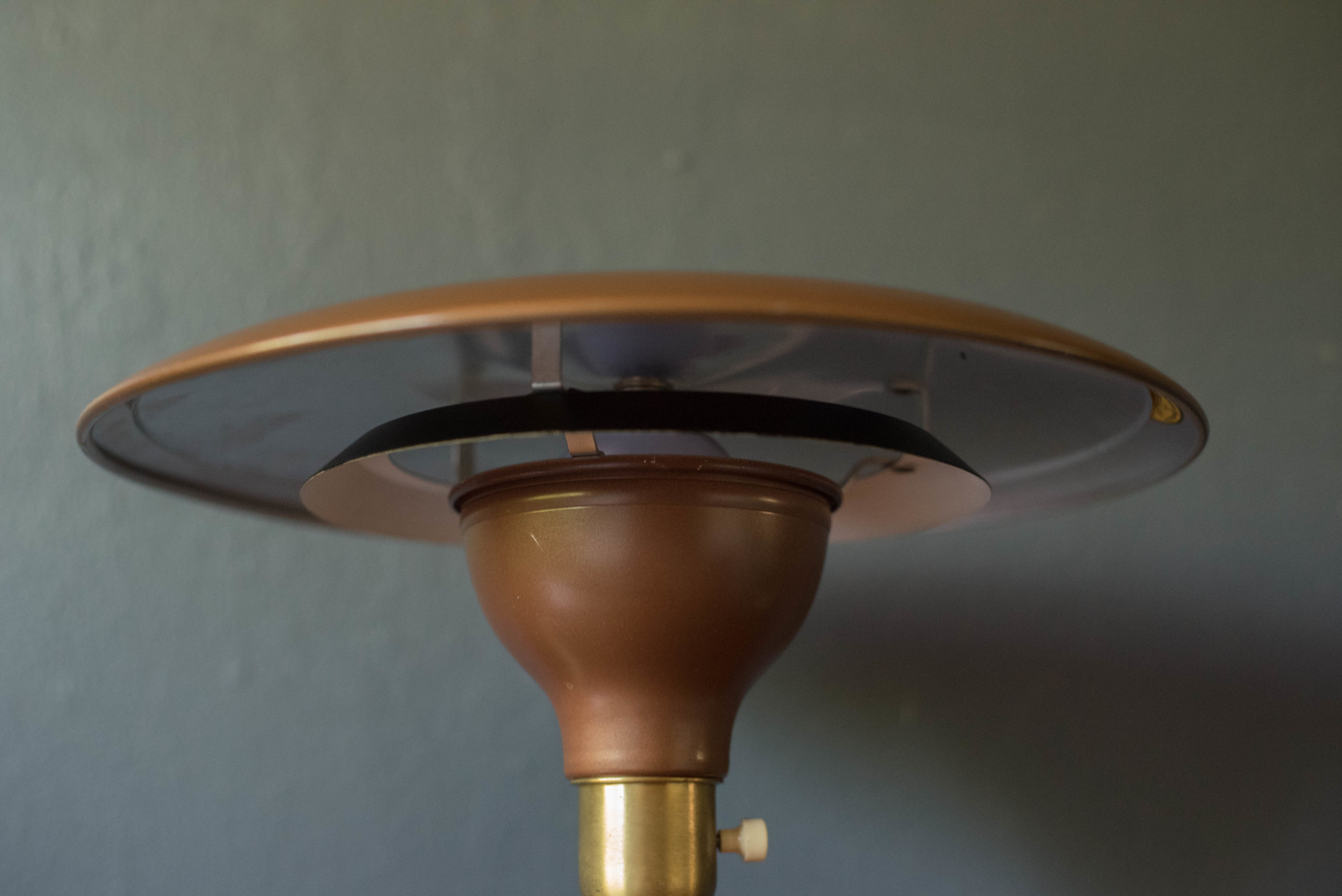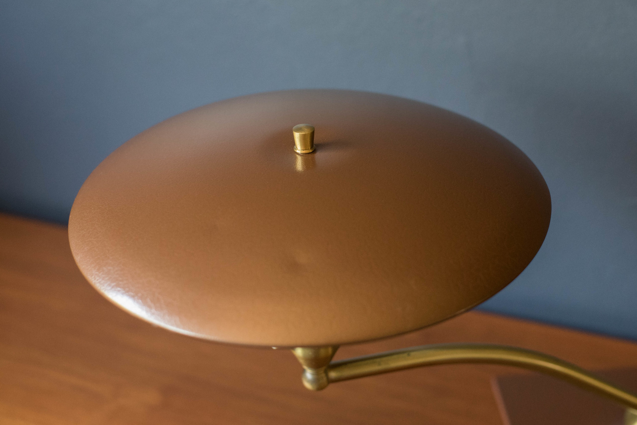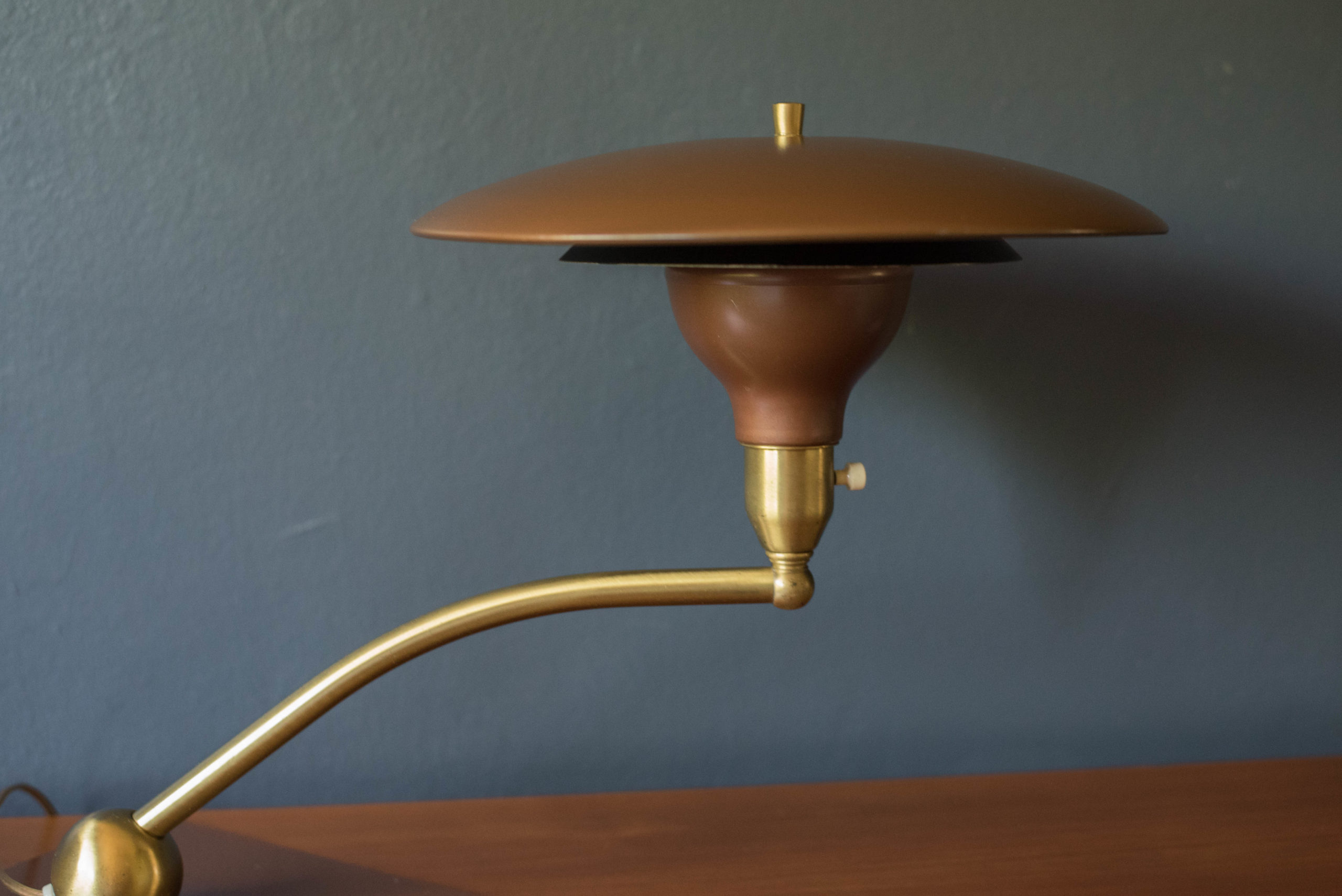 Vintage sight light desk lamp manufactured by M.G. Wheeler Company, circa 1960’s. Features a rotating swivel arm and supporting weighted brass base. Perfect to use as an office desk lamp or reading light. This unique piece pairs well with art deco or mid century modern decor. In good condition with wear such as patina and scuffs on the finish. Light dents on the metal saucer shade.