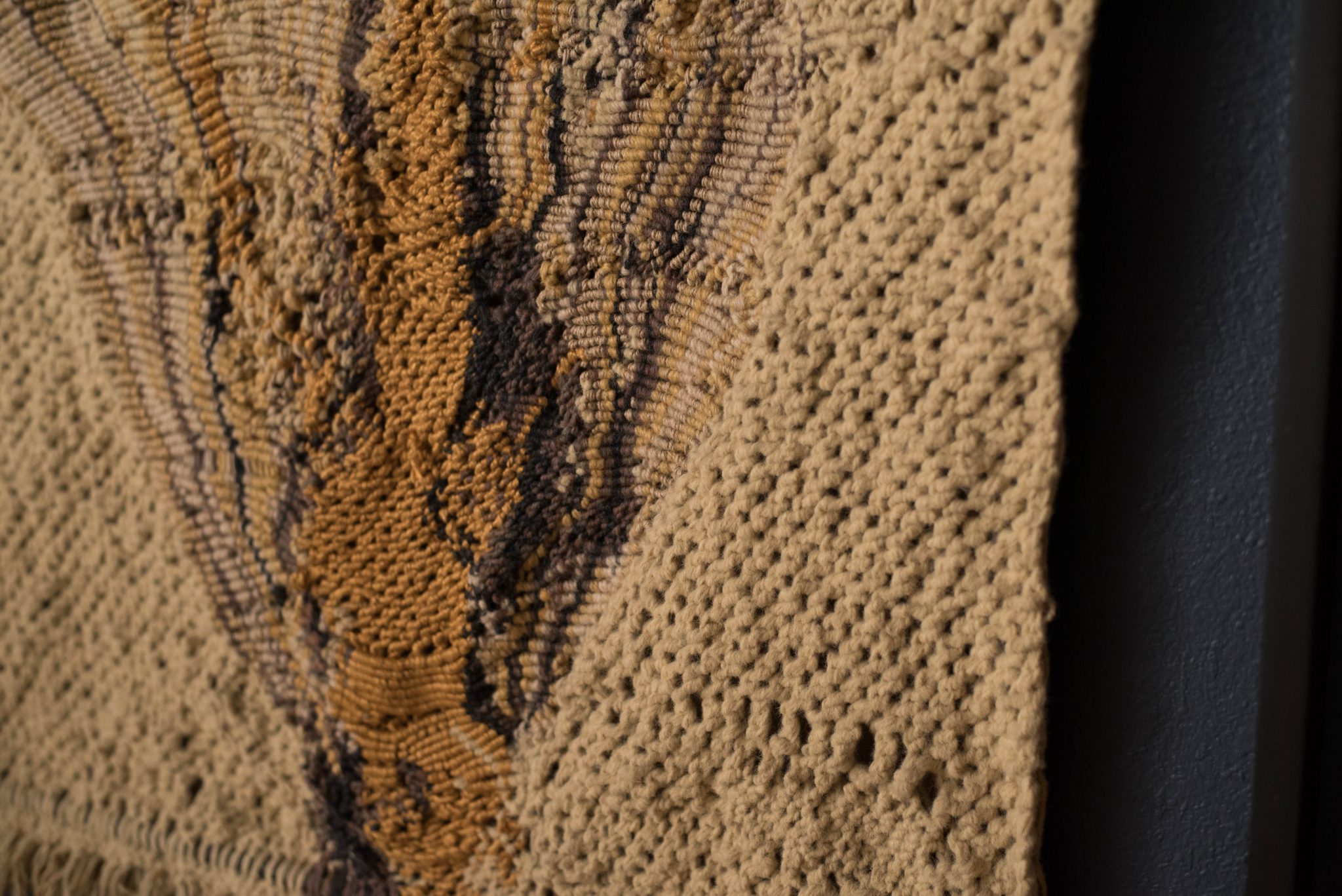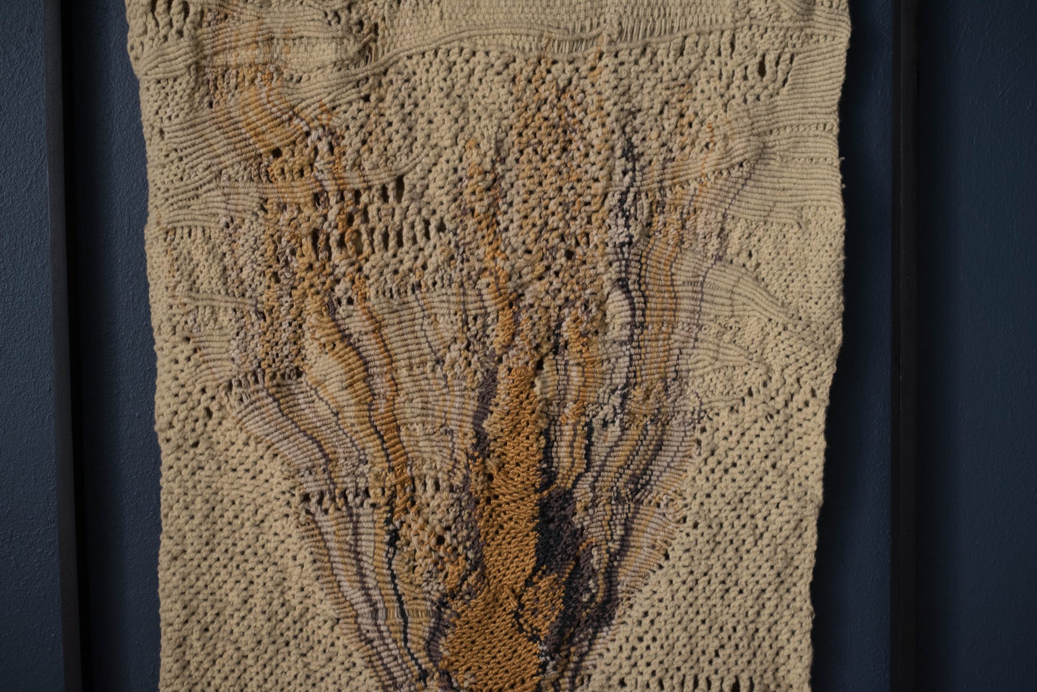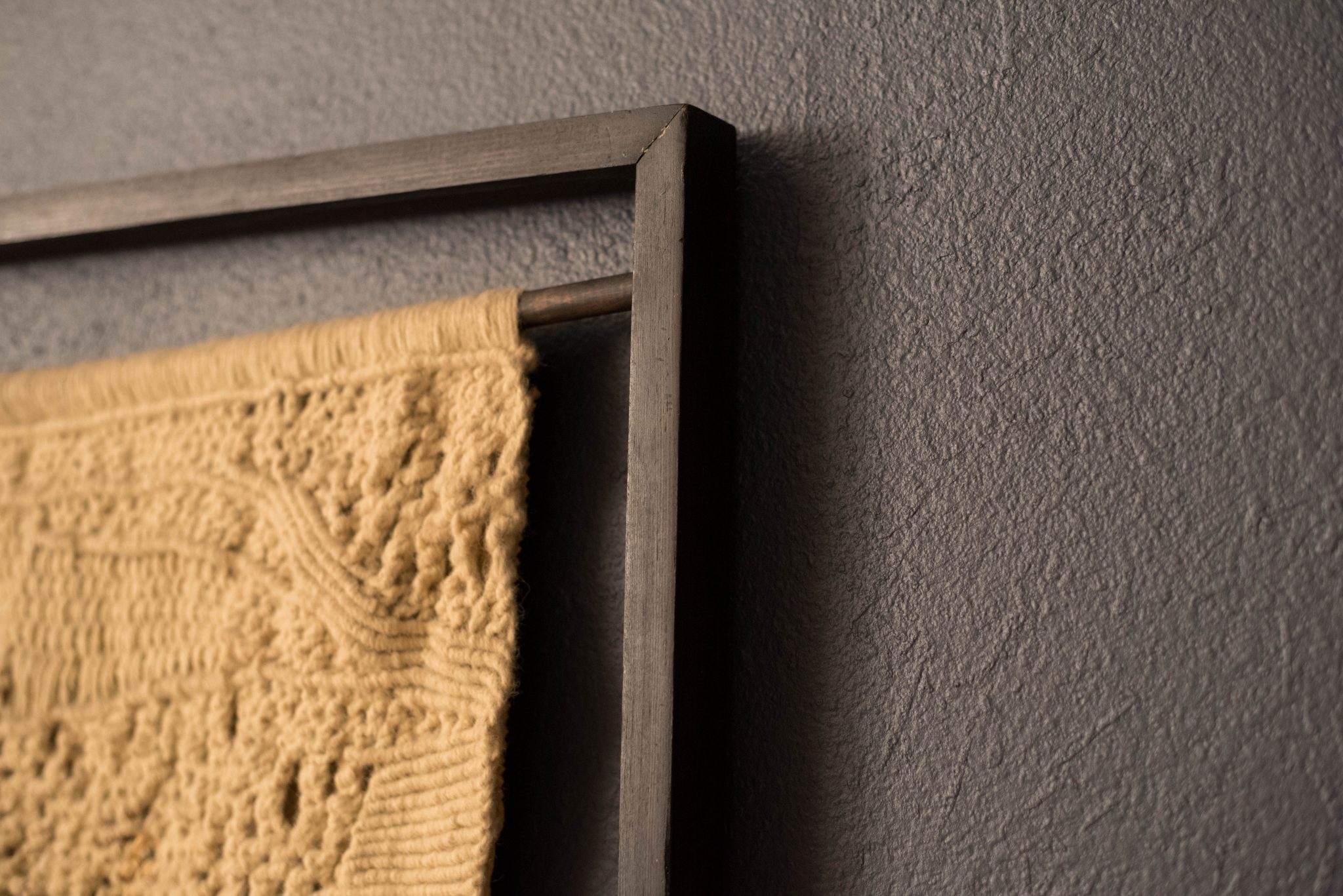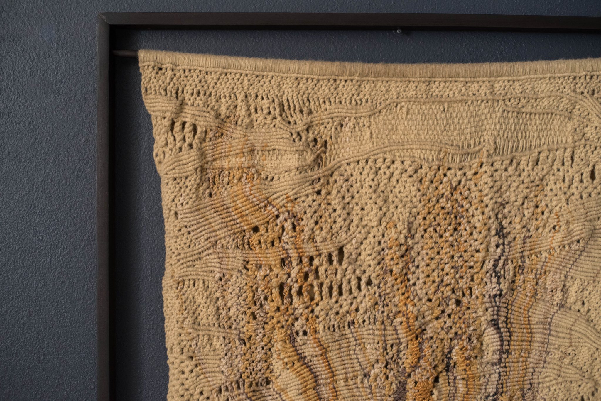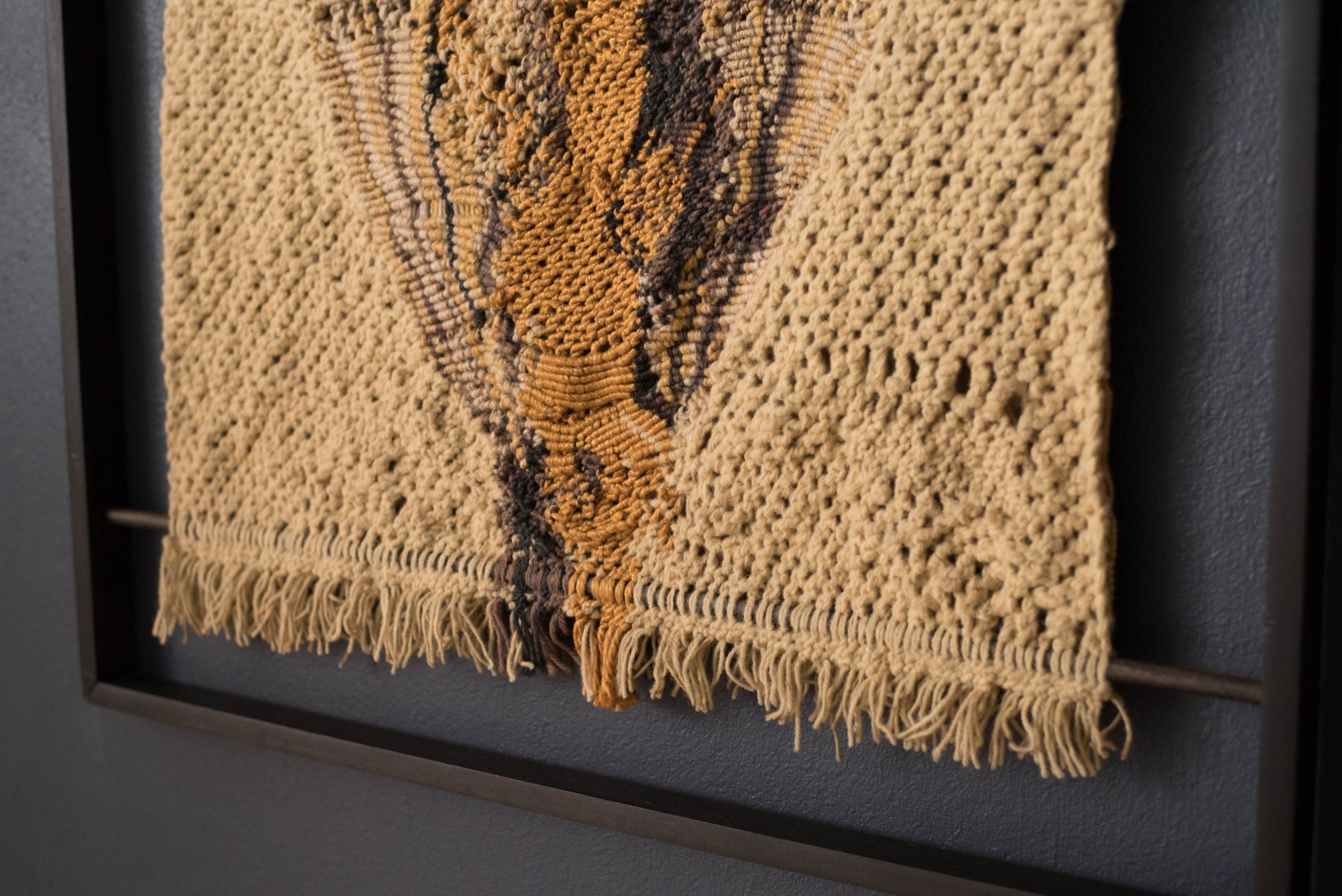 Vintage large scale original abstract fiber art tapestry made by California artist Marion Ferri, circa 1970s. Features an intricate pattern of hand knotted designs accented in a neutral palette of gold, grey, and black tones. Captured in a floating frame, this piece adds a natural texture and dimension to any Bohemian or Mid-Century Modern space.