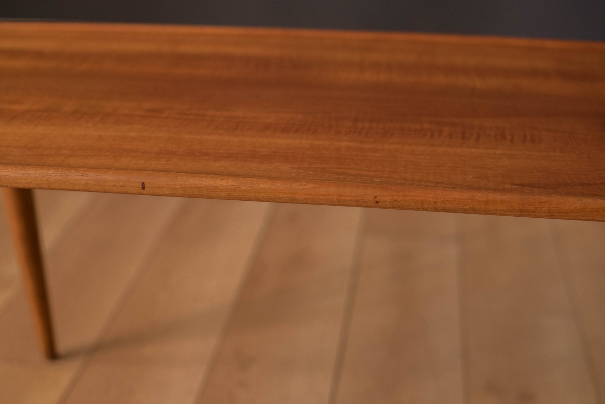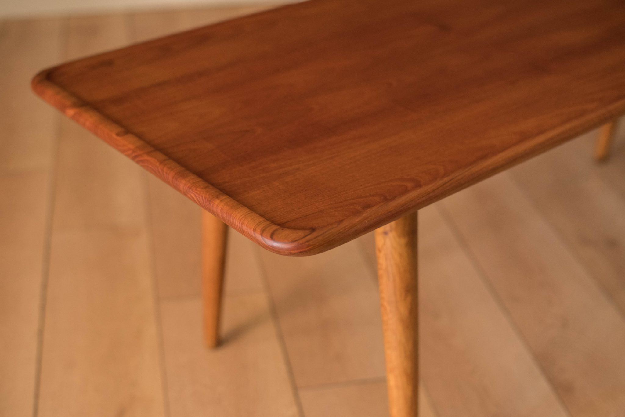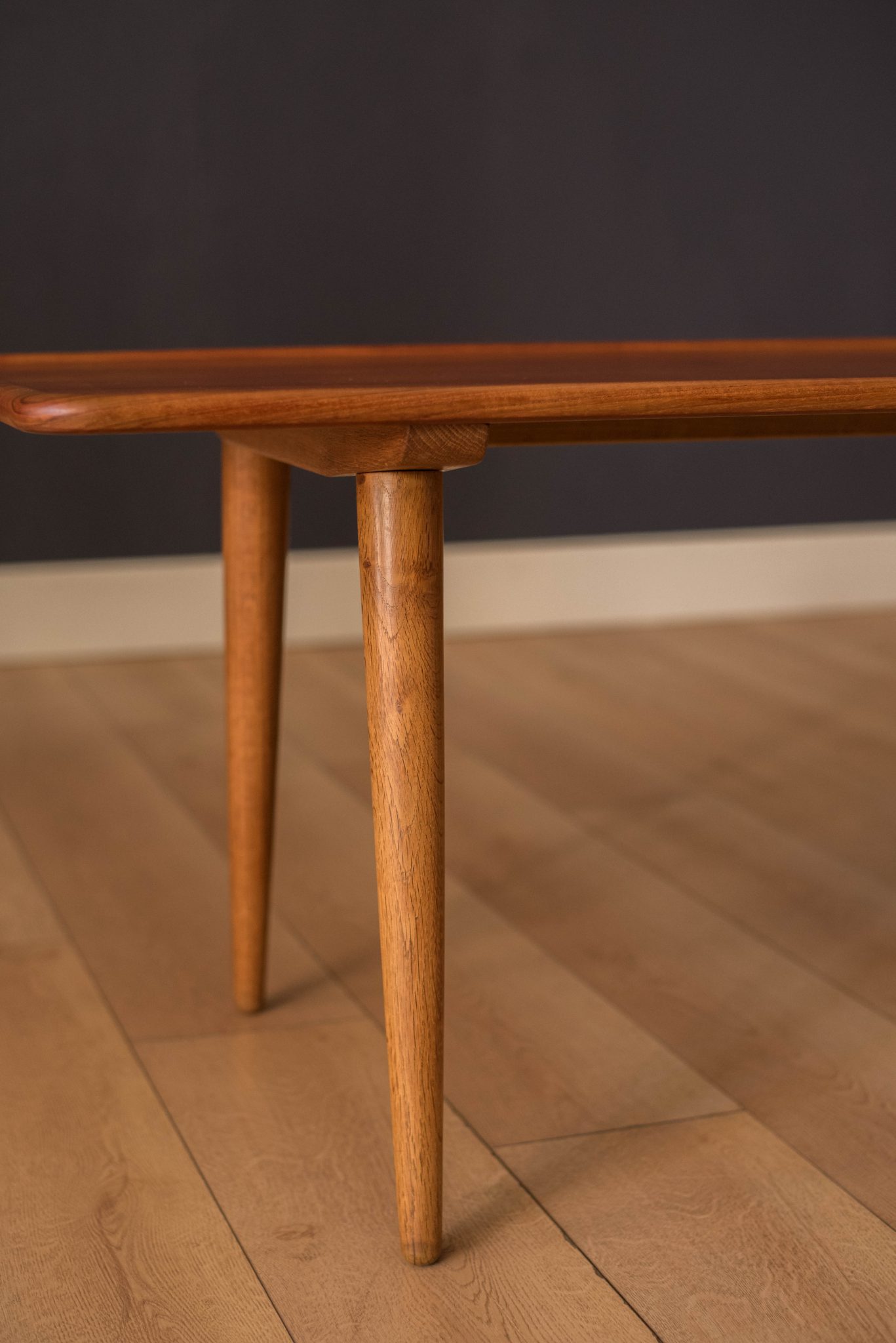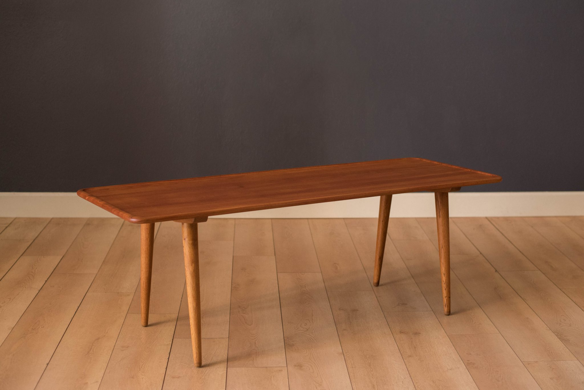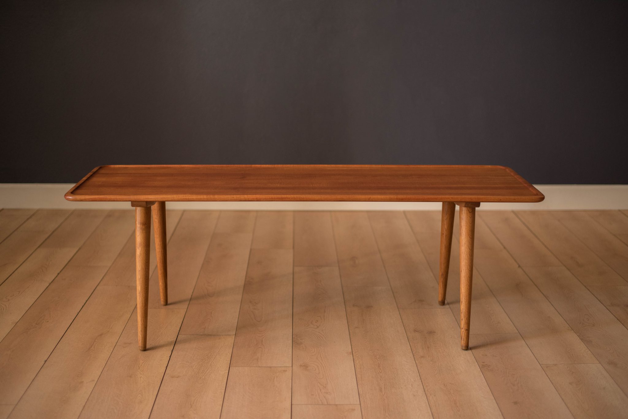 Mid century modern original coffee table designed by Hans Wegner for Andreas Tuck model AT-11. This solid planked teak table top displays a sleek minimalist design with raised rounded edges. Supported by four sturdy oak legs that splay at an angle. Marked underneath.