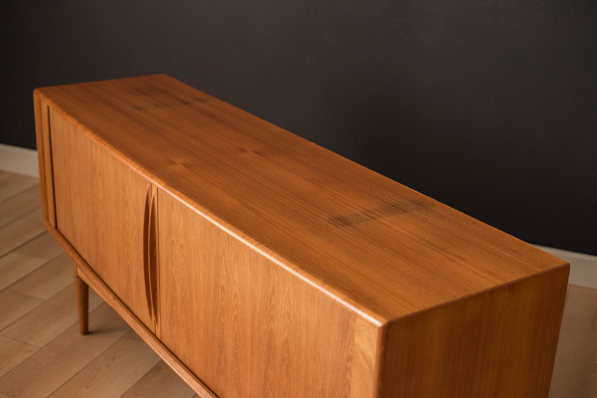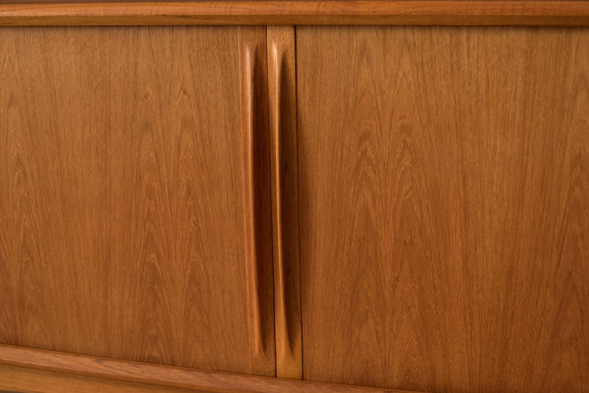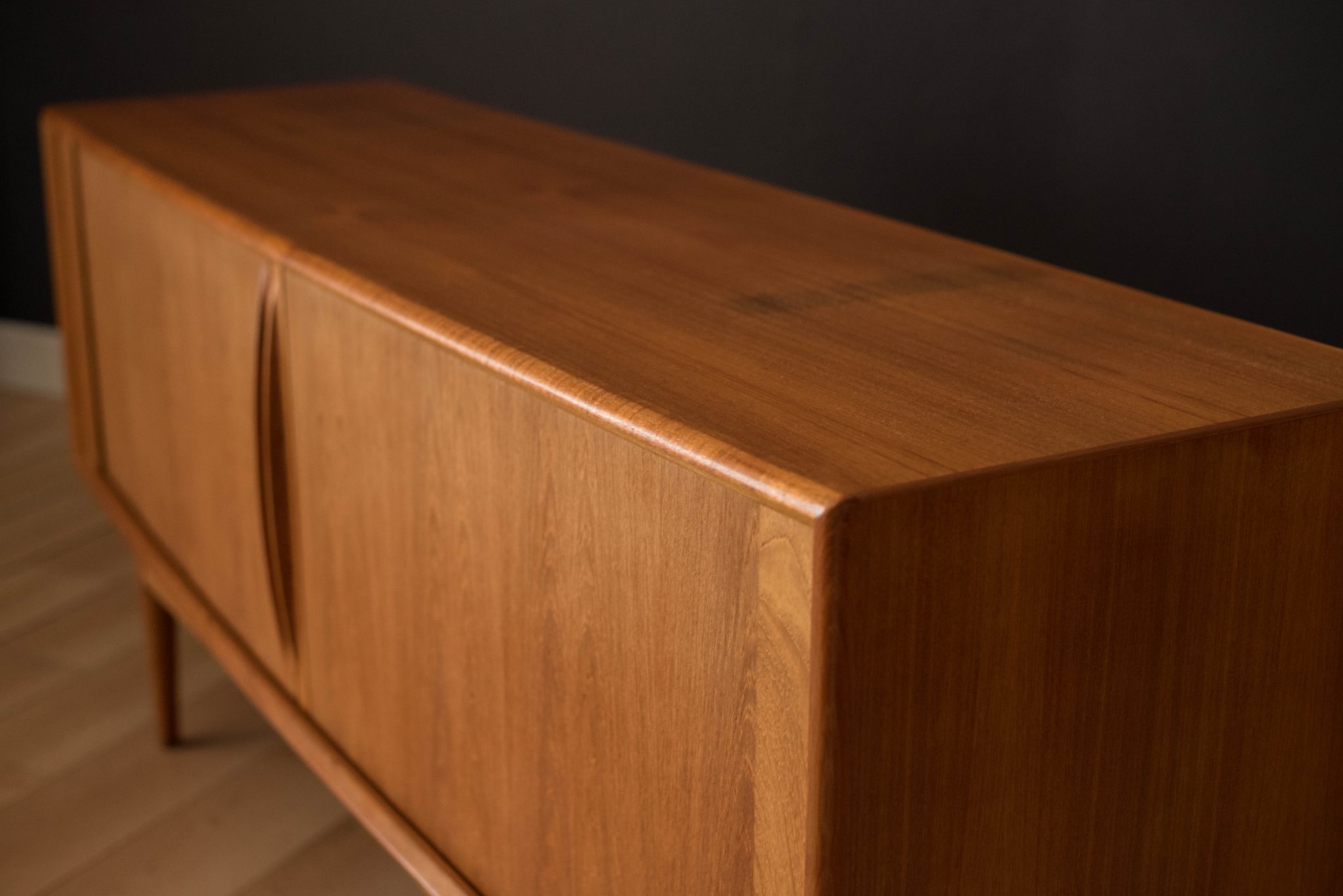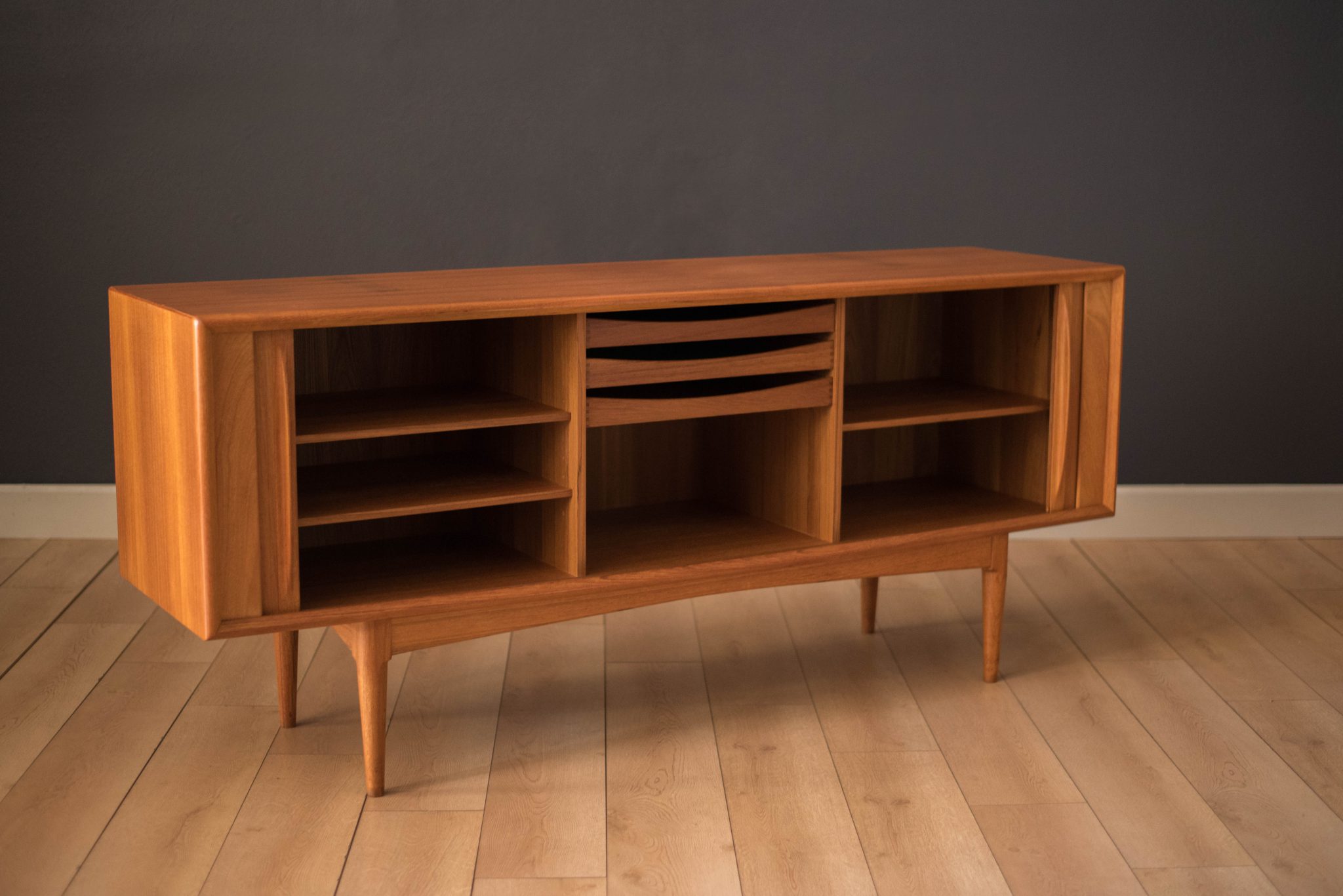 Mid-Century Modern credenza sideboard in teak manufactured by Bernhard Pedersen & Son, Denmark. This piece features sliding tambour doors with signature sculpted handles. Displays a bowed top front edge and is finished with vertical teak grains on the backside. Interior storage provides three dovetailed drawers and adjustable shelving.