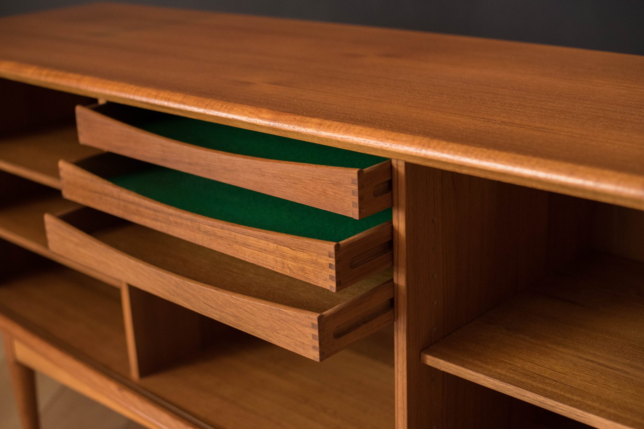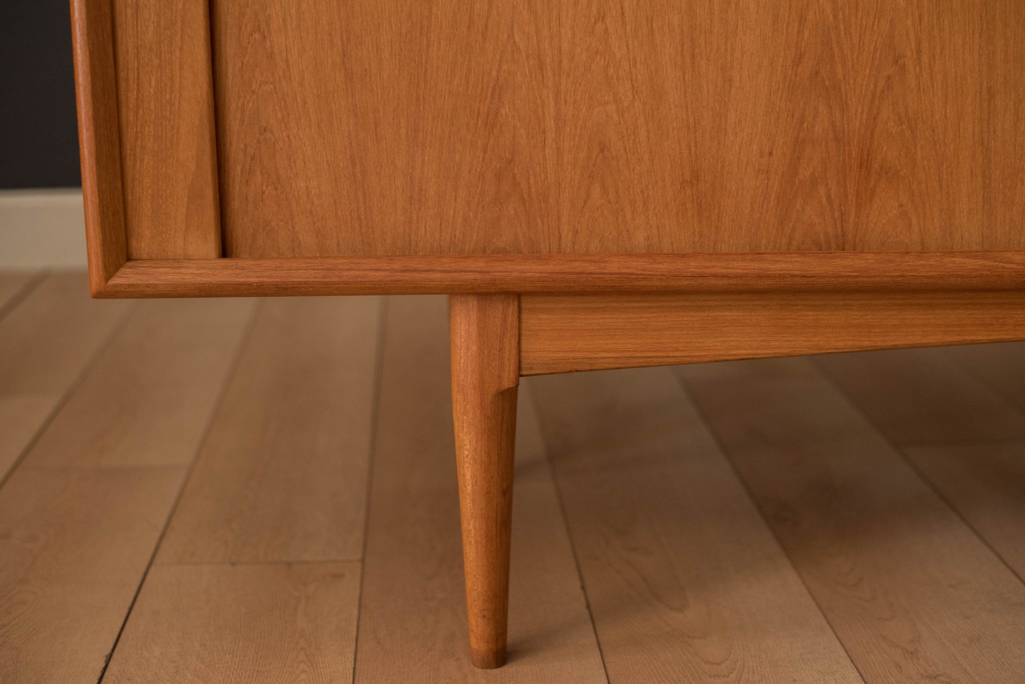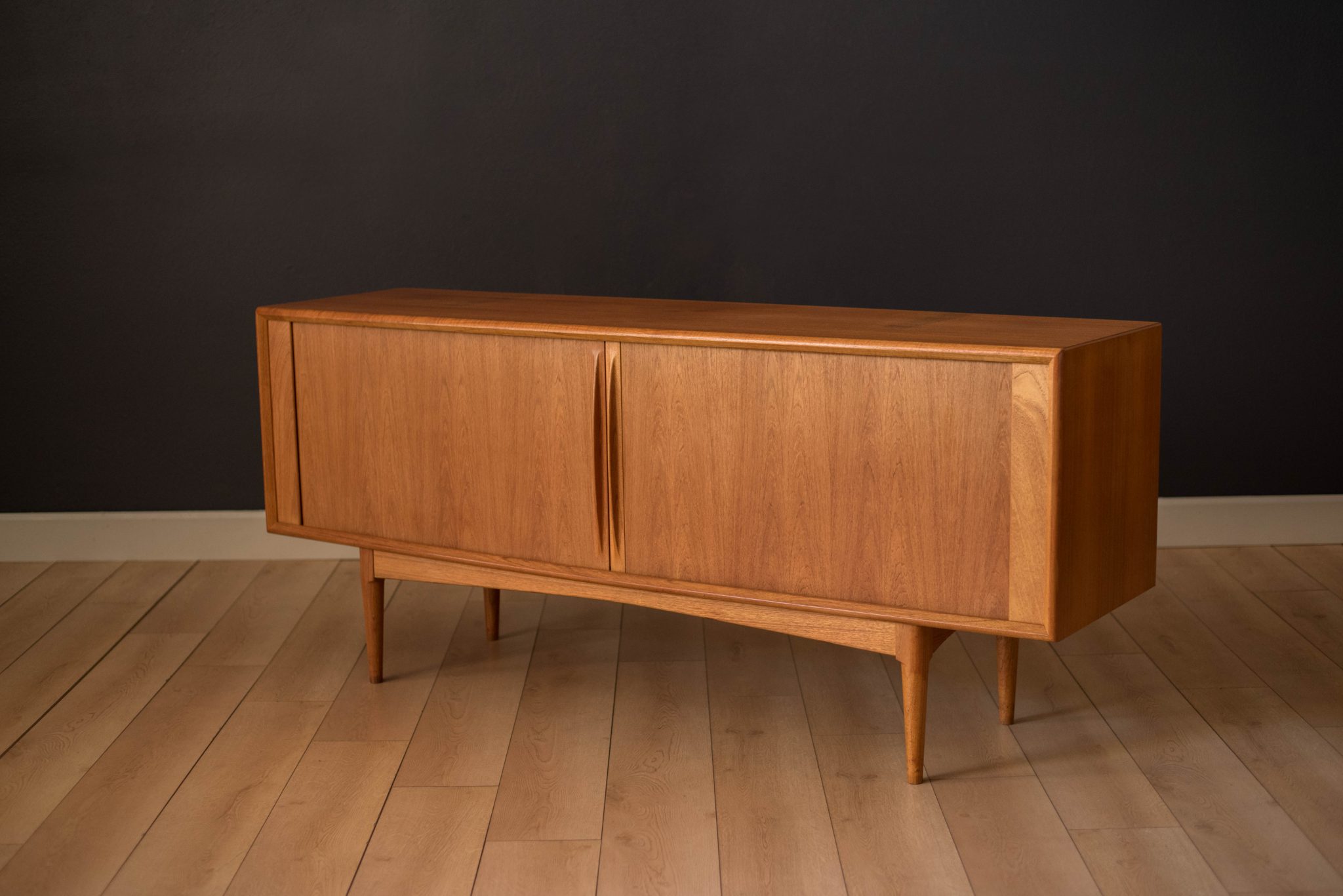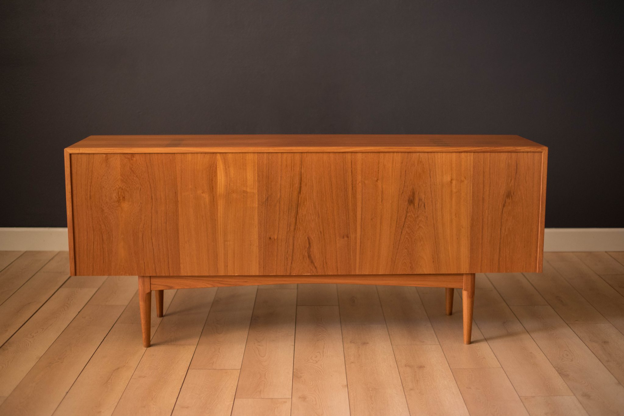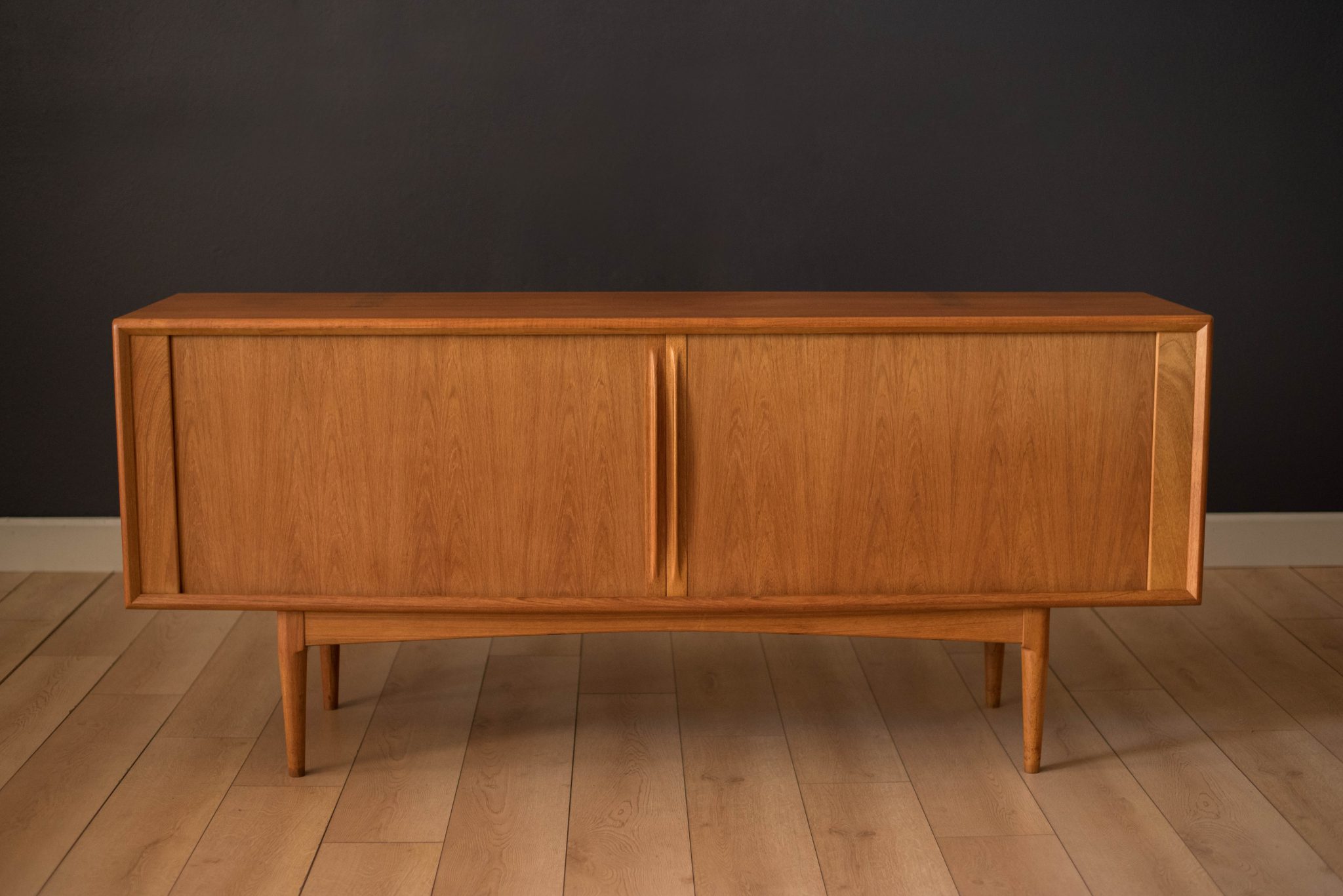 Mid-Century Modern credenza sideboard in teak manufactured by Bernhard Pedersen & Son, Denmark. This piece features sliding tambour doors with signature sculpted handles. Displays a bowed top front edge and is finished with vertical teak grains on the backside. Interior storage provides three dovetailed drawers and adjustable shelving.