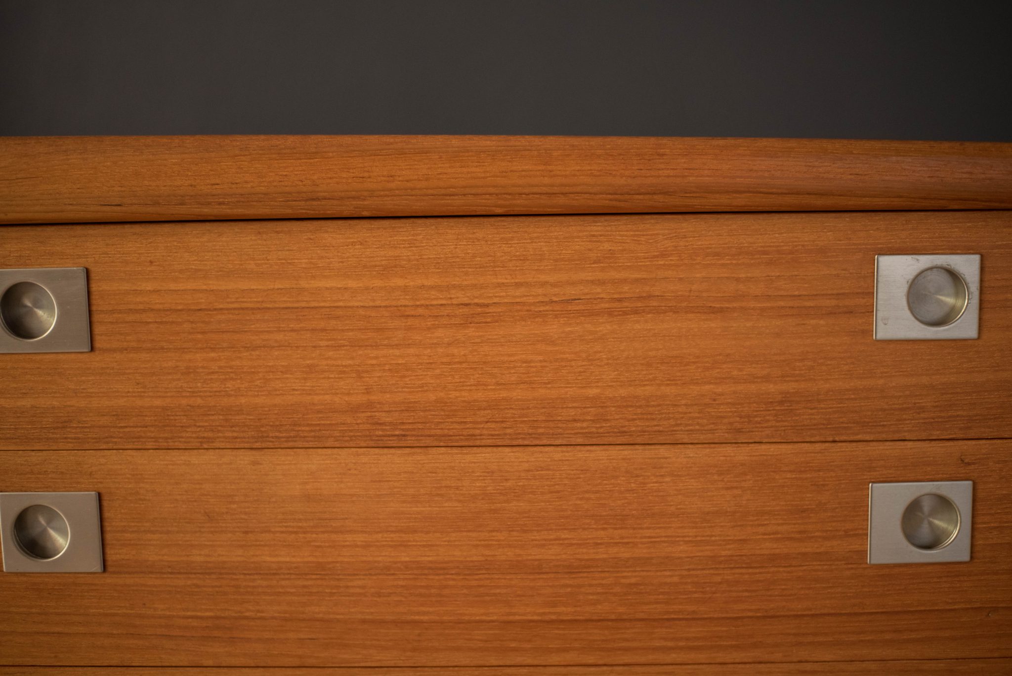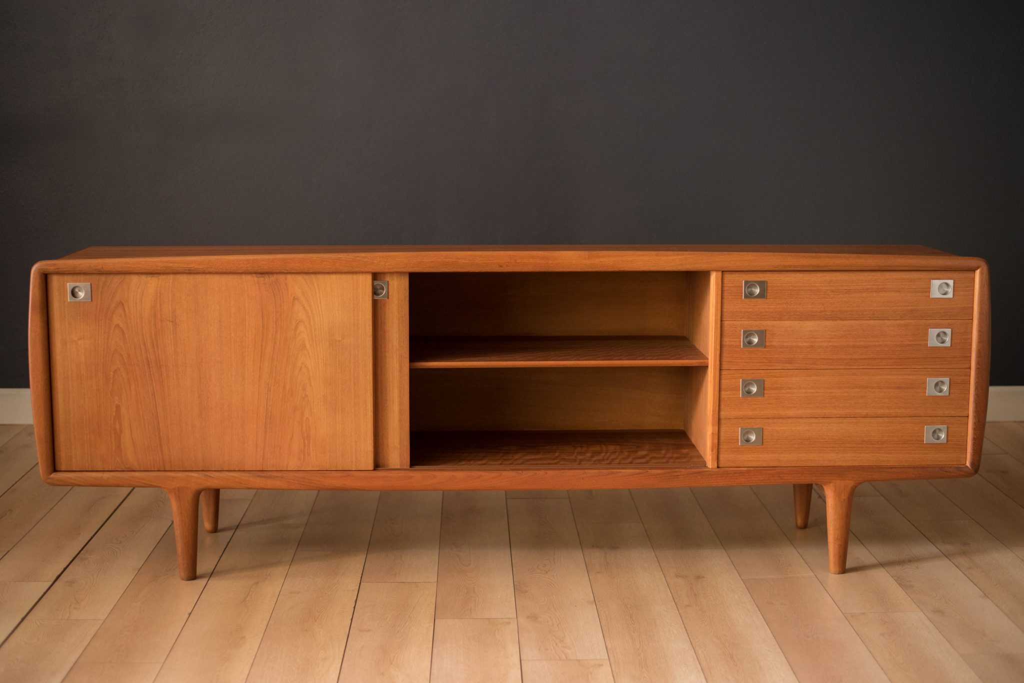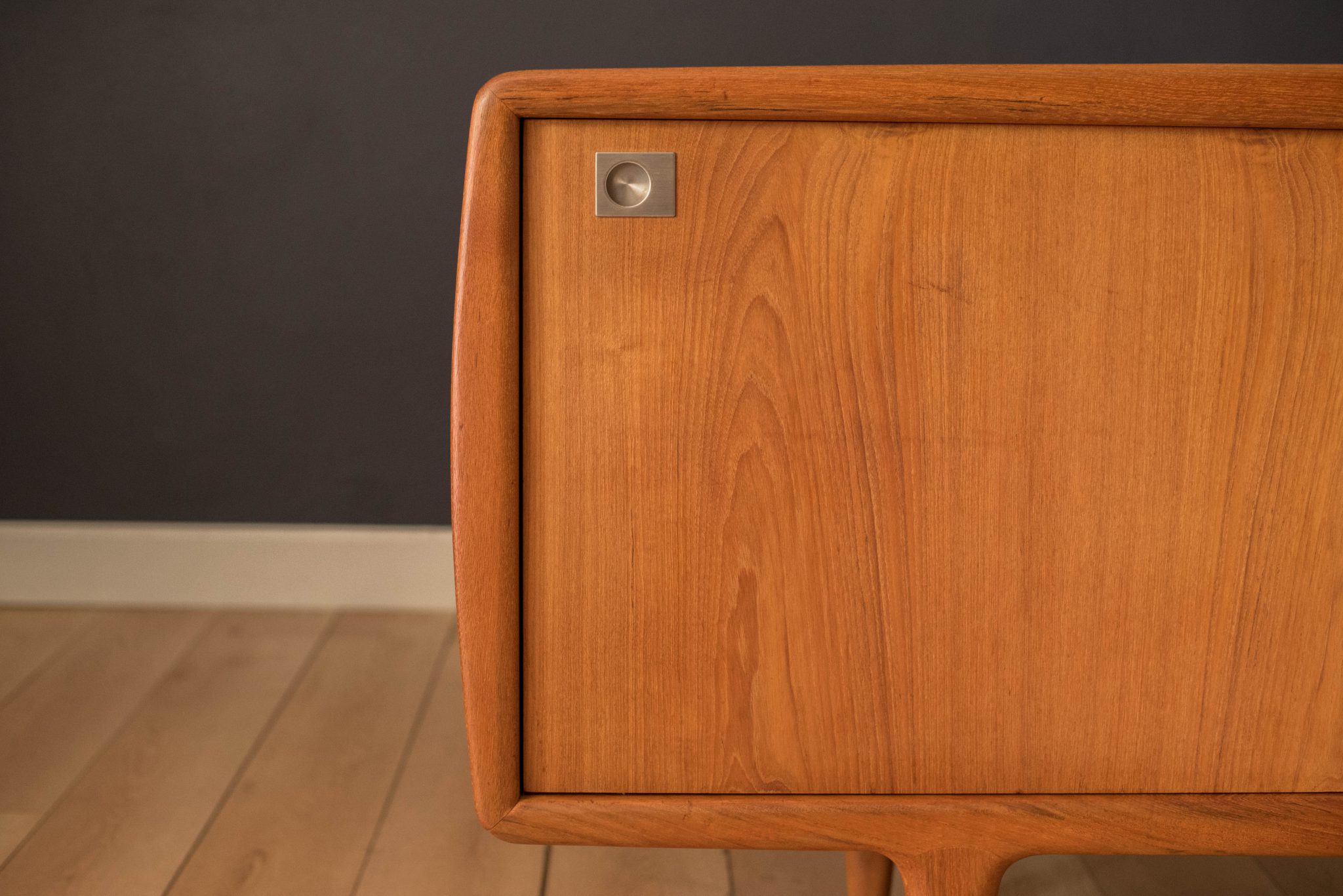 Mid century sideboard in teak designed by H.P. Hansen, Denmark, circa 1960s. This showcase piece is accented with polished aluminum pulls and a sculptural picture frame casing. Includes four dovetailed drawers and sliding doors that offer open storage space with adjustable shelving.