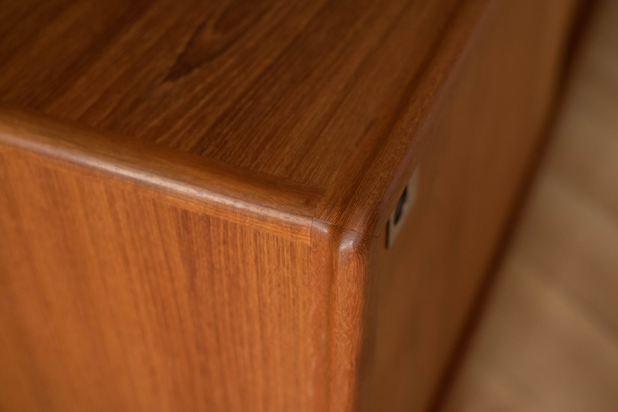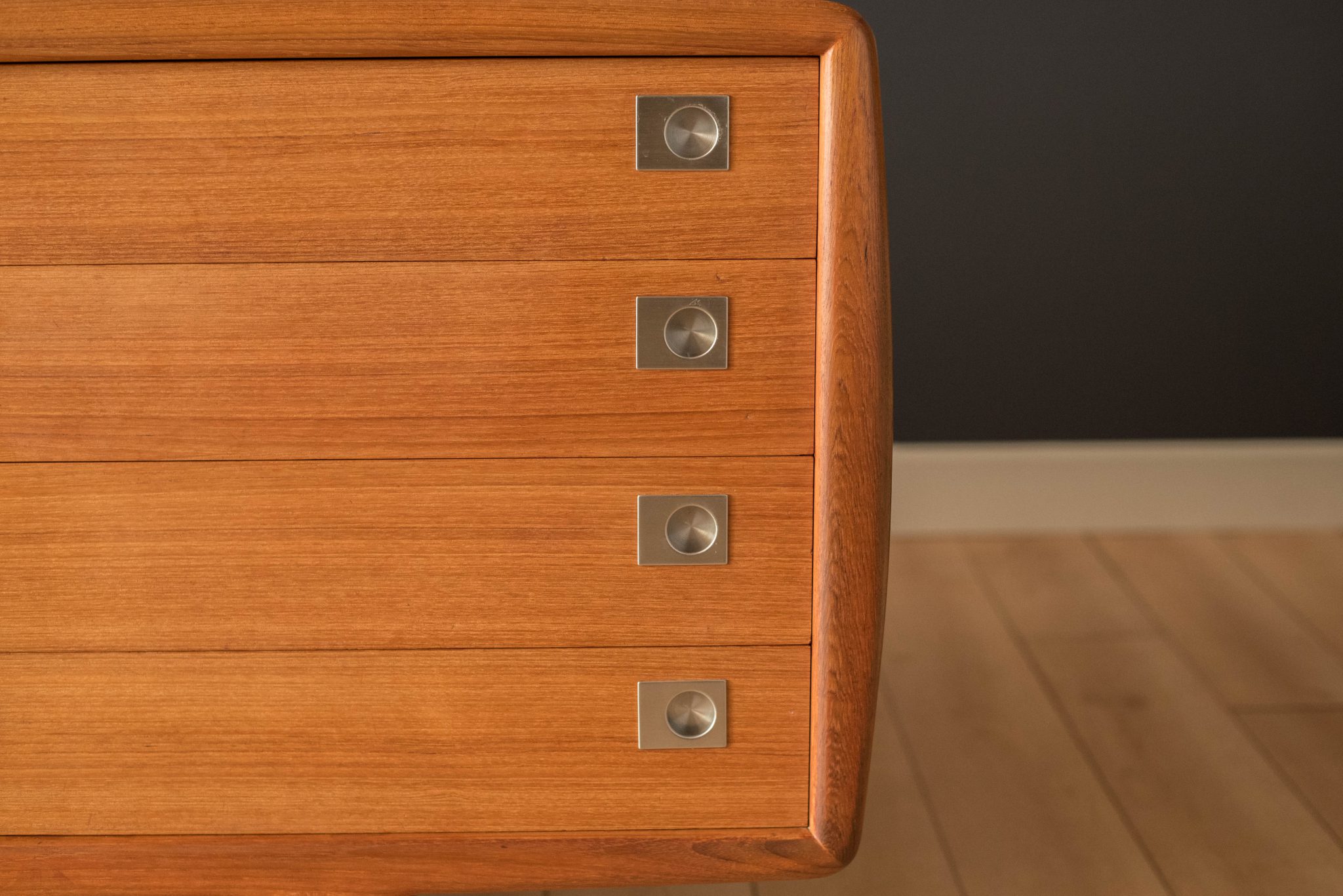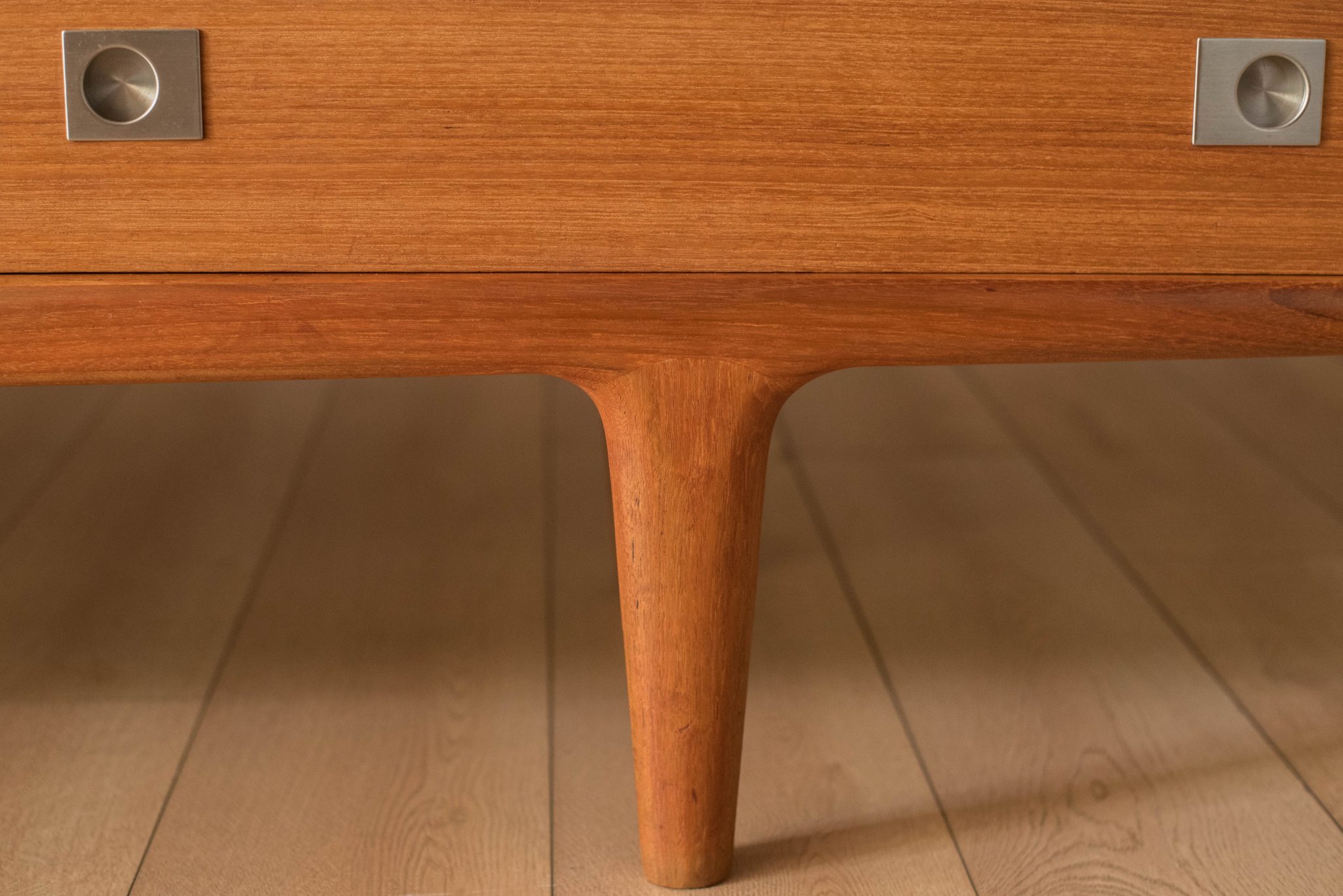 Mid century sideboard in teak designed by H.P. Hansen, Denmark, circa 1960s. This showcase piece is accented with polished aluminum pulls and a sculptural picture frame casing. Includes four dovetailed drawers and sliding doors that offer open storage space with adjustable shelving.