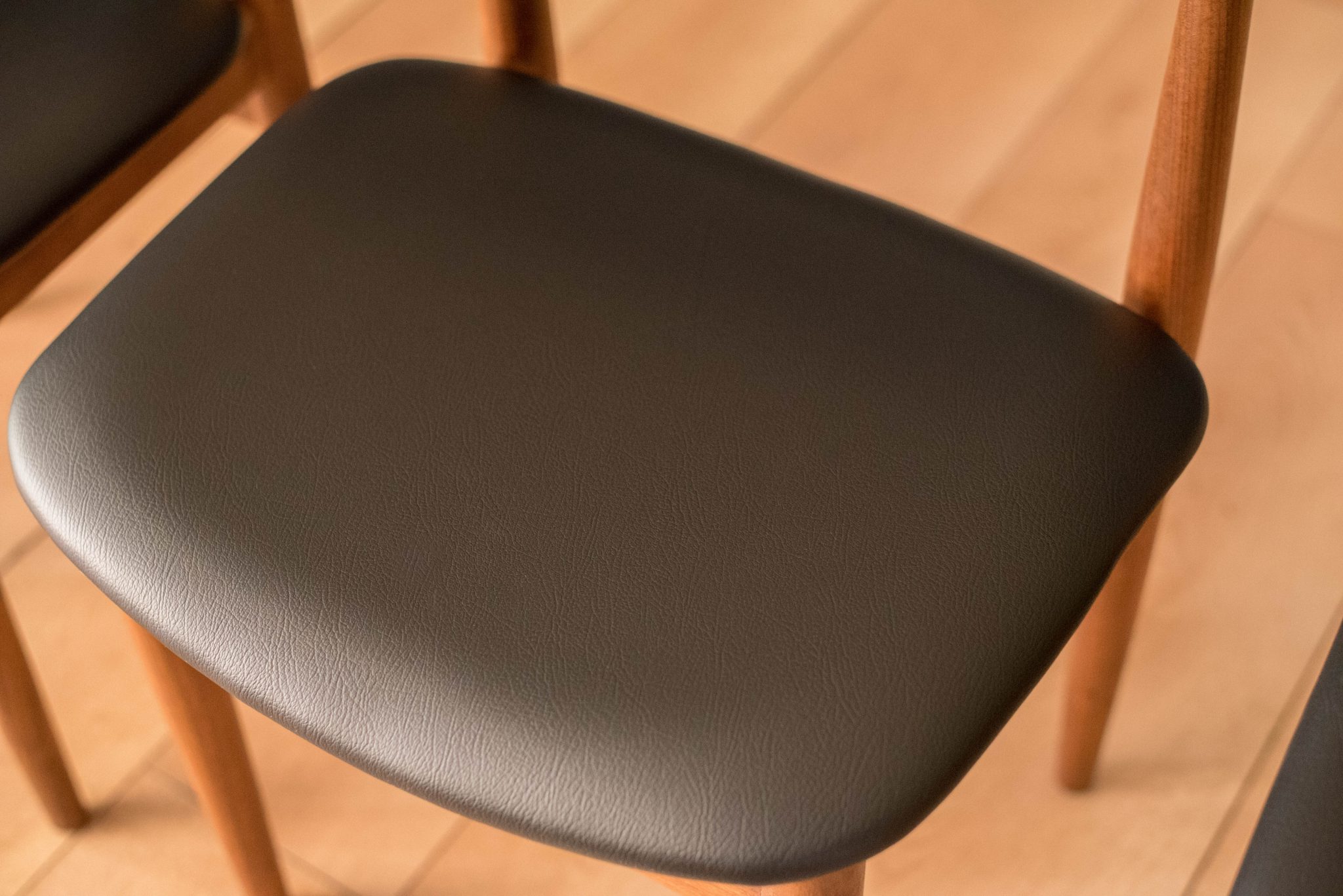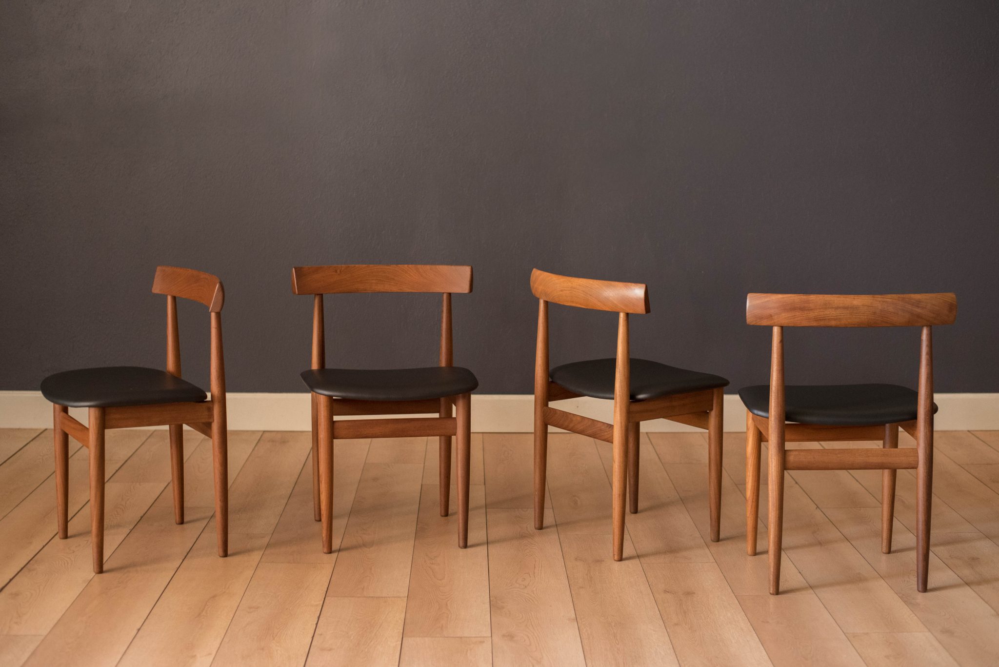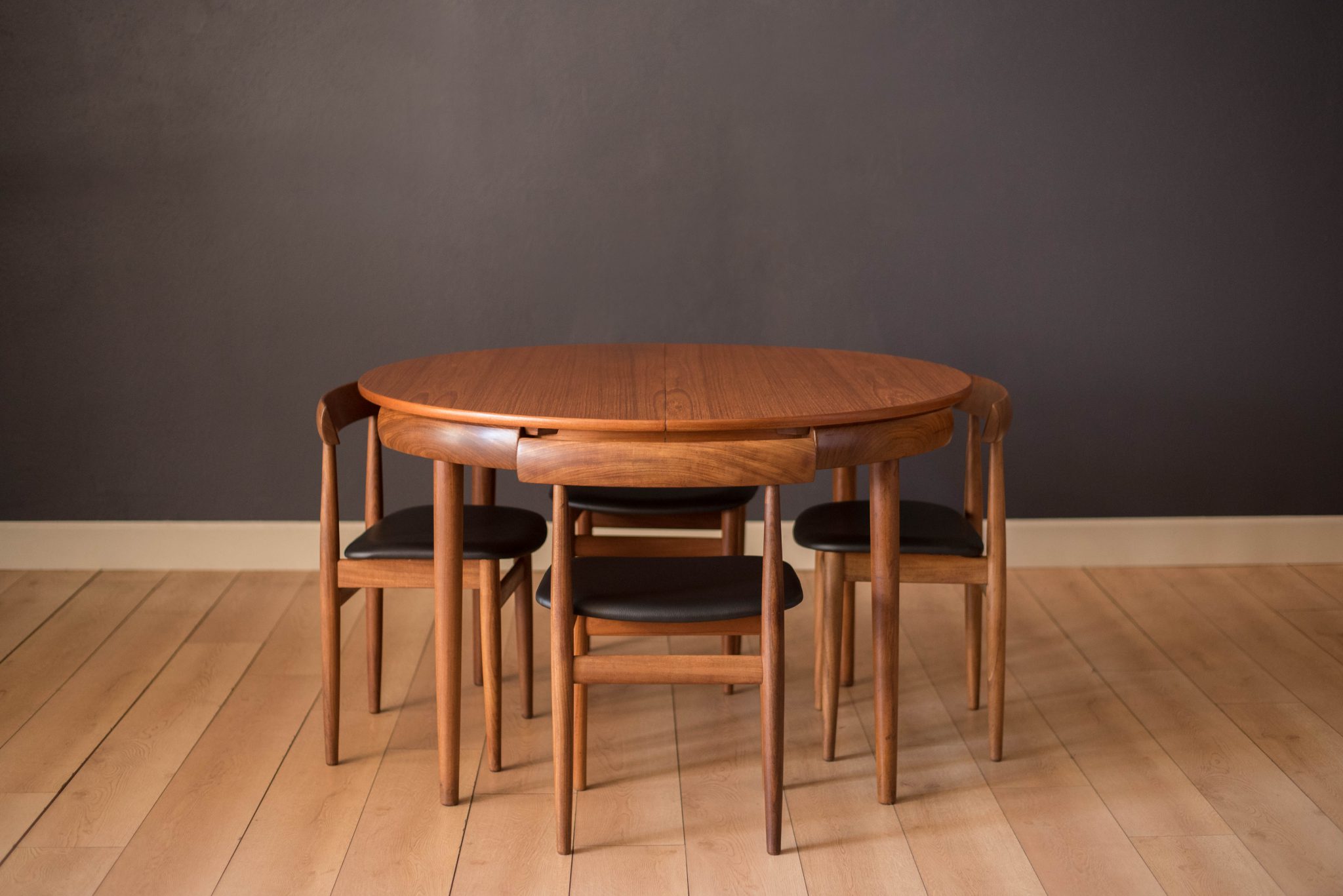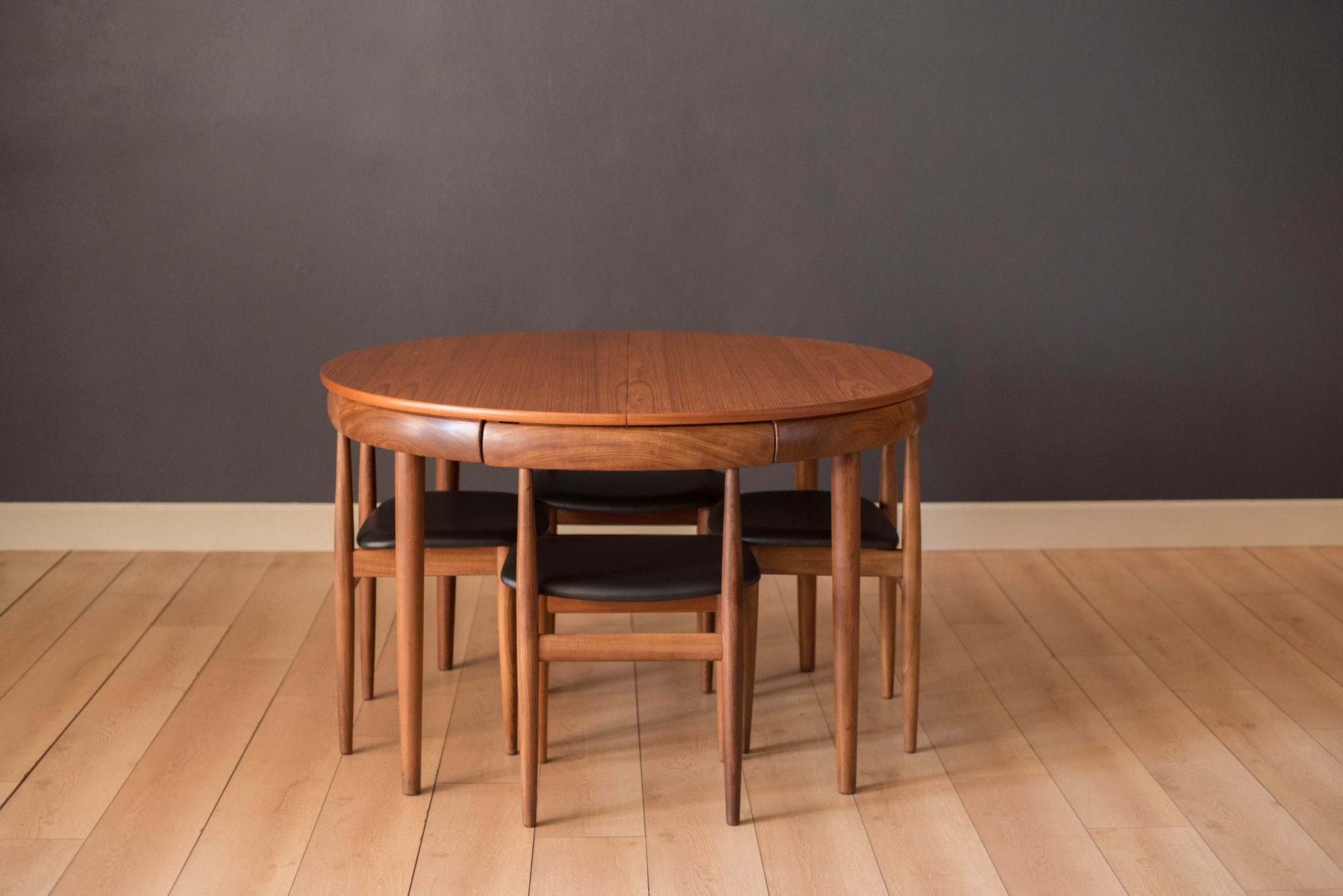 Midcentury round dining set designed by Hans Olsen for Frem Rojle in teak. This compact set includes four chairs that cleverly nest into the table. These dining chairs are the four legged version and seats have been newly reupholstered in black vinyl. Table is equipped with a butterfly leaf and expands to seat up to six.