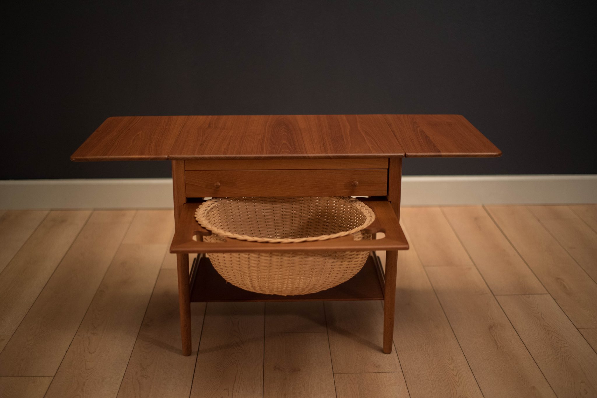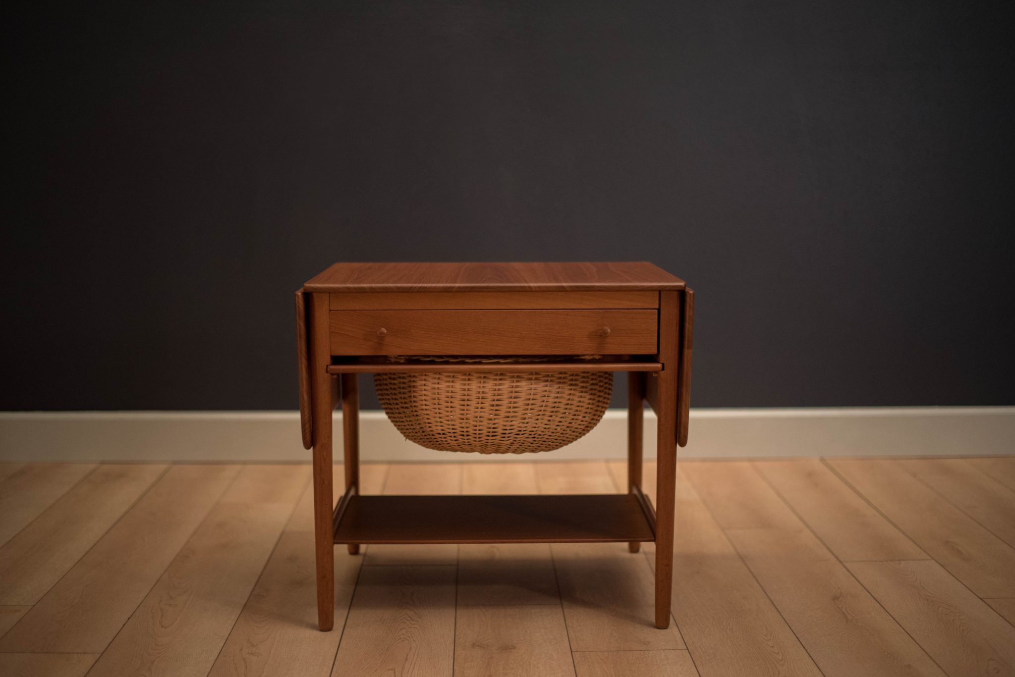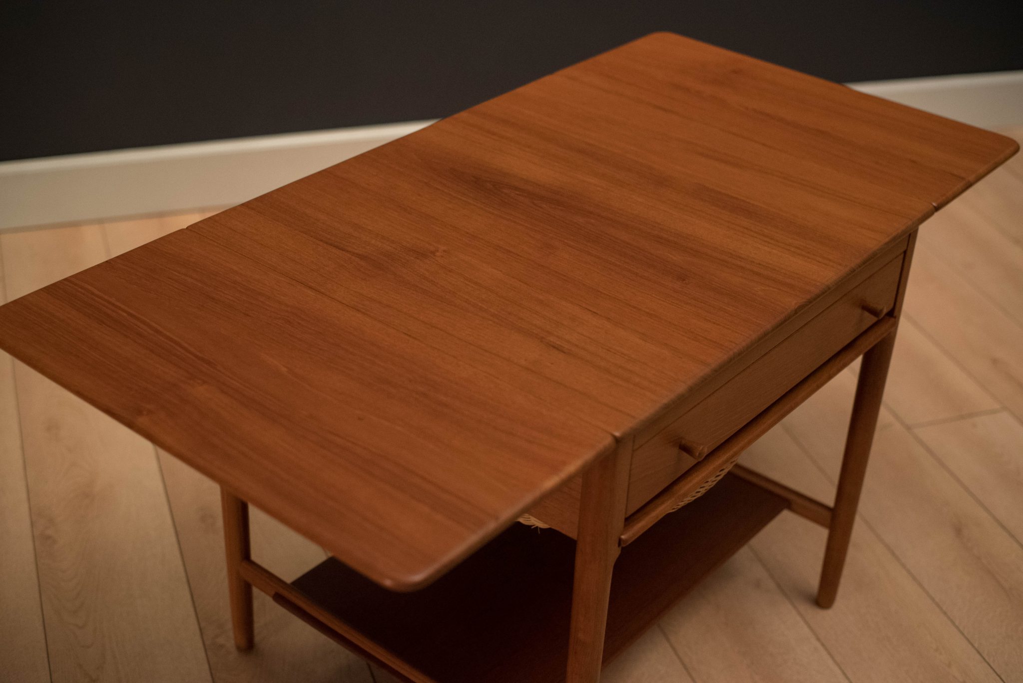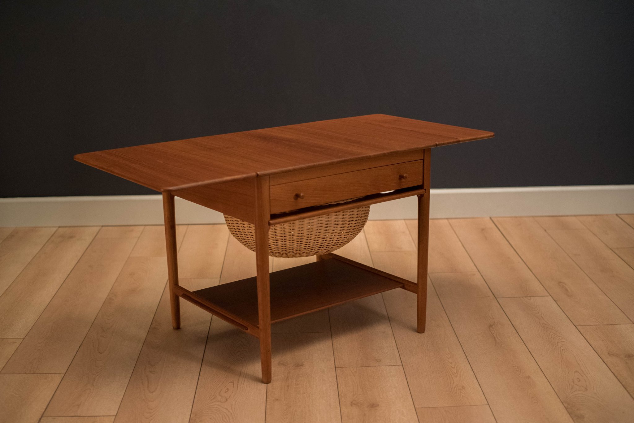Mid-Century Danish sewing table designed by Hans Wegner for Andreas Tuck. This piece is constructed of solid teak and oak and features an extendable drop leaf tabletop. Includes one drawer and pull-out wicker basket tray. Tabletop extends out to 46.25″ long