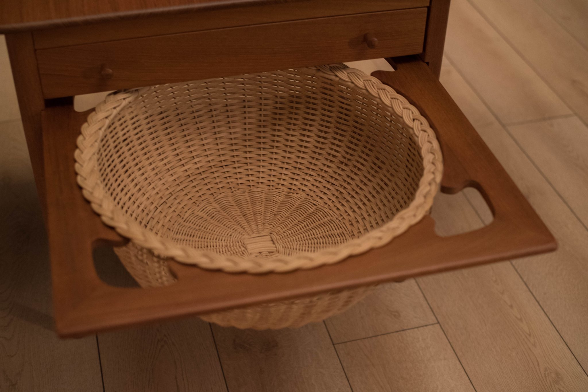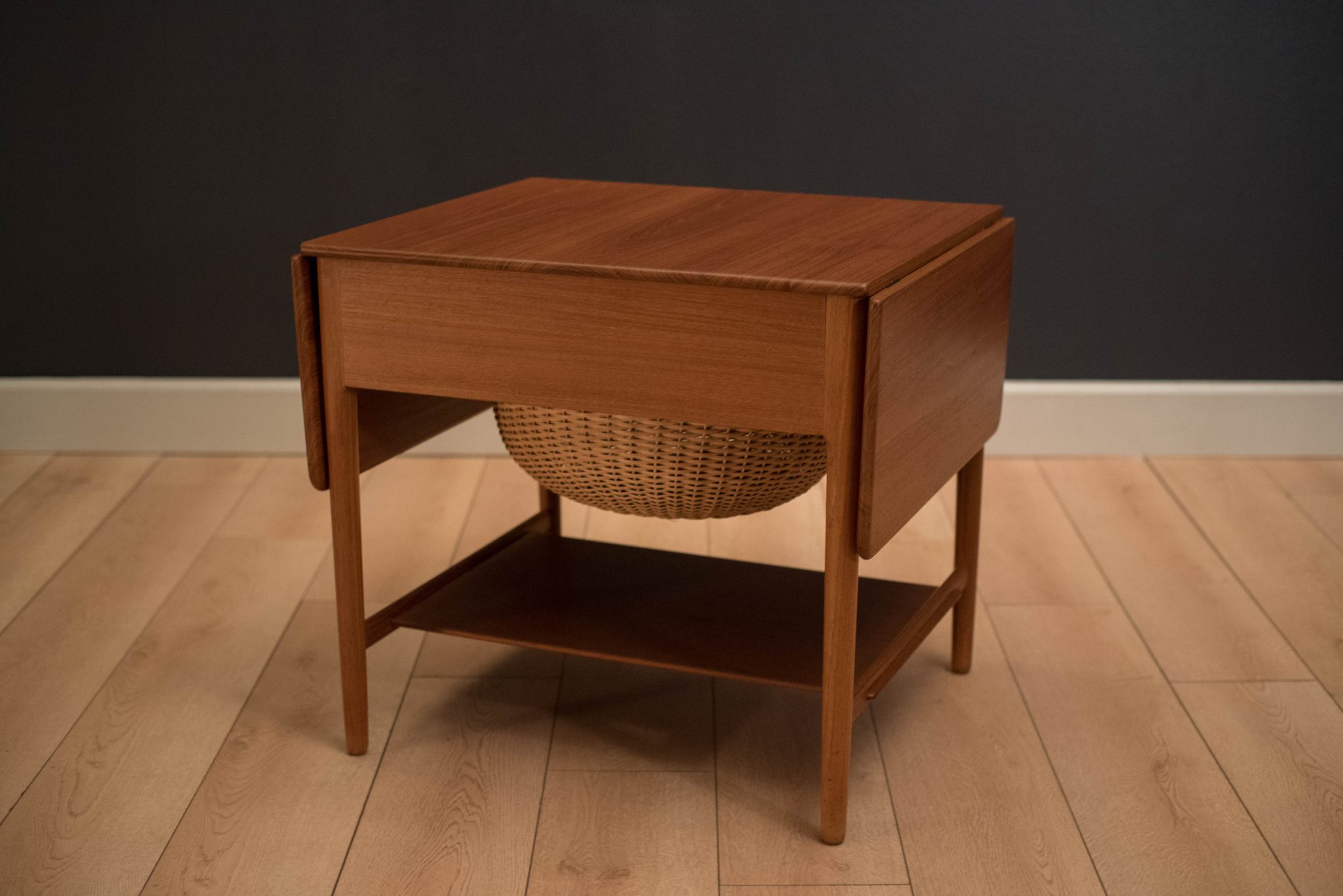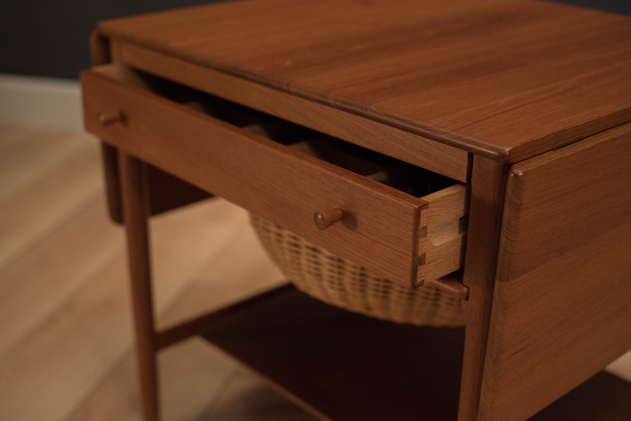 Mid-Century Danish sewing table designed by Hans Wegner for Andreas Tuck. This piece is constructed of solid teak and oak and features an extendable drop leaf tabletop. Includes one drawer and pull-out wicker basket tray. Tabletop extends out to 46.25″ long