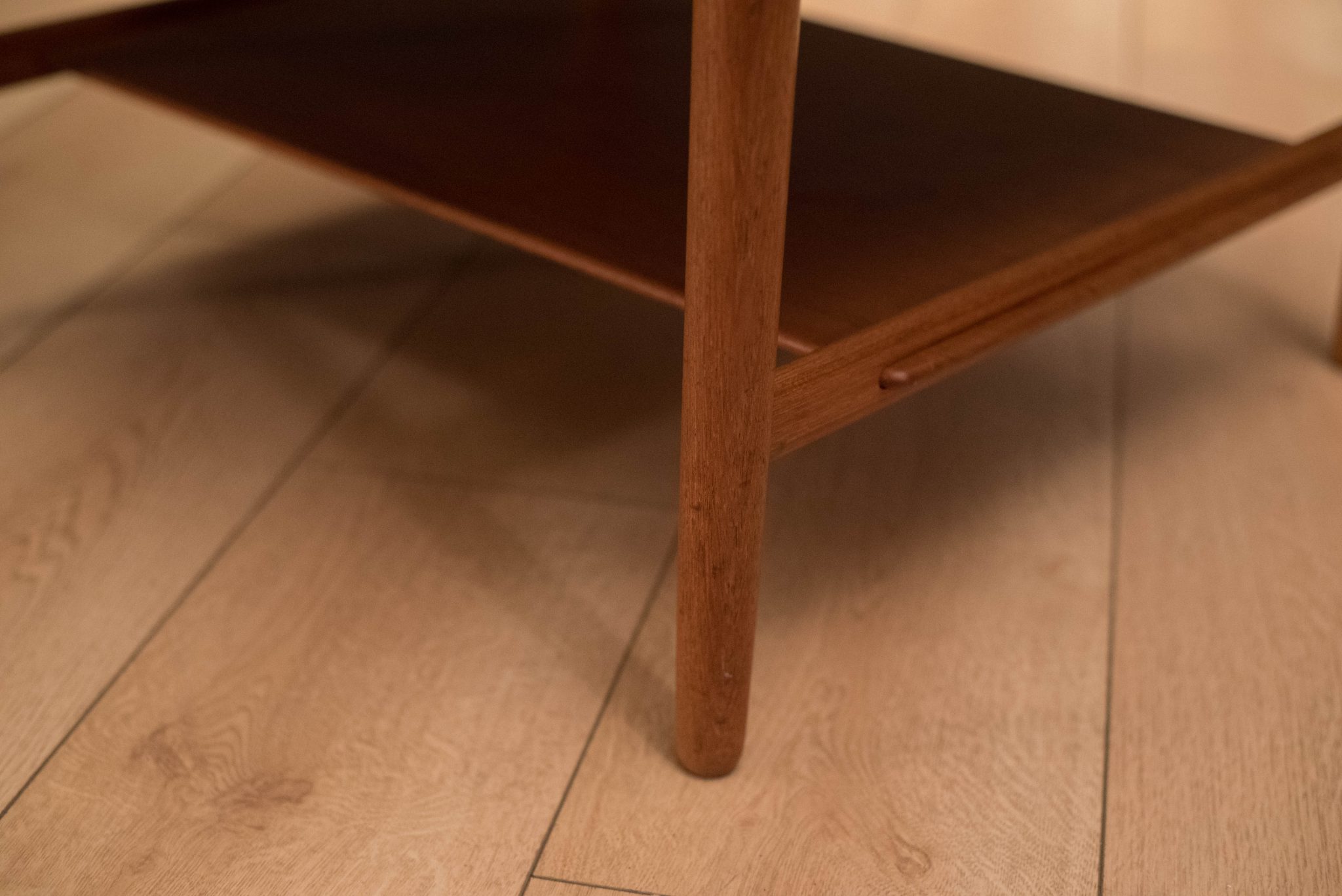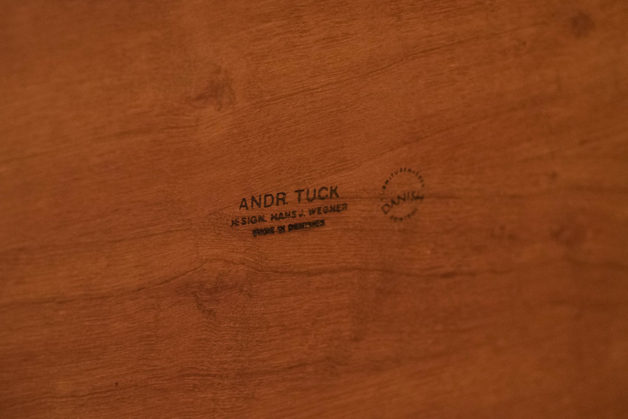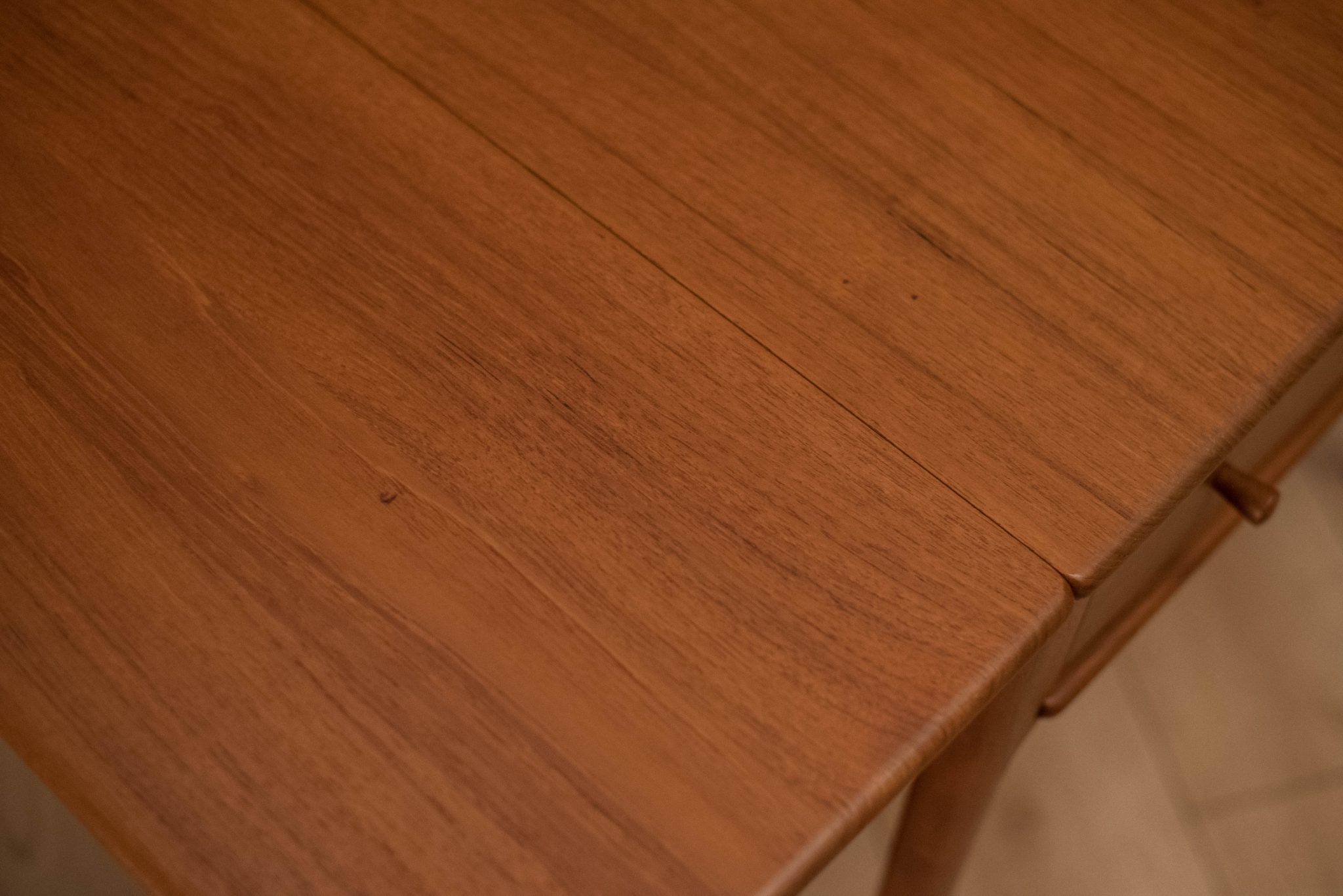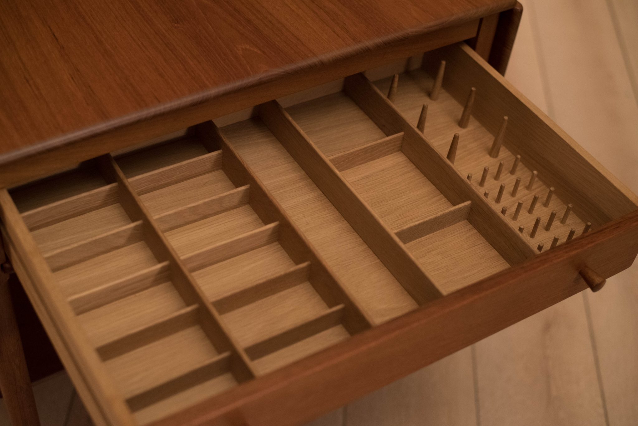Mid-Century Danish sewing table designed by Hans Wegner for Andreas Tuck. This piece is constructed of solid teak and oak and features an extendable drop leaf tabletop. Includes one drawer and pull-out wicker basket tray. Tabletop extends out to 46.25″ long